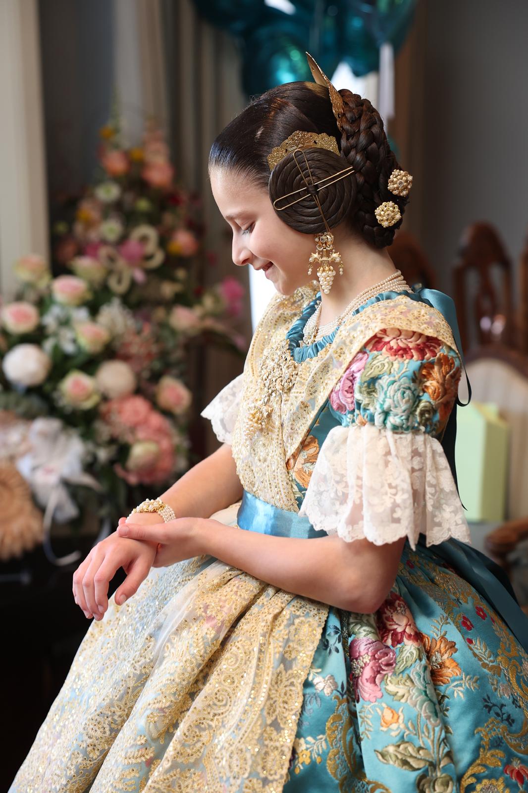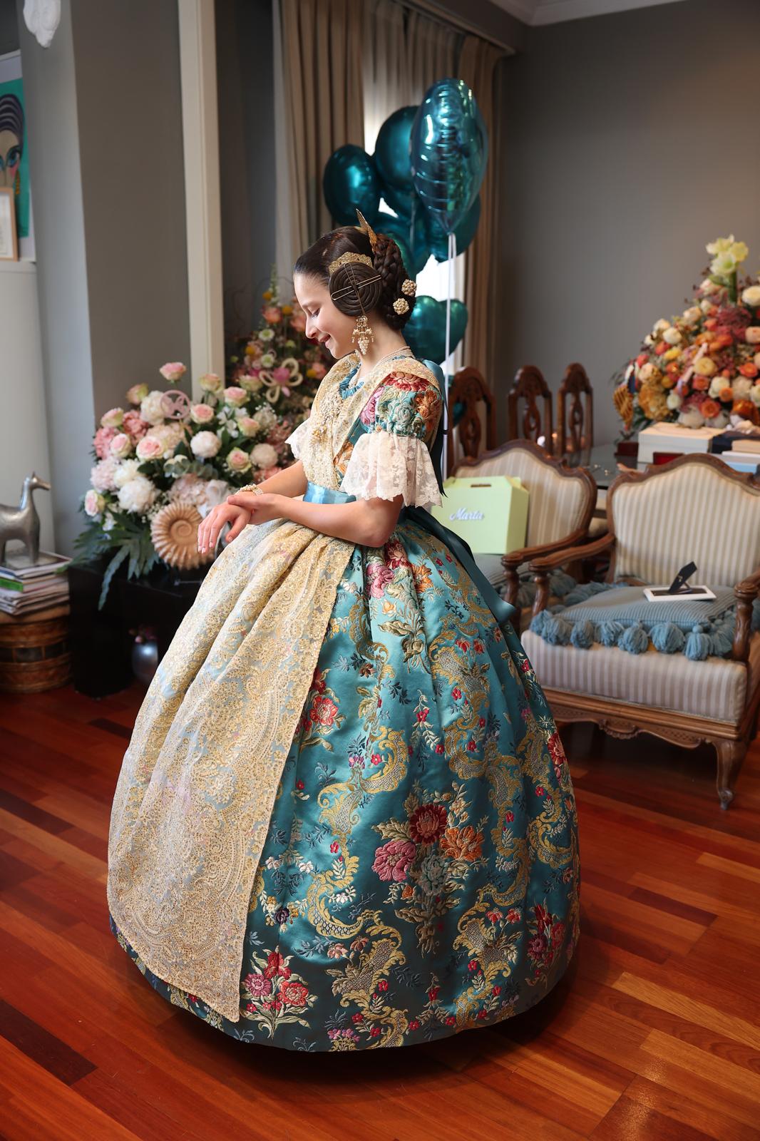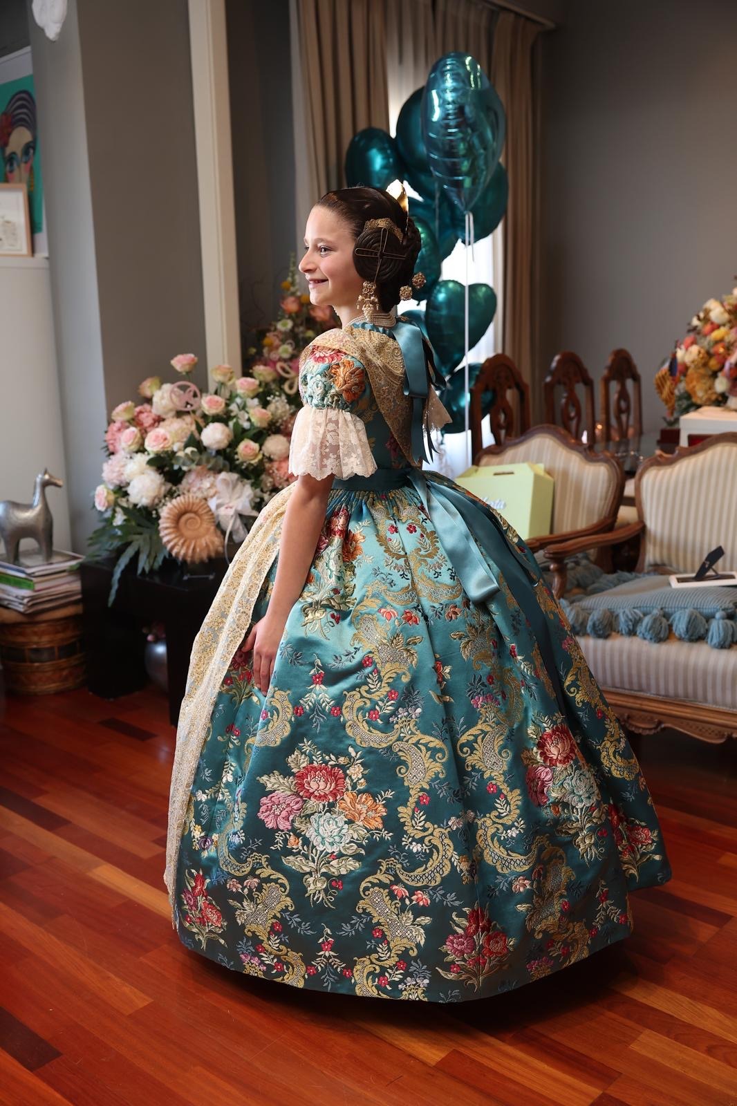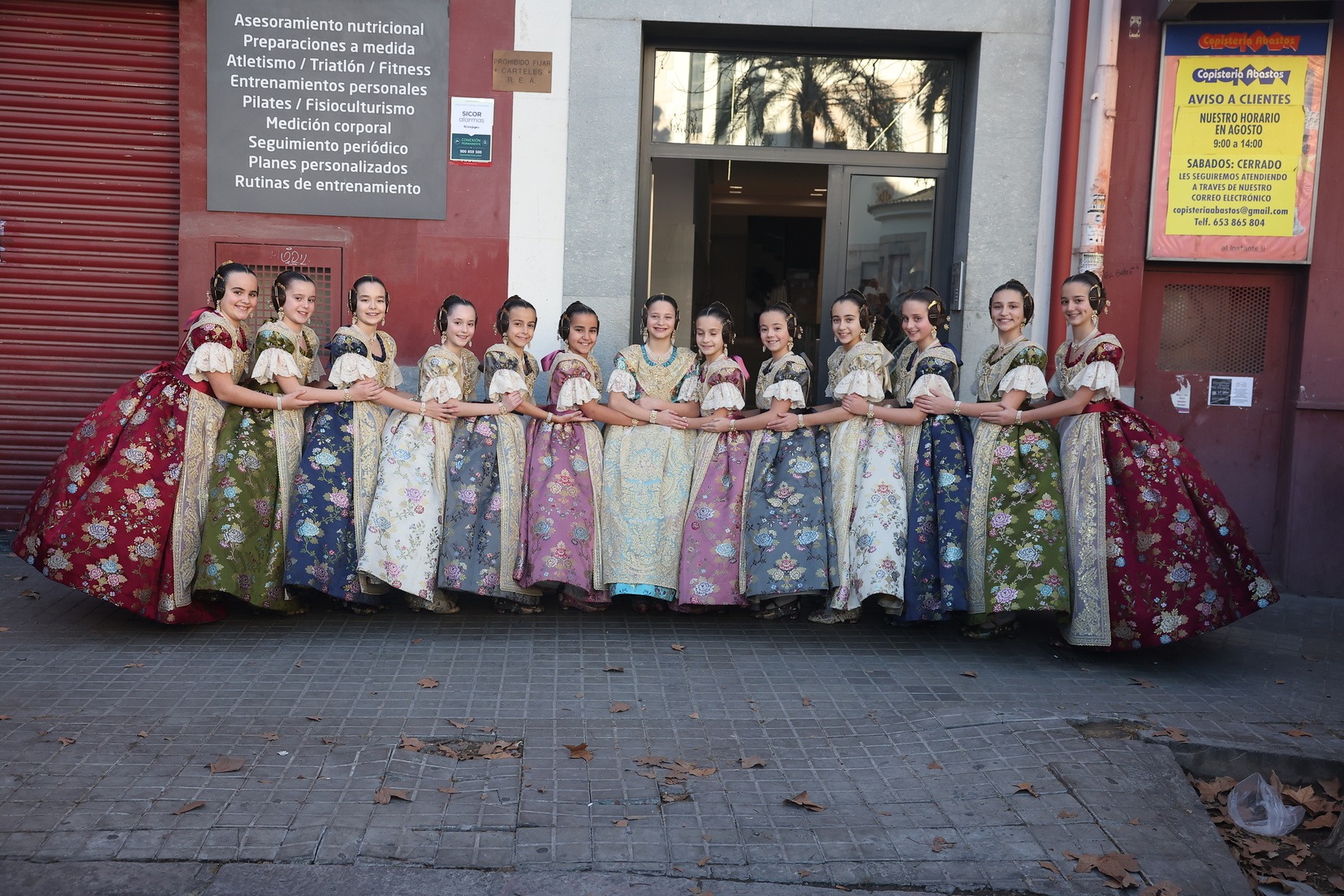 A las 15:45 Marta ha salido de su casa. Allí la esperaban las 12 pequeñas que componen su Corte de Honor, con sus primeros trajes confeccionados por La Joia Indumentaristas con las sedas de Compañía Valenciana de la Seda, además de familiares, amigos y amigas.