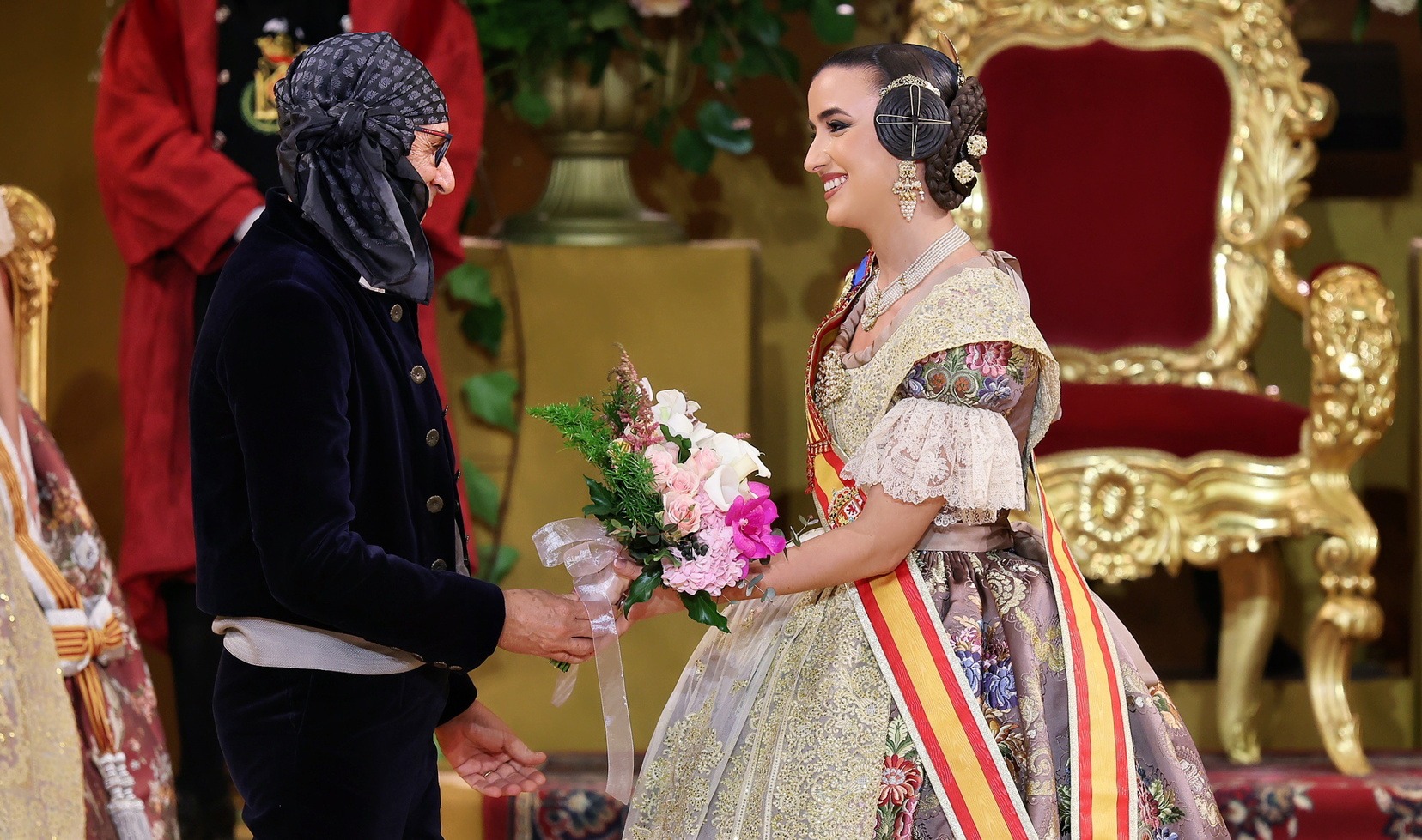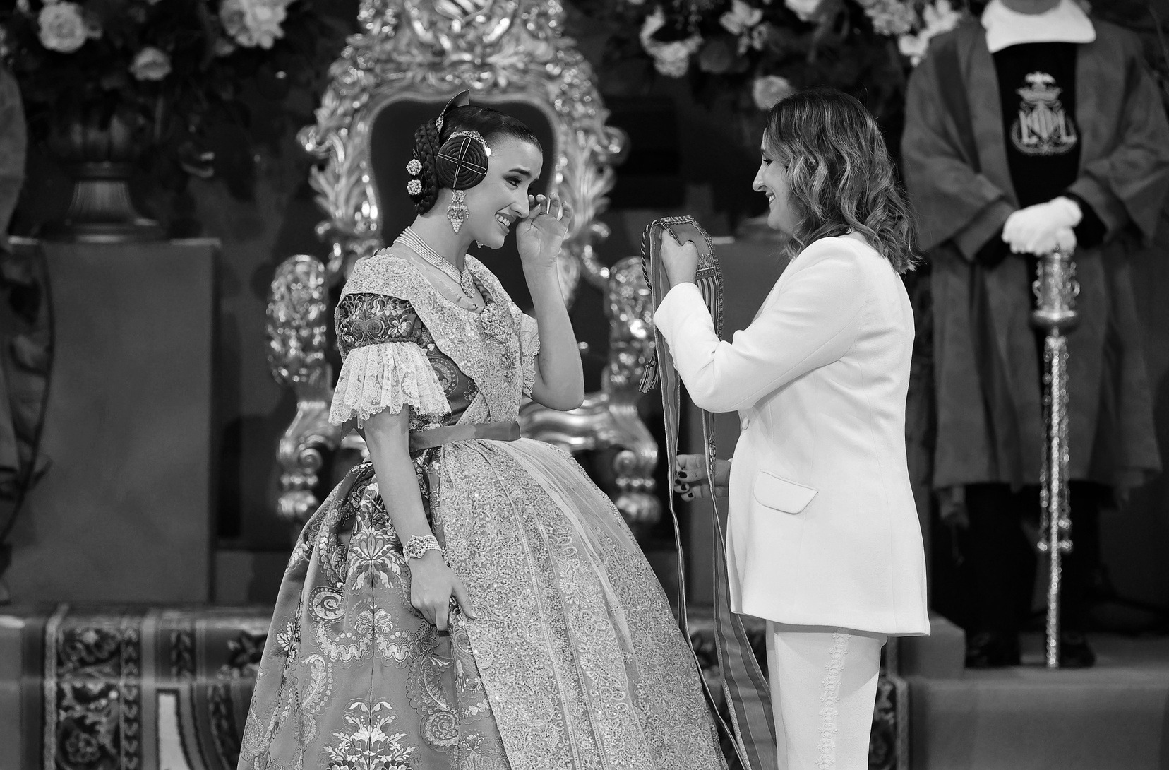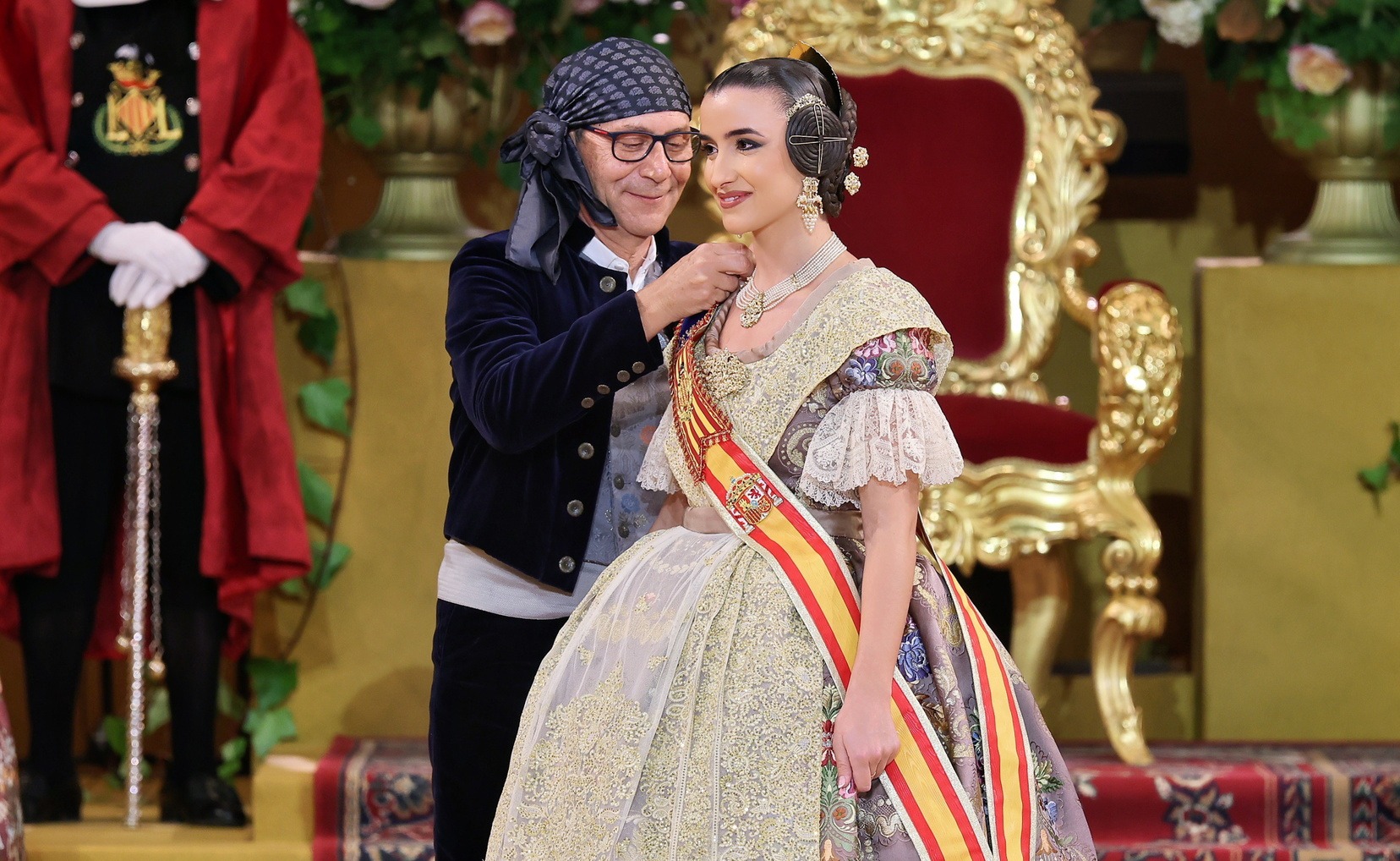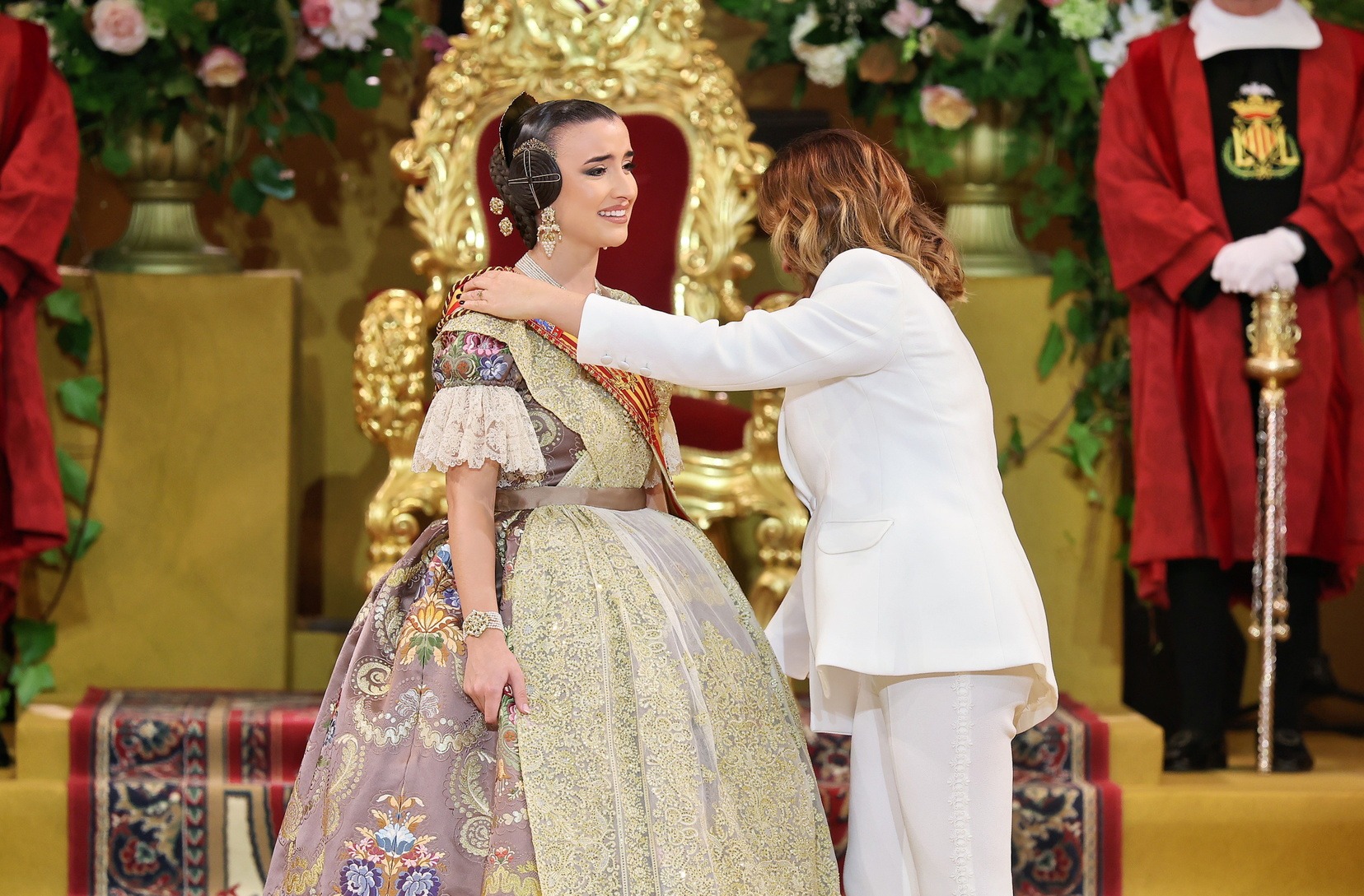 Allí la esperaban el Presidente de la Junta Central Fallera, Santiago Ballester, y su Corte de Honor, con quienes ha compartido uno de los instantes más importantes de su vida fallera. El momento culminante ha llegado cuando la alcaldesa de Valencia, María José Catalá, le ha impuesto la banda y la joia, dedicándole unas palabras llenas de cercanía y solemnidad en un acto que quedará para siempre en la memoria de Carmen.