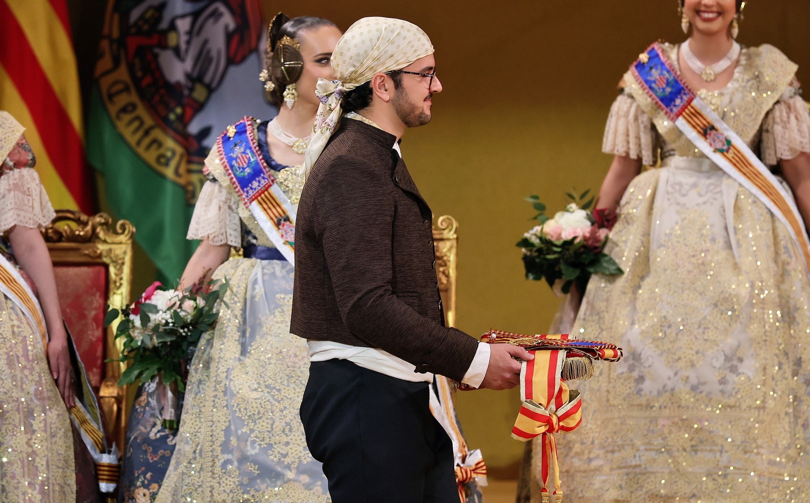 El momento, también ha sido muy especial para Carlos Prades Gil, hermano de Carmen, que ha sido el encargado de sacar la banda de una emocionada Fallera Mayor de Valencia, que ya luce este emblema como máxima representante de la fiesta fallera.