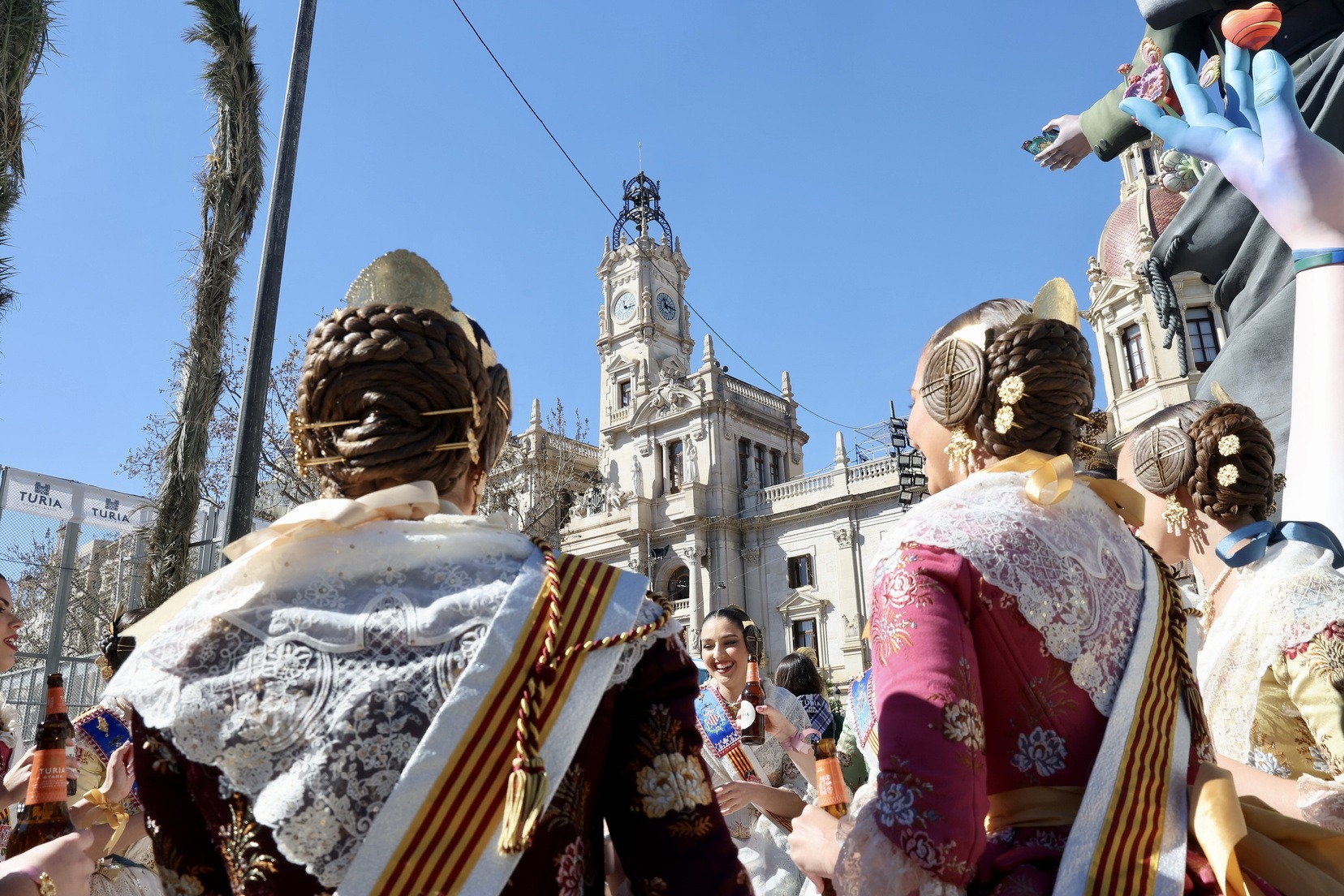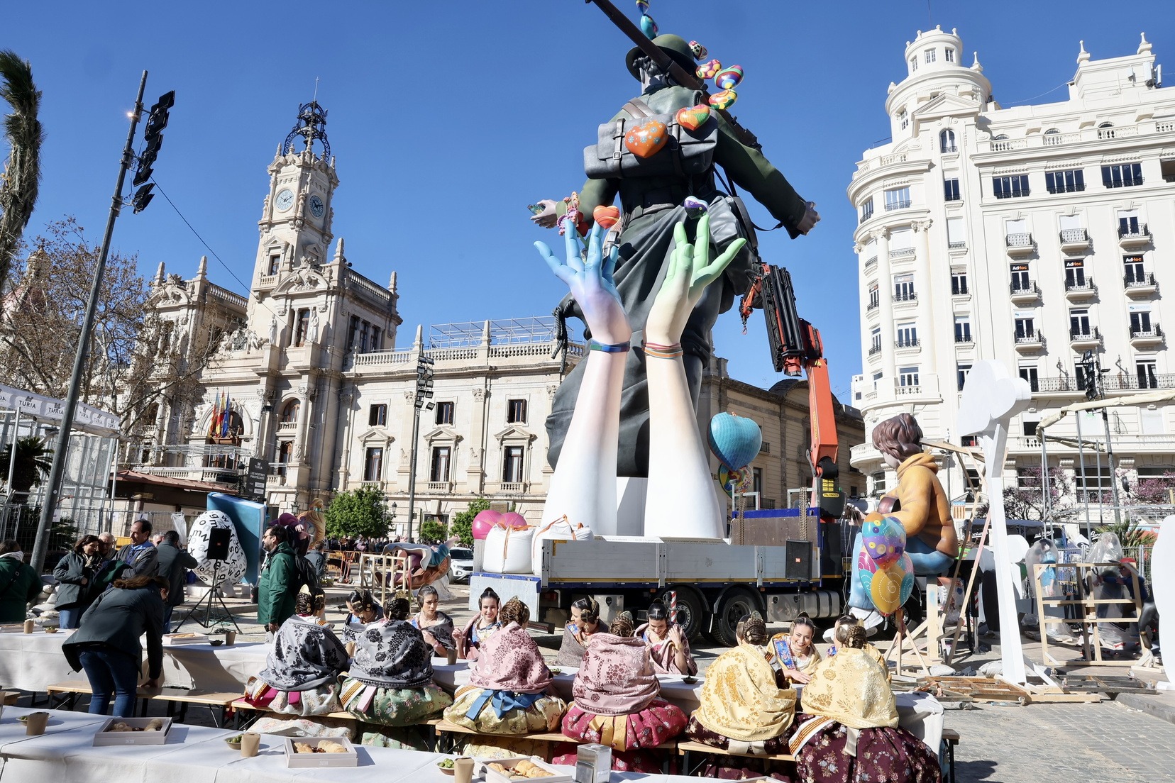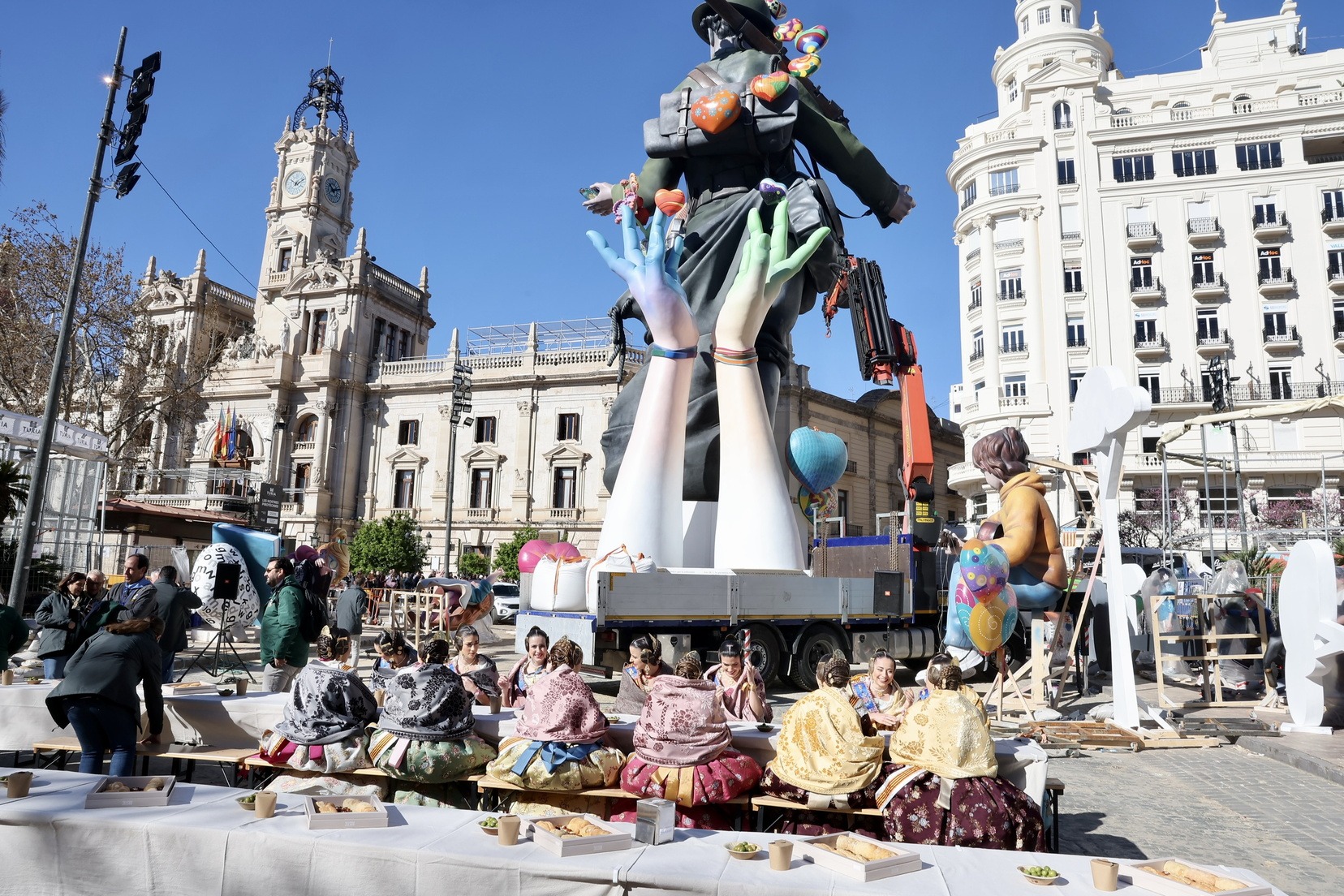 La plaza del Ayuntamiento ha acogido esta mañana el tradicional almuerzo de la Plantà, celebrado a los pies de la falla municipal “Hope”, que ya comienza a presidir el centro de la ciudad durante los días grandes de las Fallas.