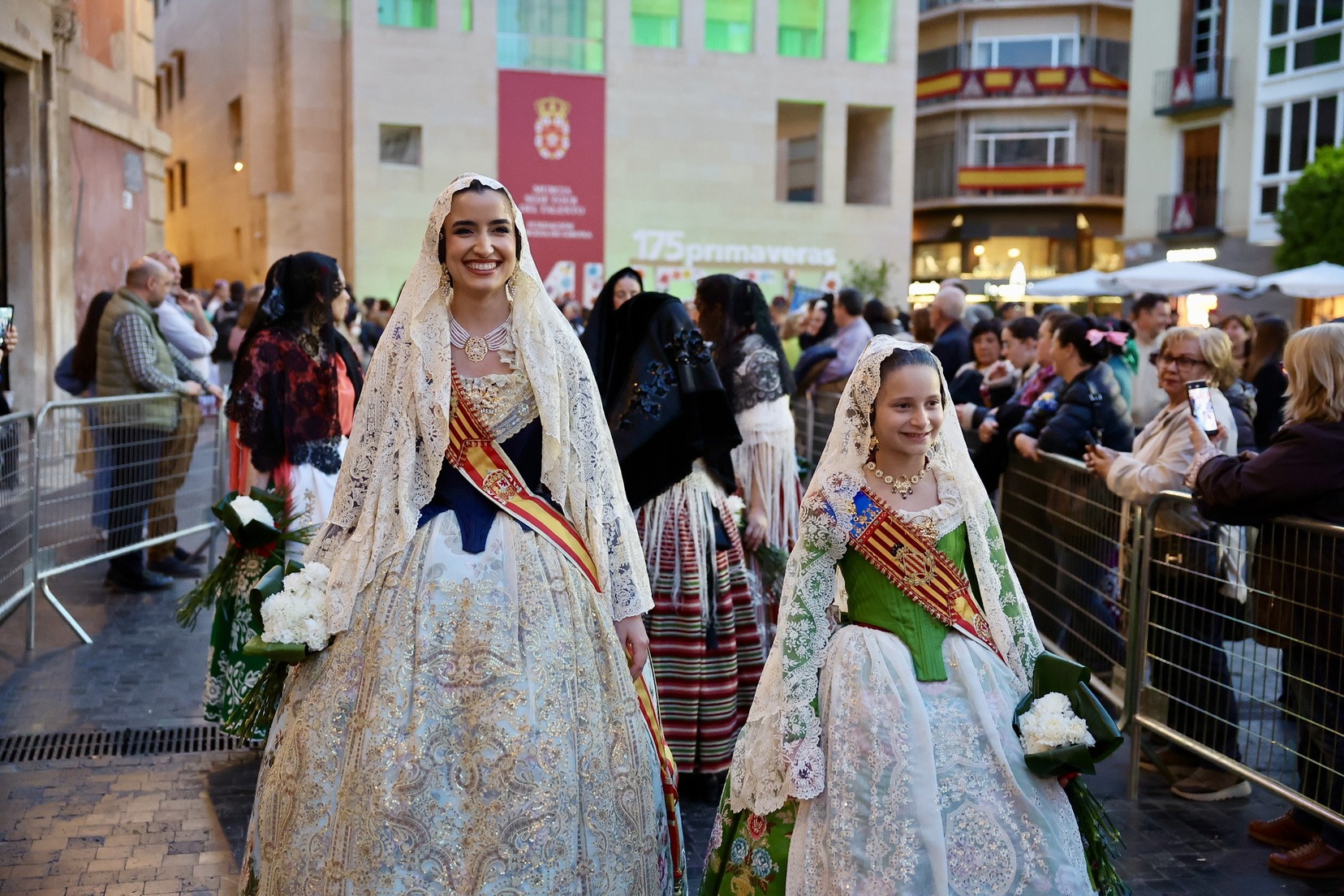 Las Falleras Mayores de Valencia, Carmen Prades Gil y Marta Mercader Roig, han participado en la tradicional Ofrenda de flores a la Virgen de la Fuensanta, patrona de Murcia, dentro de los actos de las Fiestas de la Primavera.