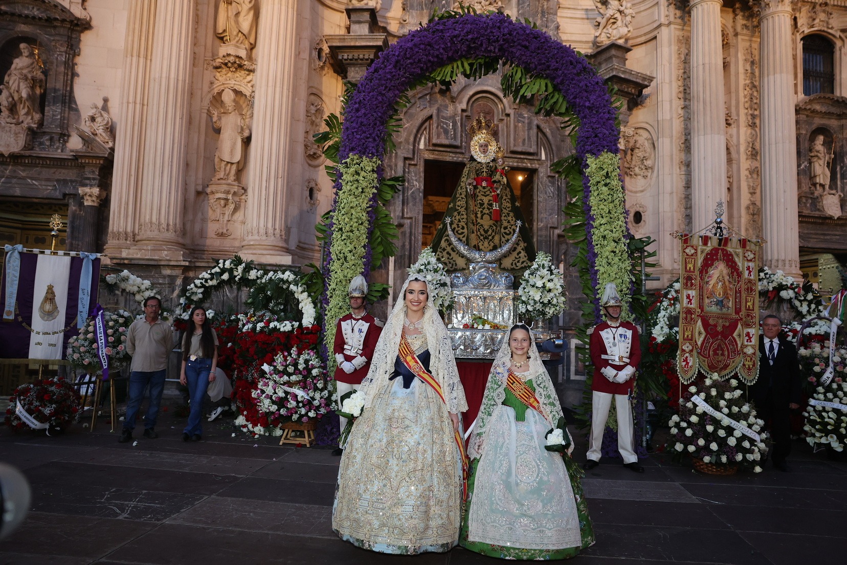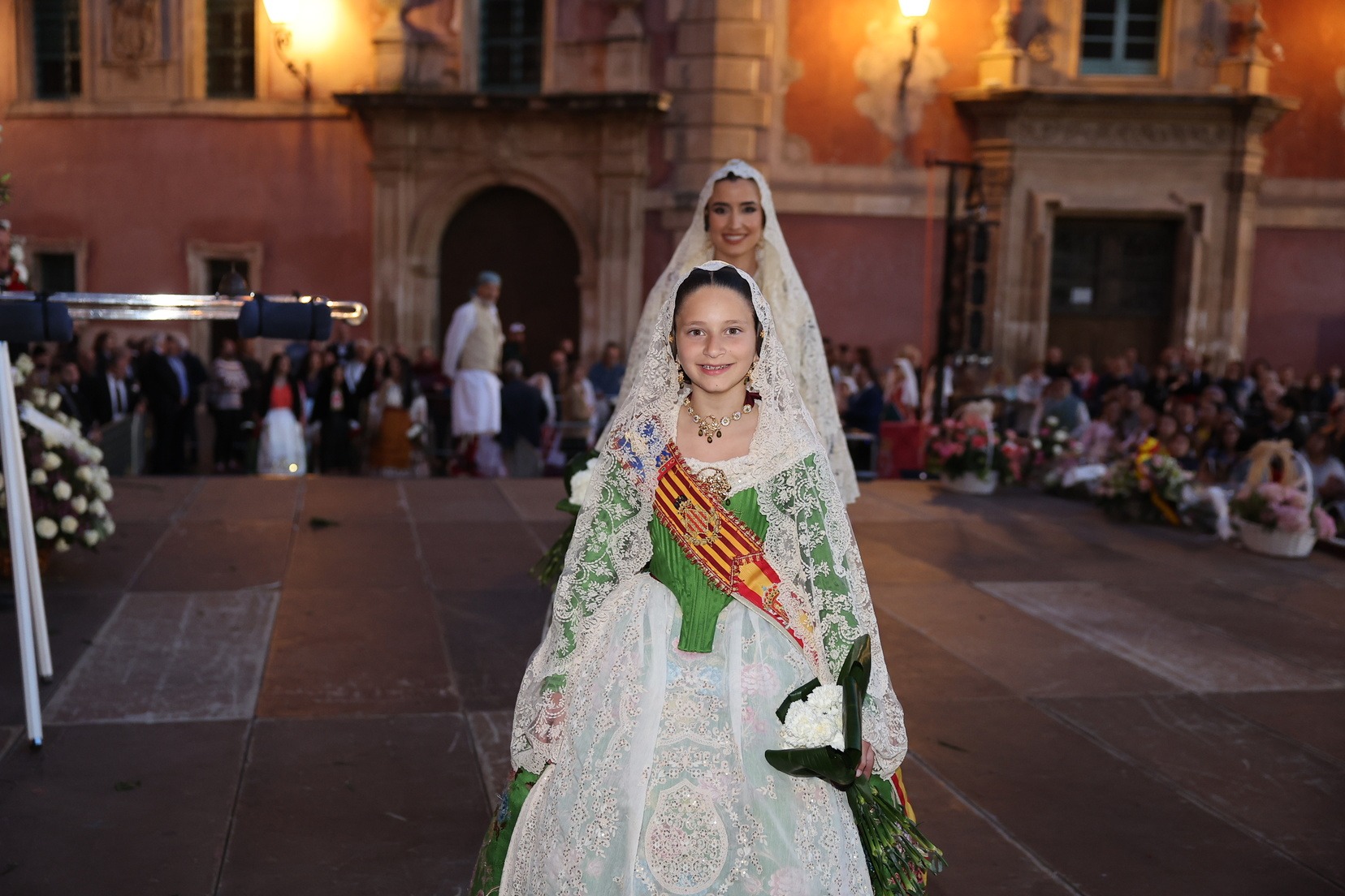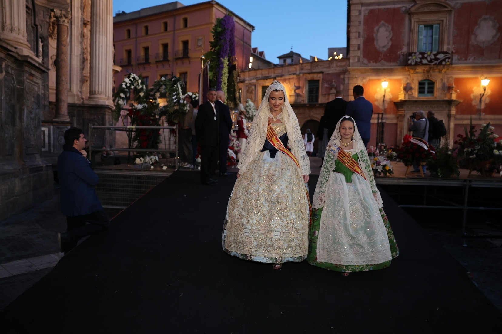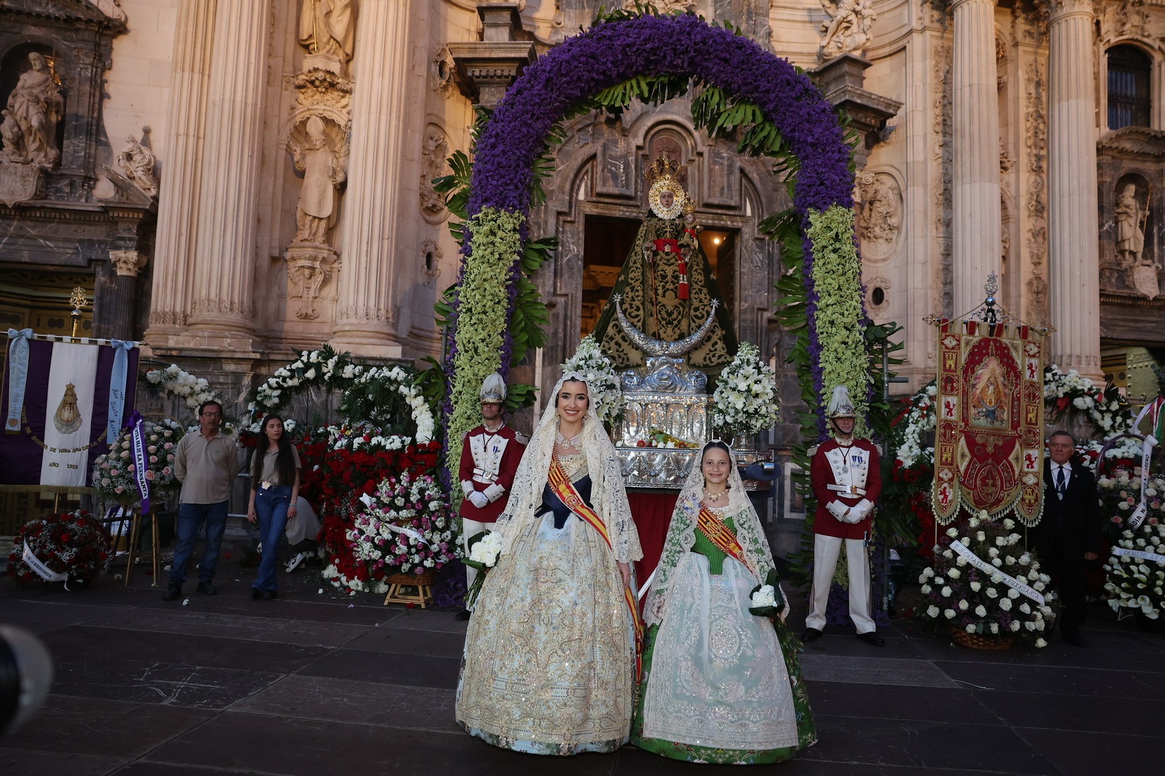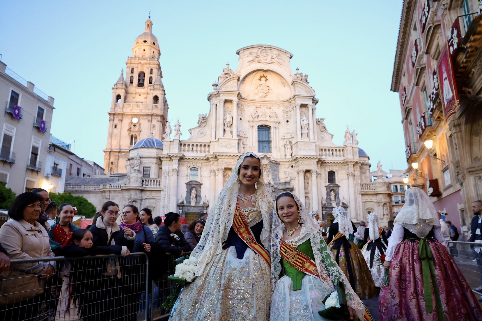 Ambas han acompañado a Ángela Muñoz y Leonor Antón, Reinas de la Huerta de Murcia, en este acto que ha finalizado en la plaza del Cardenal Belluga, a los pies de la Catedral, y que cada año reúne a miles de participantes. Más de medio centenar de peñas huertanas, junto a grupos folclóricos y colectivos tradicionales, han desfilado ataviados con el traje típico hasta el lugar de la Ofrenda para depositar sus ramos de flores, principalmente claveles, formando un tapiz floral en honor a su patrona.