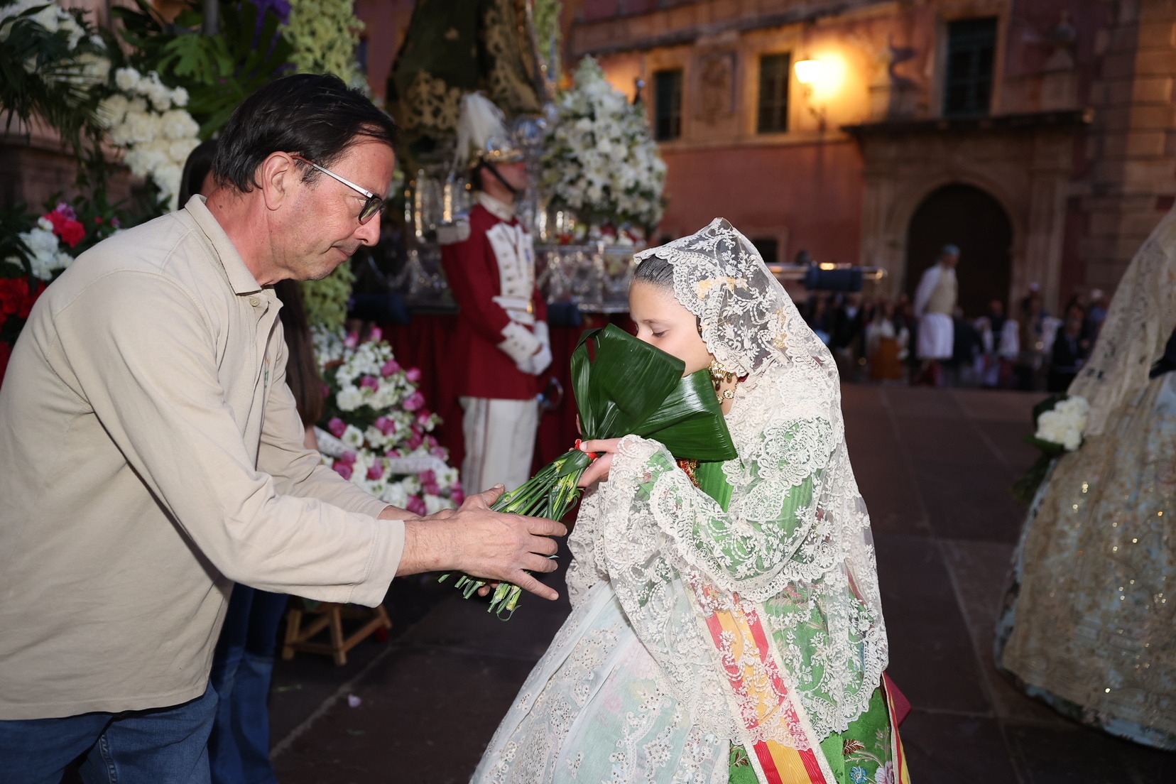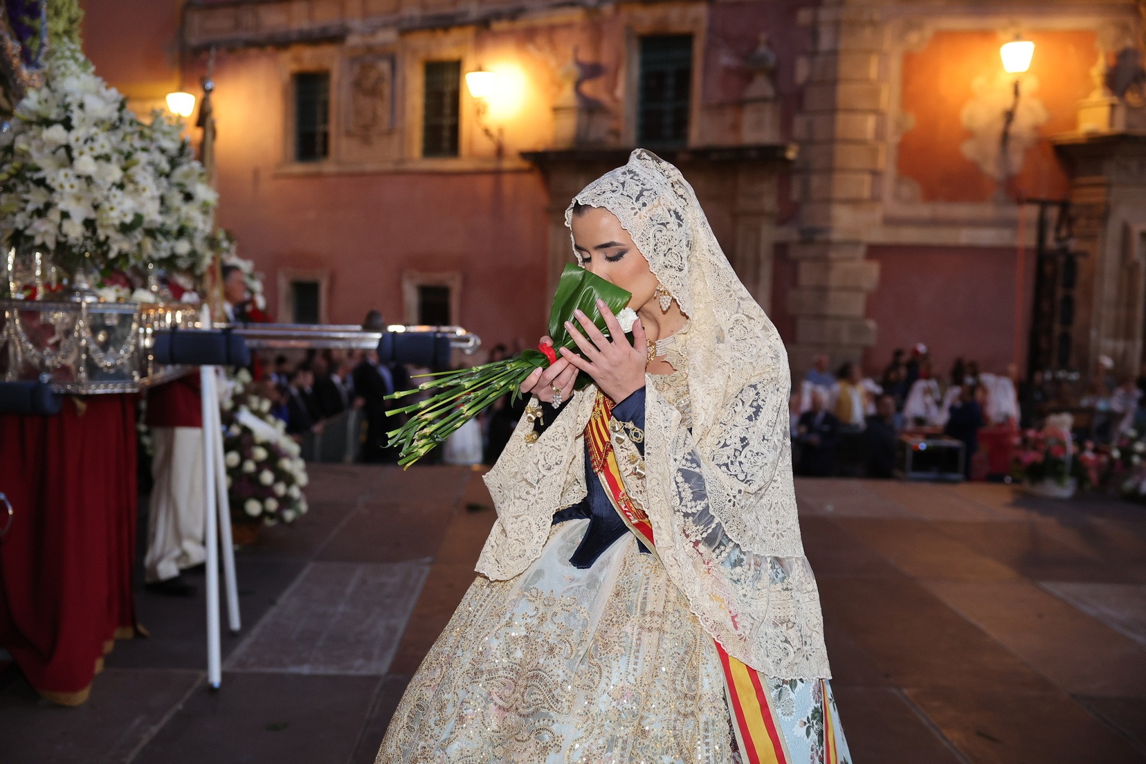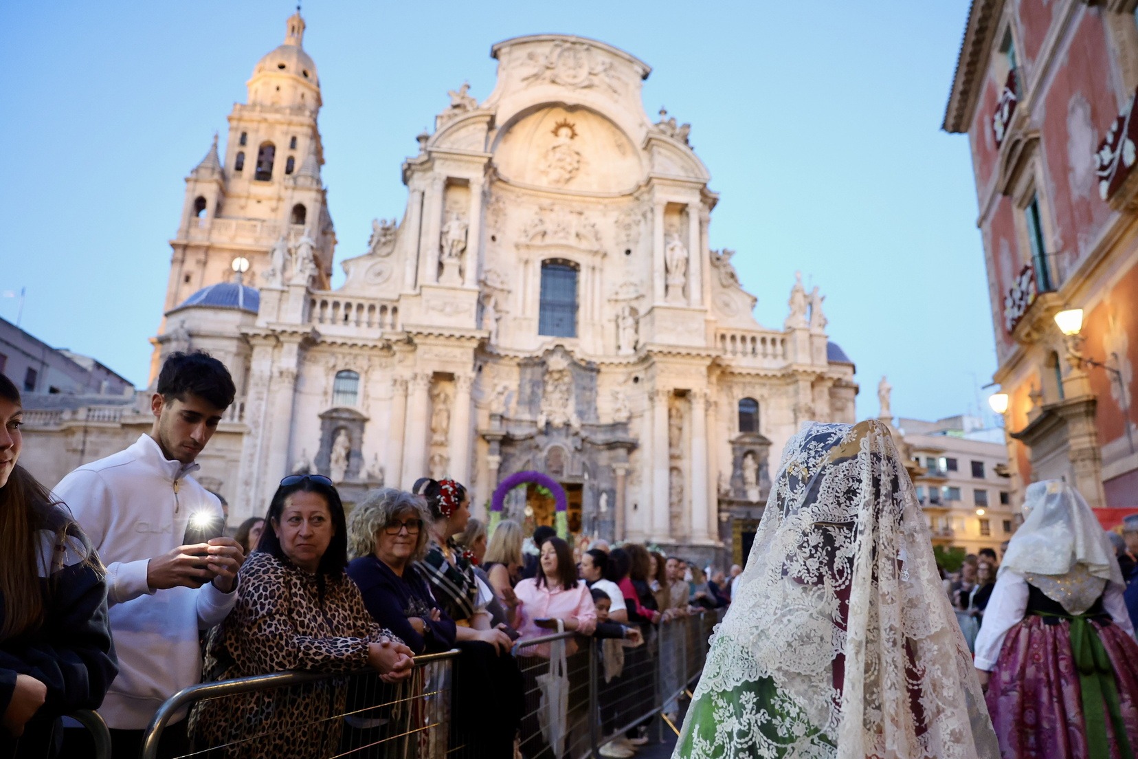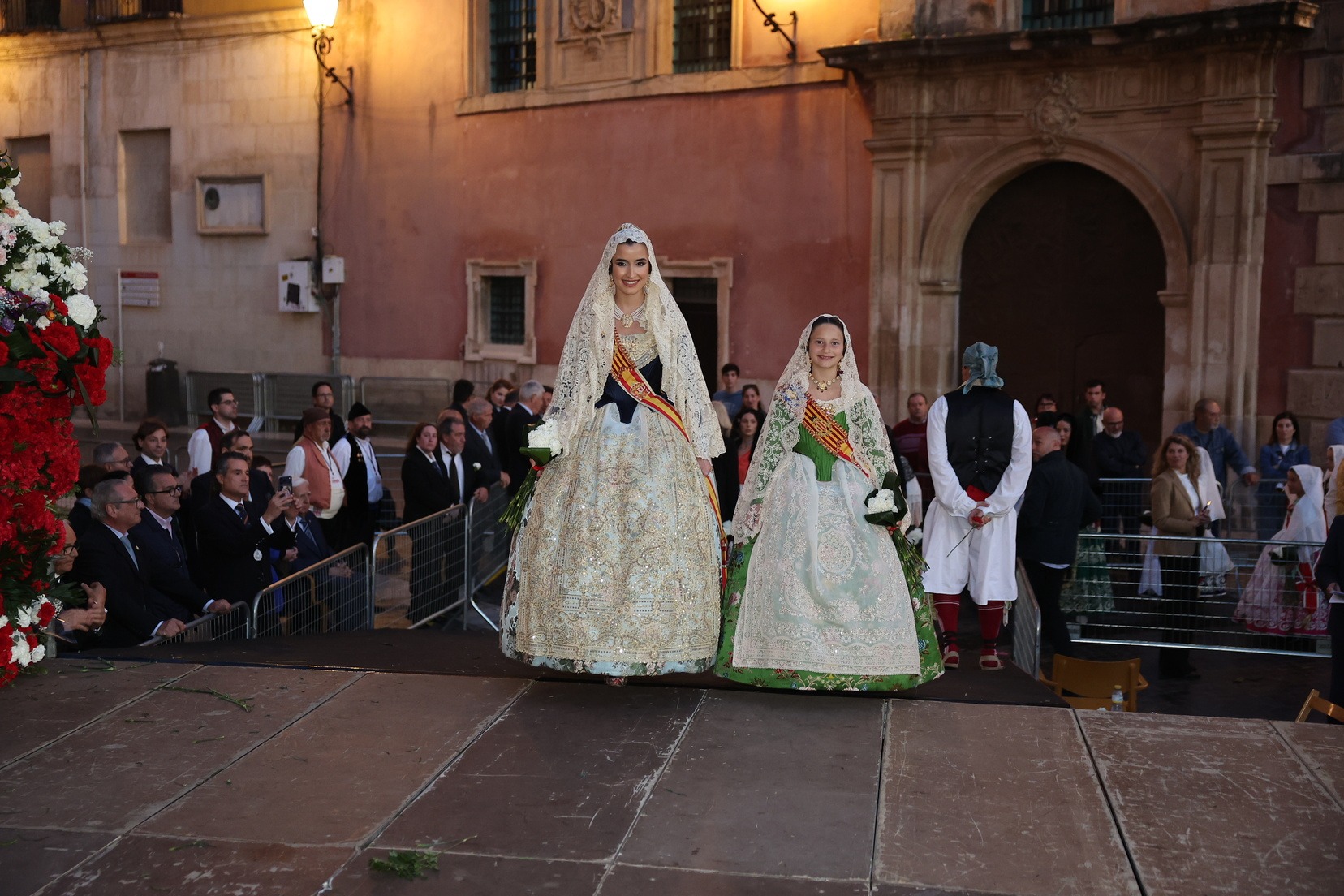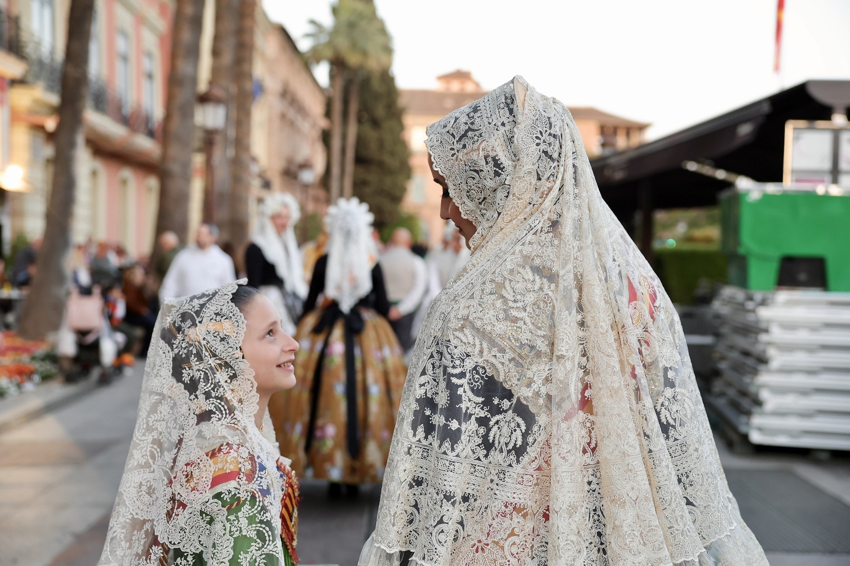 Ambas han acompañado a Ángela Muñoz y Leonor Antón, Reinas de la Huerta de Murcia, en este acto que ha finalizado en la plaza del Cardenal Belluga, a los pies de la Catedral, y que cada año reúne a miles de participantes. Más de medio centenar de peñas huertanas, junto a grupos folclóricos y colectivos tradicionales, han desfilado ataviados con el traje típico hasta el lugar de la Ofrenda para depositar sus ramos de flores, principalmente claveles, formando un tapiz floral en honor a su patrona.