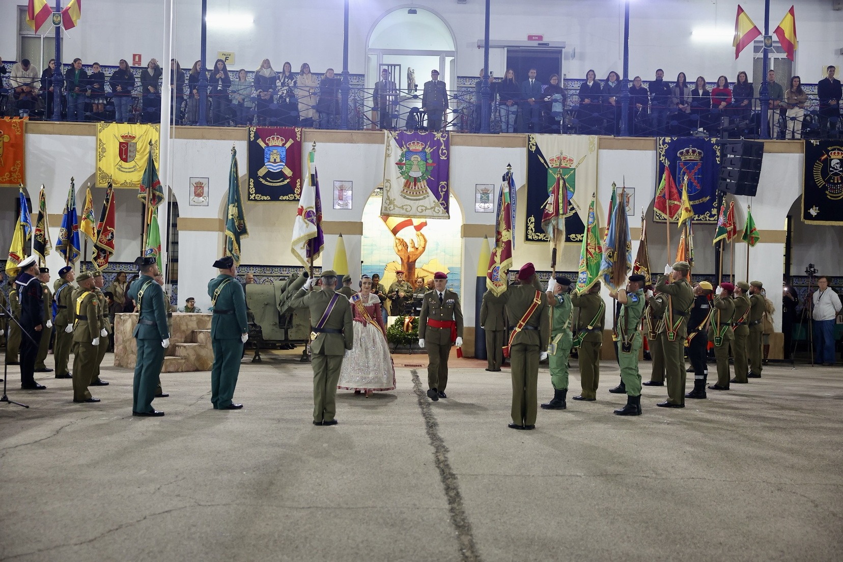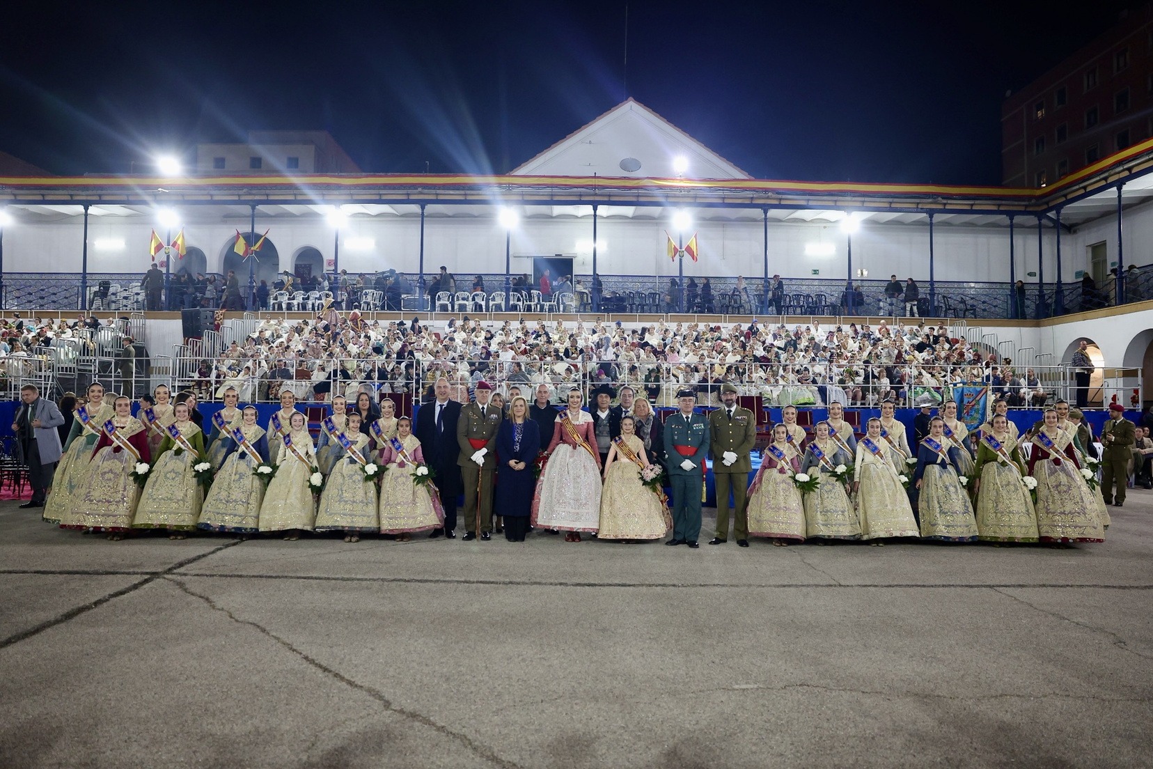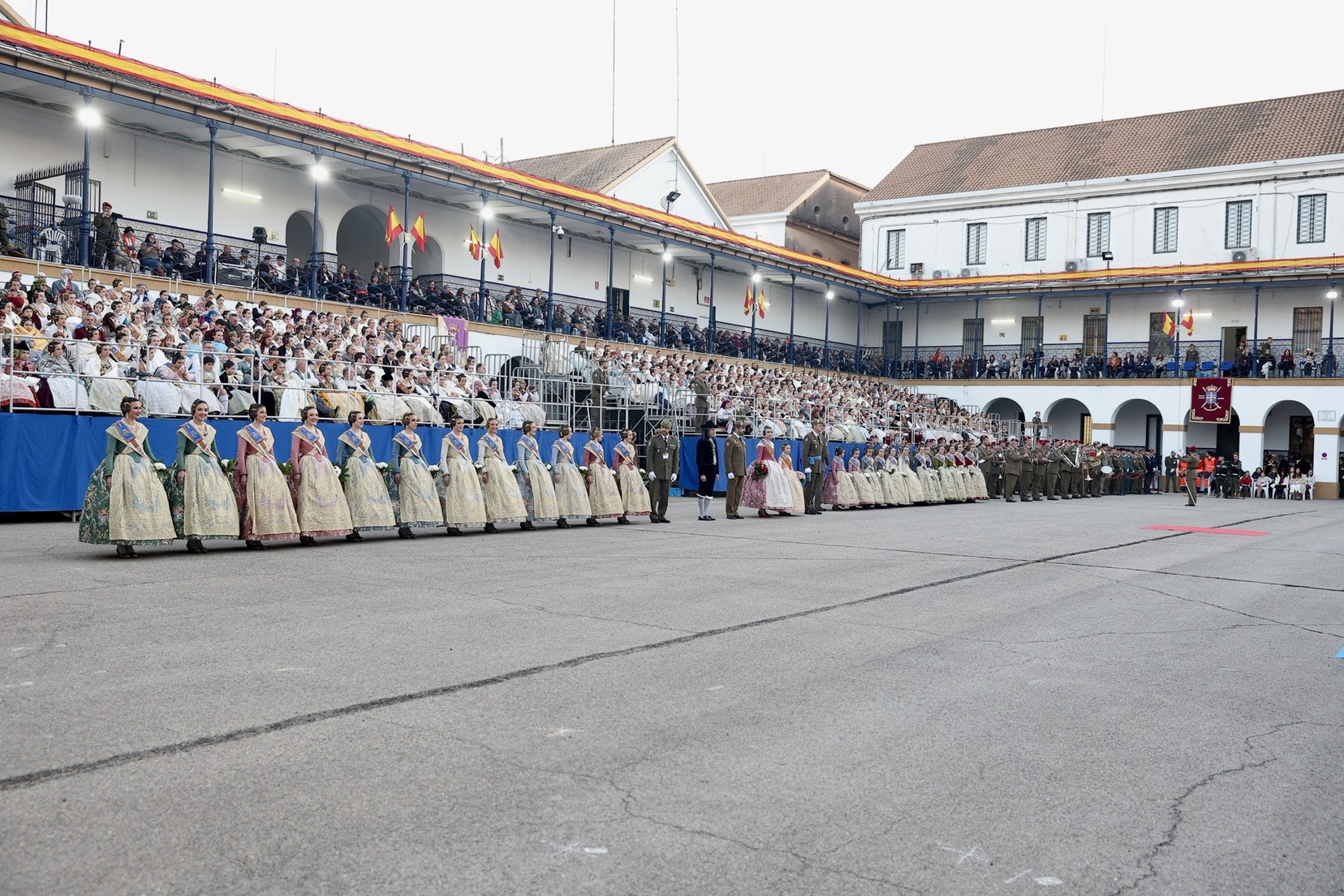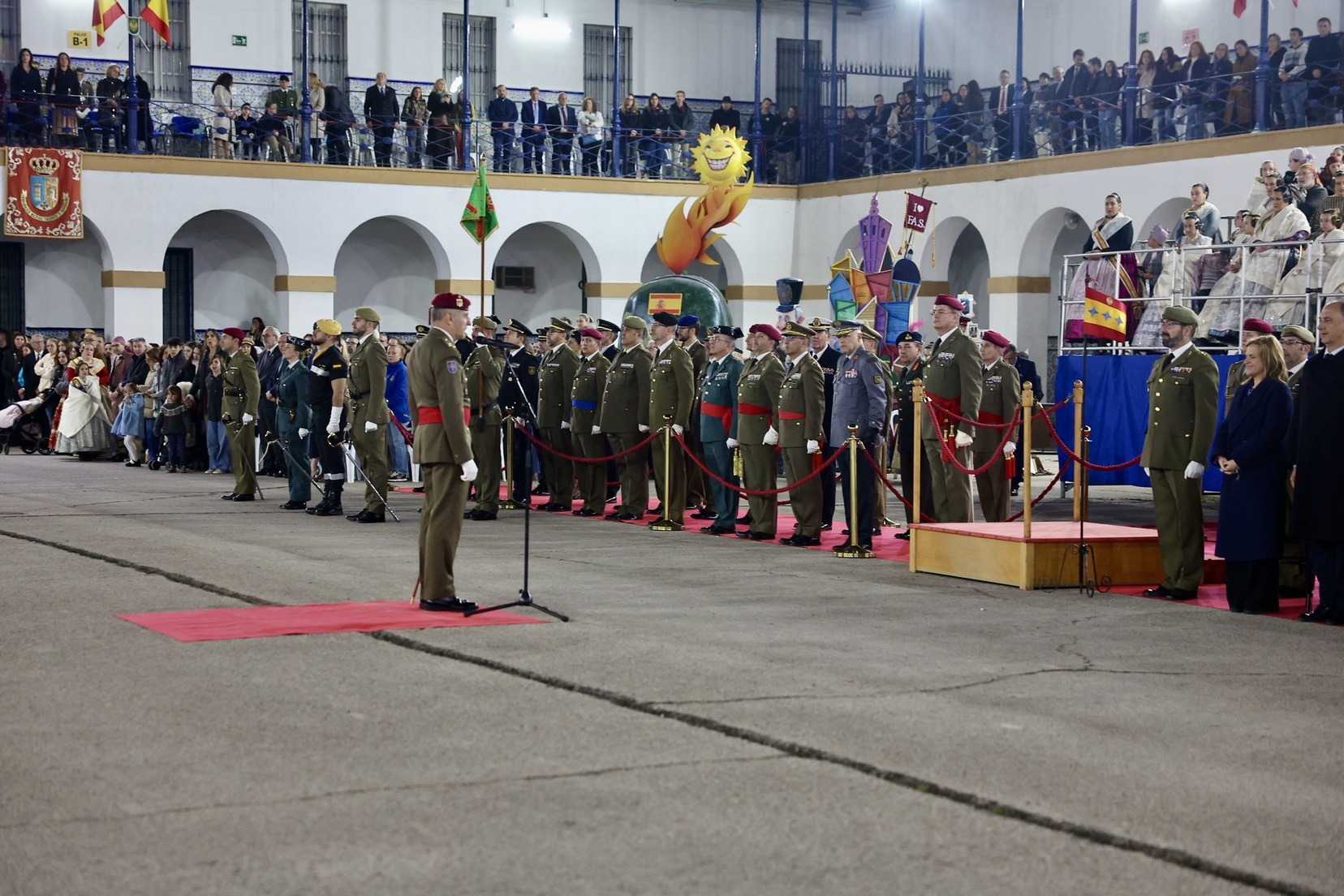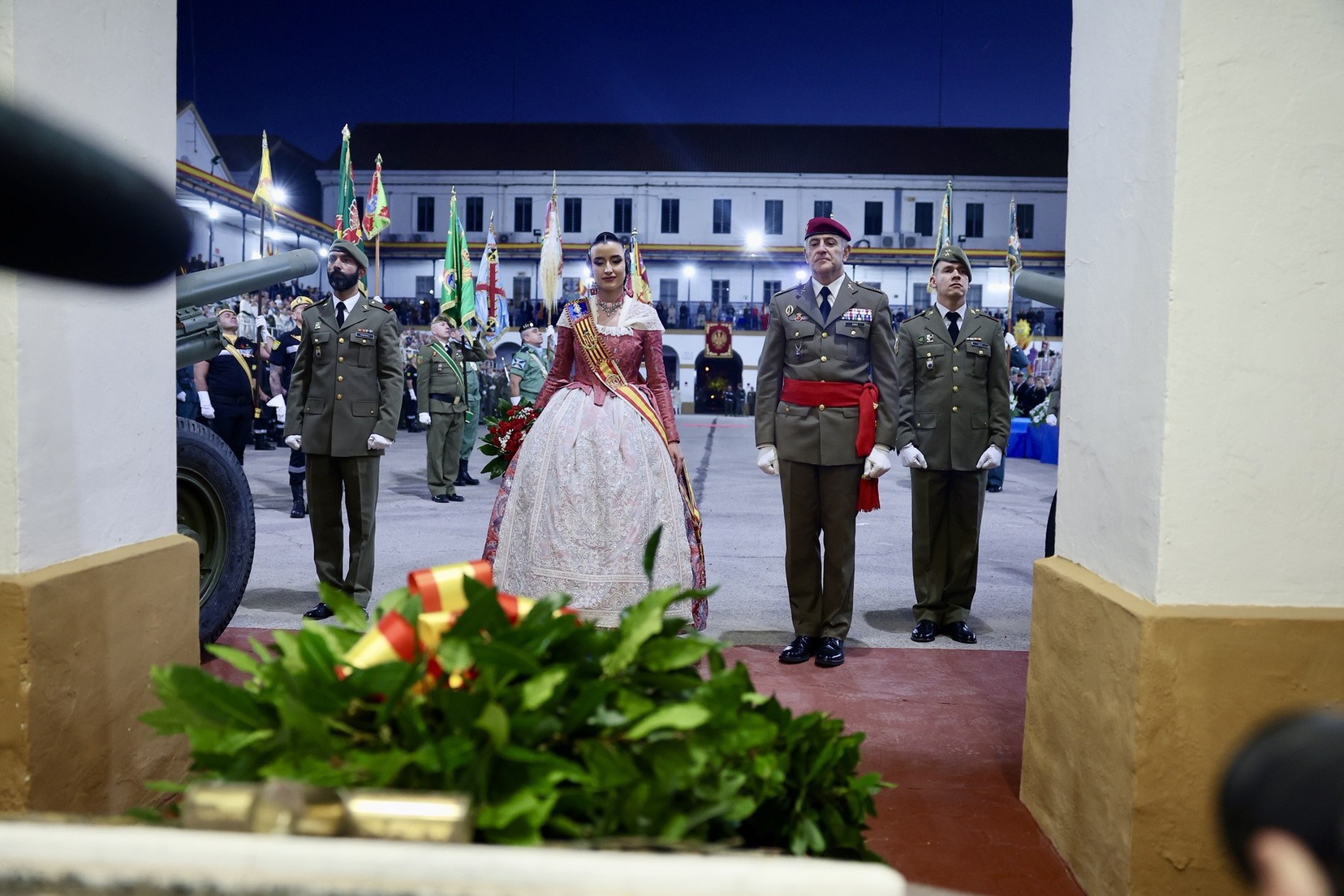 Las Falleras Mayores de Valencia, Carmen Prades y Marta Mercader, junto a sus Cortes de Honor, han llegado en carruaje, tal y como es tradicional, y tras ser recibidas por el Teniente General del Cuartel General Terrestre de Alta Disponibilidad, Luis Sáez Rocandio, han presidido junto a él este solemne homenaje que una vez más ha contado con la presencia de numerosas autoridades civiles y militares.