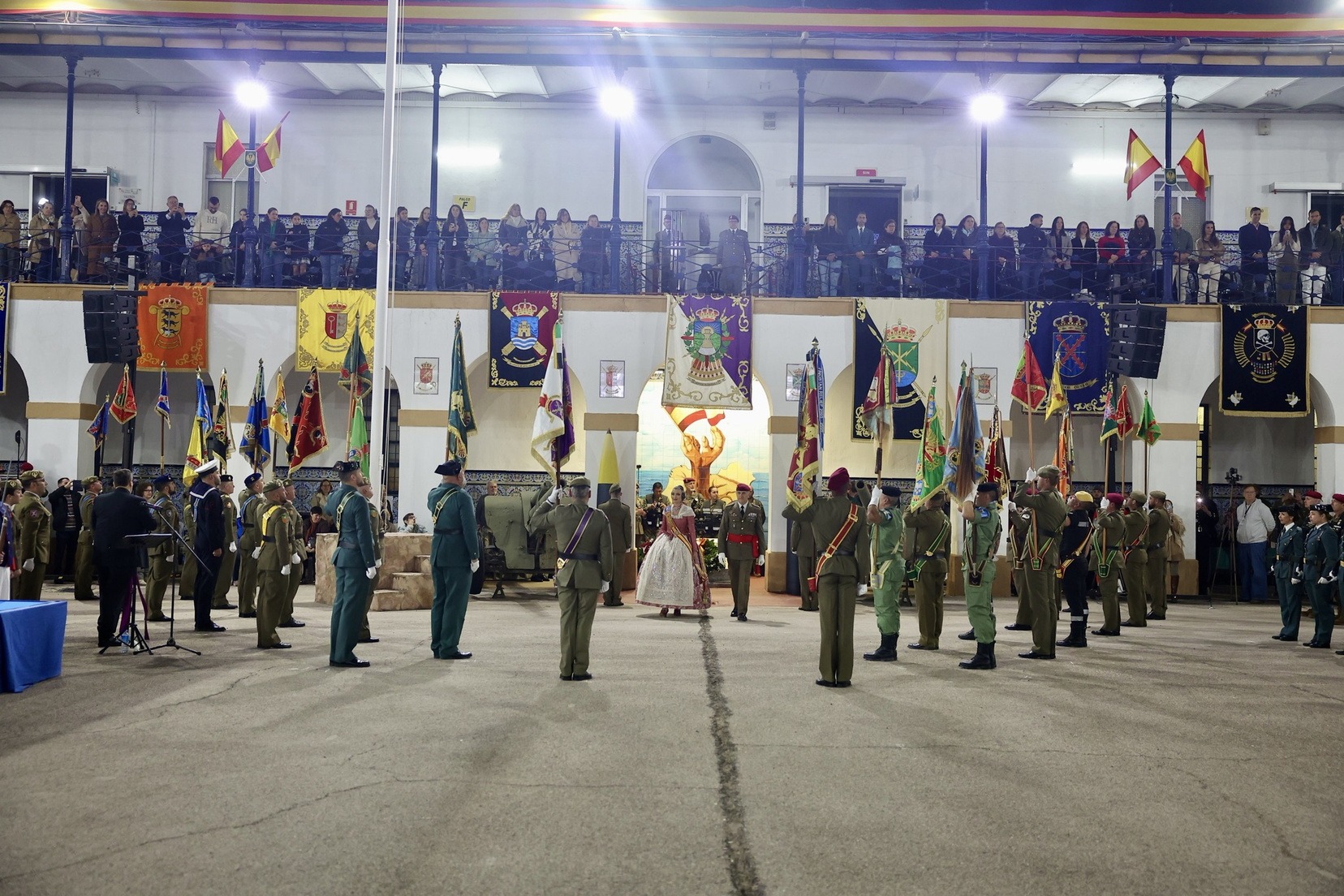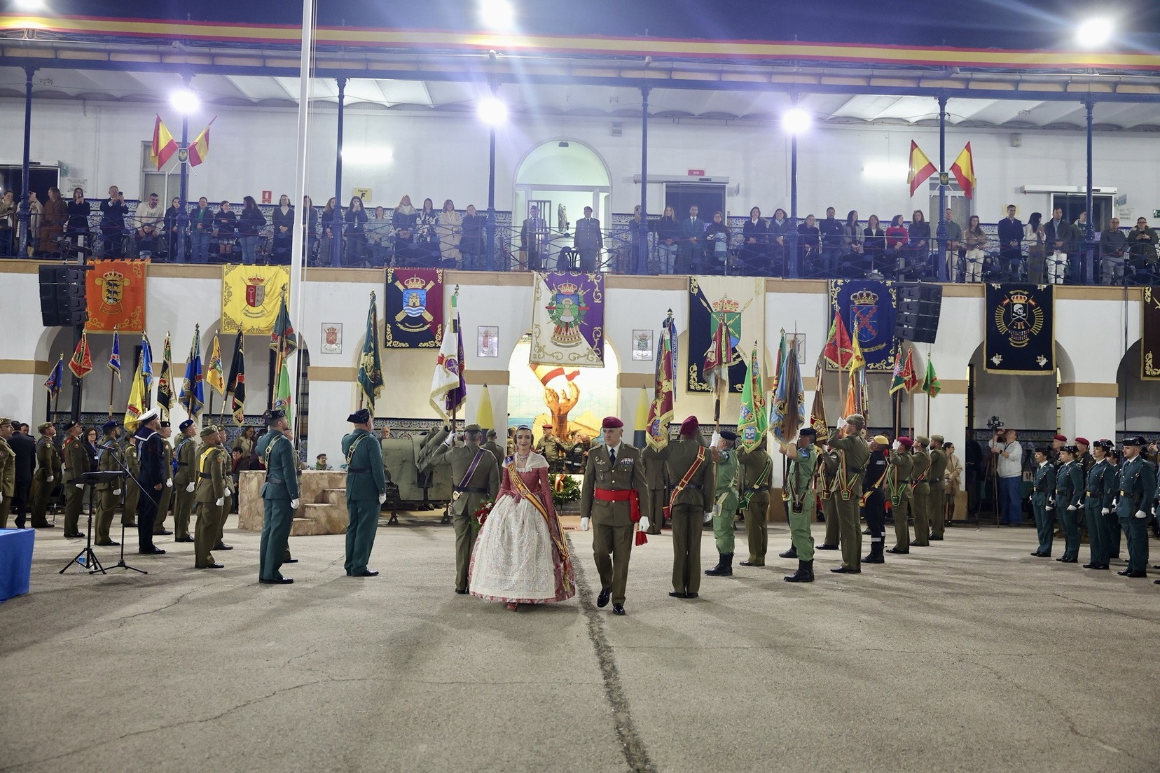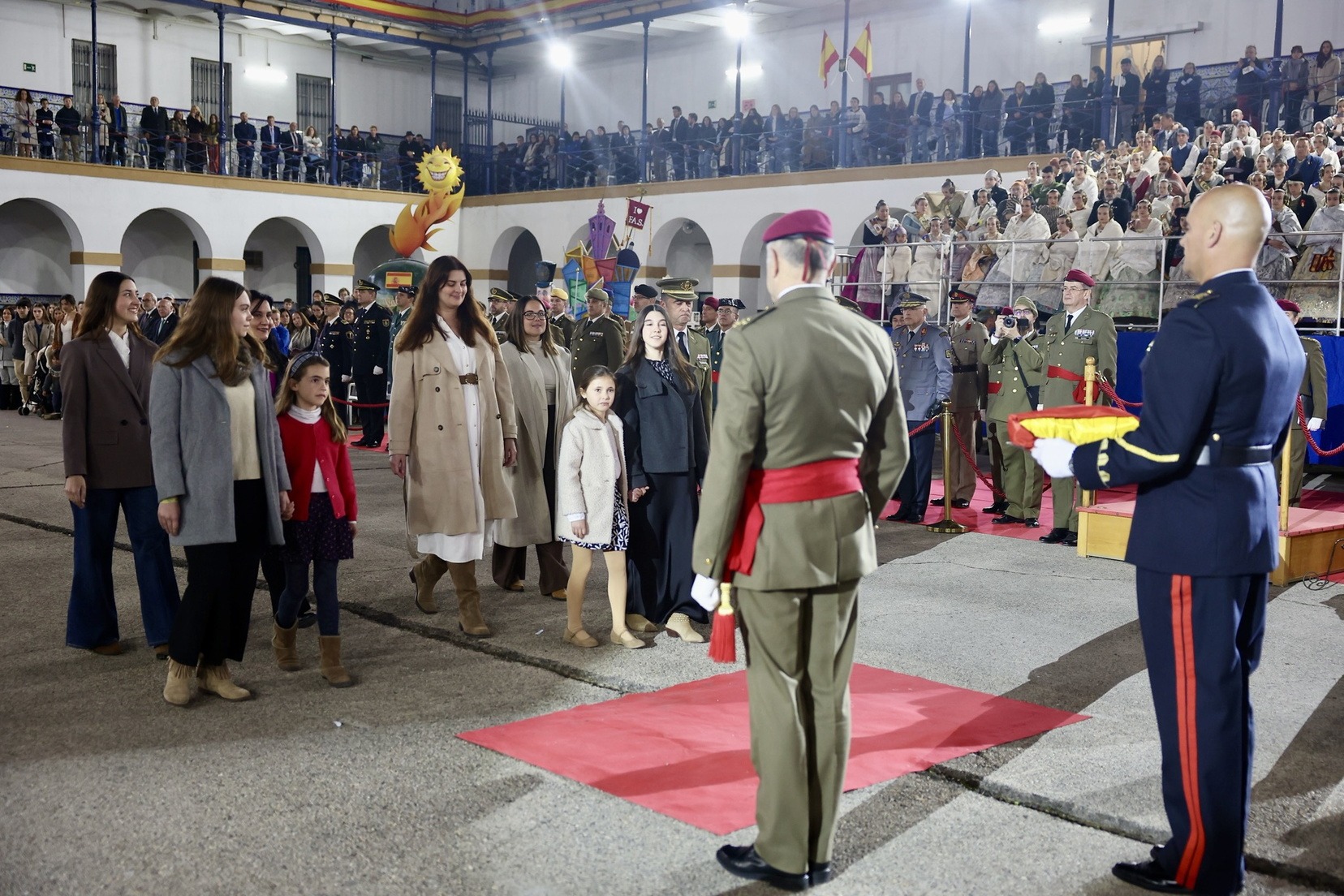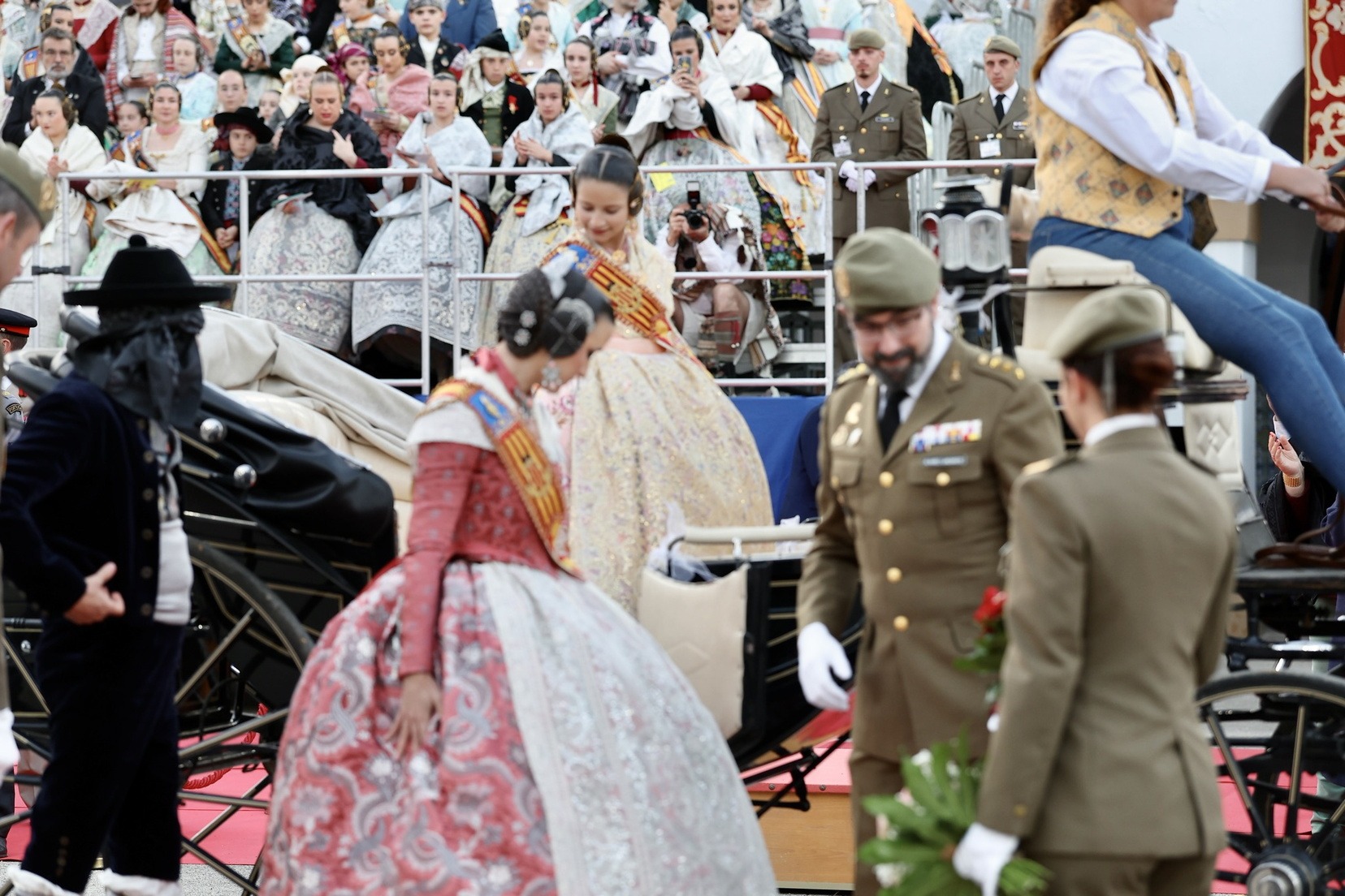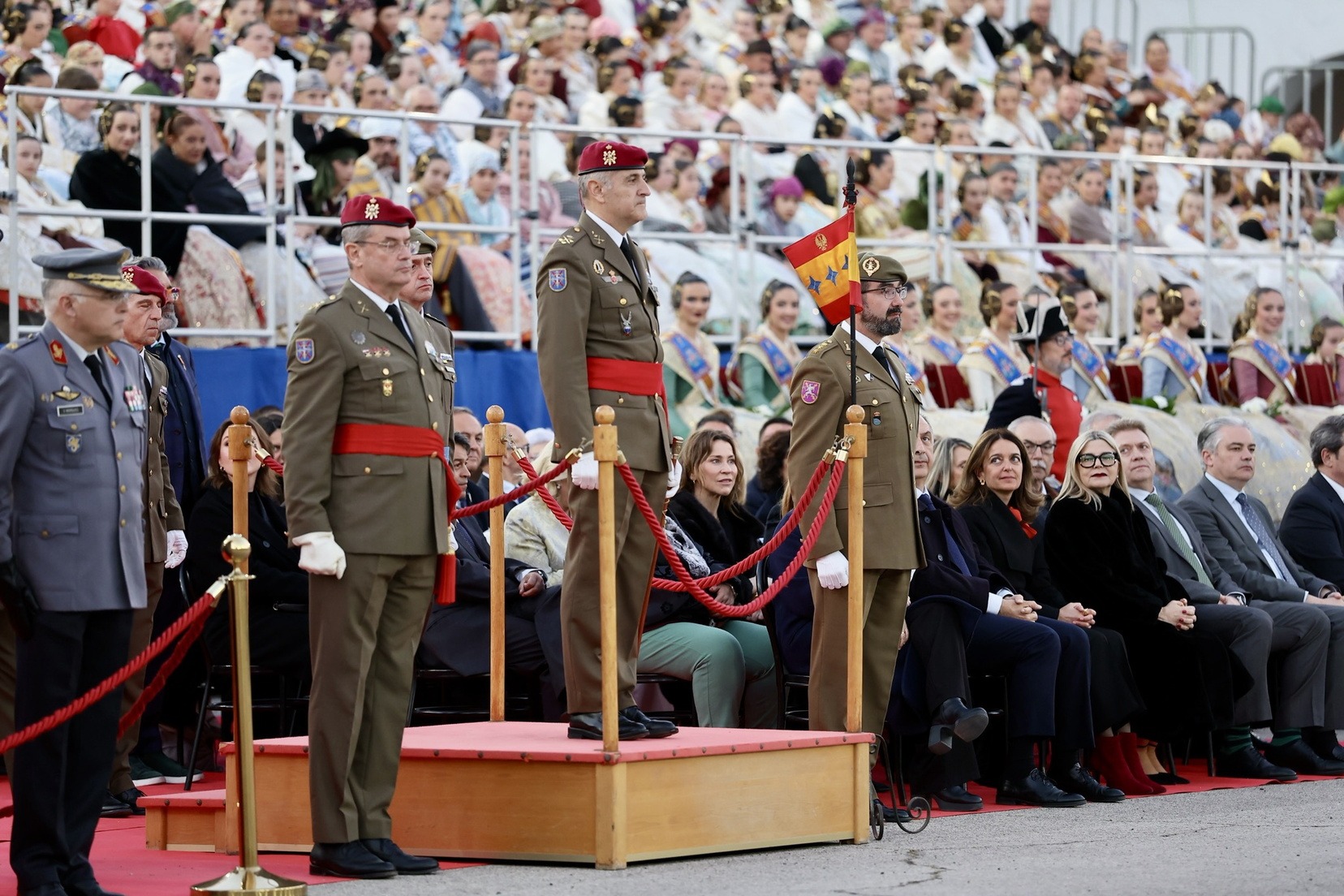 Las Falleras Mayores de Valencia, Carmen Prades y Marta Mercader, junto a sus Cortes de Honor, han llegado en carruaje, tal y como es tradicional, y tras ser recibidas por el Teniente General del Cuartel General Terrestre de Alta Disponibilidad, Luis Sáez Rocandio, han presidido junto a él este solemne homenaje que una vez más ha contado con la presencia de numerosas autoridades civiles y militares.