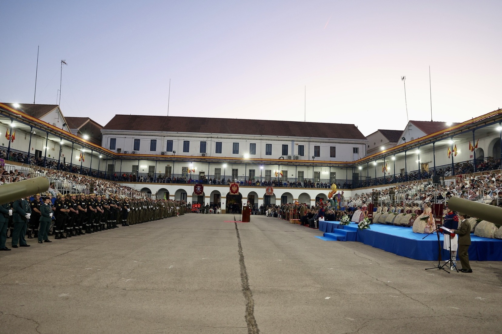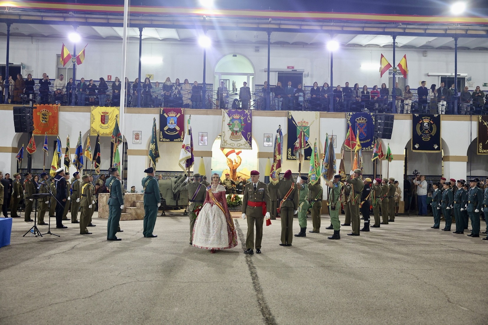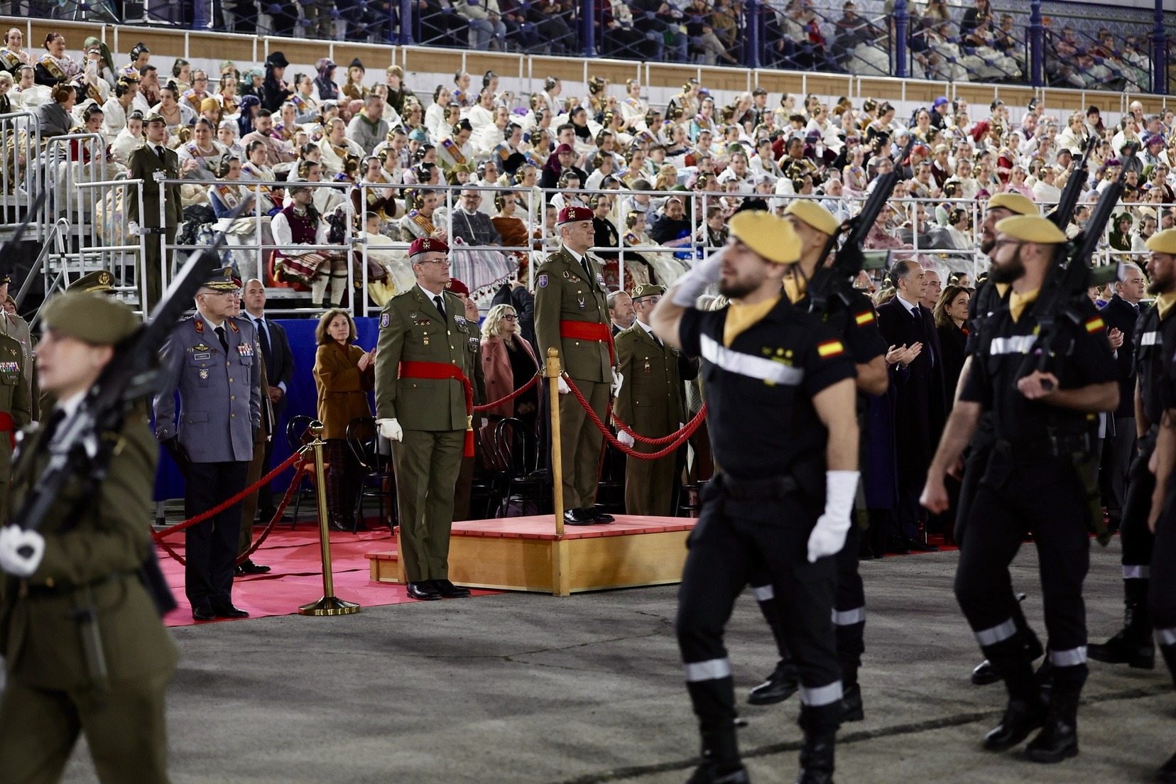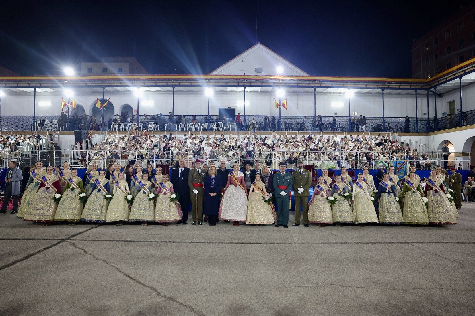 Las Falleras Mayores de Valencia, Carmen Prades y Marta Mercader, junto a sus Cortes de Honor, han llegado en carruaje, tal y como es tradicional, y tras ser recibidas por el Teniente General del Cuartel General Terrestre de Alta Disponibilidad, Luis Sáez Rocandio, han presidido junto a él este solemne homenaje que una vez más ha contado con la presencia de numerosas autoridades civiles y militares.