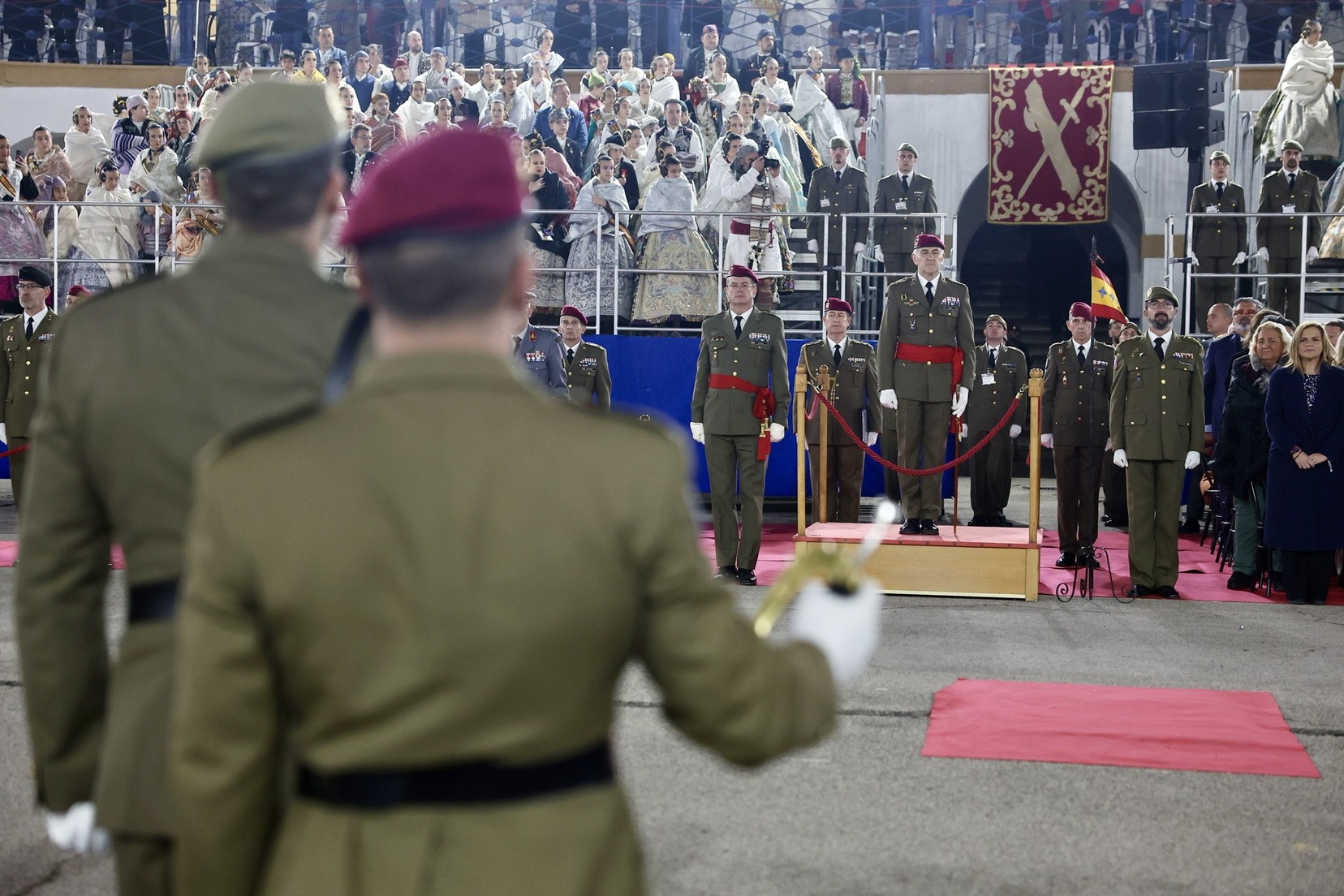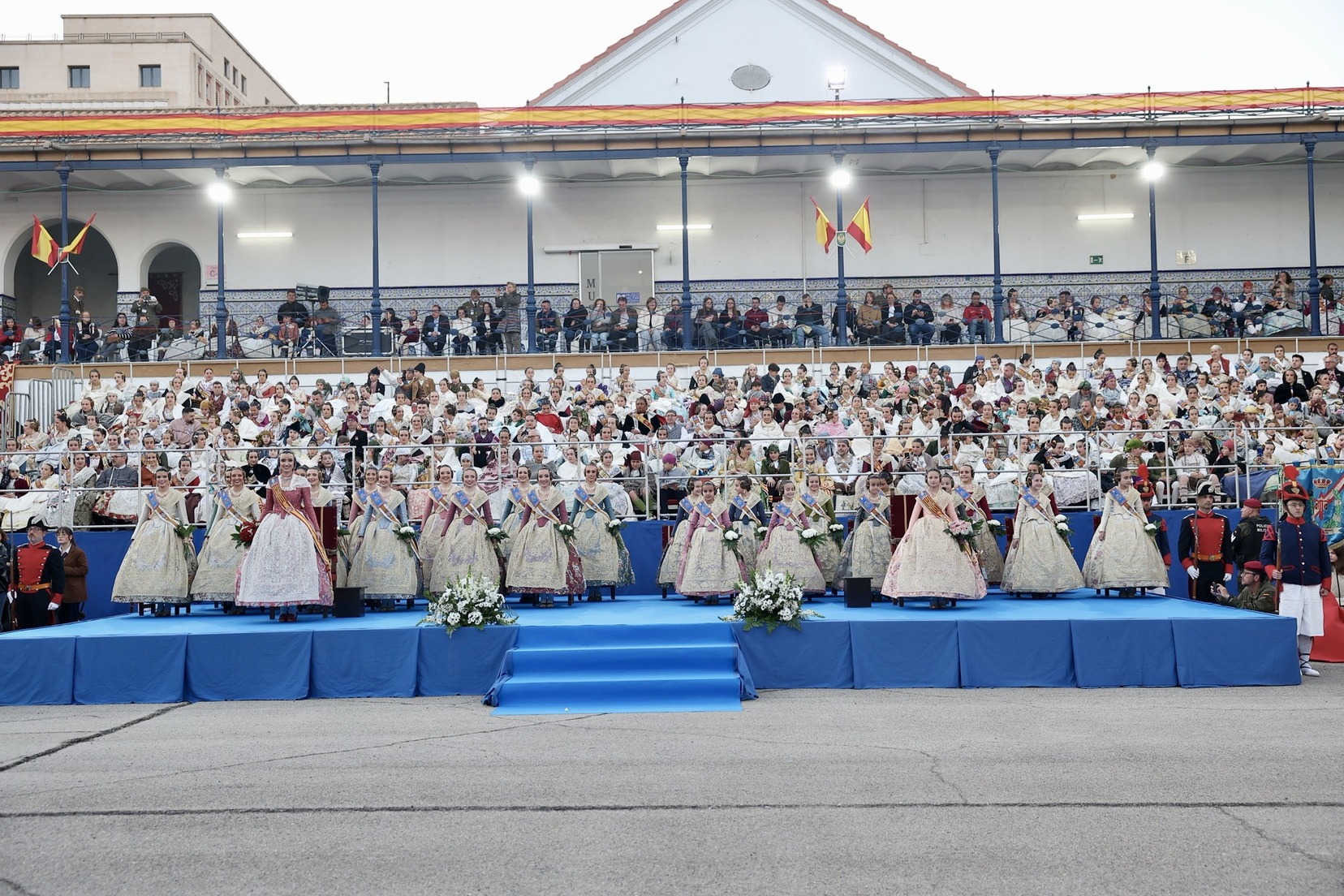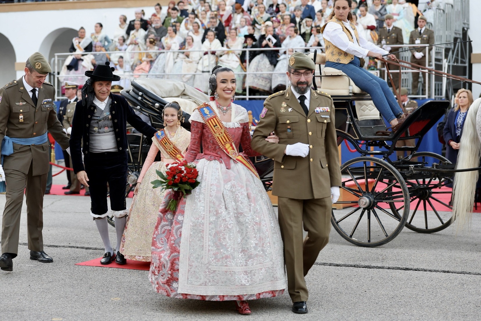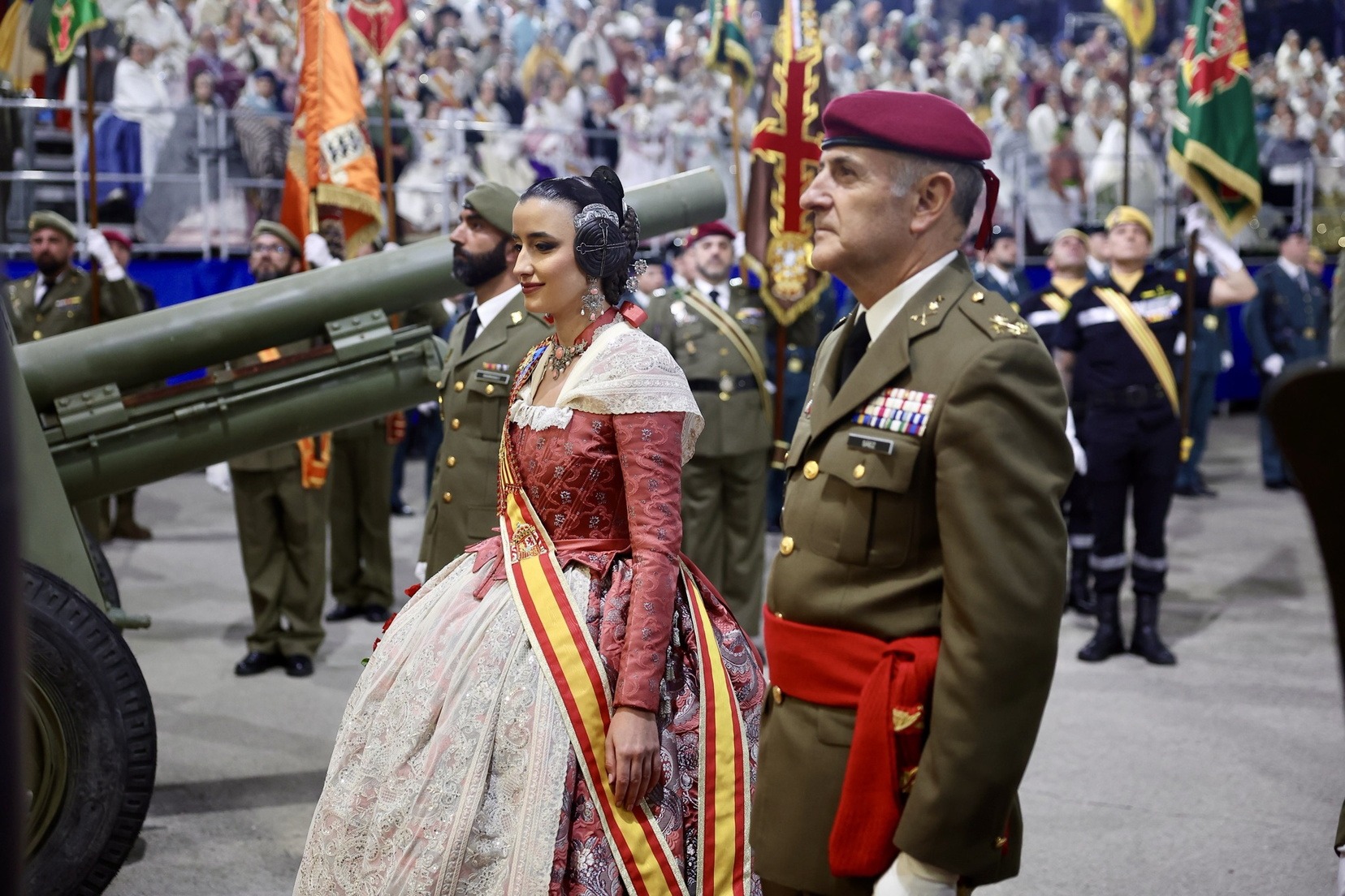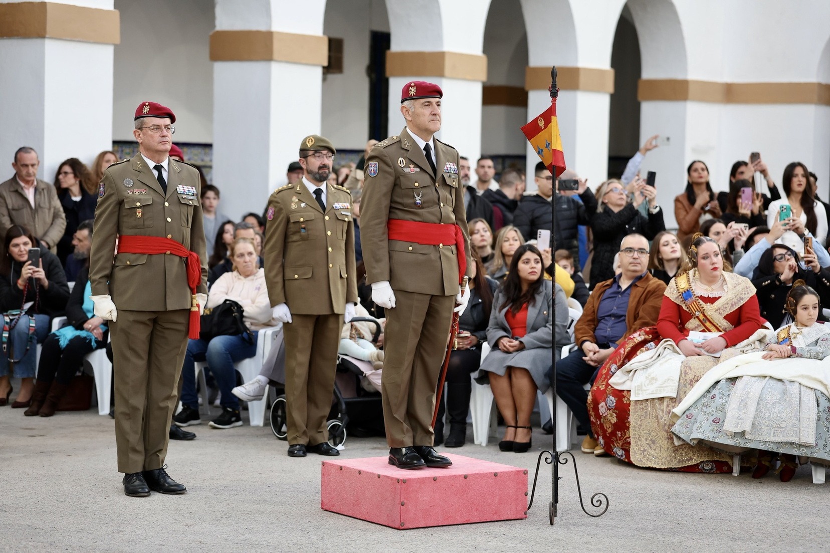 Las Falleras Mayores de Valencia, Carmen Prades y Marta Mercader, junto a sus Cortes de Honor, han llegado en carruaje, tal y como es tradicional, y tras ser recibidas por el Teniente General del Cuartel General Terrestre de Alta Disponibilidad, Luis Sáez Rocandio, han presidido junto a él este solemne homenaje que una vez más ha contado con la presencia de numerosas autoridades civiles y militares.