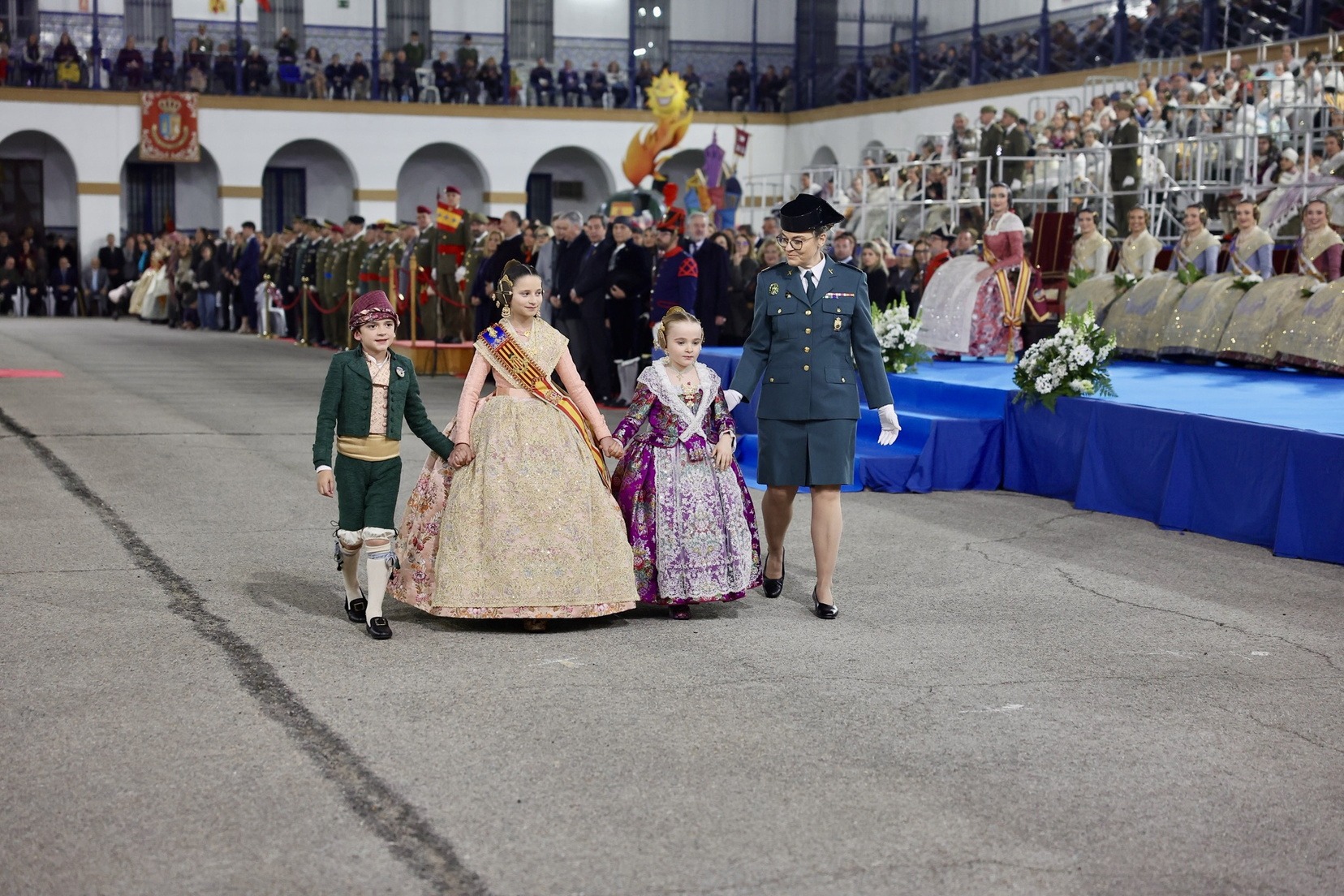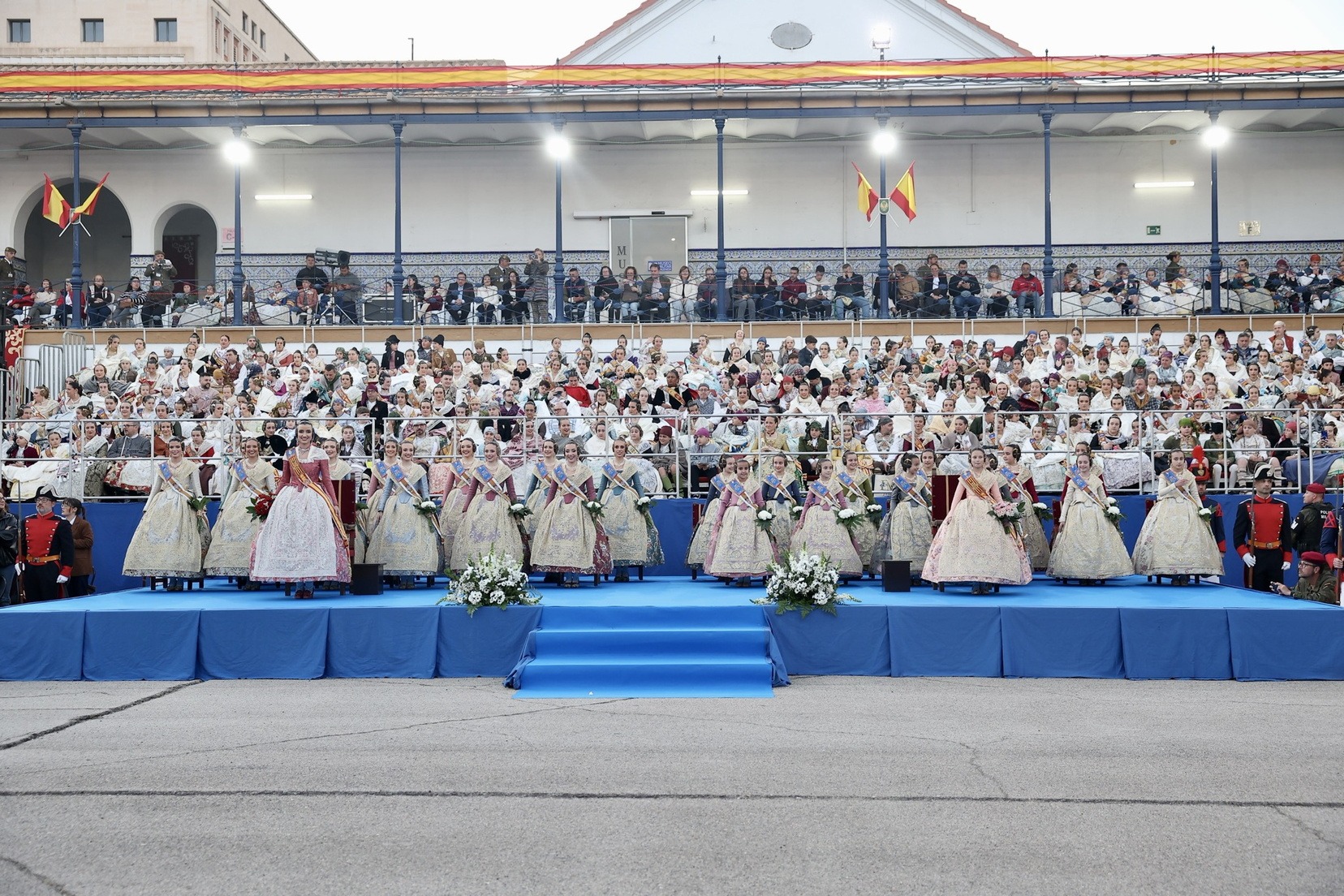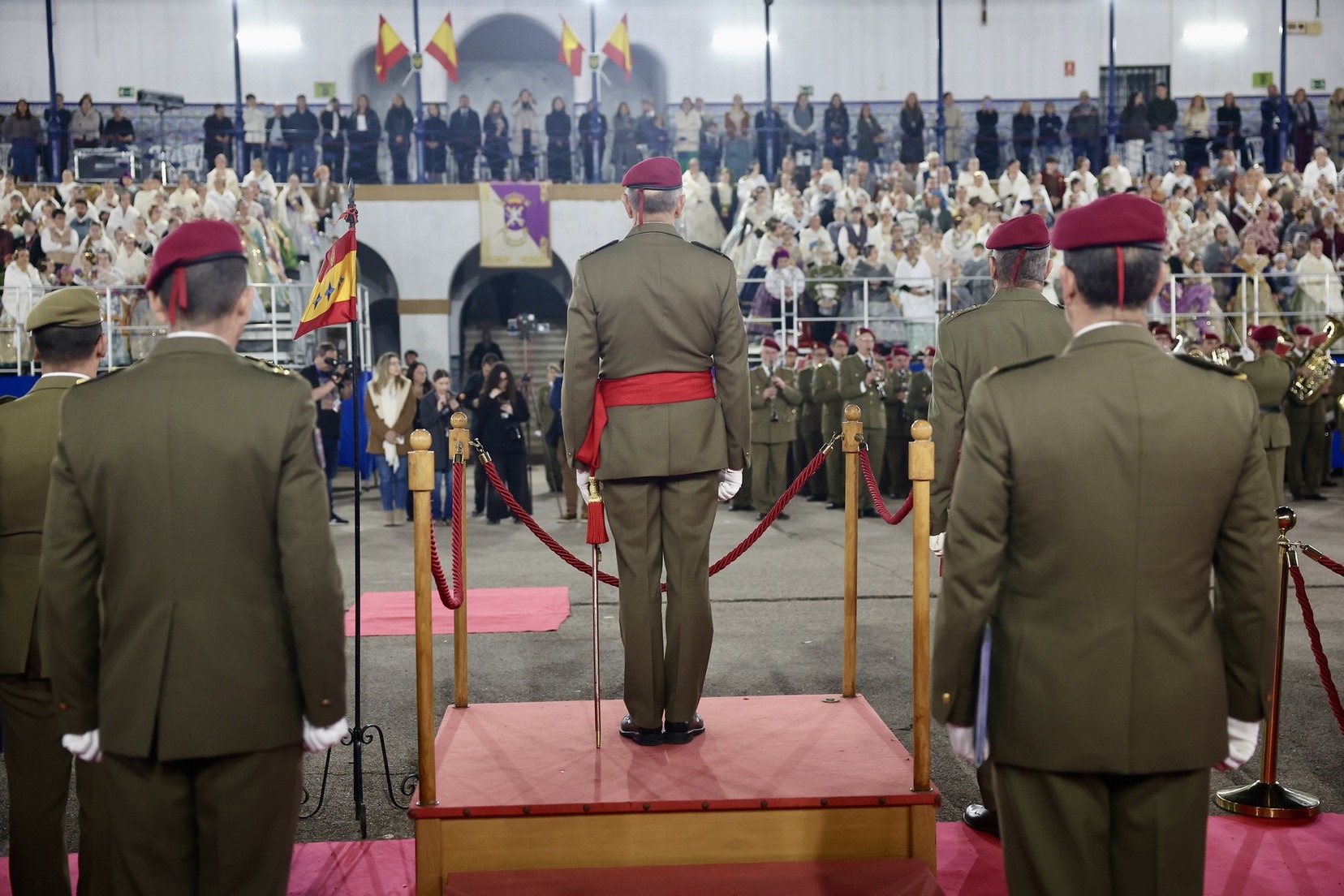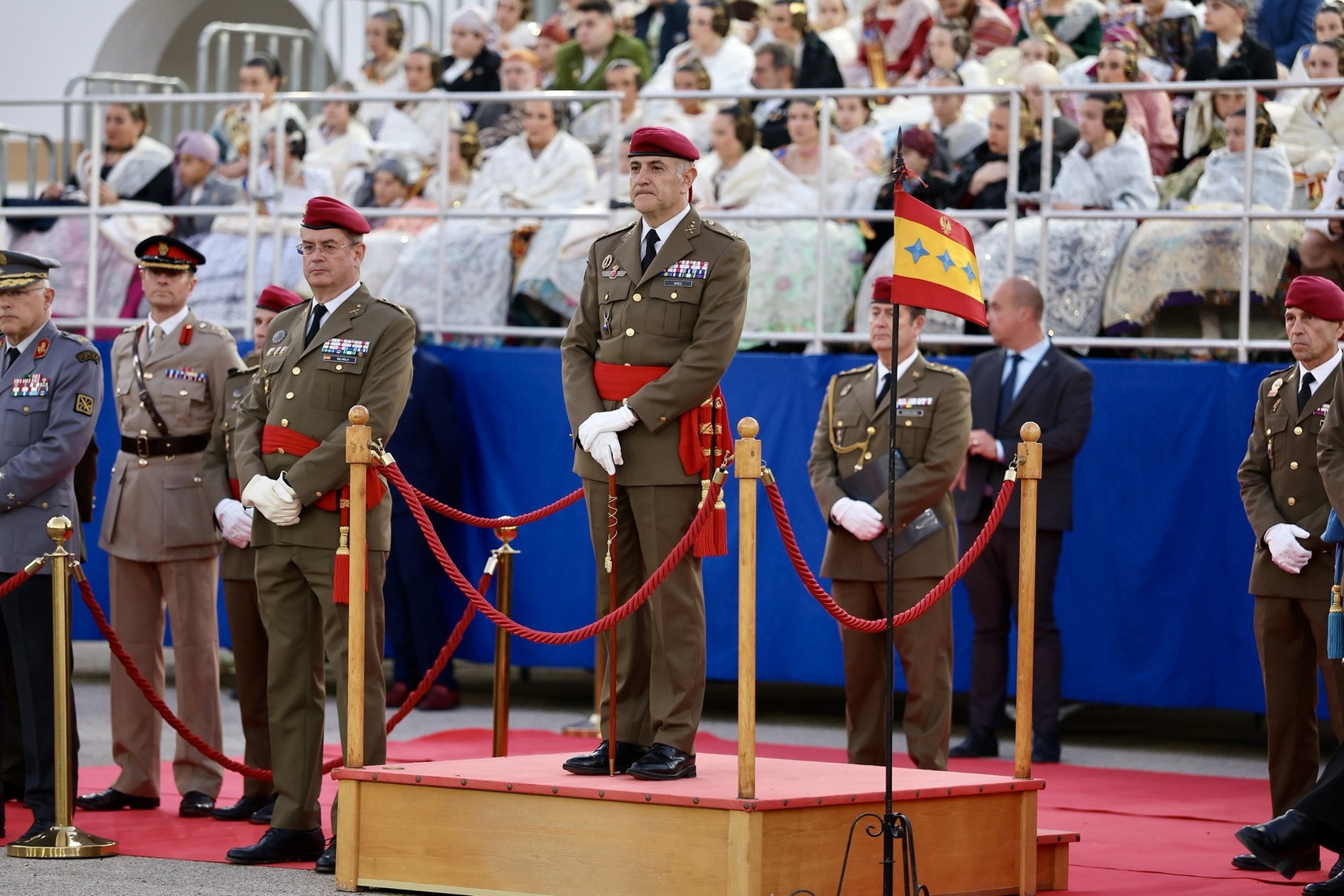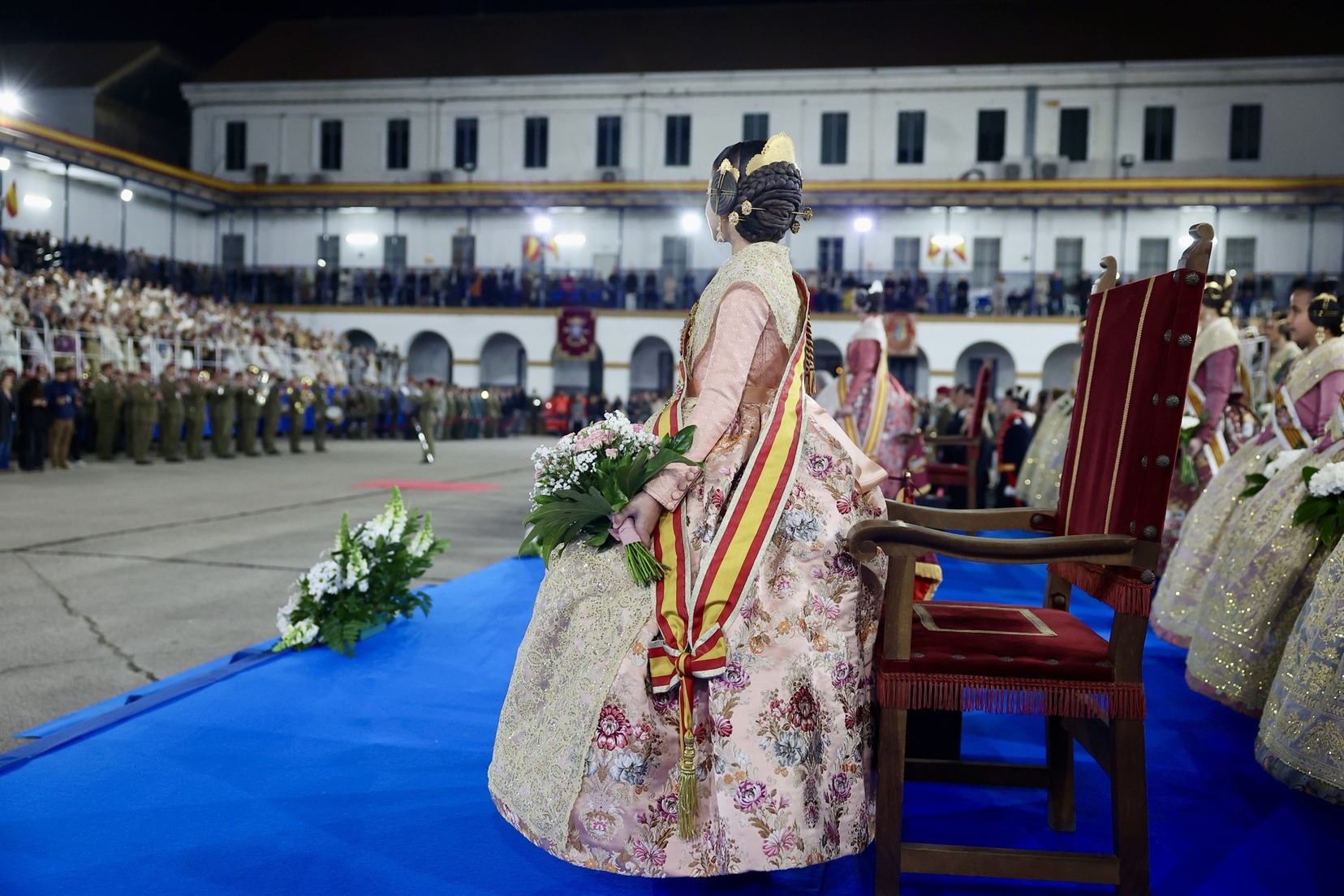 Las Falleras Mayores de Valencia, Carmen Prades y Marta Mercader, junto a sus Cortes de Honor, han llegado en carruaje, tal y como es tradicional, y tras ser recibidas por el Teniente General del Cuartel General Terrestre de Alta Disponibilidad, Luis Sáez Rocandio, han presidido junto a él este solemne homenaje que una vez más ha contado con la presencia de numerosas autoridades civiles y militares.