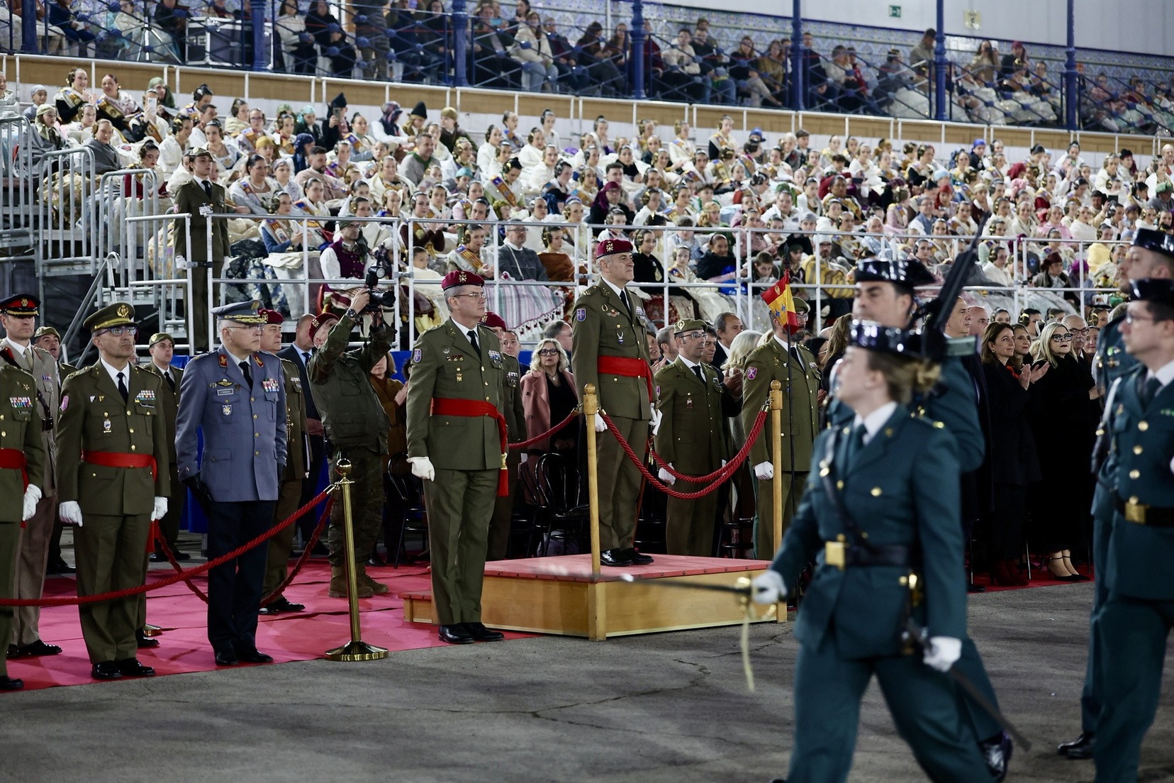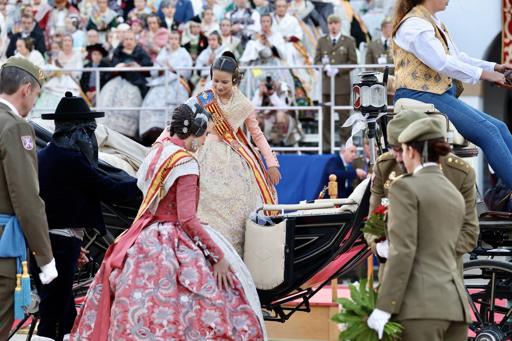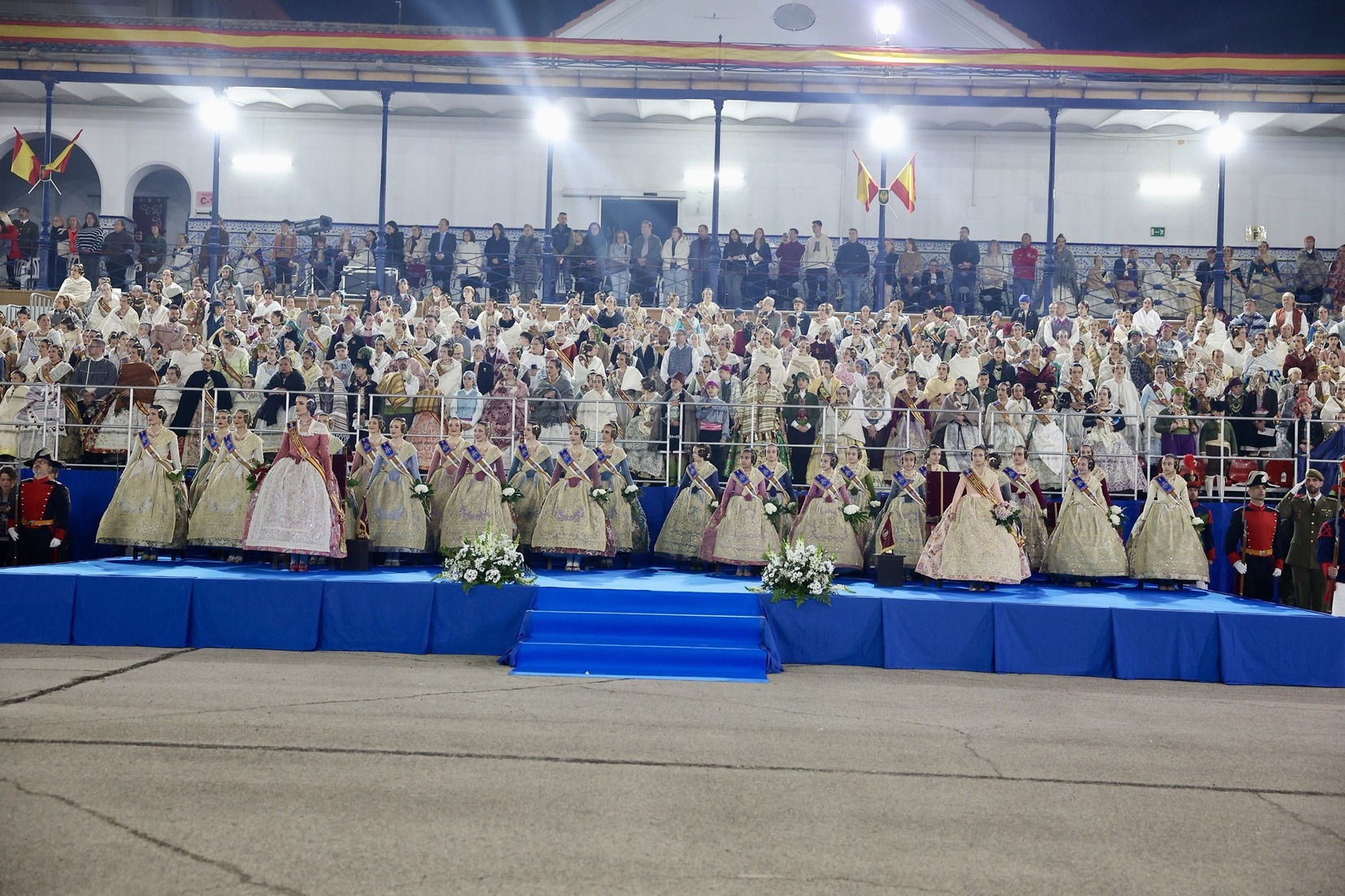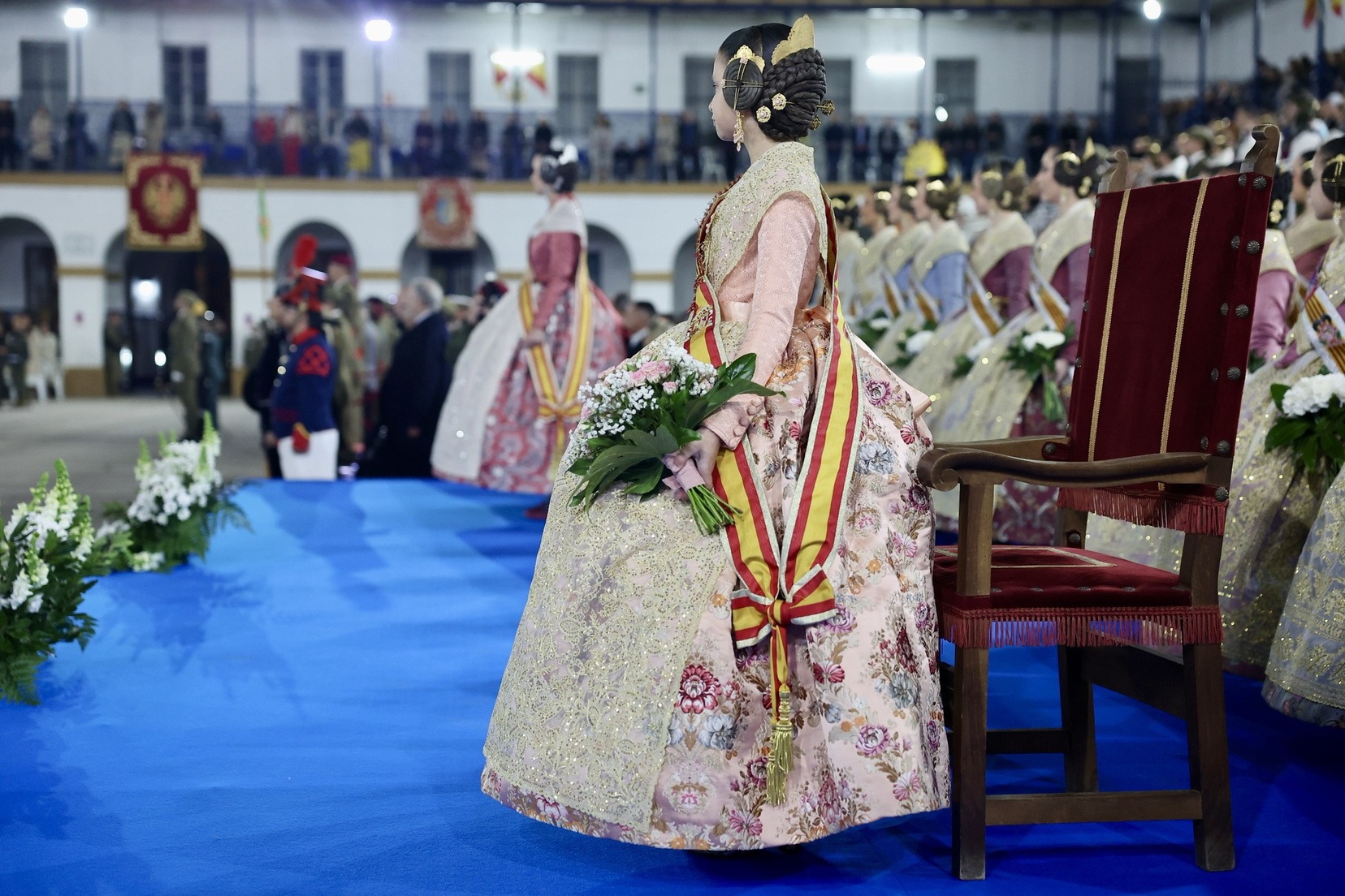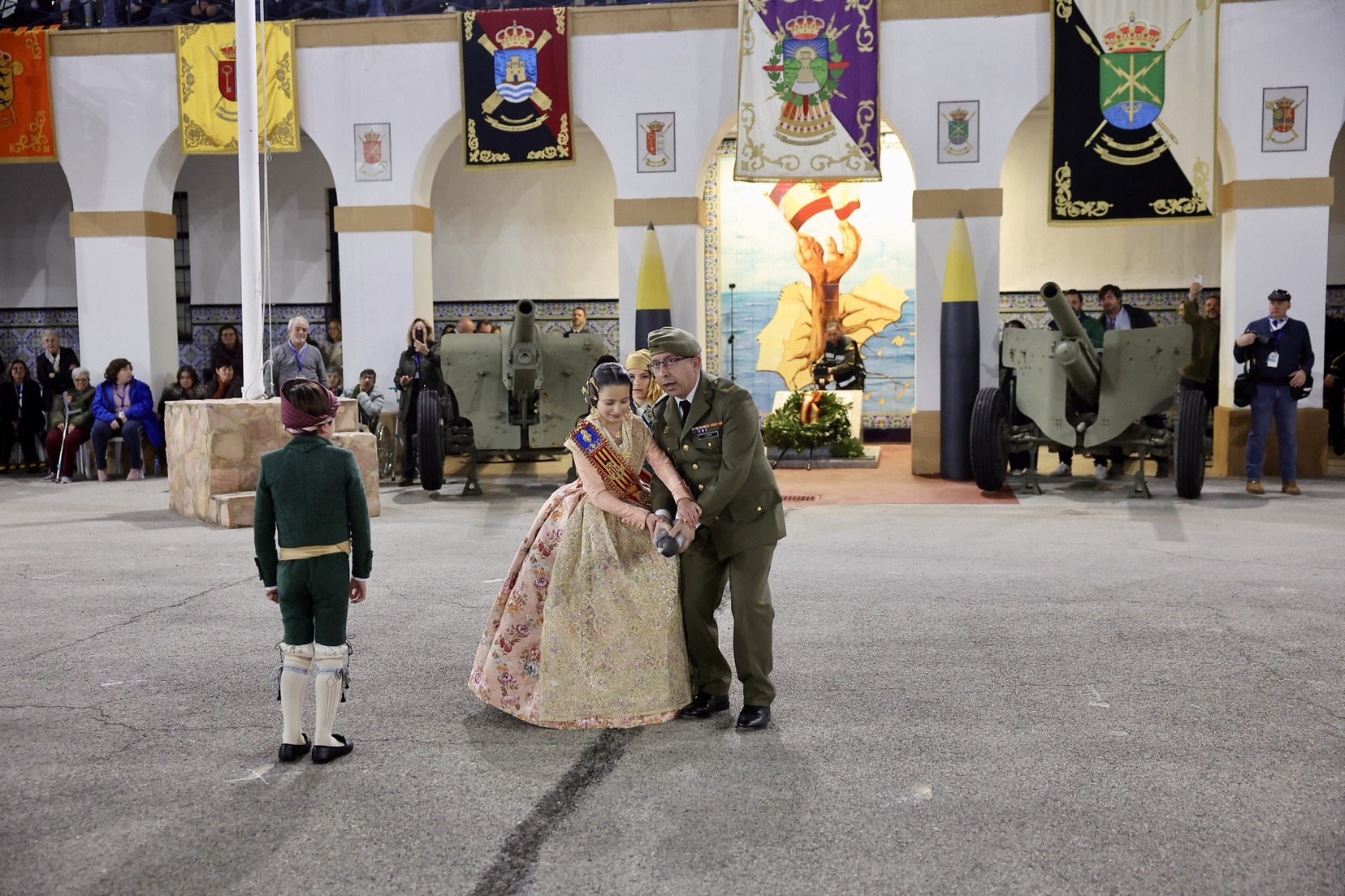 Las Falleras Mayores de Valencia, Carmen Prades y Marta Mercader, junto a sus Cortes de Honor, han llegado en carruaje, tal y como es tradicional, y tras ser recibidas por el Teniente General del Cuartel General Terrestre de Alta Disponibilidad, Luis Sáez Rocandio, han presidido junto a él este solemne homenaje que una vez más ha contado con la presencia de numerosas autoridades civiles y militares.