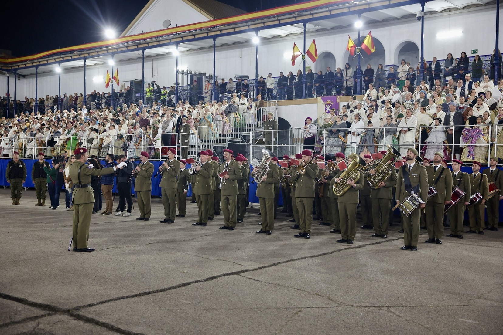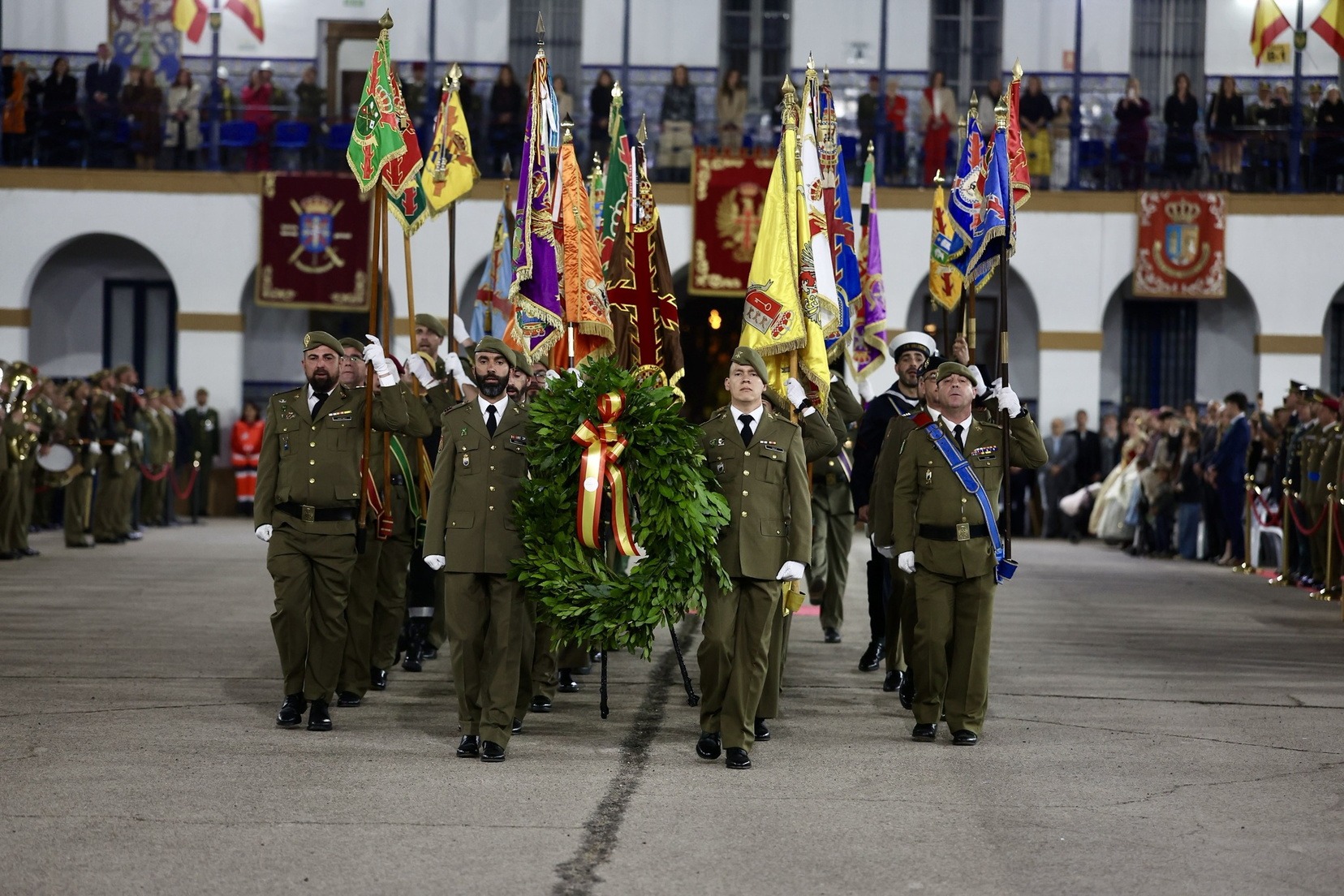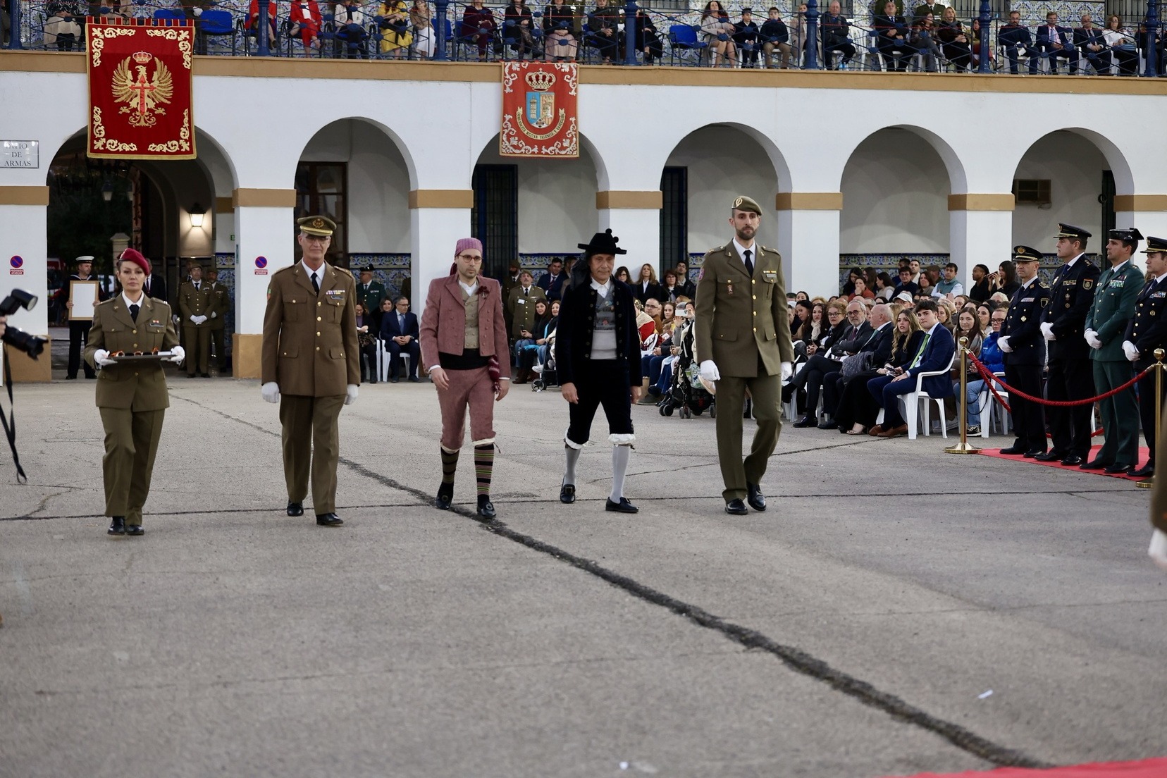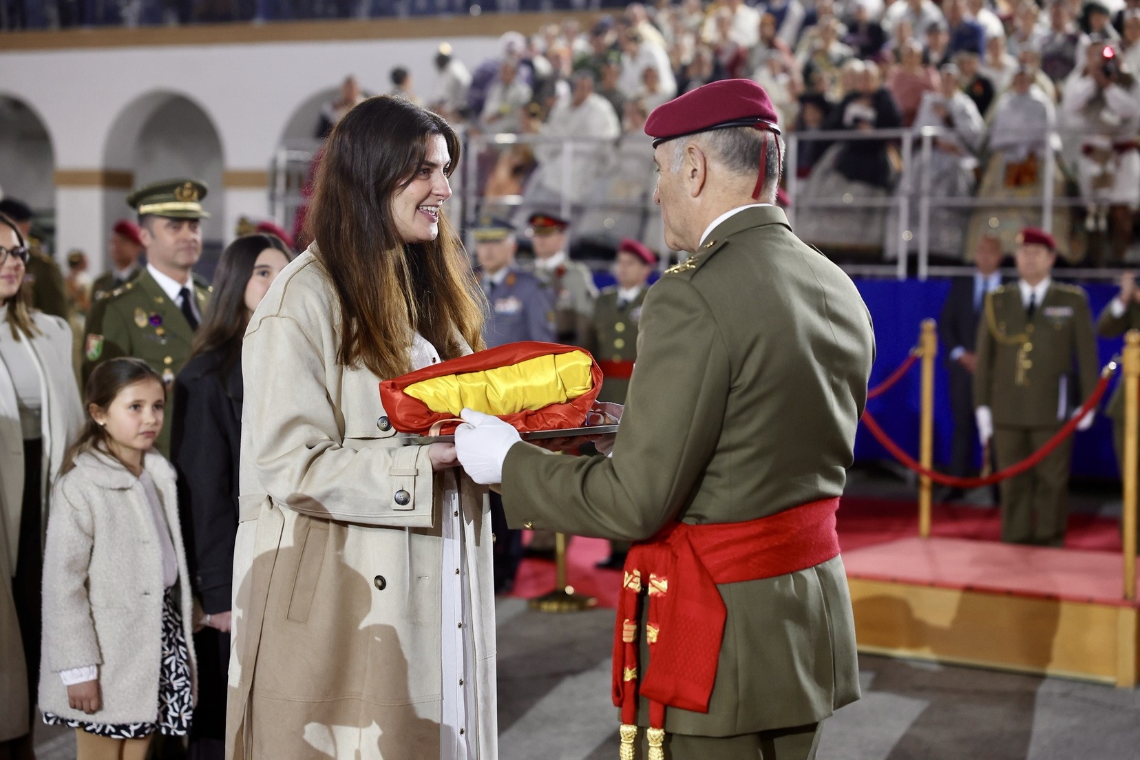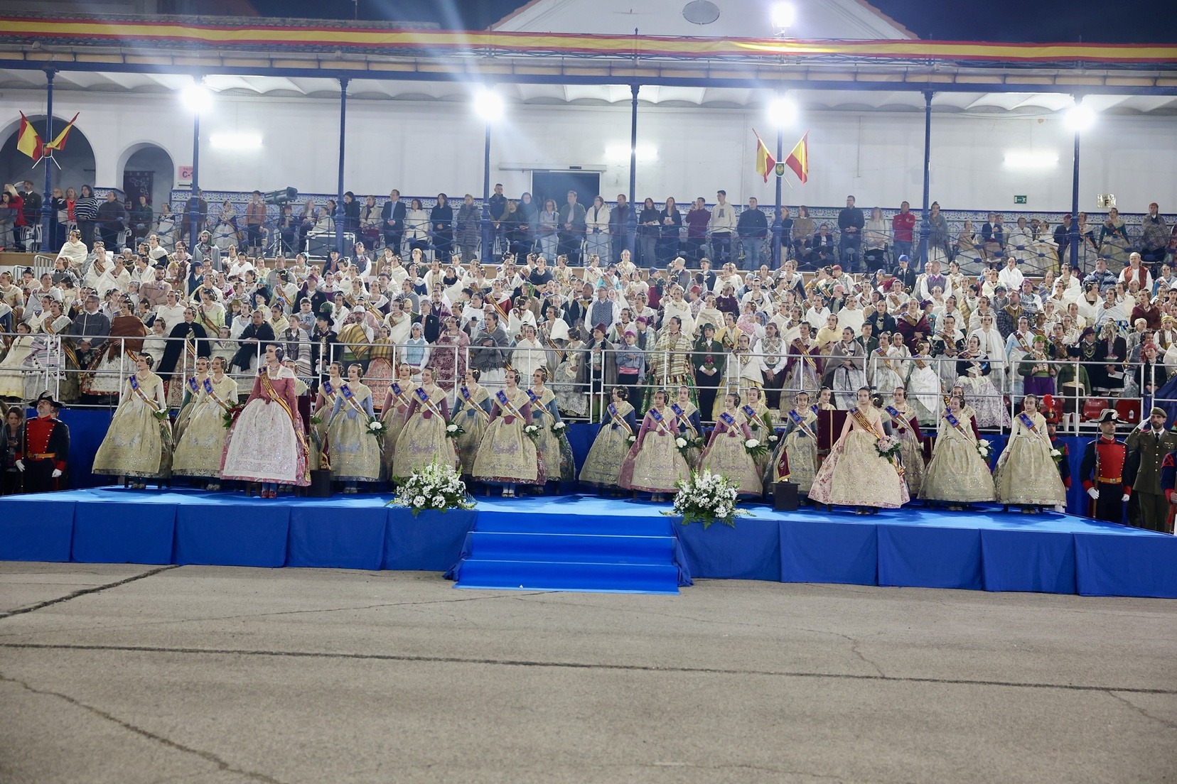 Las Falleras Mayores de Valencia, Carmen Prades y Marta Mercader, junto a sus Cortes de Honor, han llegado en carruaje, tal y como es tradicional, y tras ser recibidas por el Teniente General del Cuartel General Terrestre de Alta Disponibilidad, Luis Sáez Rocandio, han presidido junto a él este solemne homenaje que una vez más ha contado con la presencia de numerosas autoridades civiles y militares.
