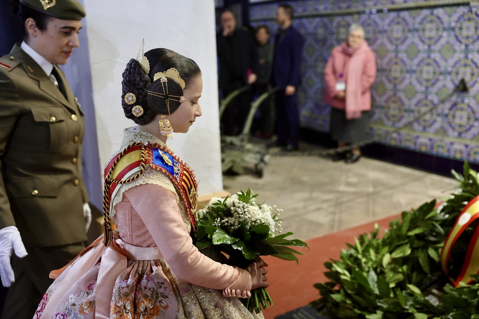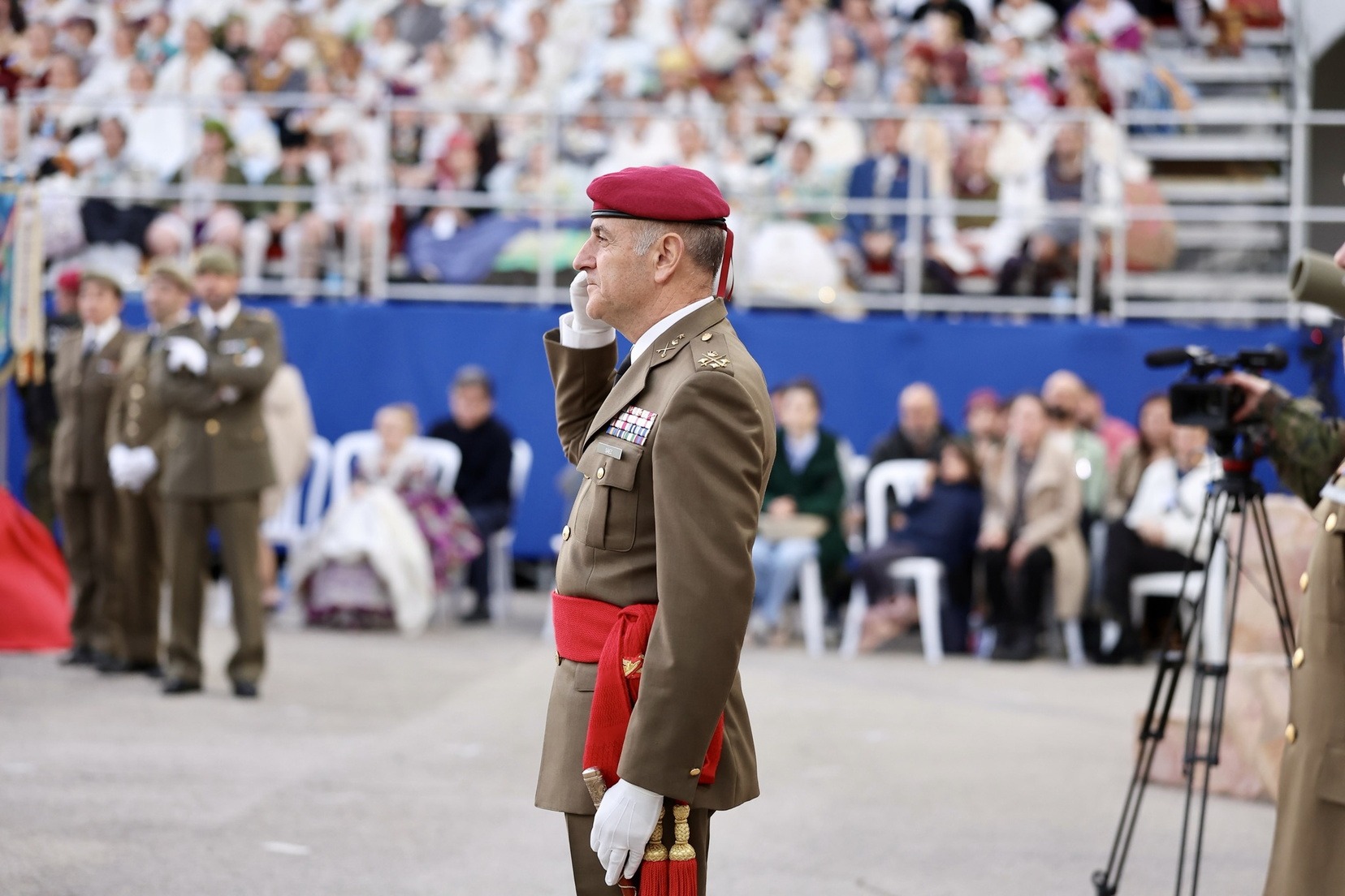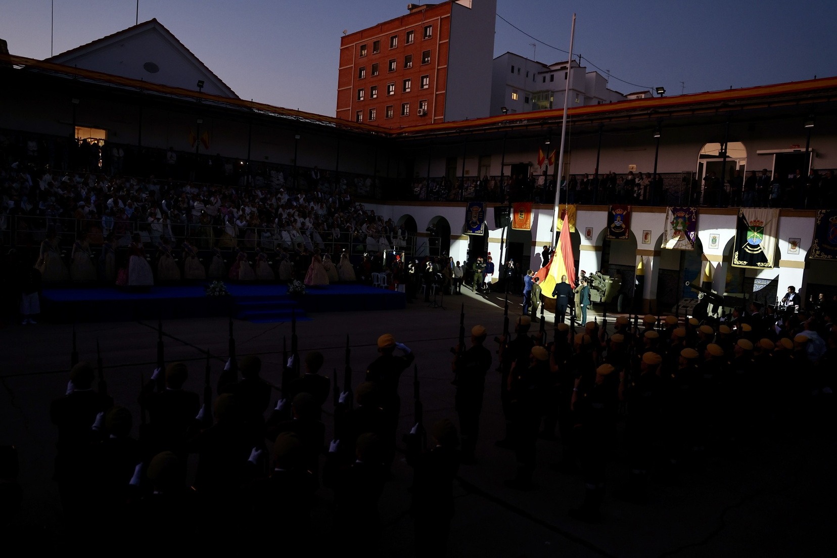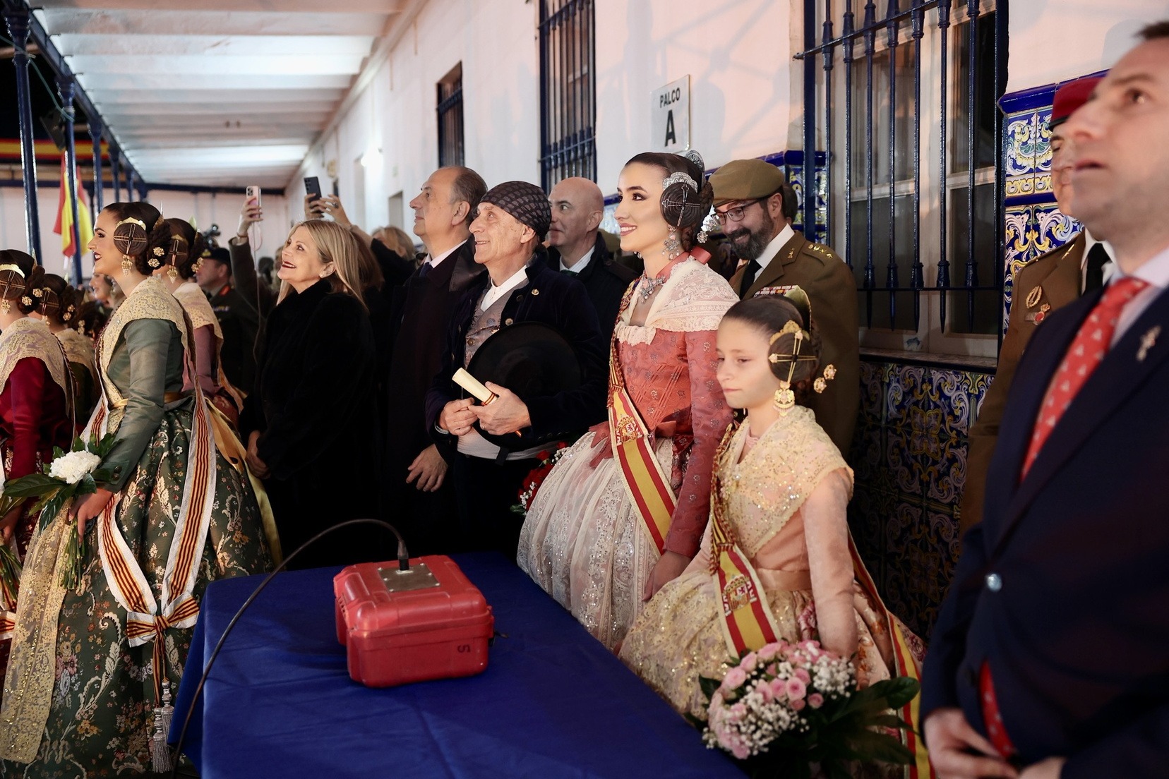 Las Falleras Mayores de Valencia, Carmen Prades y Marta Mercader, junto a sus Cortes de Honor, han llegado en carruaje, tal y como es tradicional, y tras ser recibidas por el Teniente General del Cuartel General Terrestre de Alta Disponibilidad, Luis Sáez Rocandio, han presidido junto a él este solemne homenaje que una vez más ha contado con la presencia de numerosas autoridades civiles y militares.
