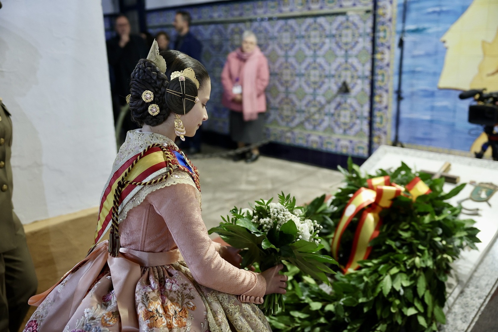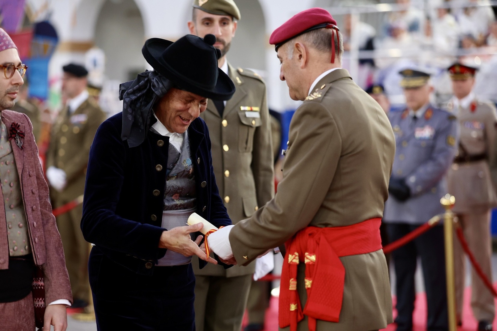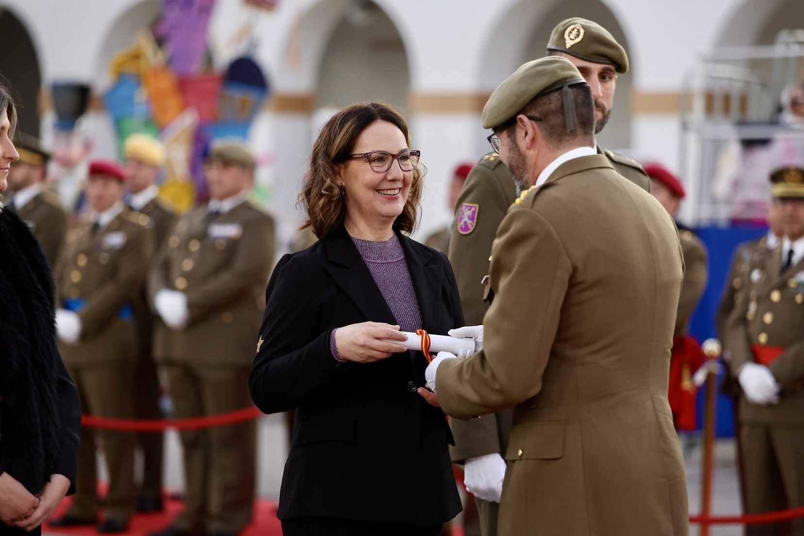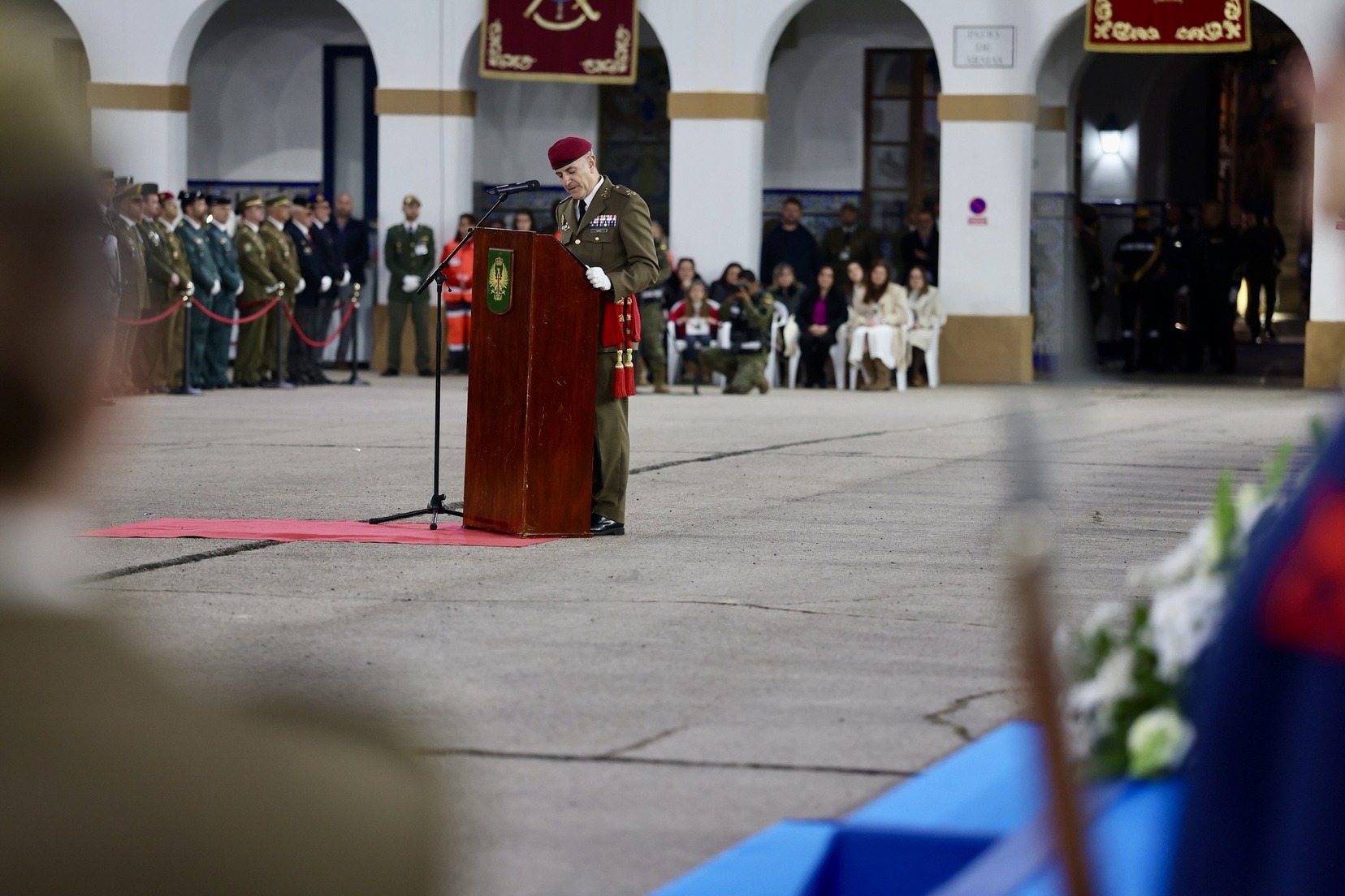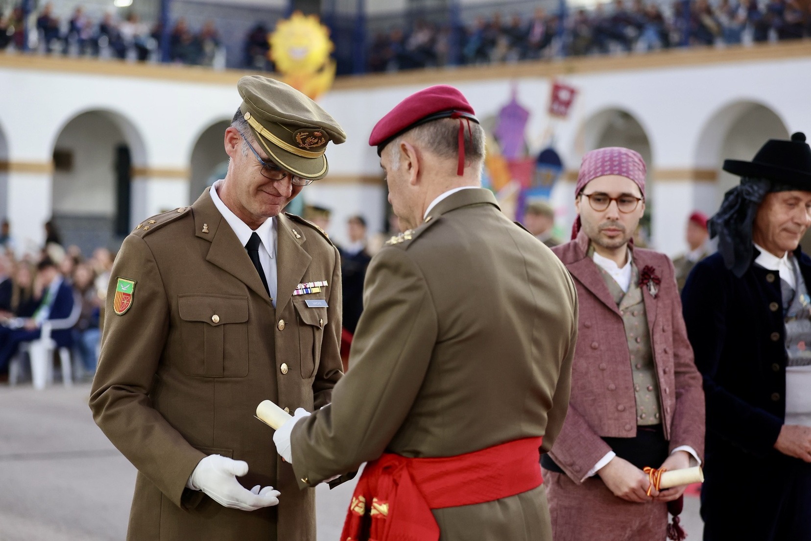 Las Falleras Mayores de Valencia, Carmen Prades y Marta Mercader, junto a sus Cortes de Honor, han llegado en carruaje, tal y como es tradicional, y tras ser recibidas por el Teniente General del Cuartel General Terrestre de Alta Disponibilidad, Luis Sáez Rocandio, han presidido junto a él este solemne homenaje que una vez más ha contado con la presencia de numerosas autoridades civiles y militares.