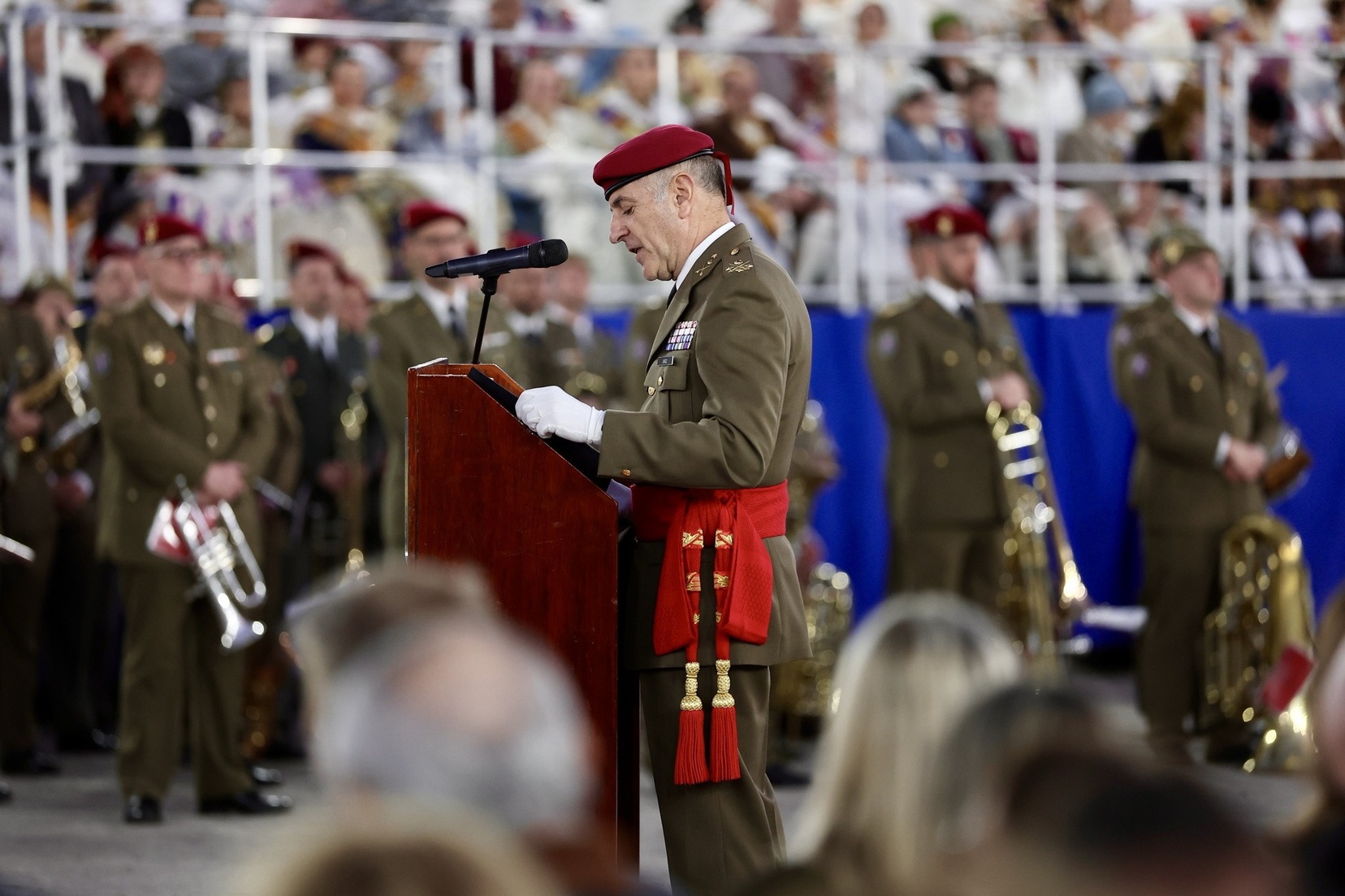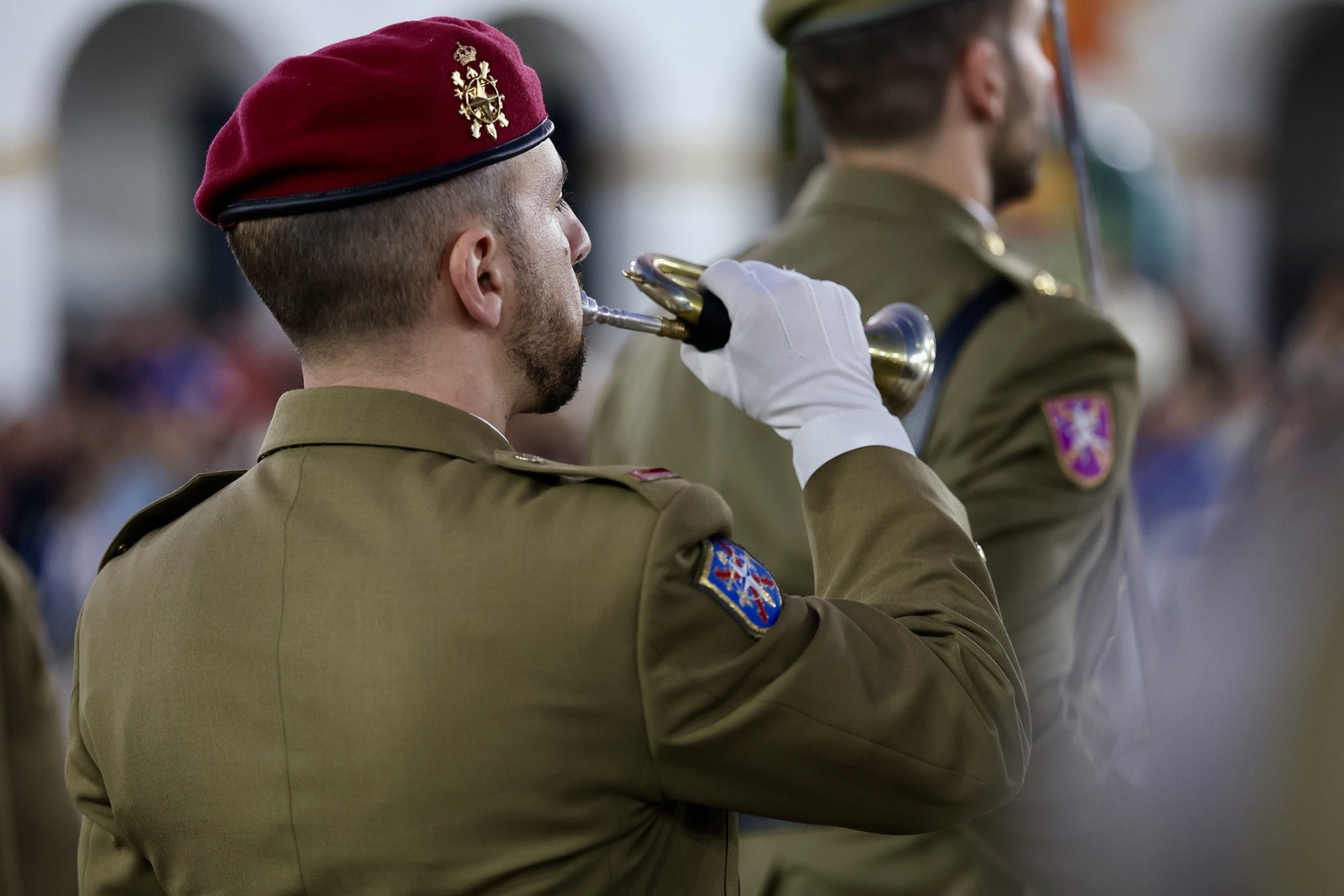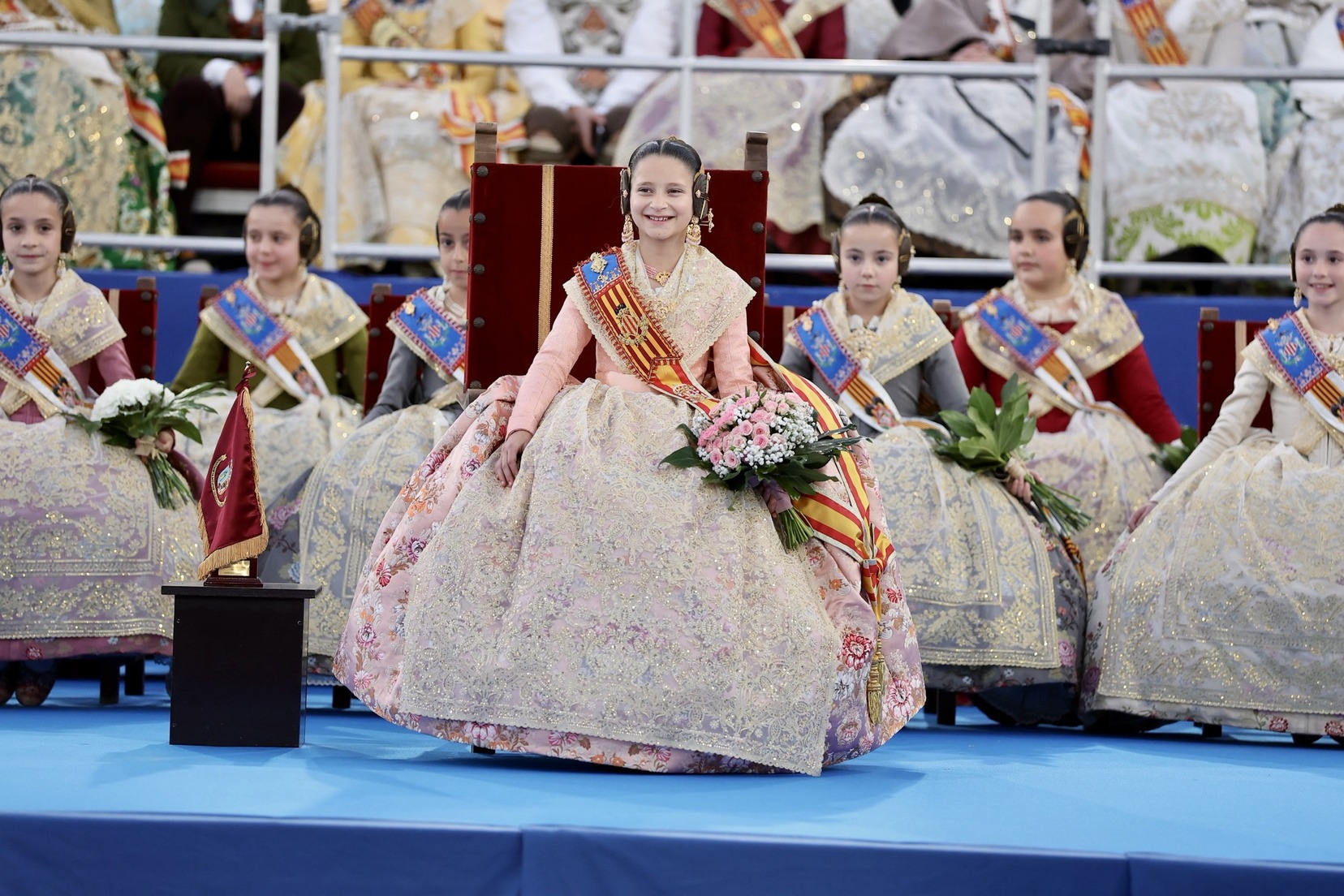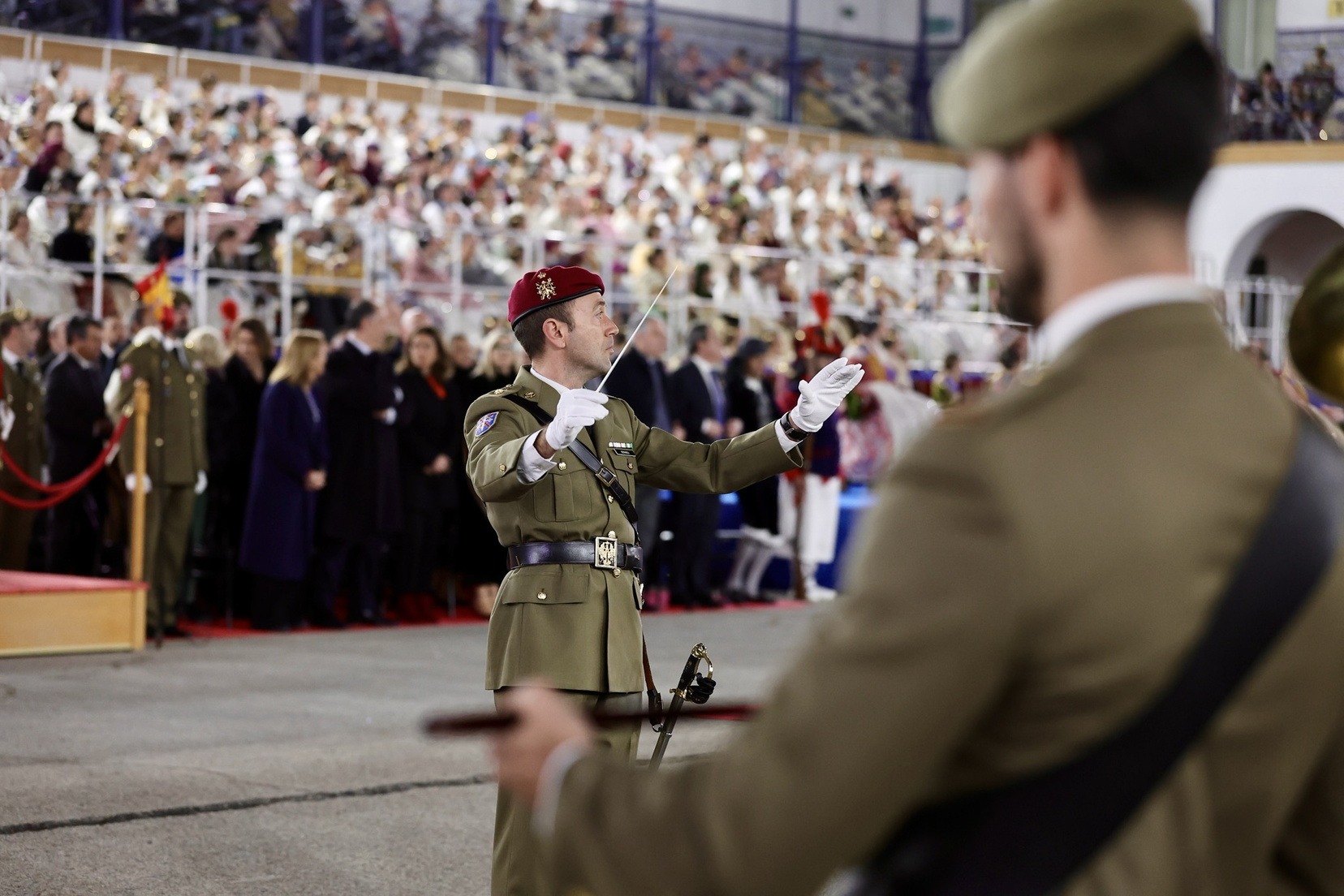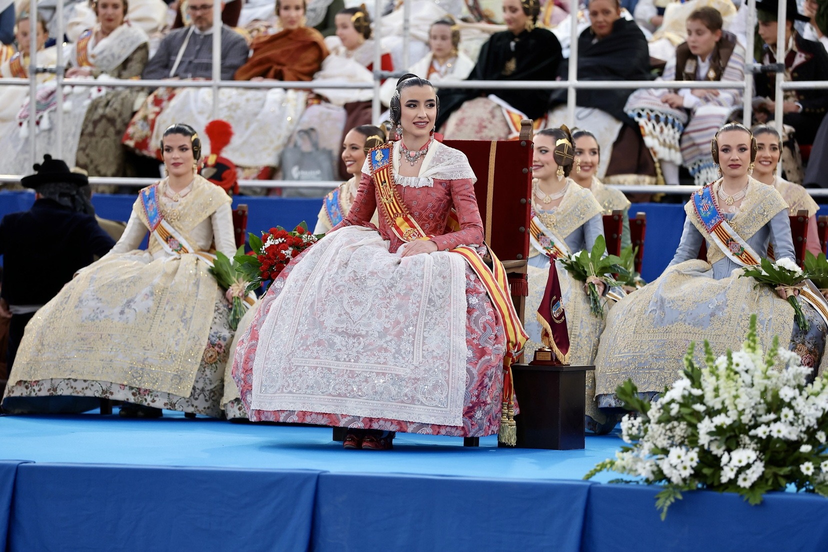 Las Falleras Mayores de Valencia, Carmen Prades y Marta Mercader, junto a sus Cortes de Honor, han llegado en carruaje, tal y como es tradicional, y tras ser recibidas por el Teniente General del Cuartel General Terrestre de Alta Disponibilidad, Luis Sáez Rocandio, han presidido junto a él este solemne homenaje que una vez más ha contado con la presencia de numerosas autoridades civiles y militares.
