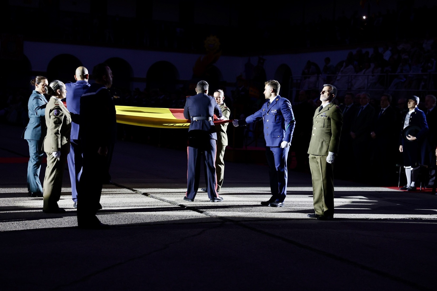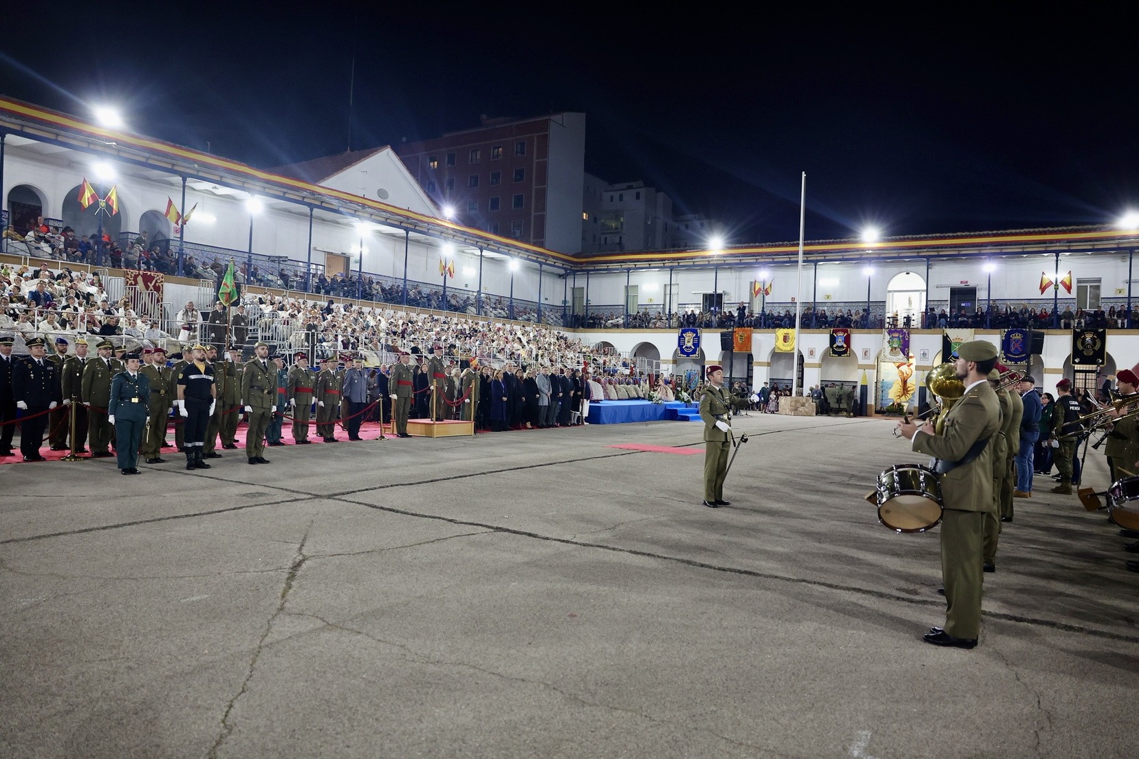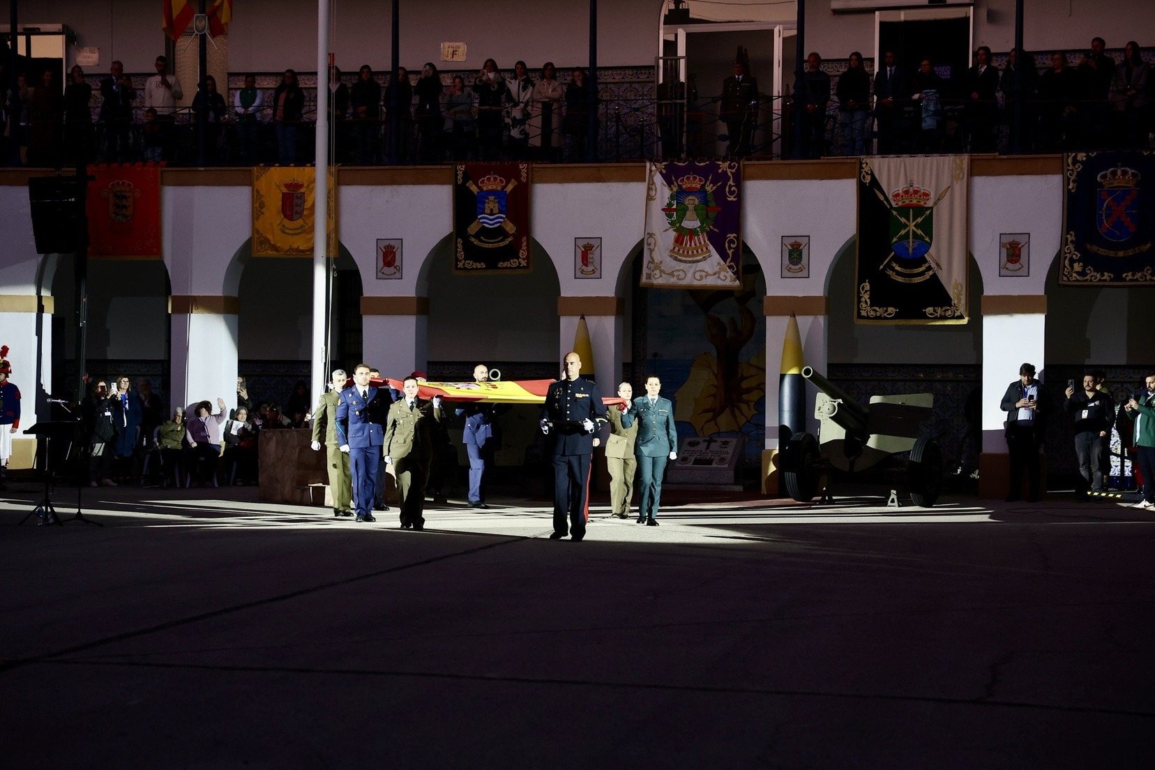 Tras el desfile de la unidad militar en el que han participado diferentes compañías y regimientos, y la entrega de los distintos galardones, se ha vivido uno de los momentos más especiales, la arriada de la bandera de España que ha presidido todo el acto.