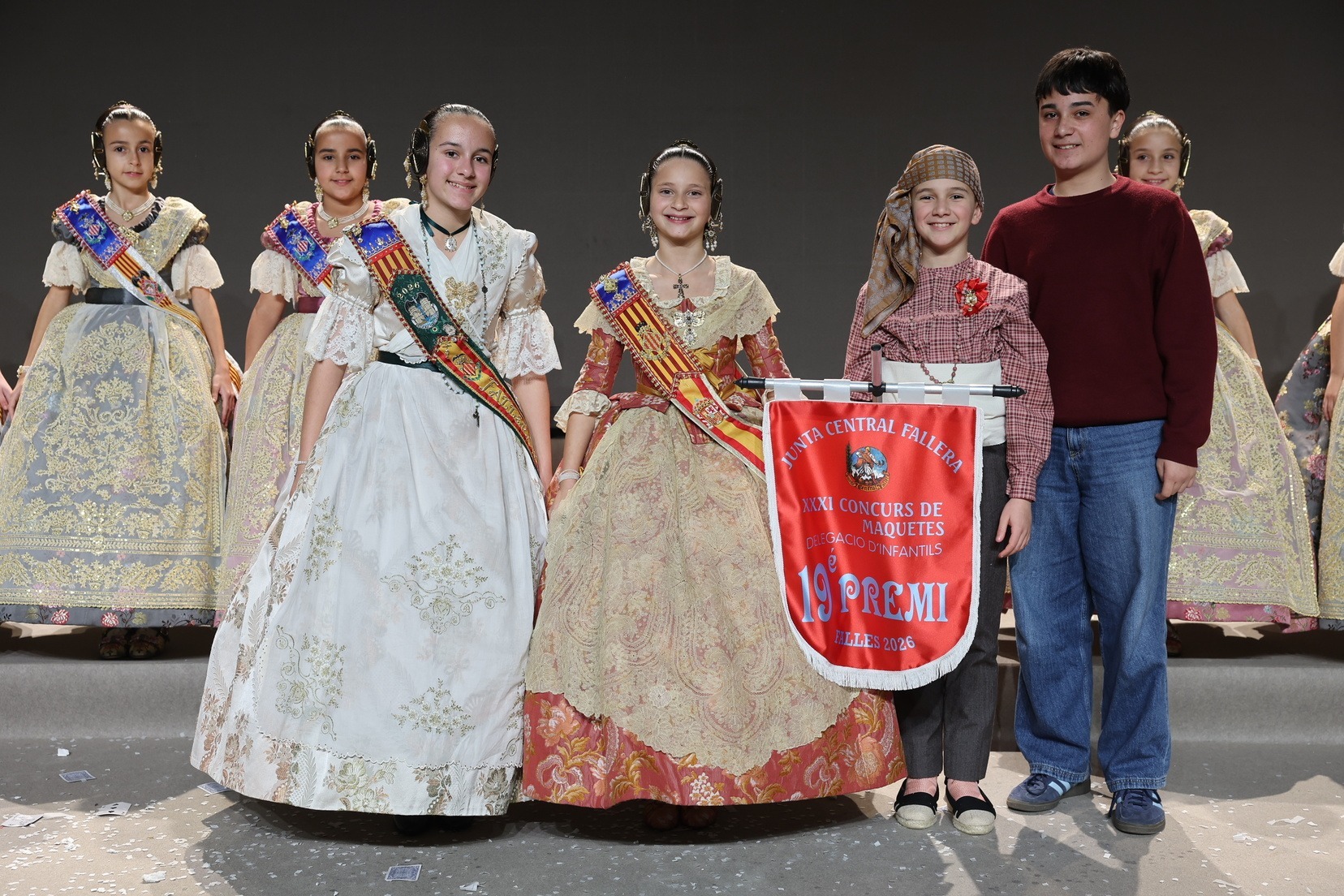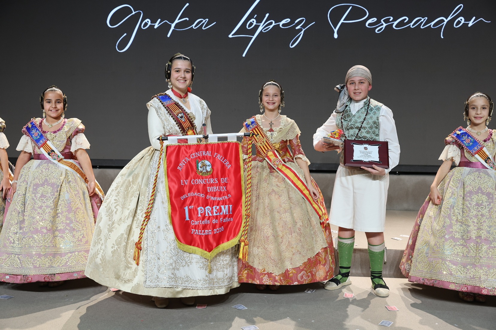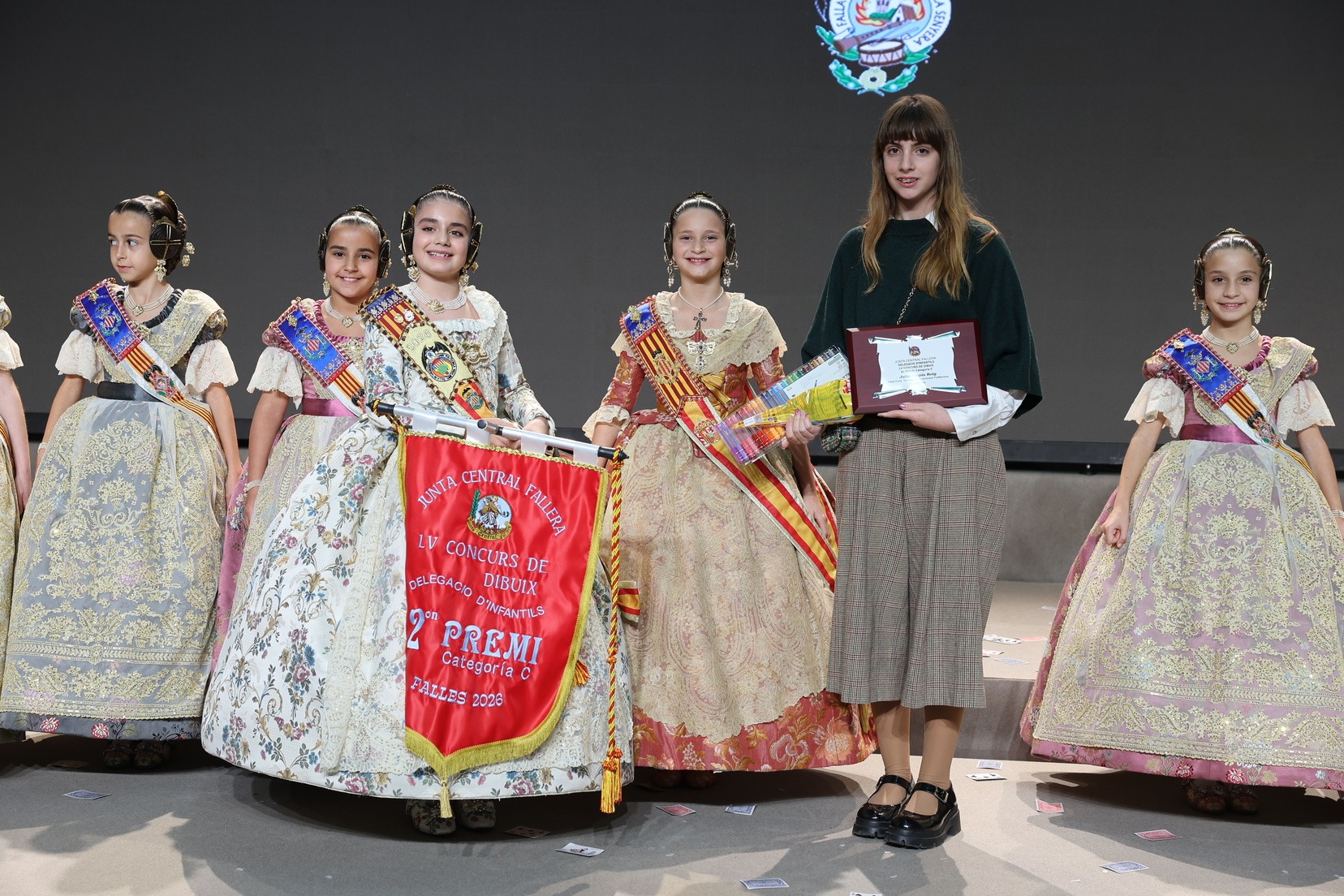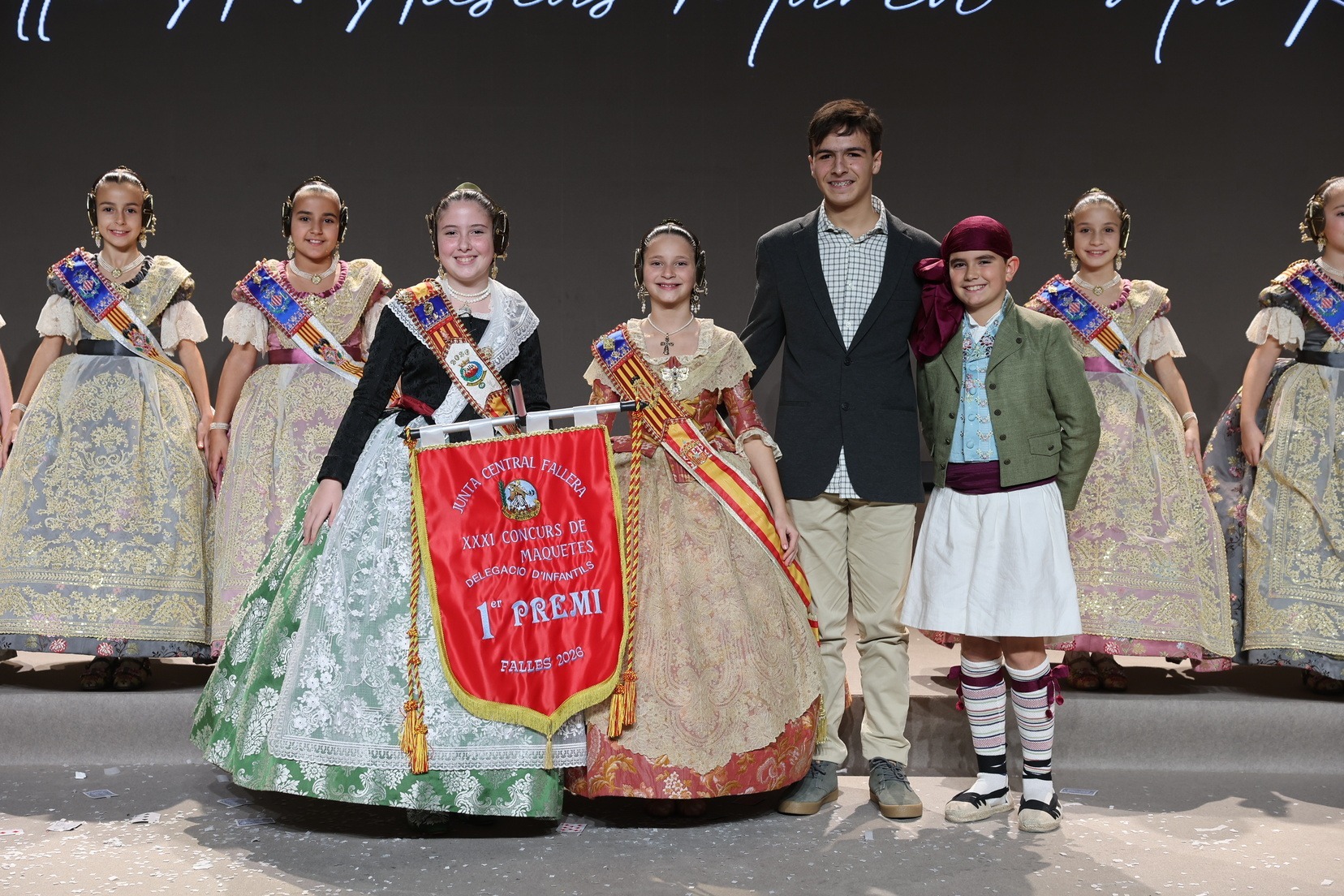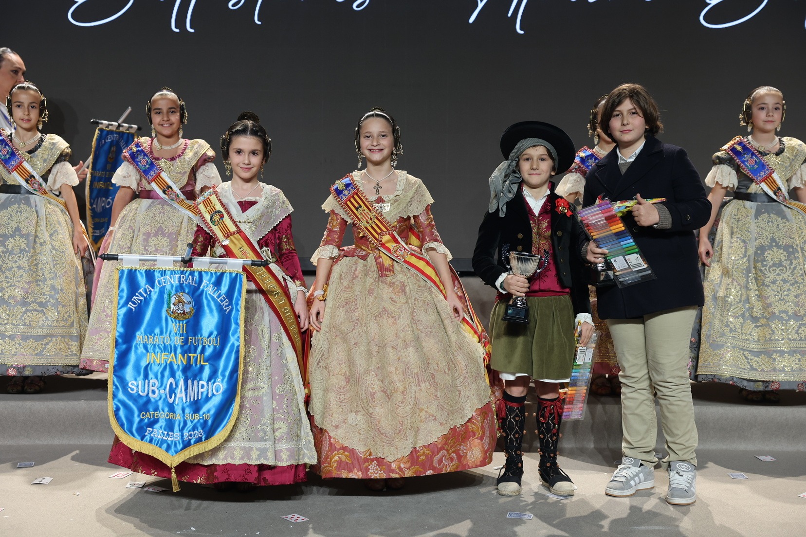 Durante el acto se han entregado los galardones de los concursos infantiles y juveniles organizados por Junta Central Fallera, entre ellos los correspondientes a los concursos de dibujo, maquetas, futbolín y postales. La gala ha servido para reunir sobre el escenario a los representantes de las comisiones distinguidas, reconociendo públicamente su esfuerzo, creatividad y participación.