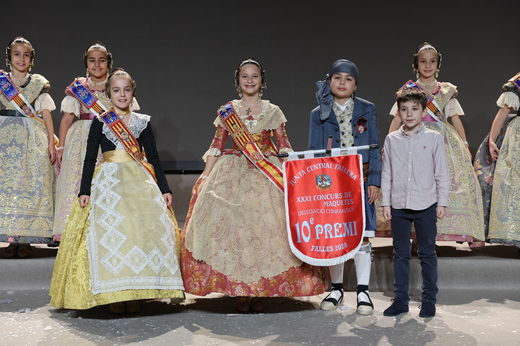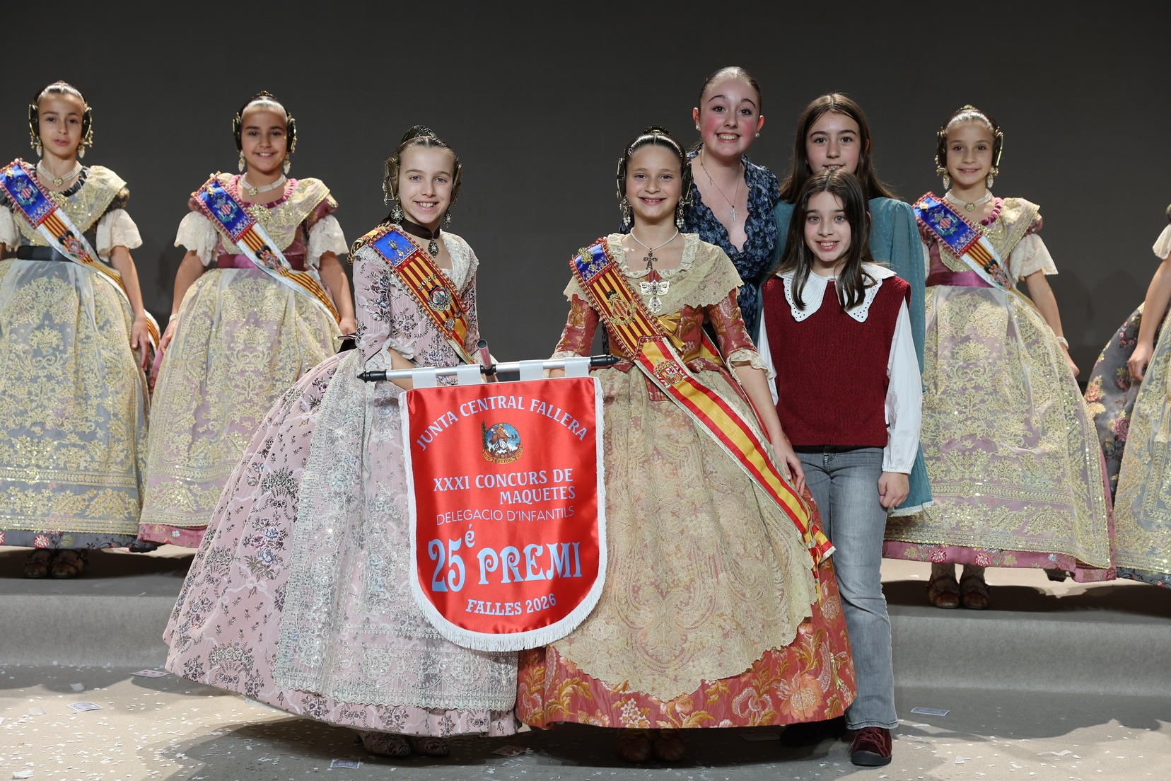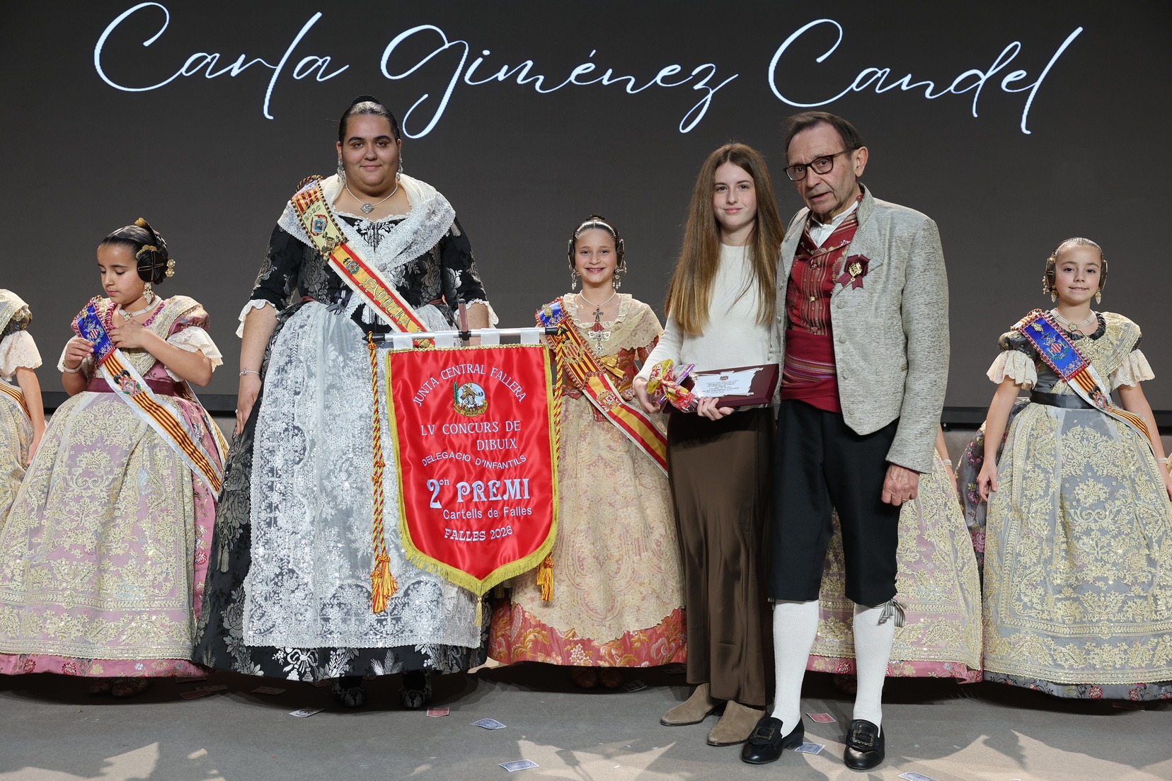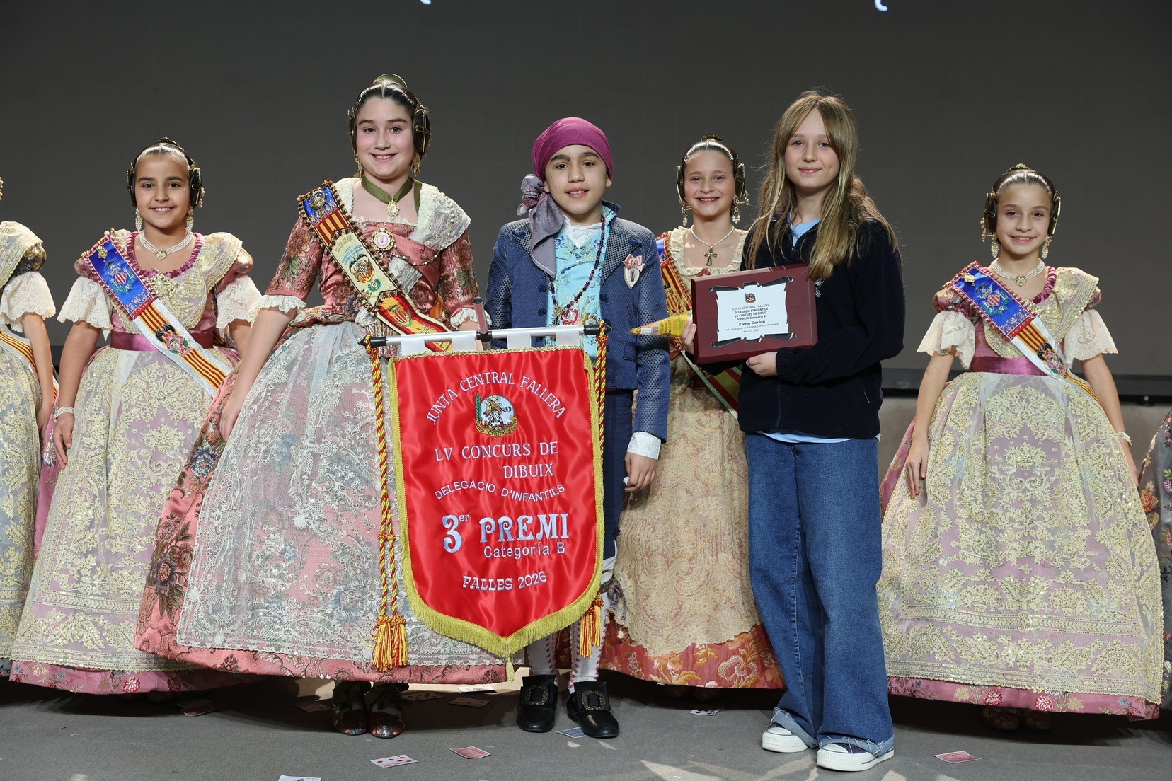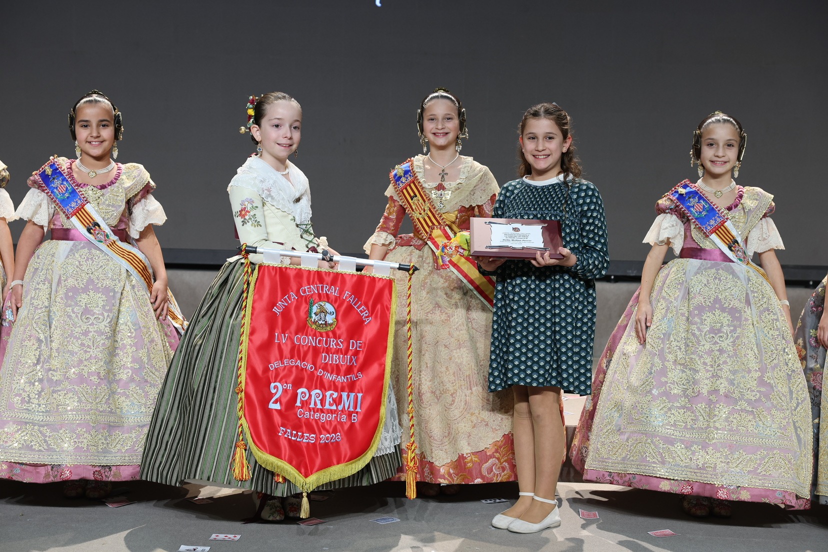 Durante el acto se han entregado los galardones de los concursos infantiles y juveniles organizados por Junta Central Fallera, entre ellos los correspondientes a los concursos de dibujo, maquetas, futbolín y postales. La gala ha servido para reunir sobre el escenario a los representantes de las comisiones distinguidas, reconociendo públicamente su esfuerzo, creatividad y participación.