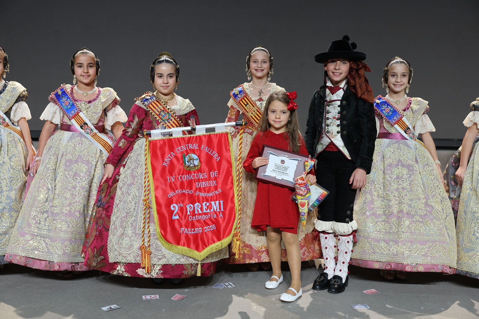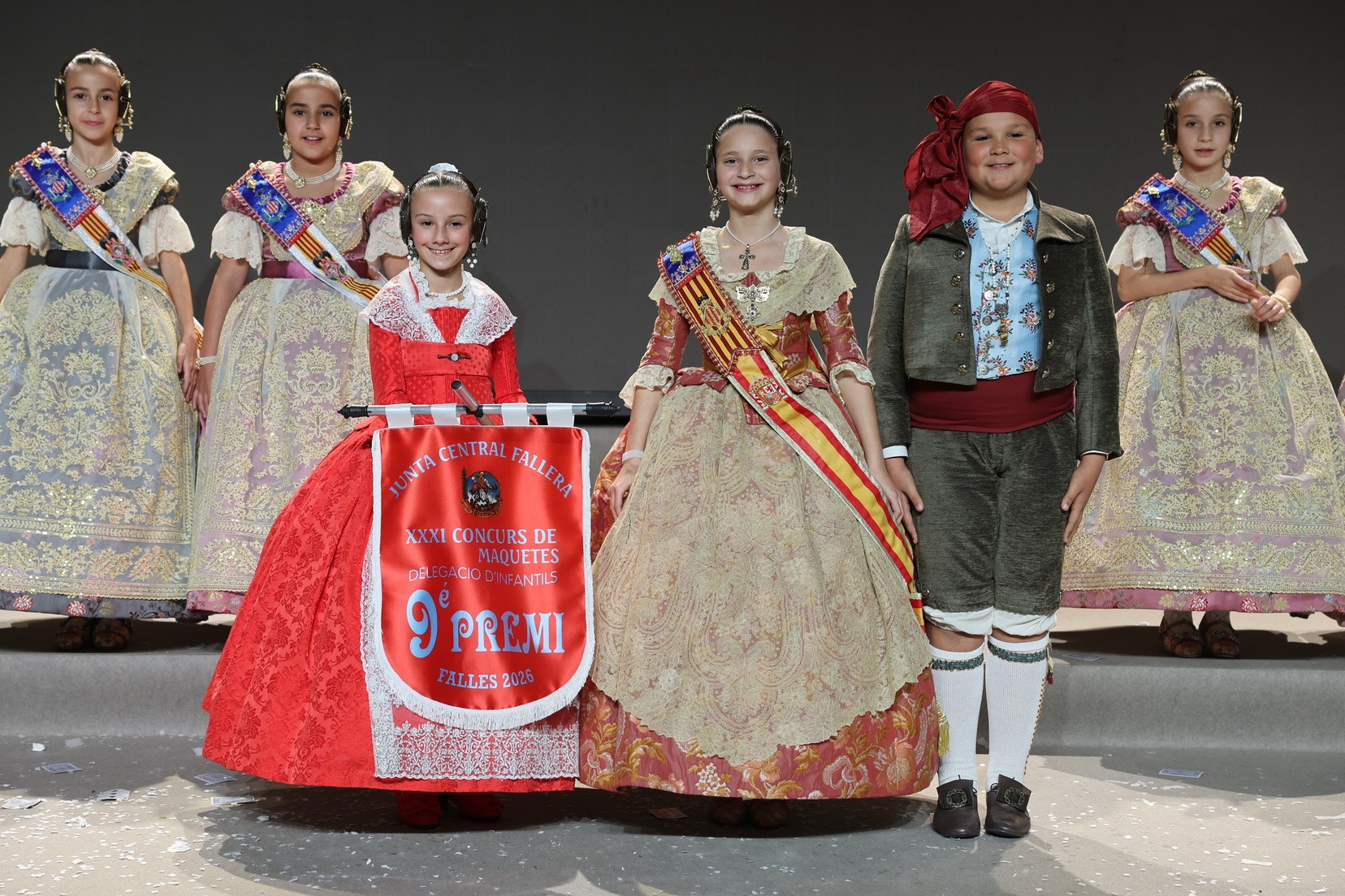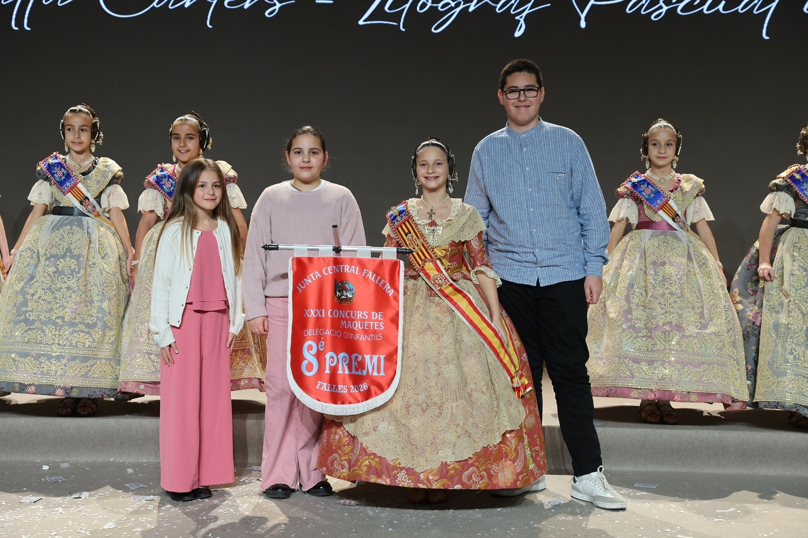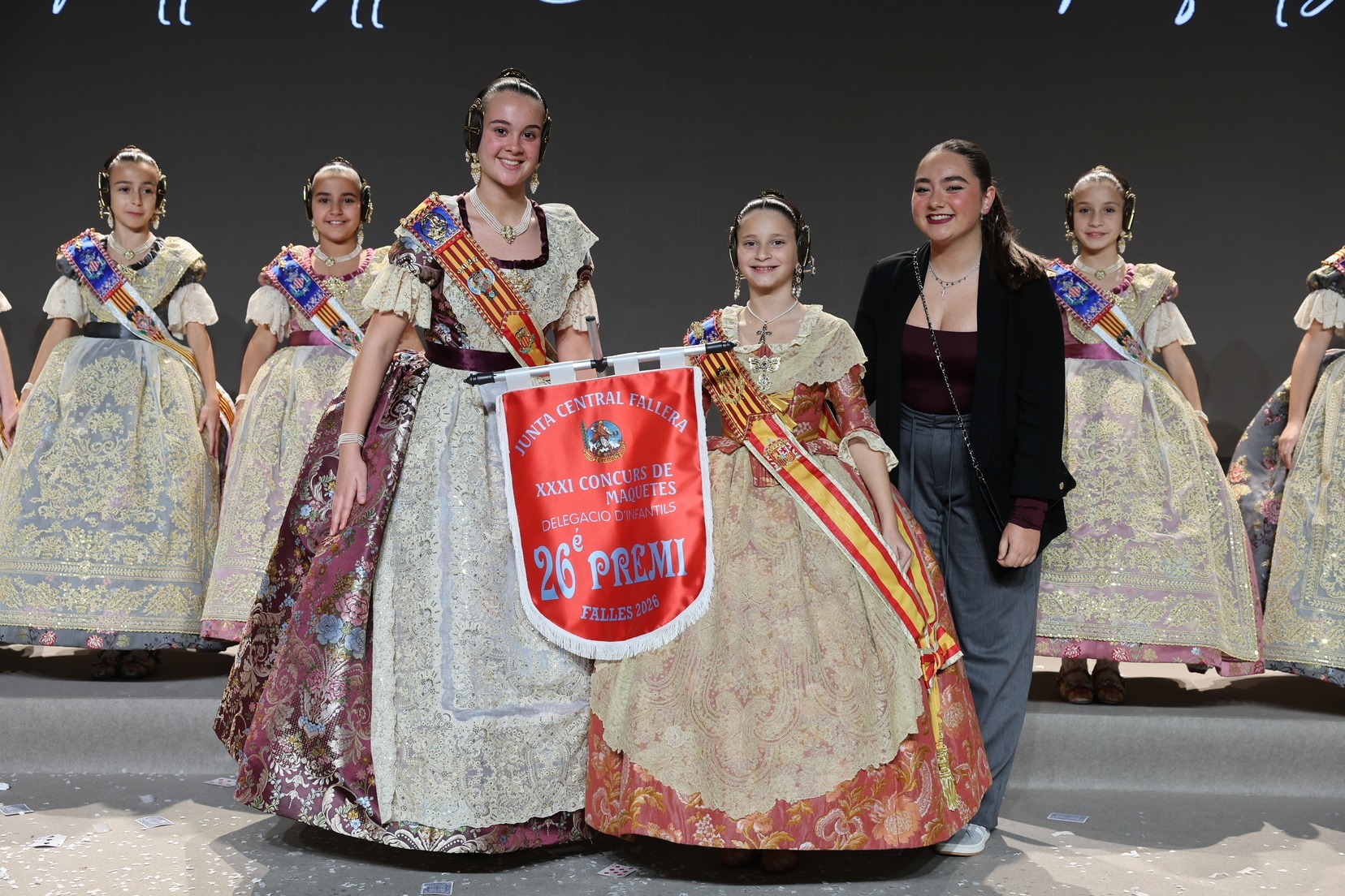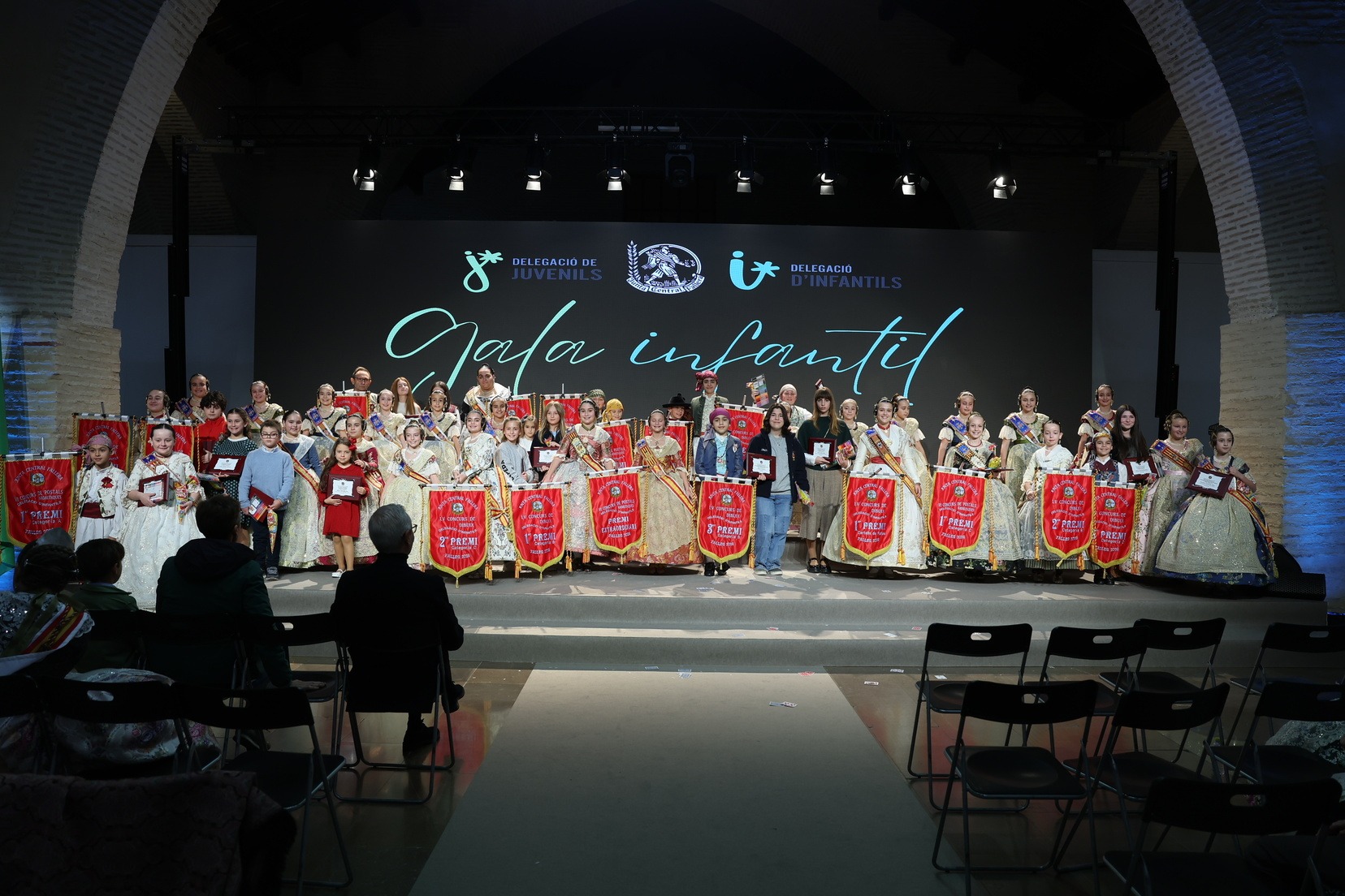 Durante el acto se han entregado los galardones de los concursos infantiles y juveniles organizados por Junta Central Fallera, entre ellos los correspondientes a los concursos de dibujo, maquetas, futbolín y postales. La gala ha servido para reunir sobre el escenario a los representantes de las comisiones distinguidas, reconociendo públicamente su esfuerzo, creatividad y participación.