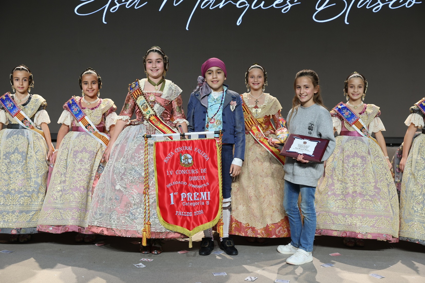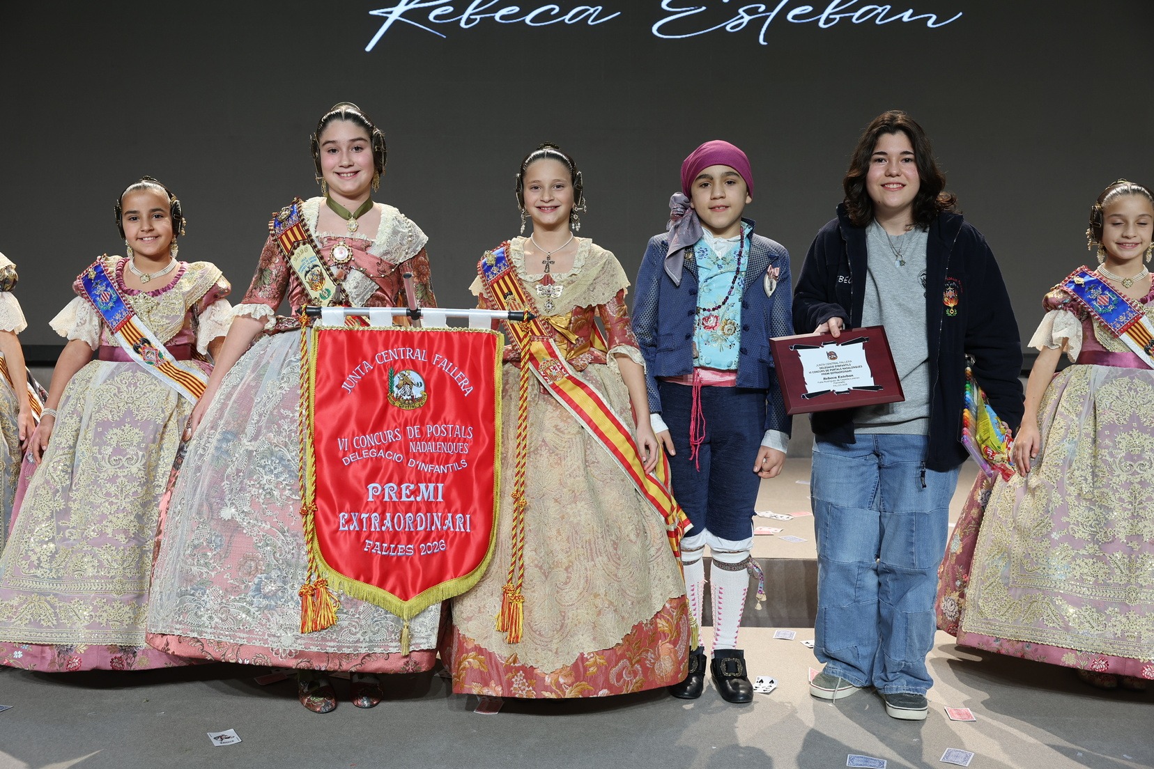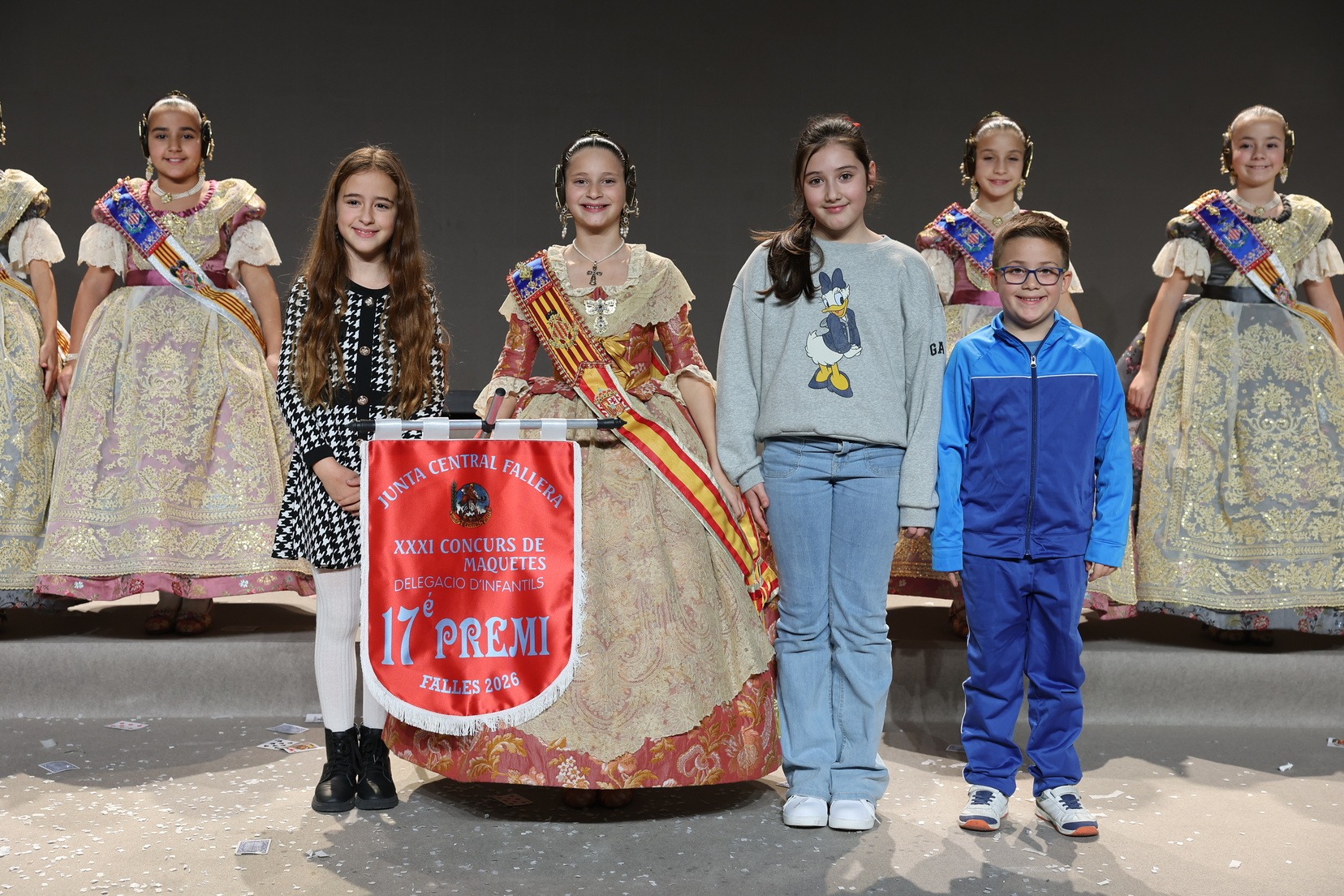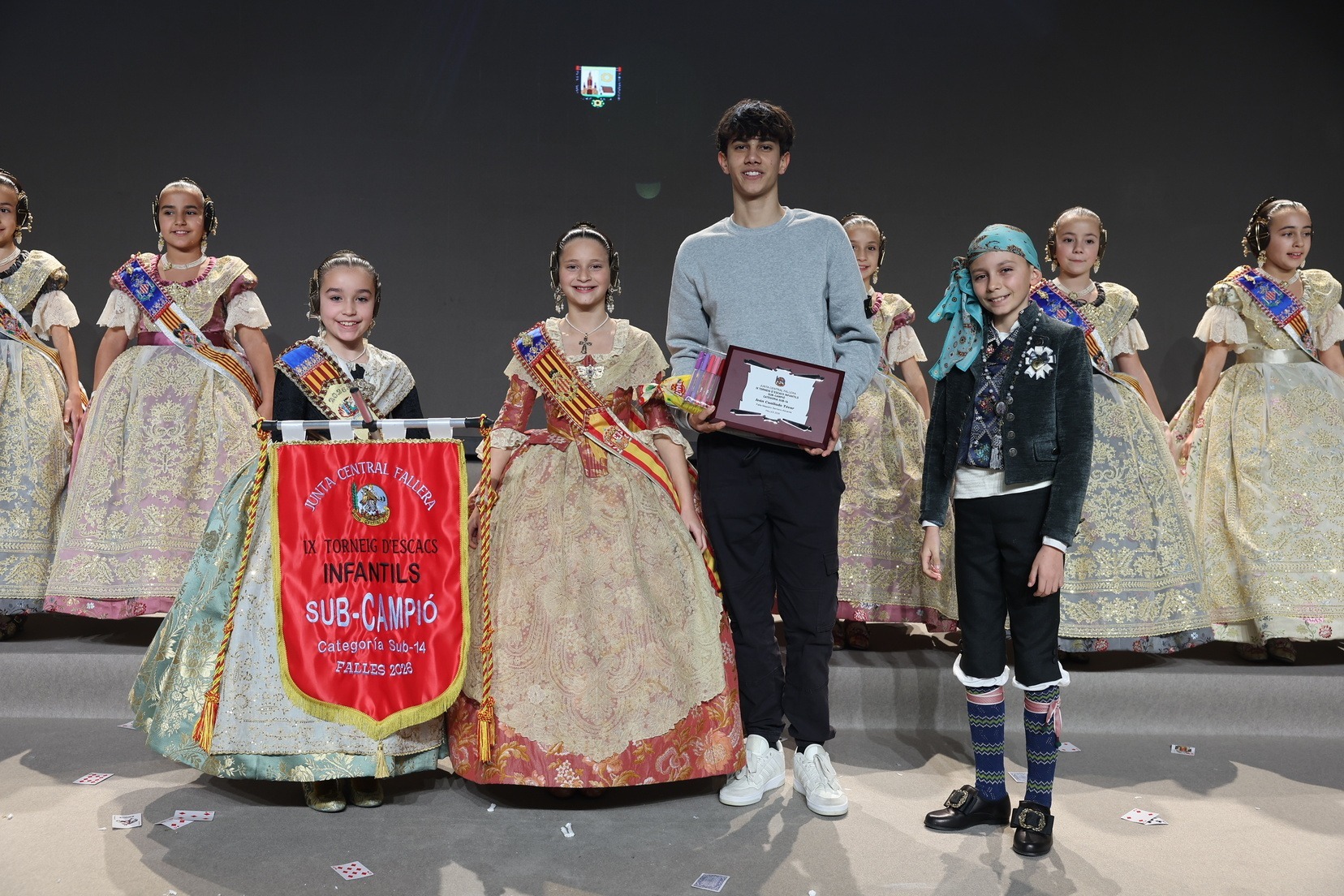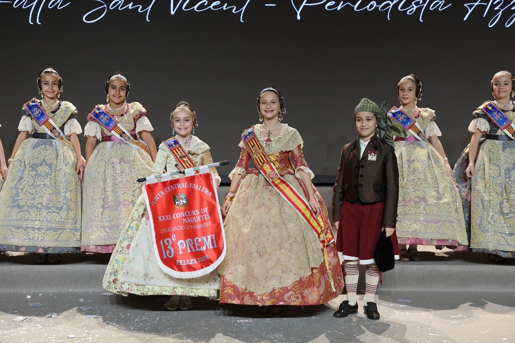 Durante el acto se han entregado los galardones de los concursos infantiles y juveniles organizados por Junta Central Fallera, entre ellos los correspondientes a los concursos de dibujo, maquetas, futbolín y postales. La gala ha servido para reunir sobre el escenario a los representantes de las comisiones distinguidas, reconociendo públicamente su esfuerzo, creatividad y participación.