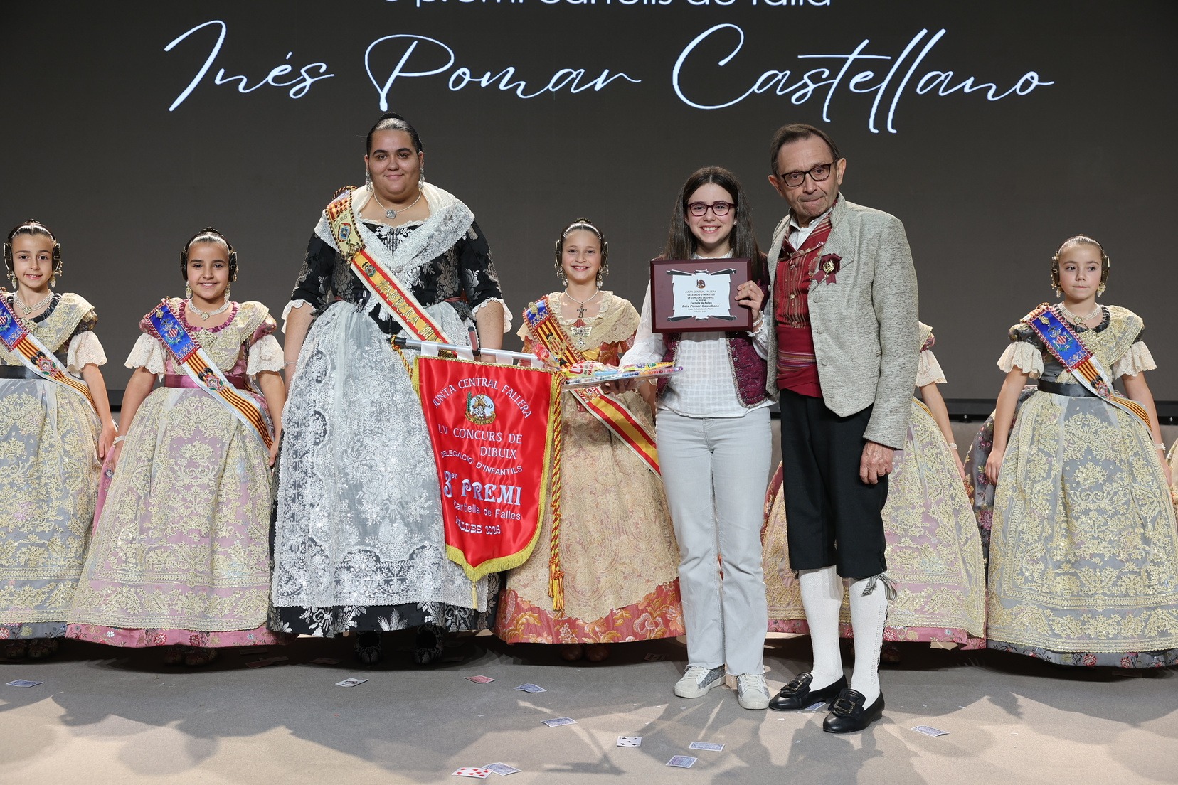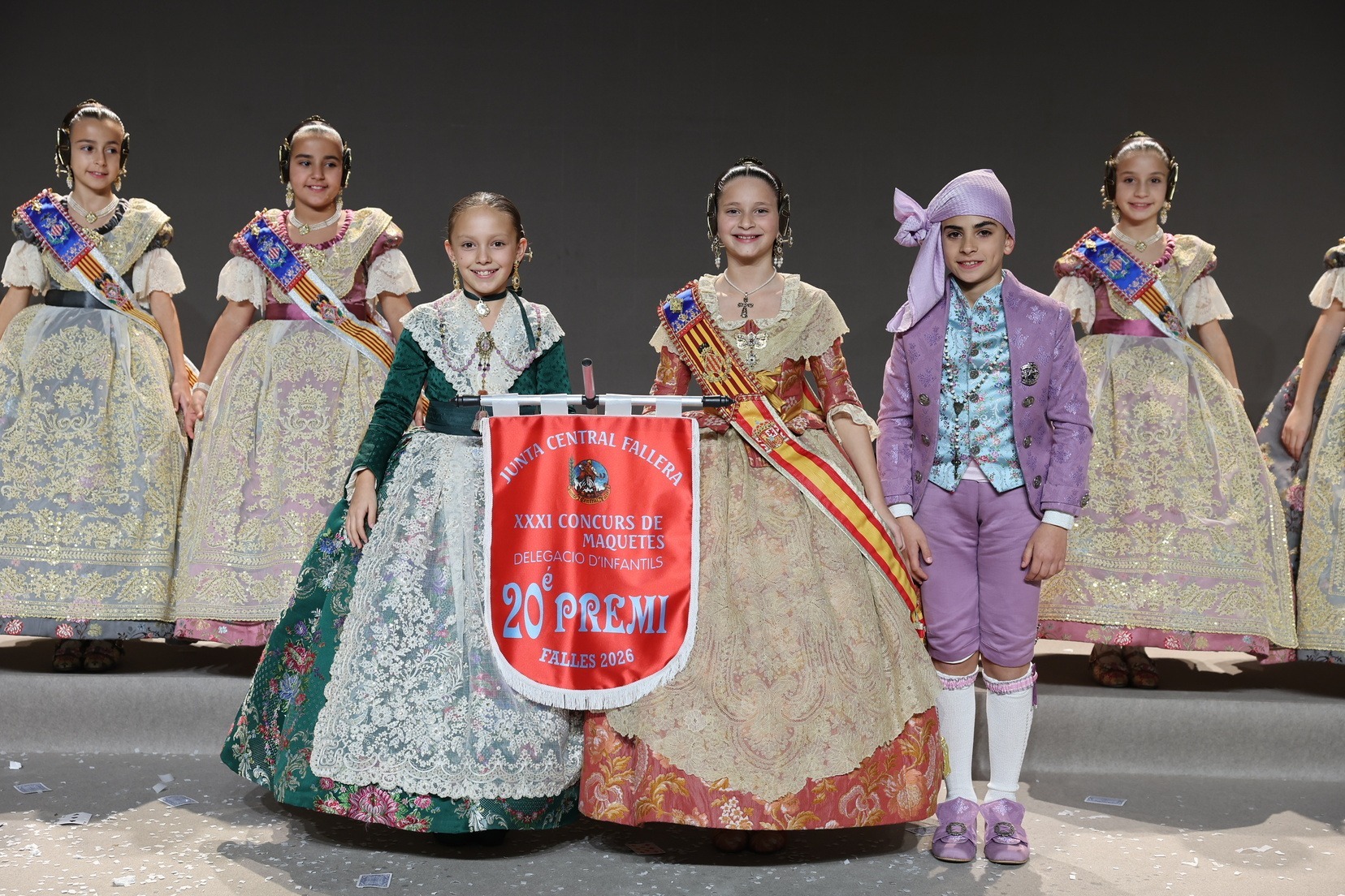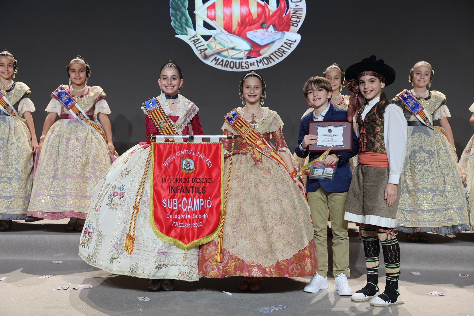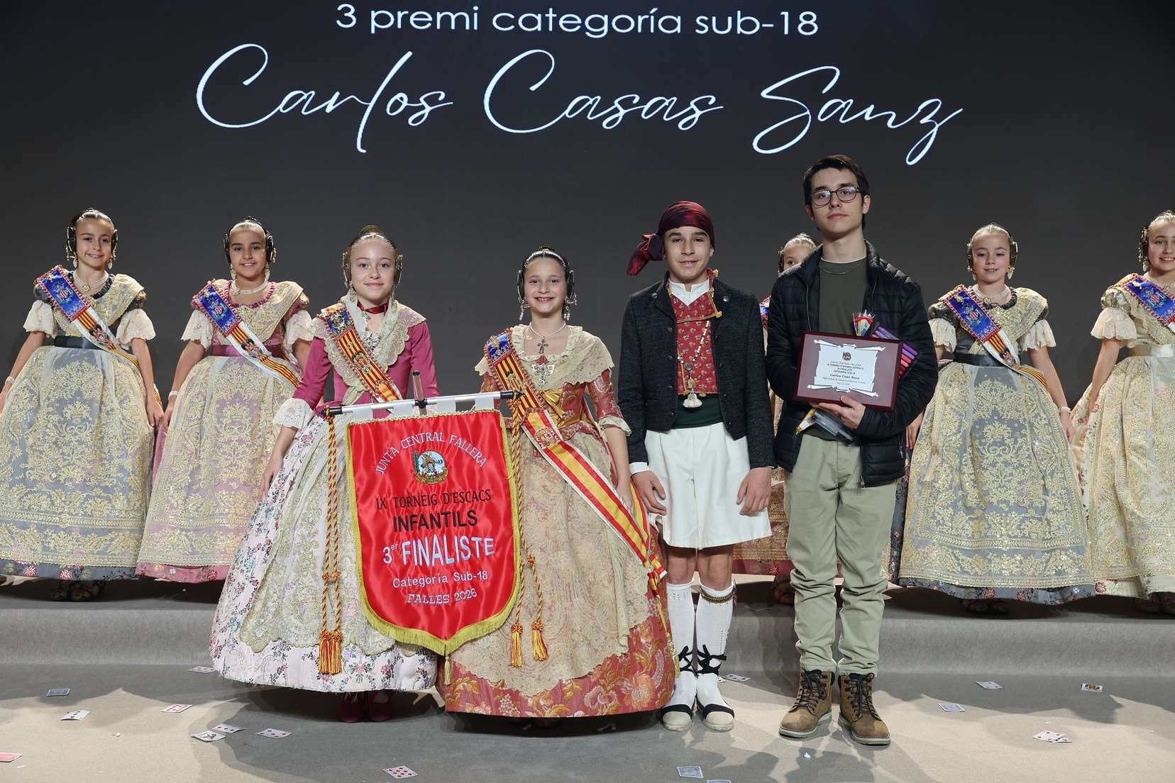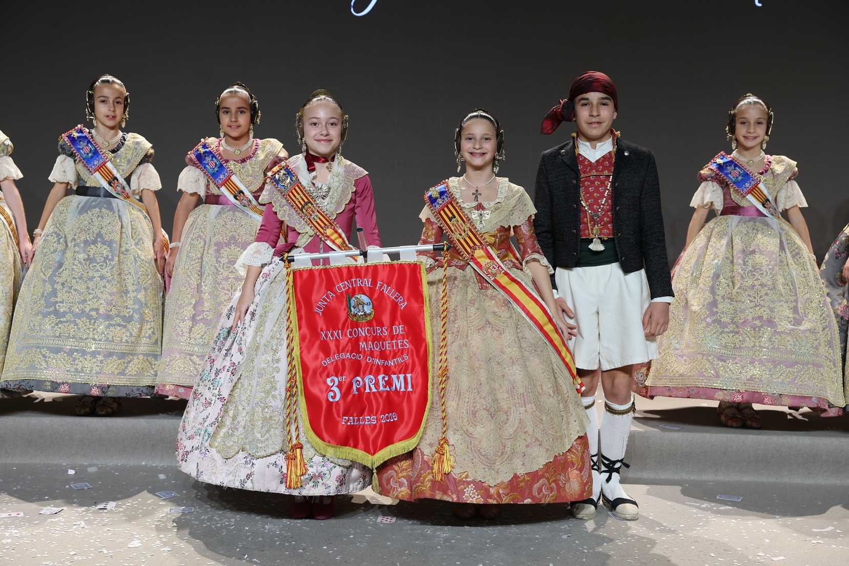 Durante el acto se han entregado los galardones de los concursos infantiles y juveniles organizados por Junta Central Fallera, entre ellos los correspondientes a los concursos de dibujo, maquetas, futbolín y postales. La gala ha servido para reunir sobre el escenario a los representantes de las comisiones distinguidas, reconociendo públicamente su esfuerzo, creatividad y participación.