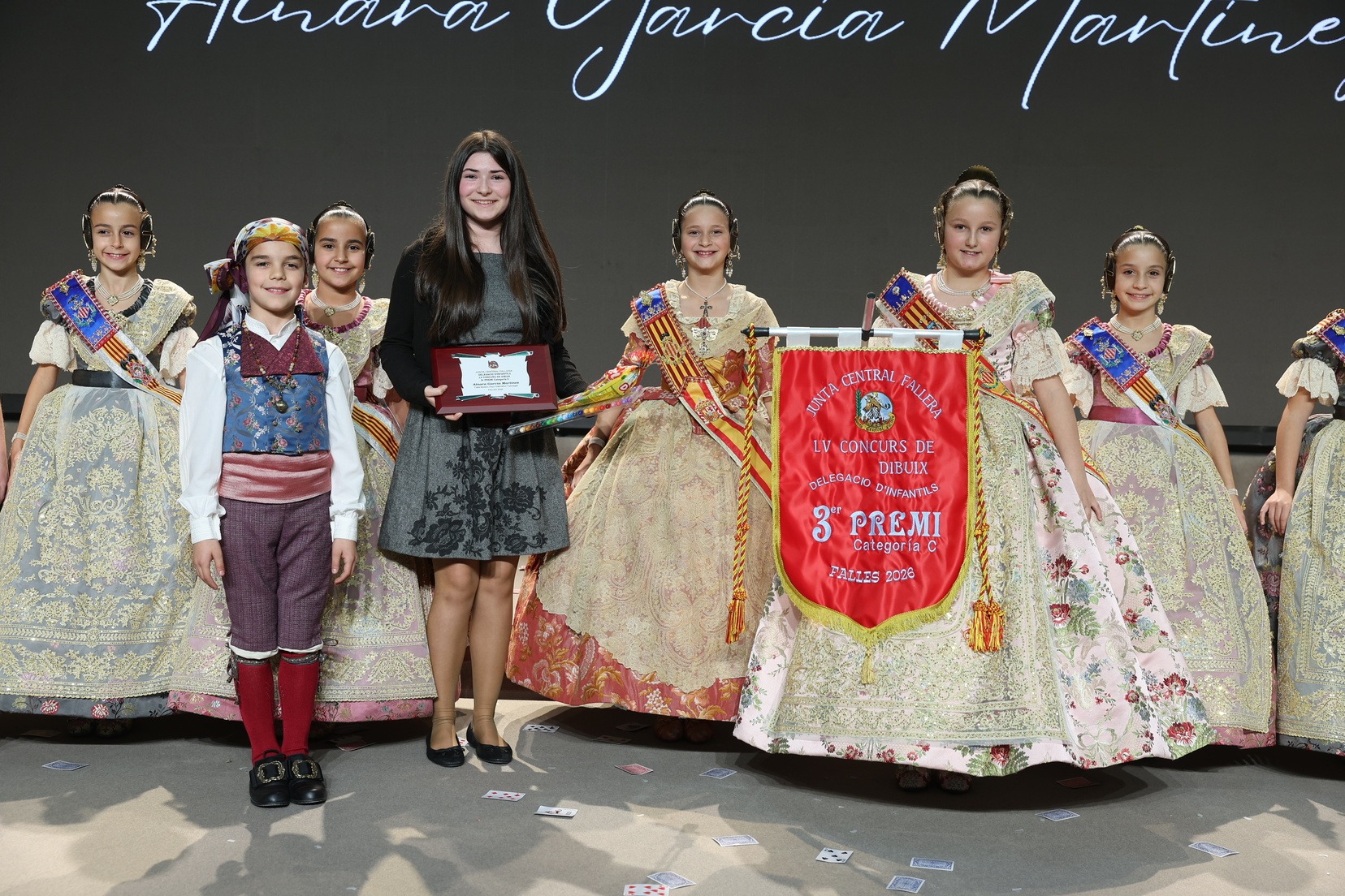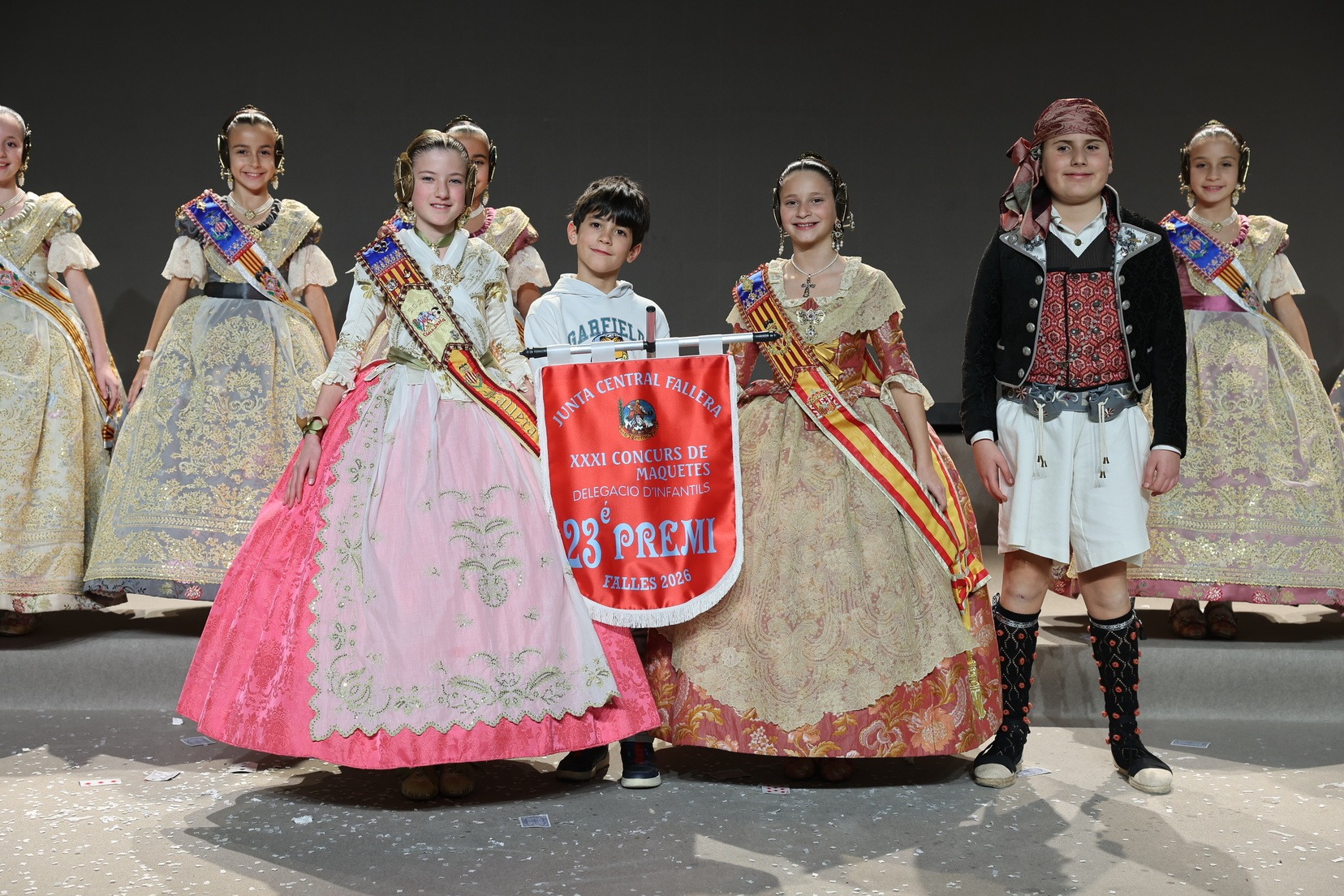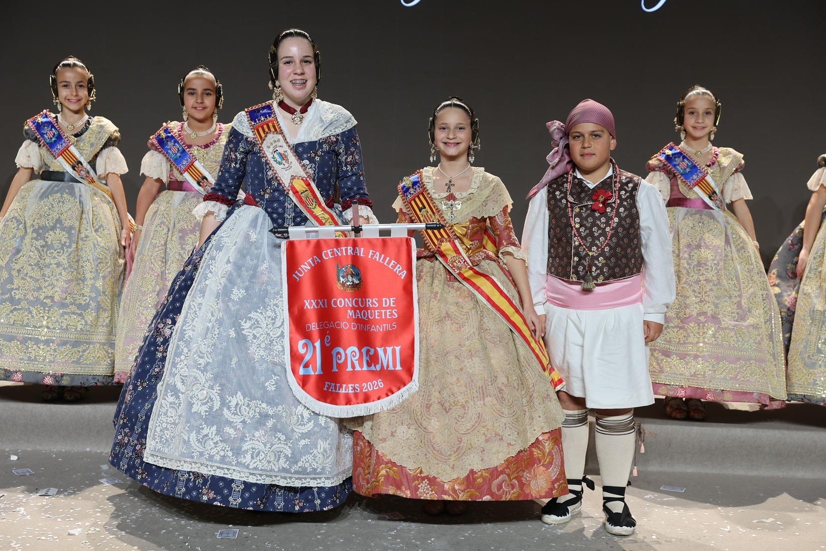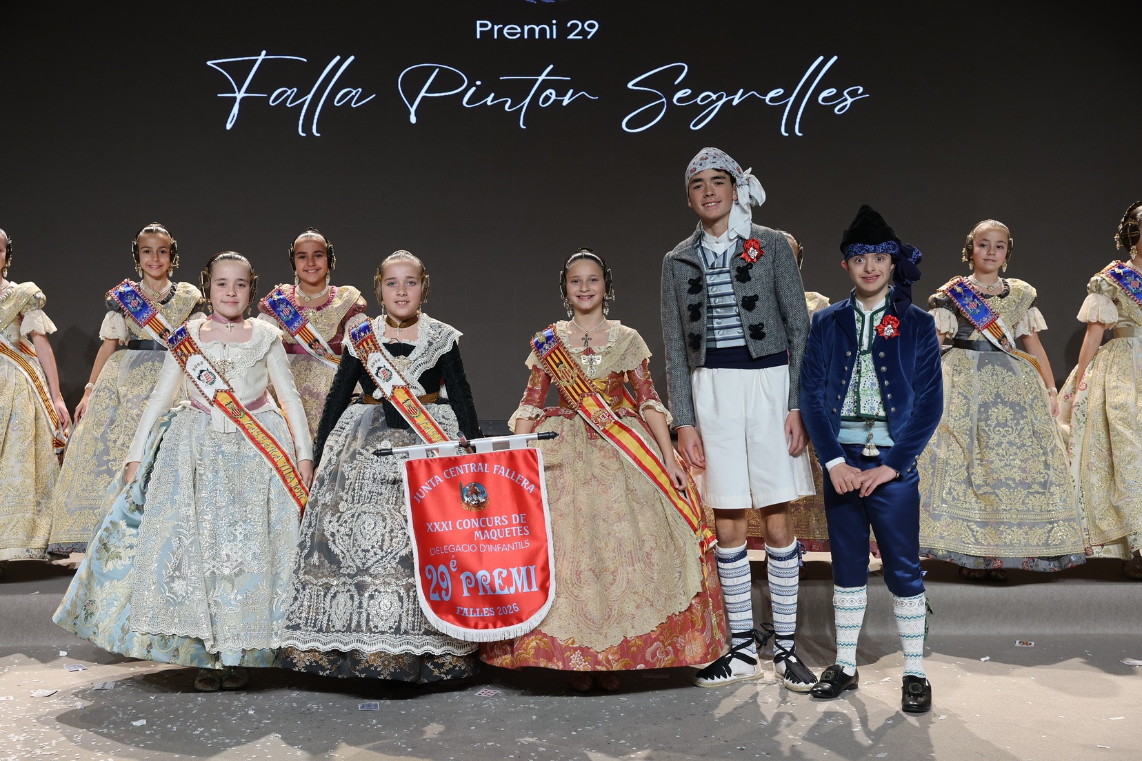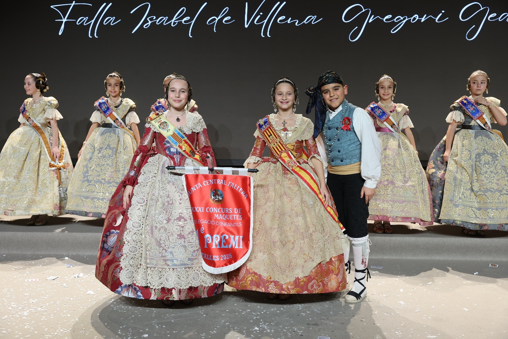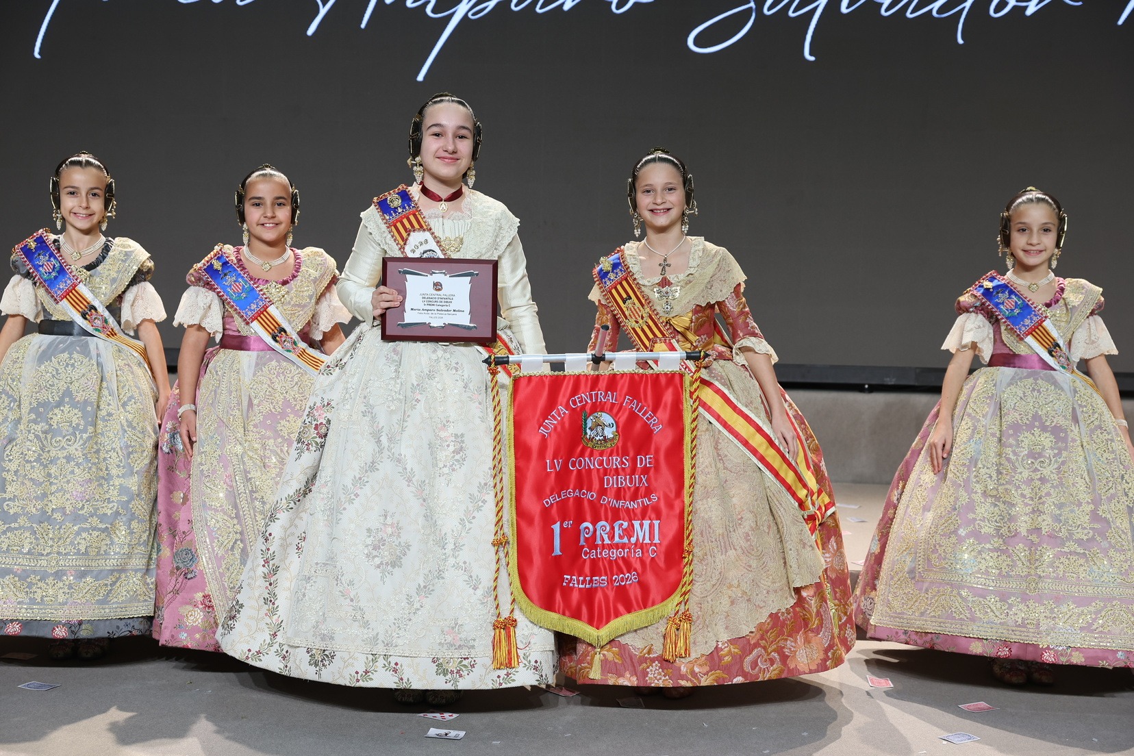 Durante el acto se han entregado los galardones de los concursos infantiles y juveniles organizados por Junta Central Fallera, entre ellos los correspondientes a los concursos de dibujo, maquetas, futbolín y postales. La gala ha servido para reunir sobre el escenario a los representantes de las comisiones distinguidas, reconociendo públicamente su esfuerzo, creatividad y participación.