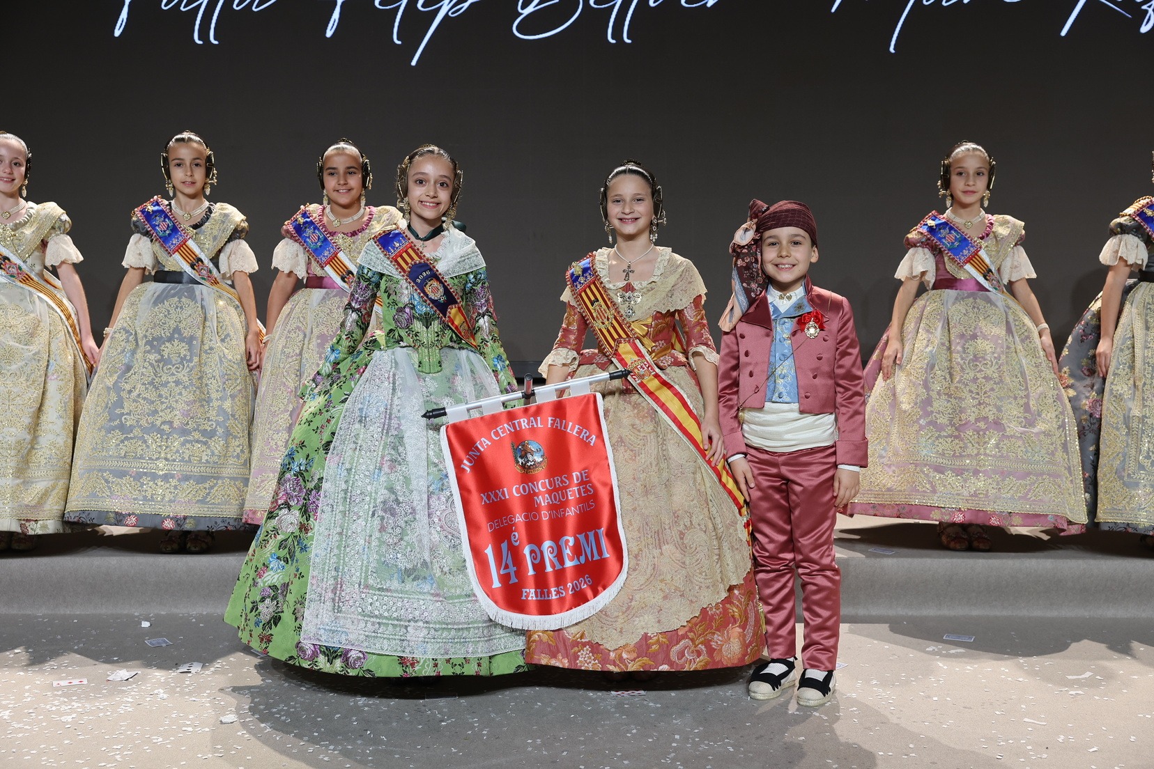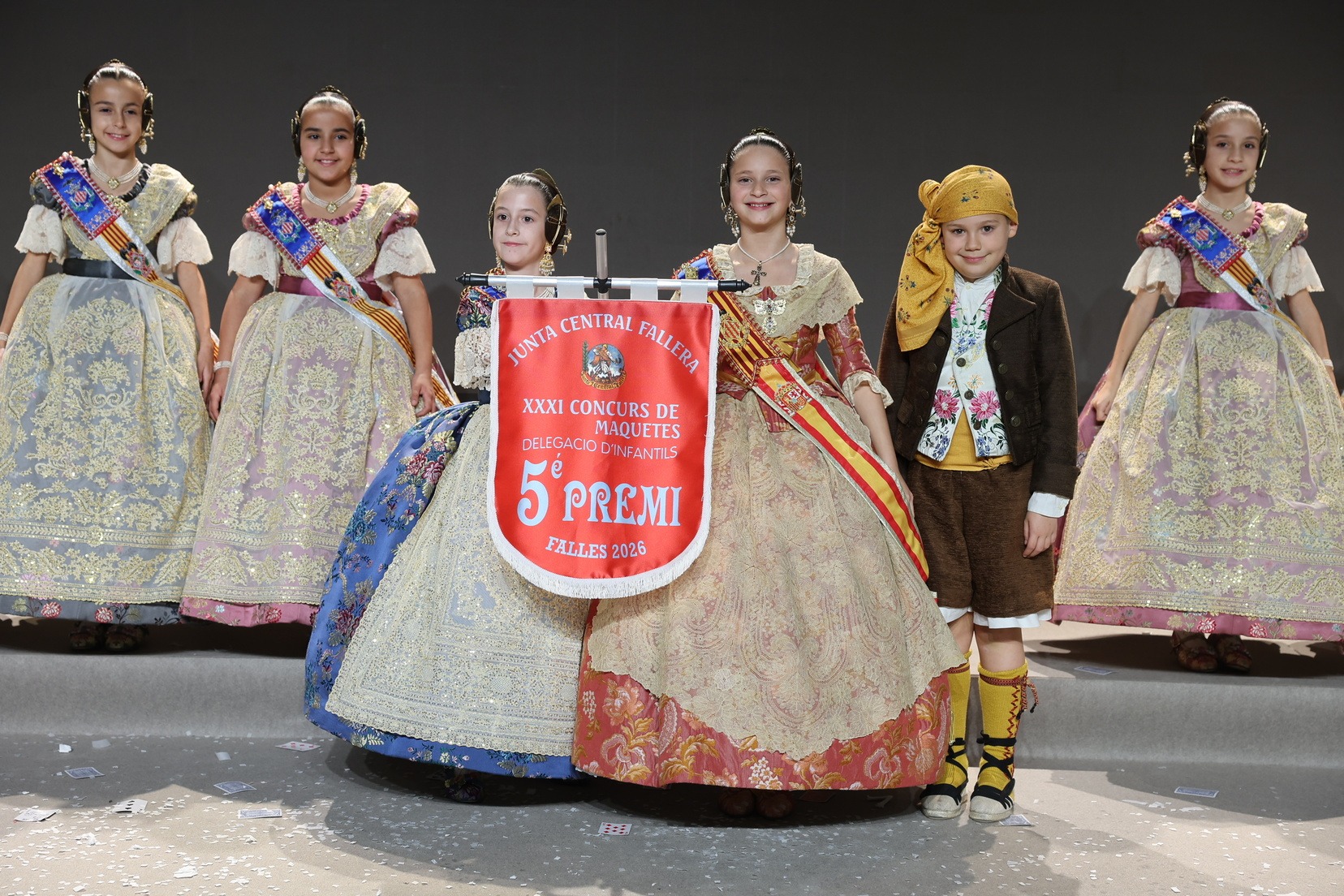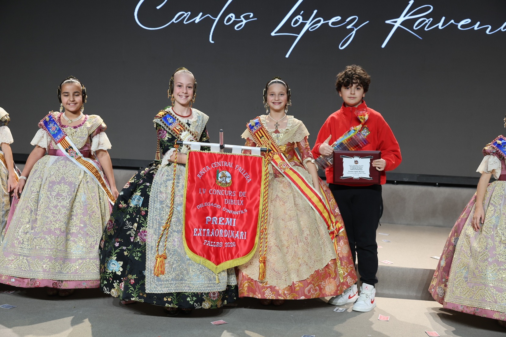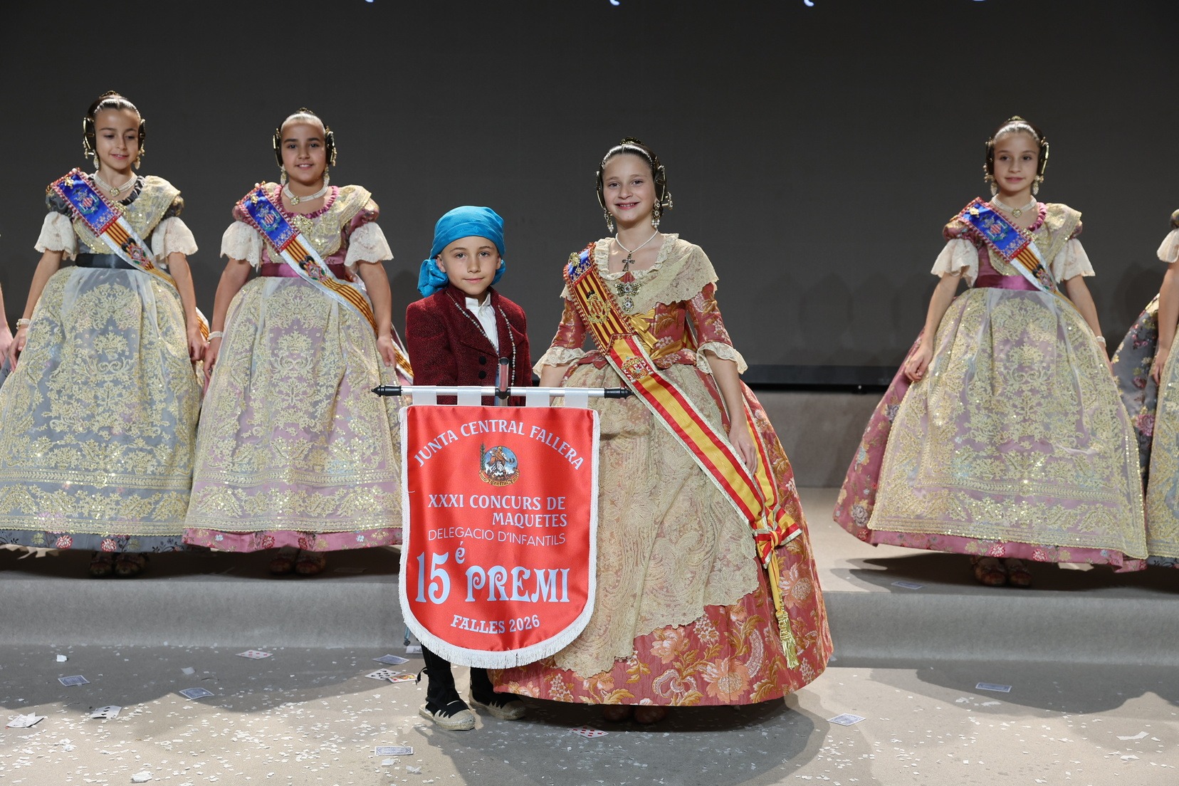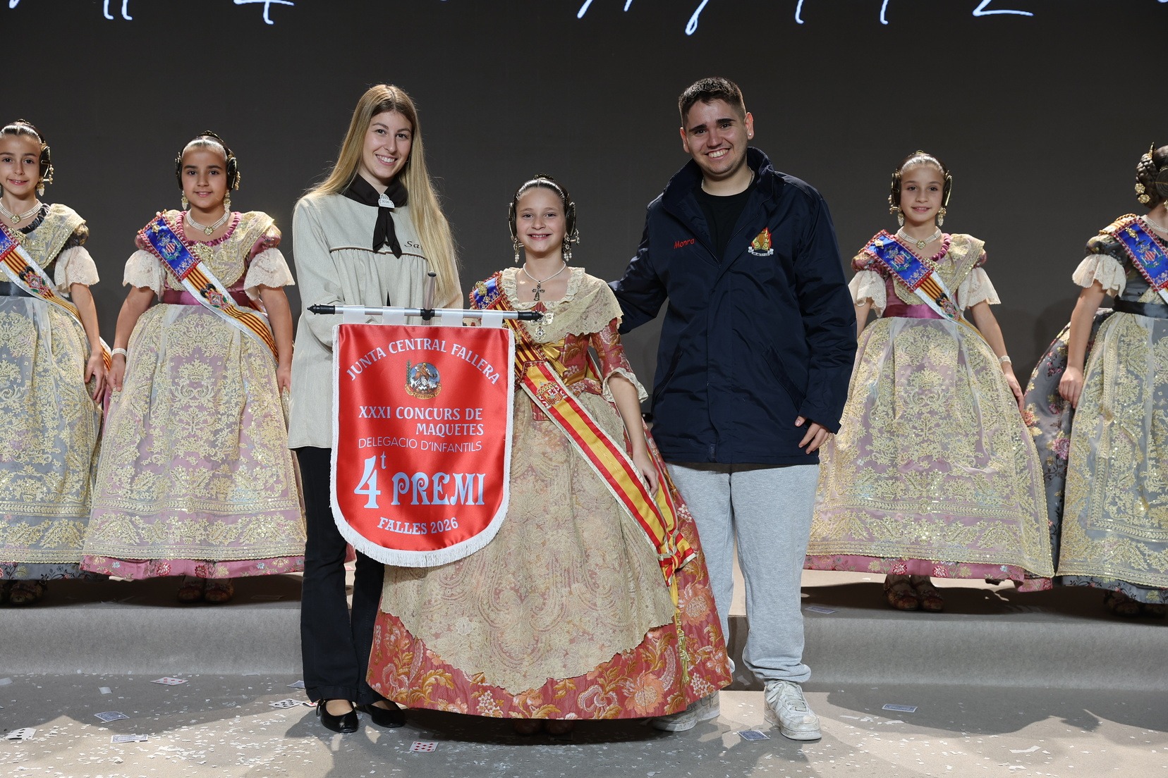 Durante el acto se han entregado los galardones de los concursos infantiles y juveniles organizados por Junta Central Fallera, entre ellos los correspondientes a los concursos de dibujo, maquetas, futbolín y postales. La gala ha servido para reunir sobre el escenario a los representantes de las comisiones distinguidas, reconociendo públicamente su esfuerzo, creatividad y participación.