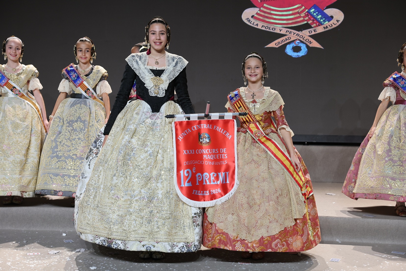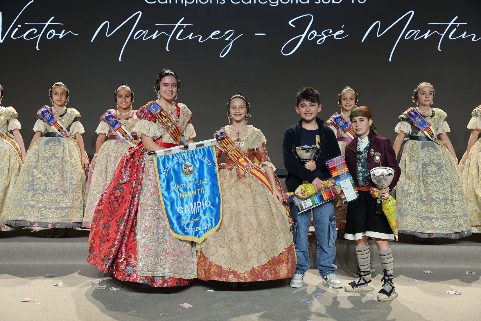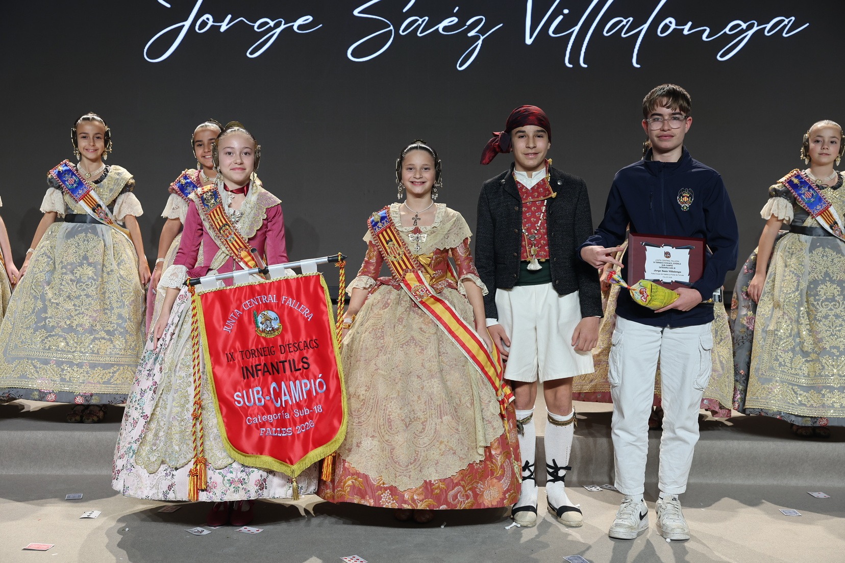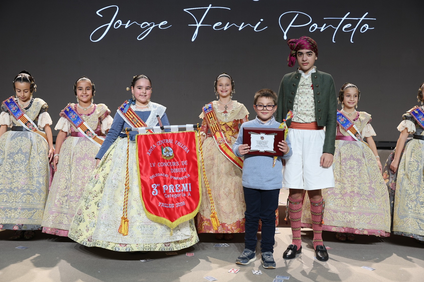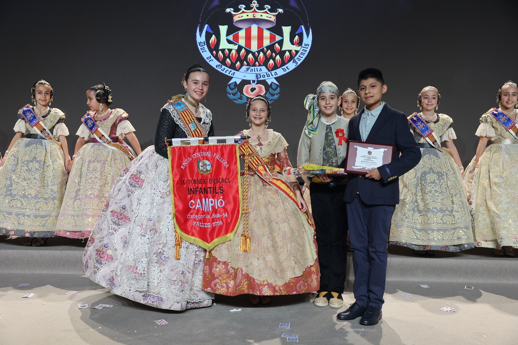 Durante el acto se han entregado los galardones de los concursos infantiles y juveniles organizados por Junta Central Fallera, entre ellos los correspondientes a los concursos de dibujo, maquetas, futbolín y postales. La gala ha servido para reunir sobre el escenario a los representantes de las comisiones distinguidas, reconociendo públicamente su esfuerzo, creatividad y participación.
