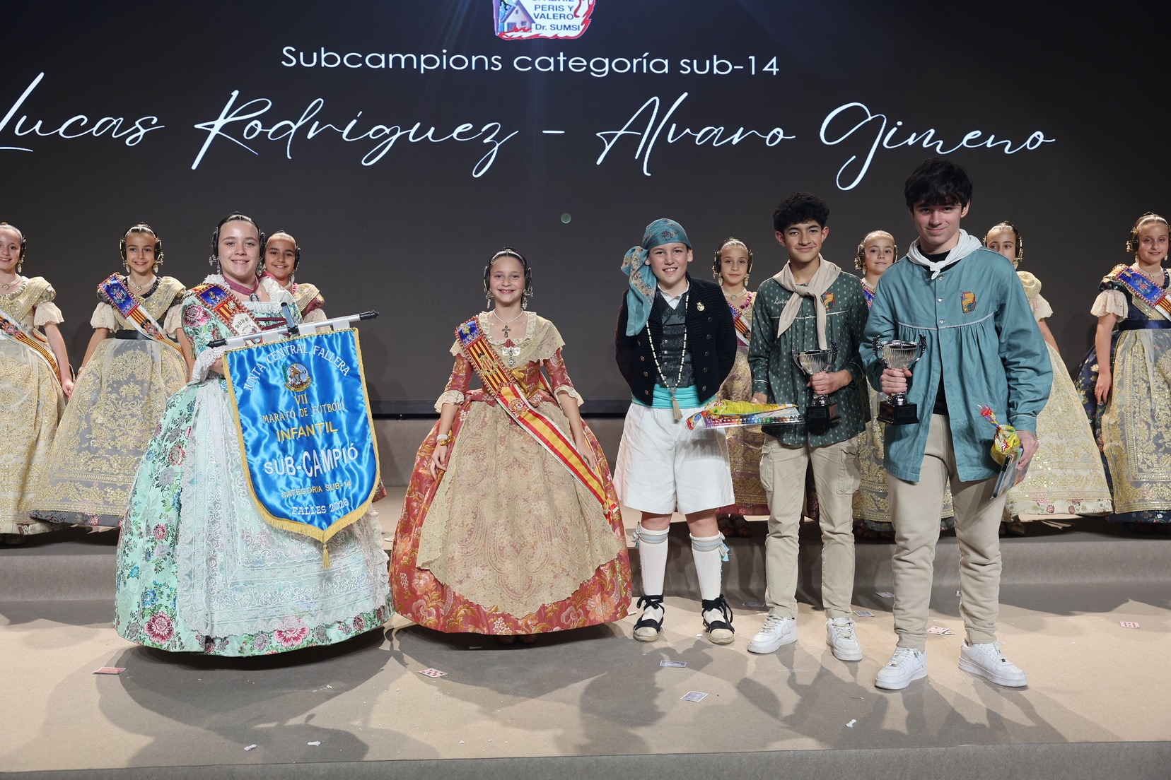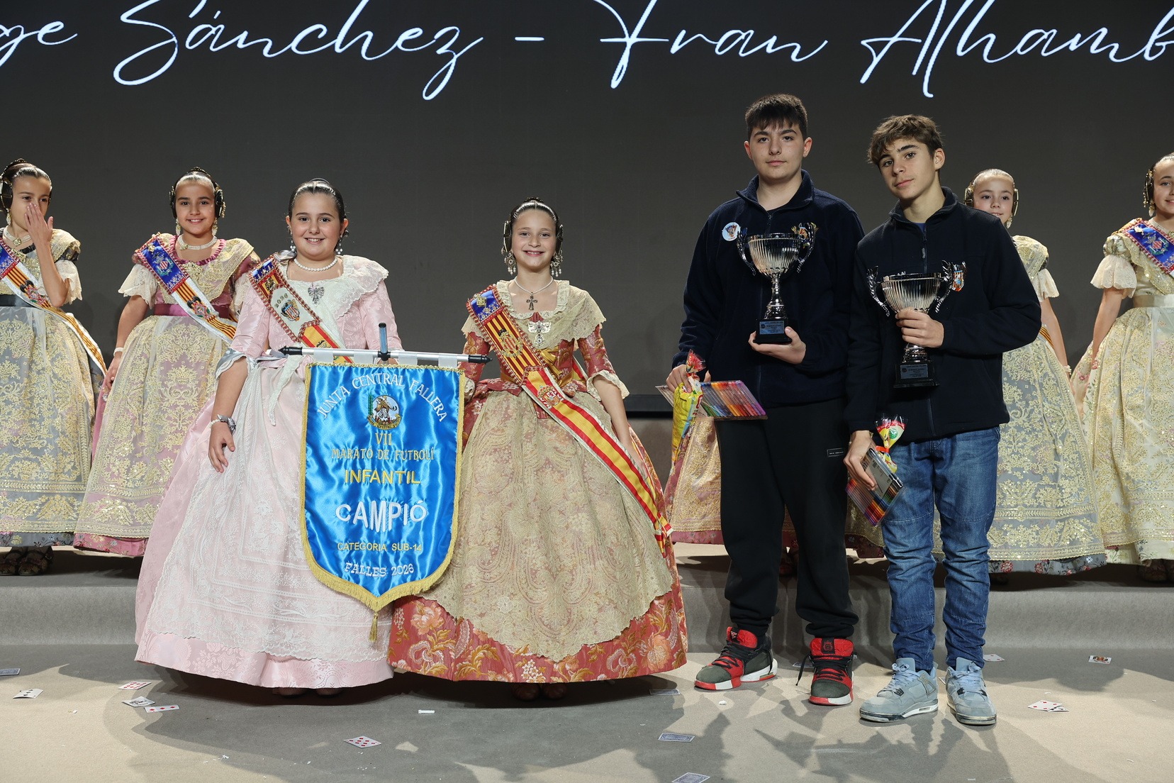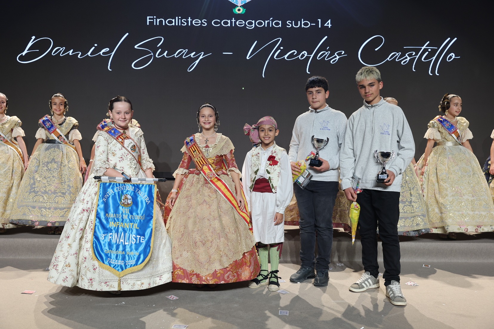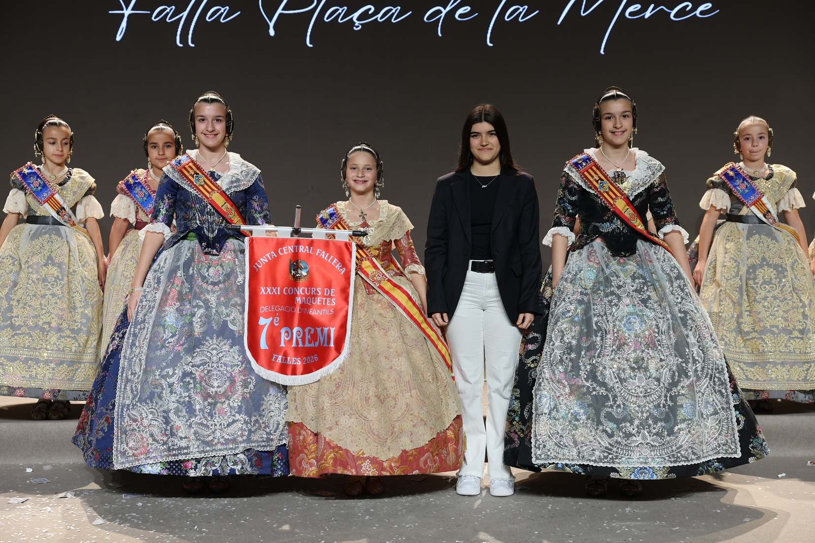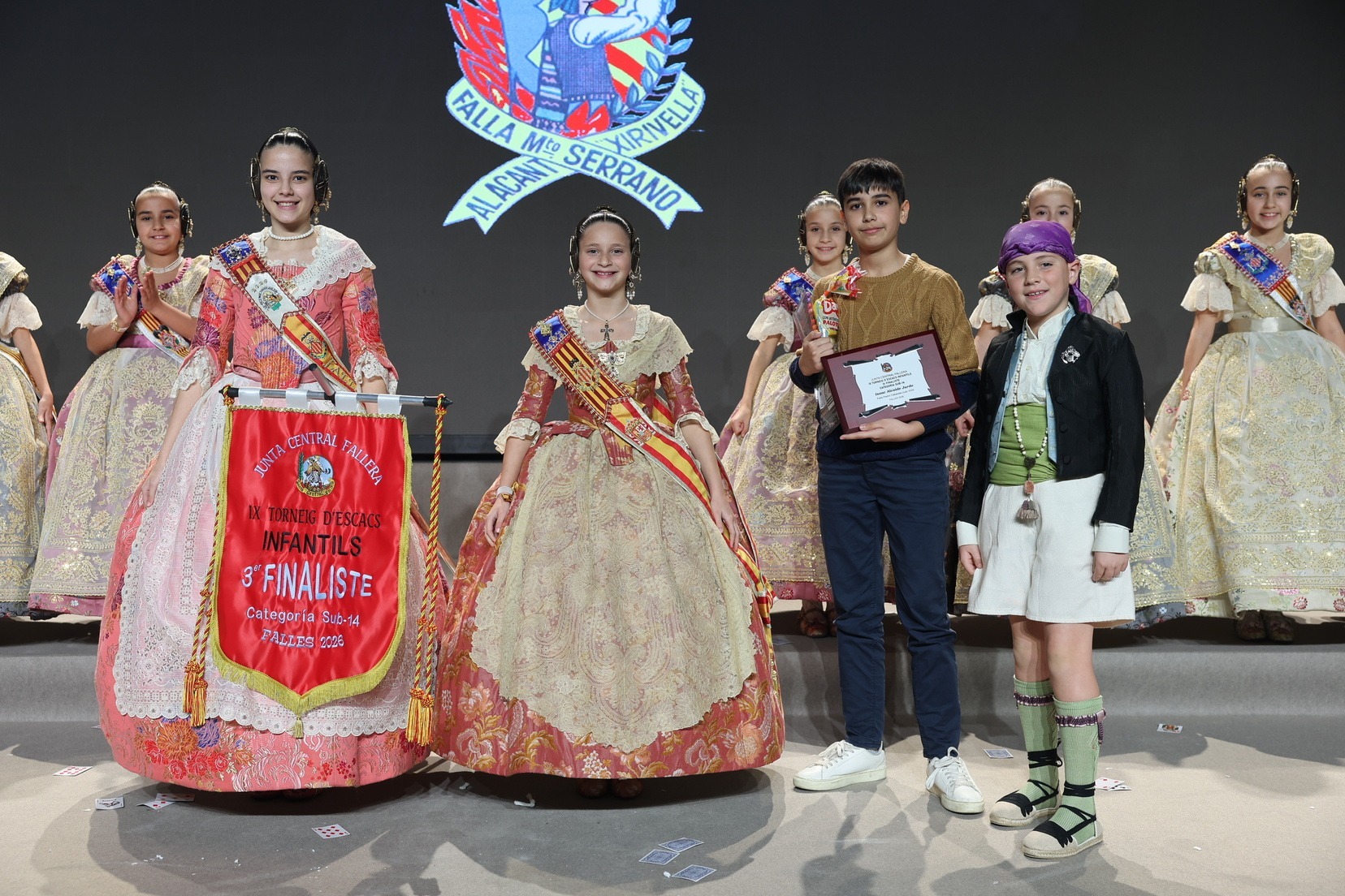 Durante el acto se han entregado los galardones de los concursos infantiles y juveniles organizados por Junta Central Fallera, entre ellos los correspondientes a los concursos de dibujo, maquetas, futbolín y postales. La gala ha servido para reunir sobre el escenario a los representantes de las comisiones distinguidas, reconociendo públicamente su esfuerzo, creatividad y participación.