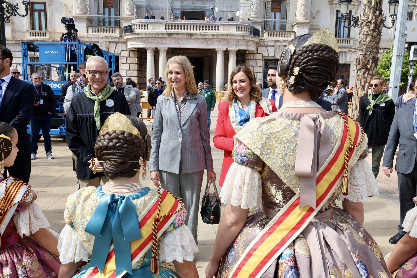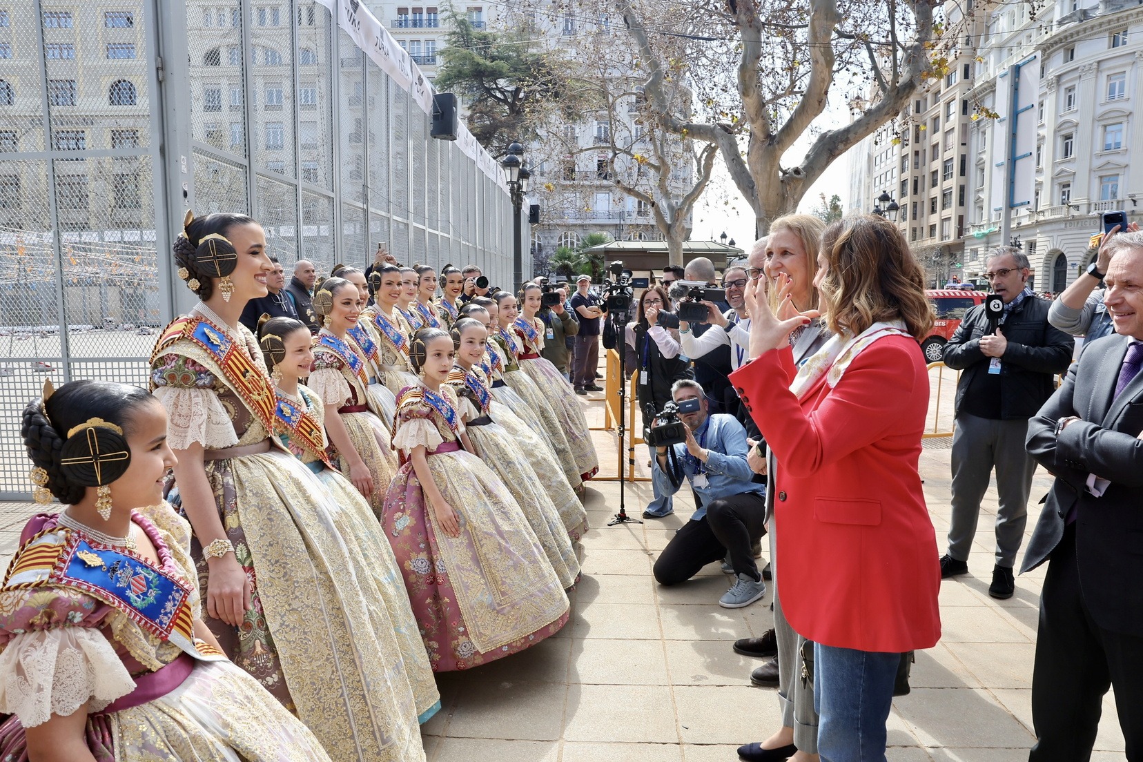 La infanta ha sido recibida en la plaza junto a representantes de Fundación MAPFRE y ha podido saludar a las máximas representantes de la fiesta, la Fallera Mayor de Valencia, Carmen Prades Gil, y la Fallera Mayor Infantil de Valencia, Marta Mercader Roig, acompañadas por sus respectivas Cortes de Honor. Durante el encuentro han compartido unos momentos de conversación antes del disparo de la mascletà.
