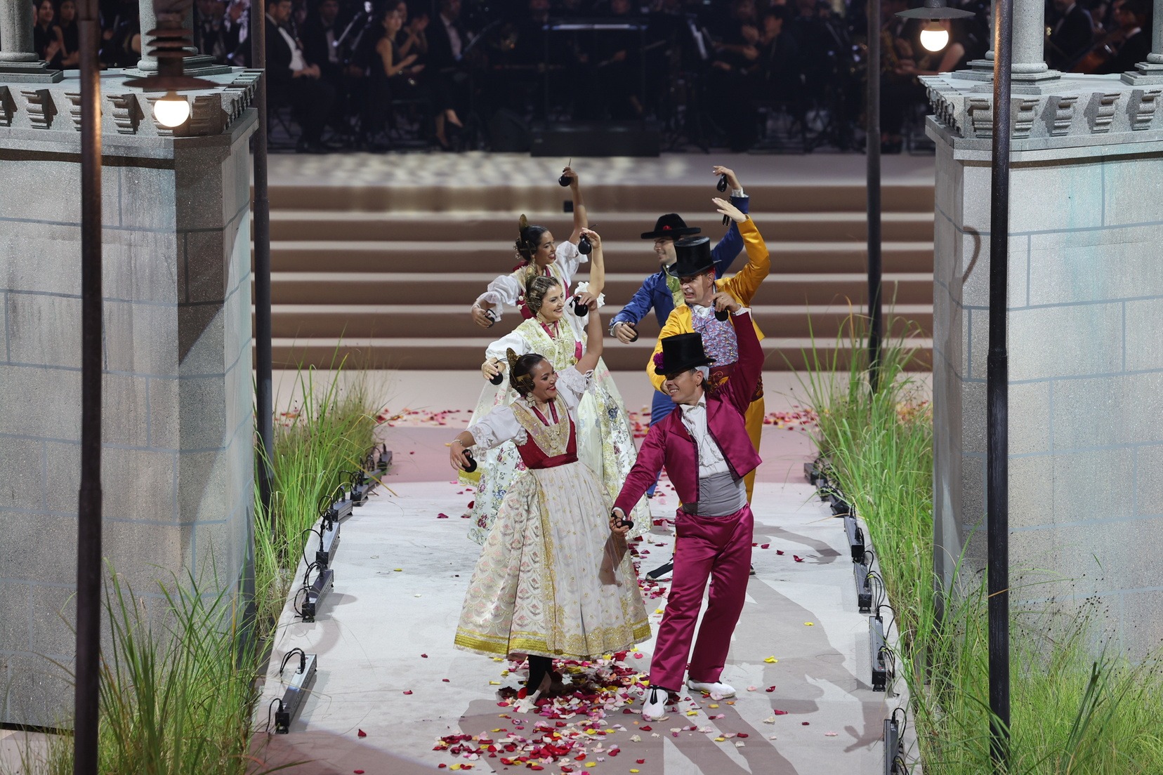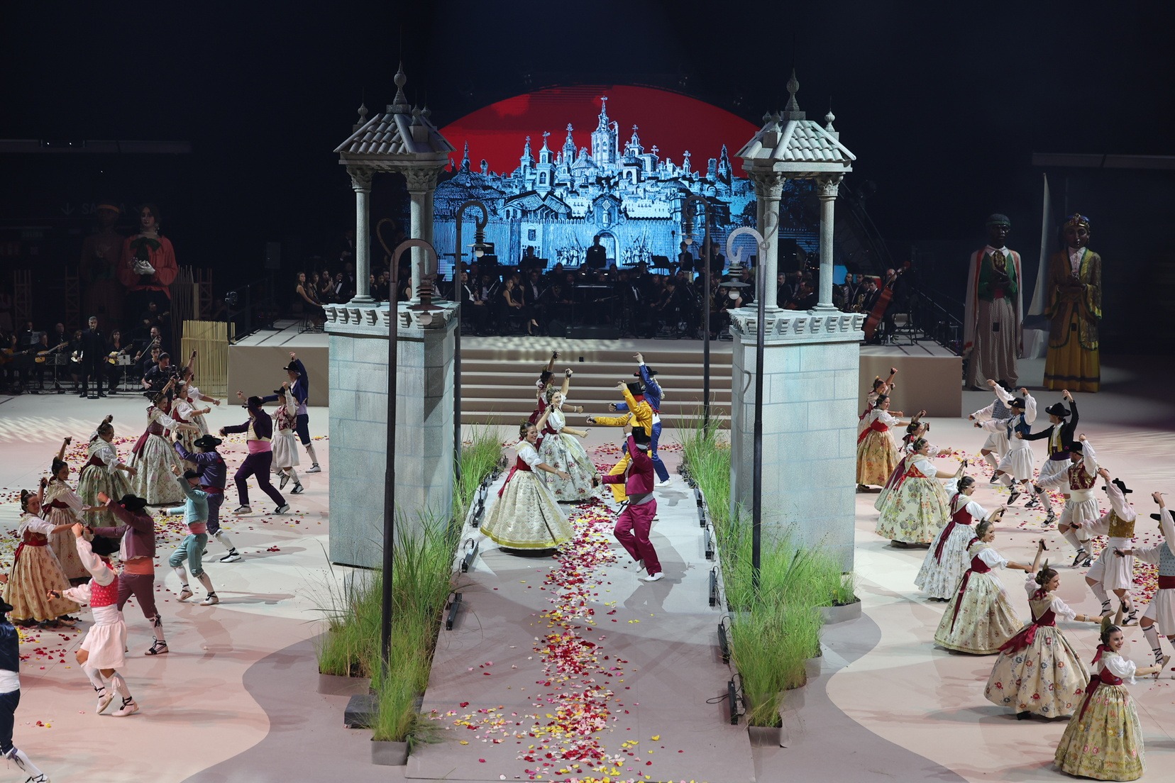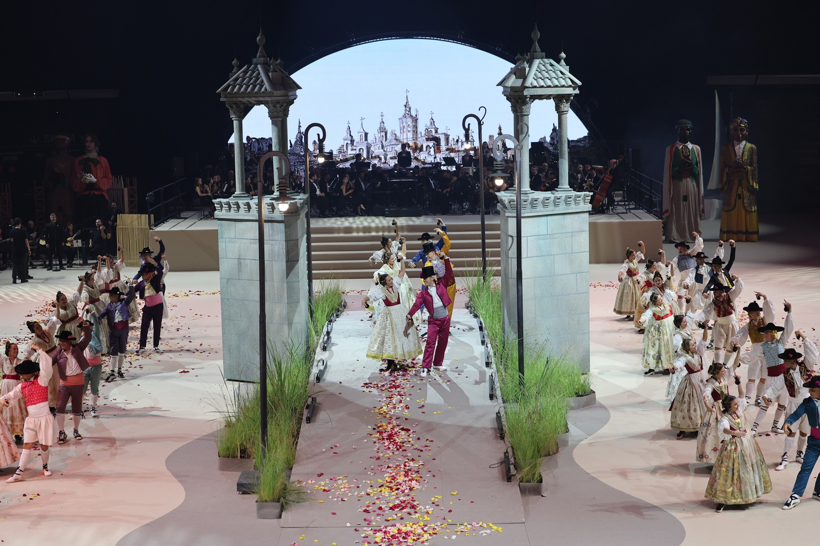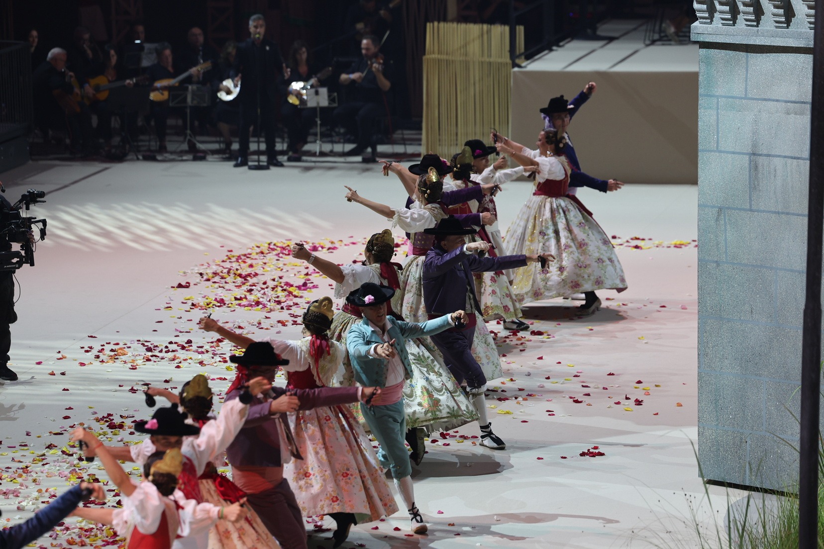 El inicio de este segundo acto ha estado marcado por la presencia del Micalet, que conmemora los 600 años de la finalización del Campanar Nou de la Catedral de Valencia. A continuación, la escena ha trasladado al público al ambiente de la víspera fallera, antes de dar paso a la actuación de Les Folies de Carcaixent y su rondalla, que han ofrecido su talento acompañados por la música tradicional en directo. Uno de los momentos más esperados de la noche ha llegado con el desfile de las 146 candidatas a Falleras Mayores de Valencia 2026, acompañada por una cuidada selección musical dirigida por el maestro Quique Montesinos.