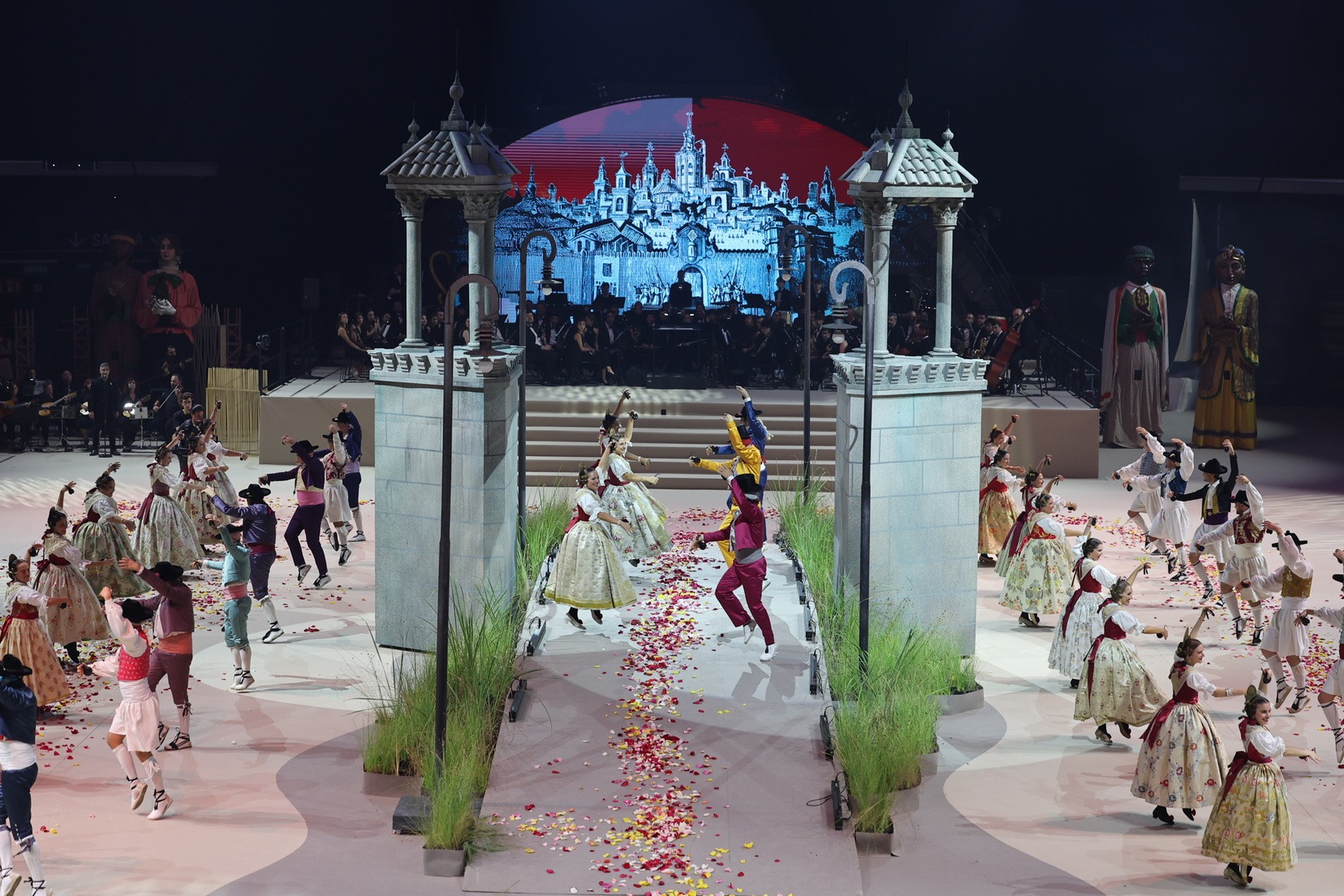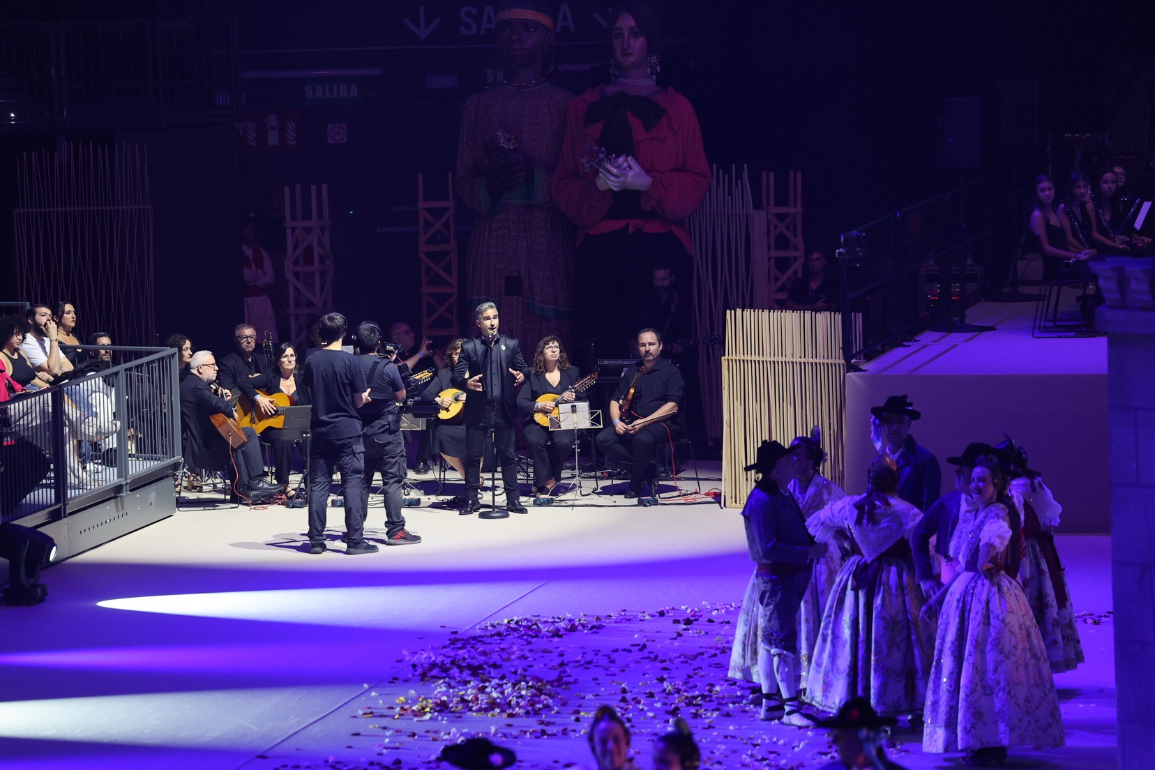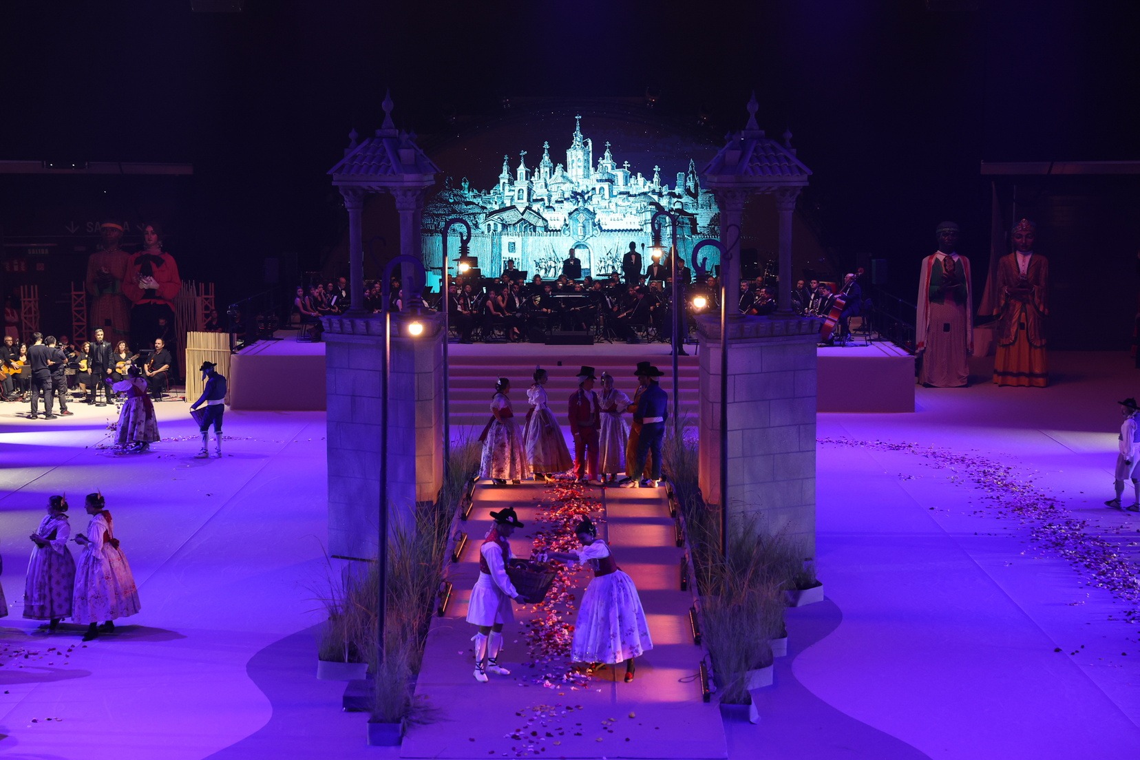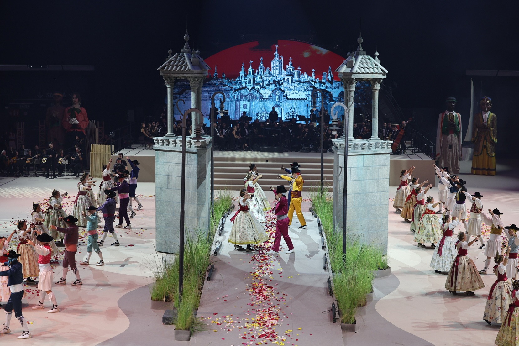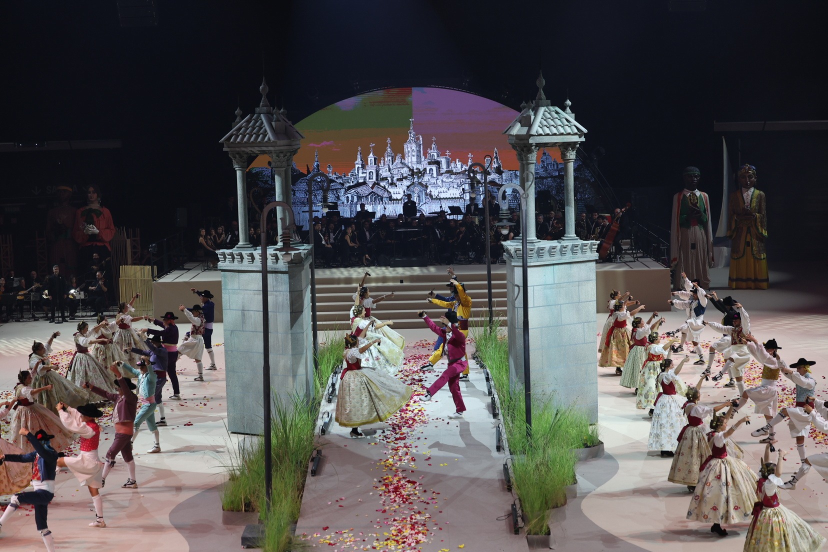 El inicio de este segundo acto ha estado marcado por la presencia del Micalet, que conmemora los 600 años de la finalización del Campanar Nou de la Catedral de Valencia. A continuación, la escena ha trasladado al público al ambiente de la víspera fallera, antes de dar paso a la actuación de Les Folies de Carcaixent y su rondalla, que han ofrecido su talento acompañados por la música tradicional en directo. Uno de los momentos más esperados de la noche ha llegado con el desfile de las 146 candidatas a Falleras Mayores de Valencia 2026, acompañada por una cuidada selección musical dirigida por el maestro Quique Montesinos.