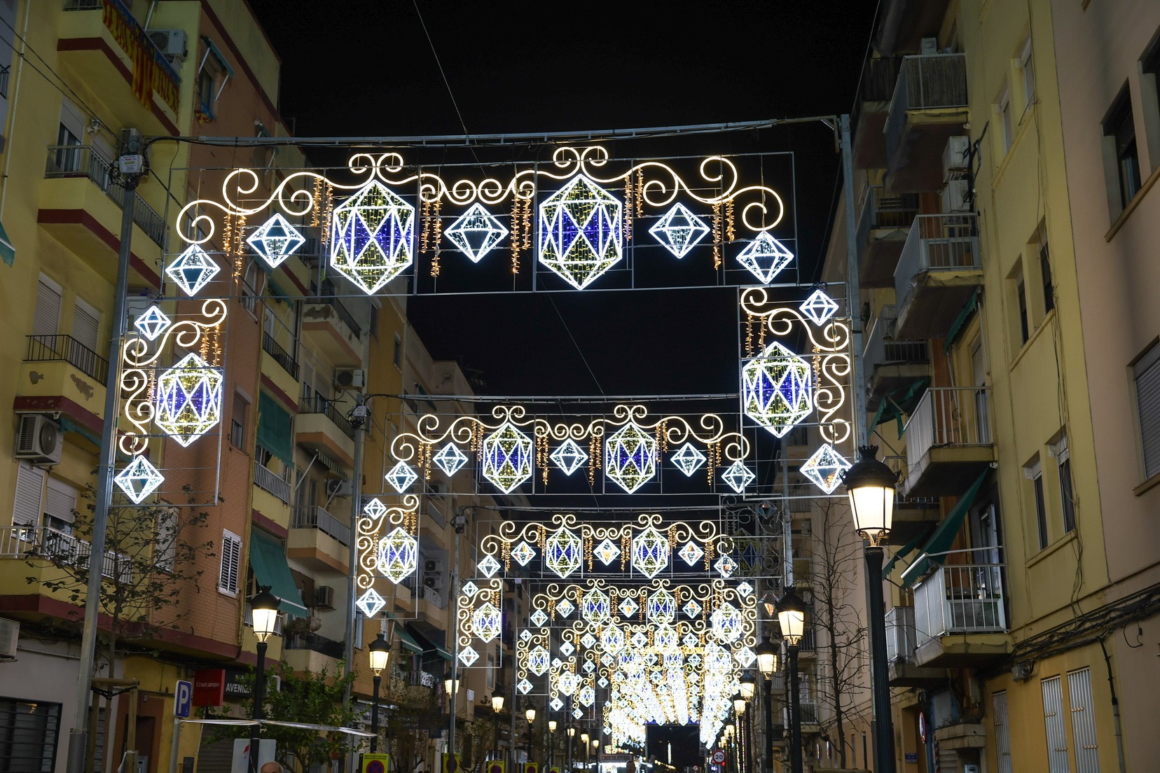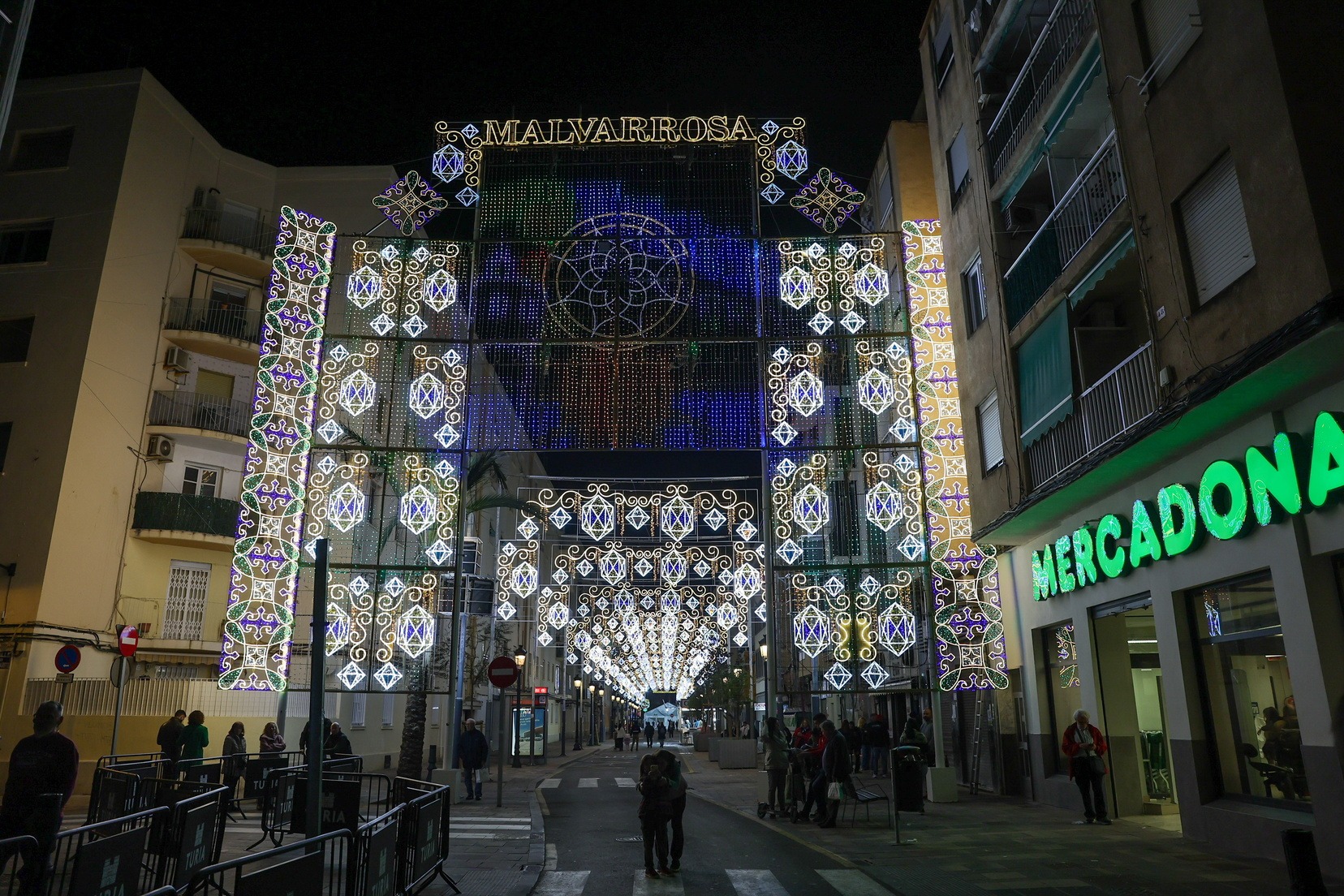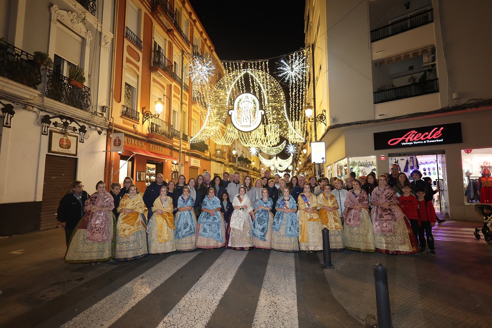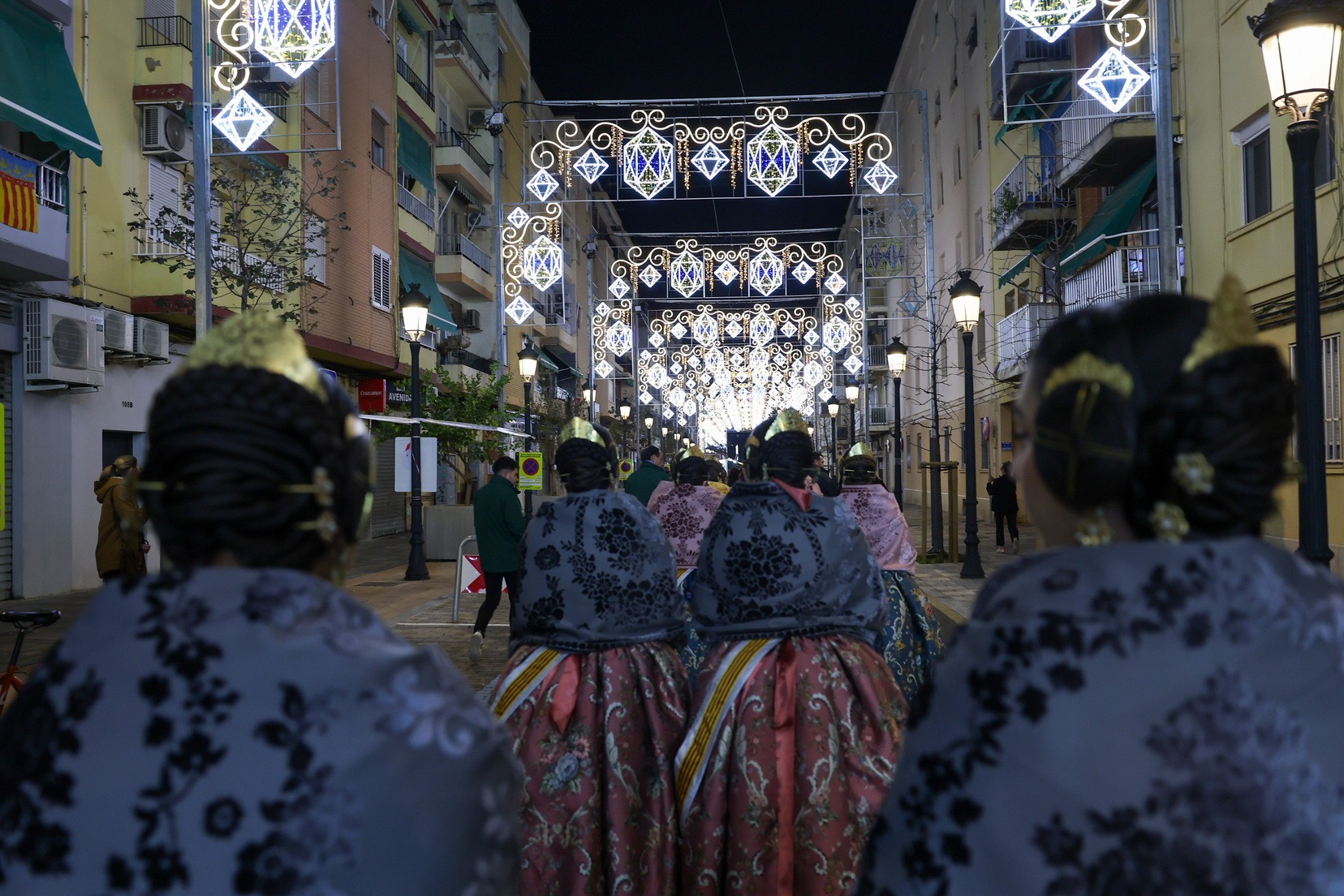 Las Falleras Mayores de Valencia, Carmen Prades Gil y Marta Mercader, acompañadas por sus Cortes de Honor, han realizado un recorrido por varias demarcaciones falleras para visitar a las comisiones galardonadas en el Concurso de Calles Iluminadas y contemplar de cerca los montajes de luz junto a los representantes de cada comisión.