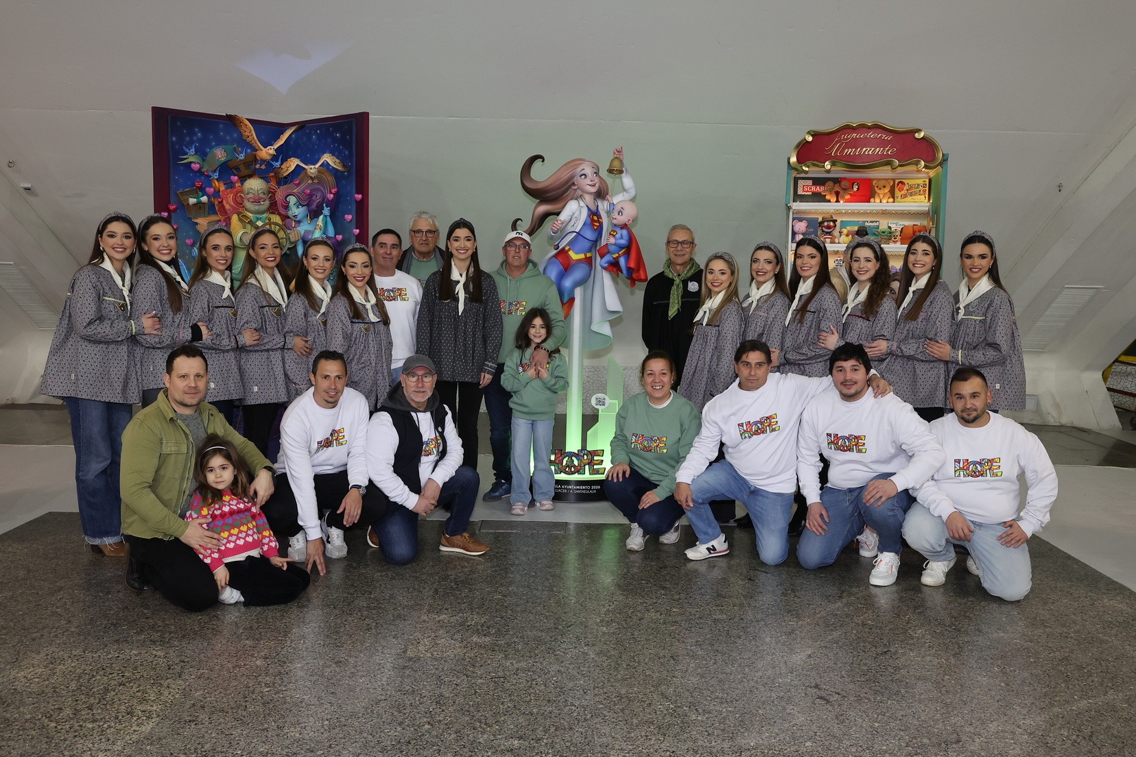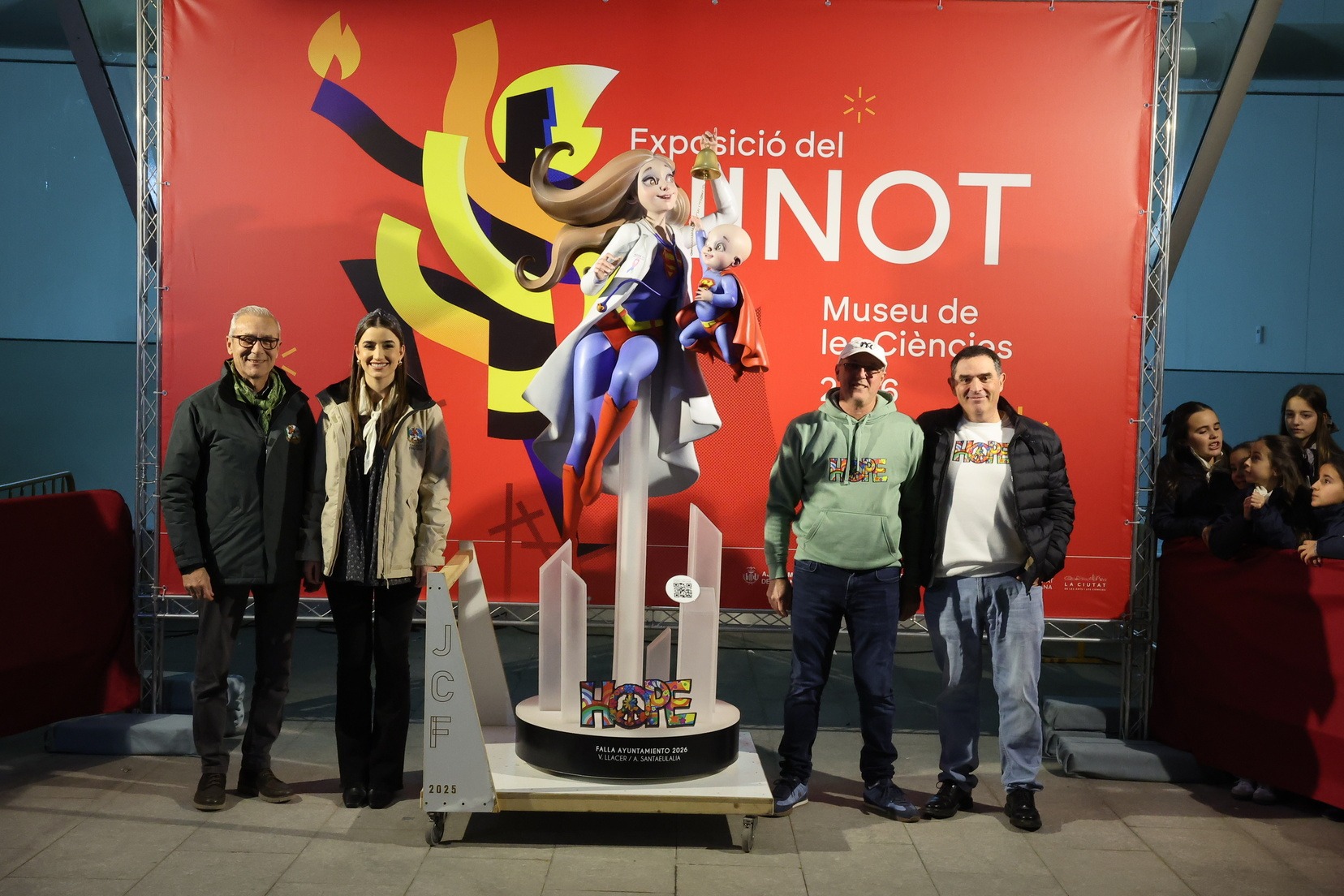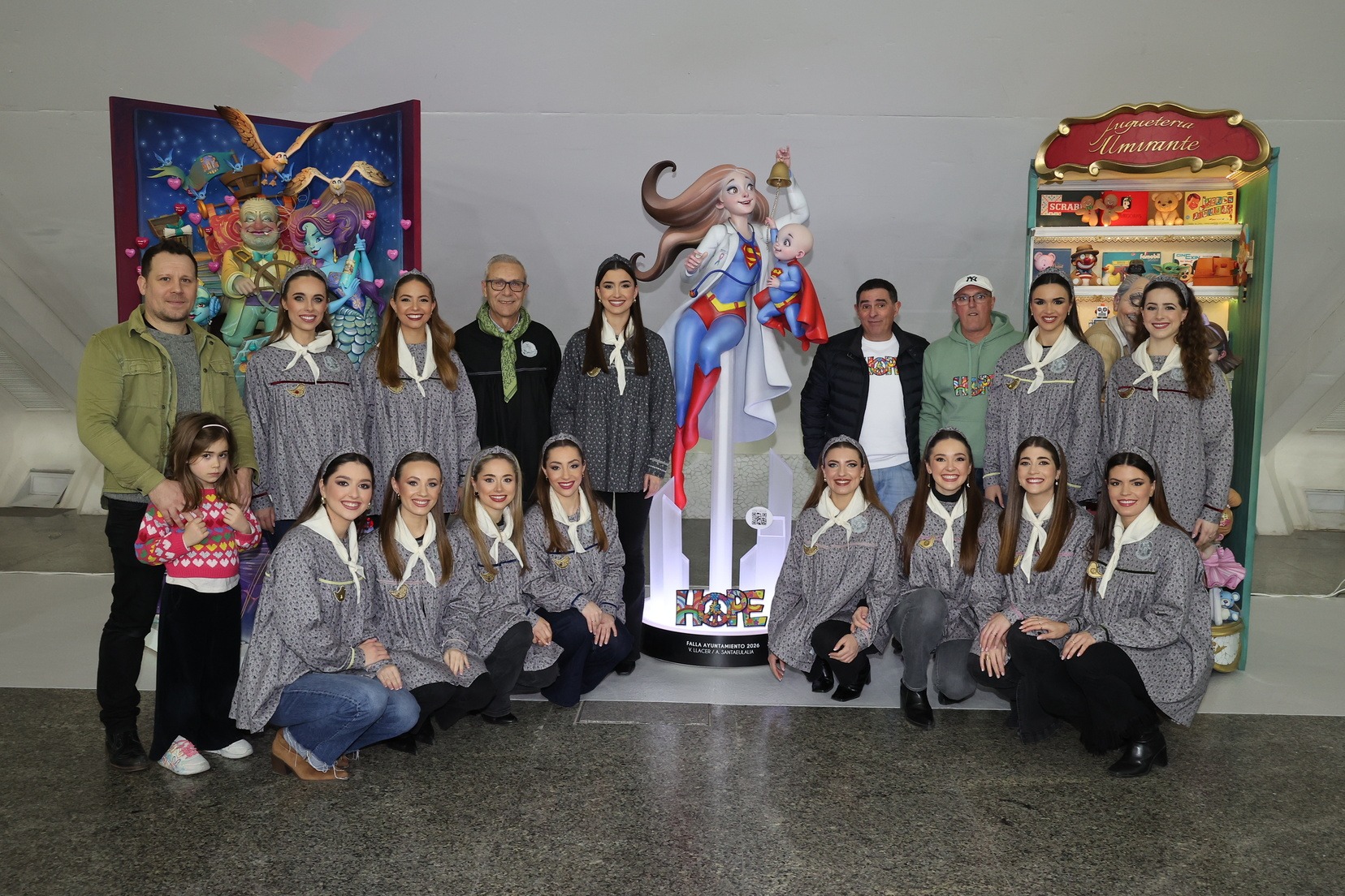 Por su parte, el ninot de la falla municipal grande —bajo el mismo lema de la falla, “Hope”— ha sido entregado por parte de los artistas Alejandro Santaeulalia y Vicente Llácer, que firman esta figura centrada en la lucha contra el cáncer infantil, representada por una profesional sanitaria con atuendo de superhéroe junto a un niño que simboliza la esperanza y la superación. Una pieza que ha cautivado a Carmen Prades y su Corte de Honor.