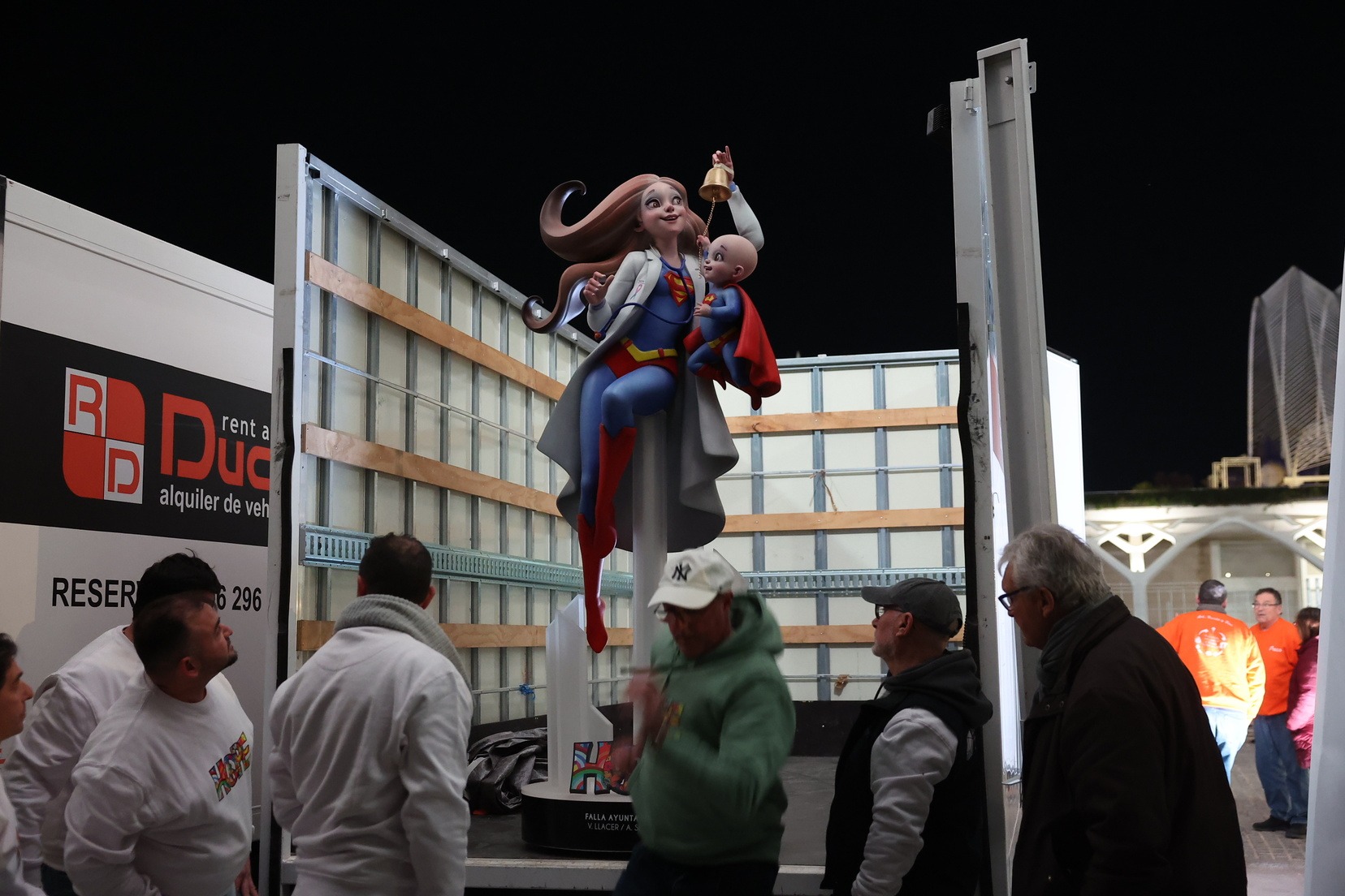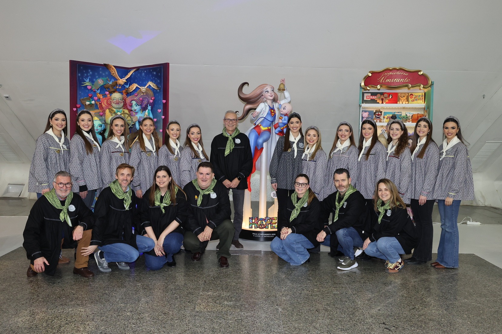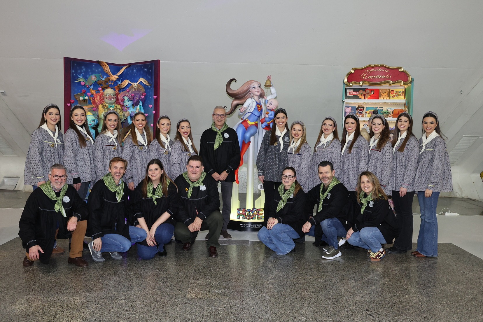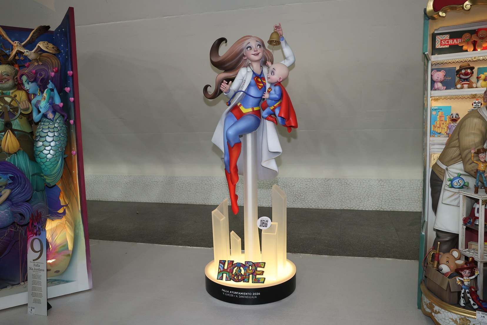 Por su parte, el ninot de la falla municipal grande —bajo el mismo lema de la falla, “Hope”— ha sido entregado por parte de los artistas Alejandro Santaeulalia y Vicente Llácer, que firman esta figura centrada en la lucha contra el cáncer infantil, representada por una profesional sanitaria con atuendo de superhéroe junto a un niño que simboliza la esperanza y la superación. Una pieza que ha cautivado a Carmen Prades y su Corte de Honor.