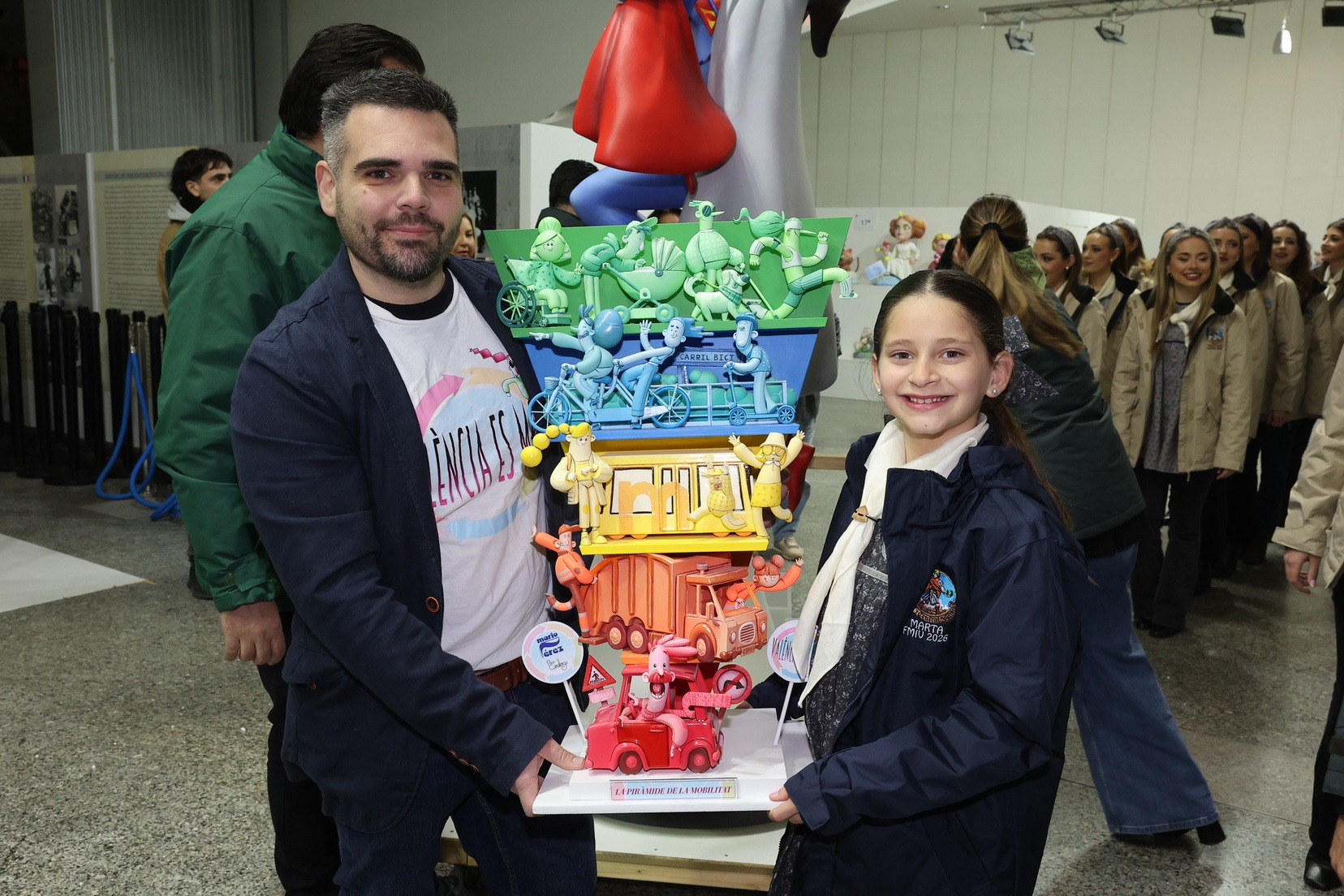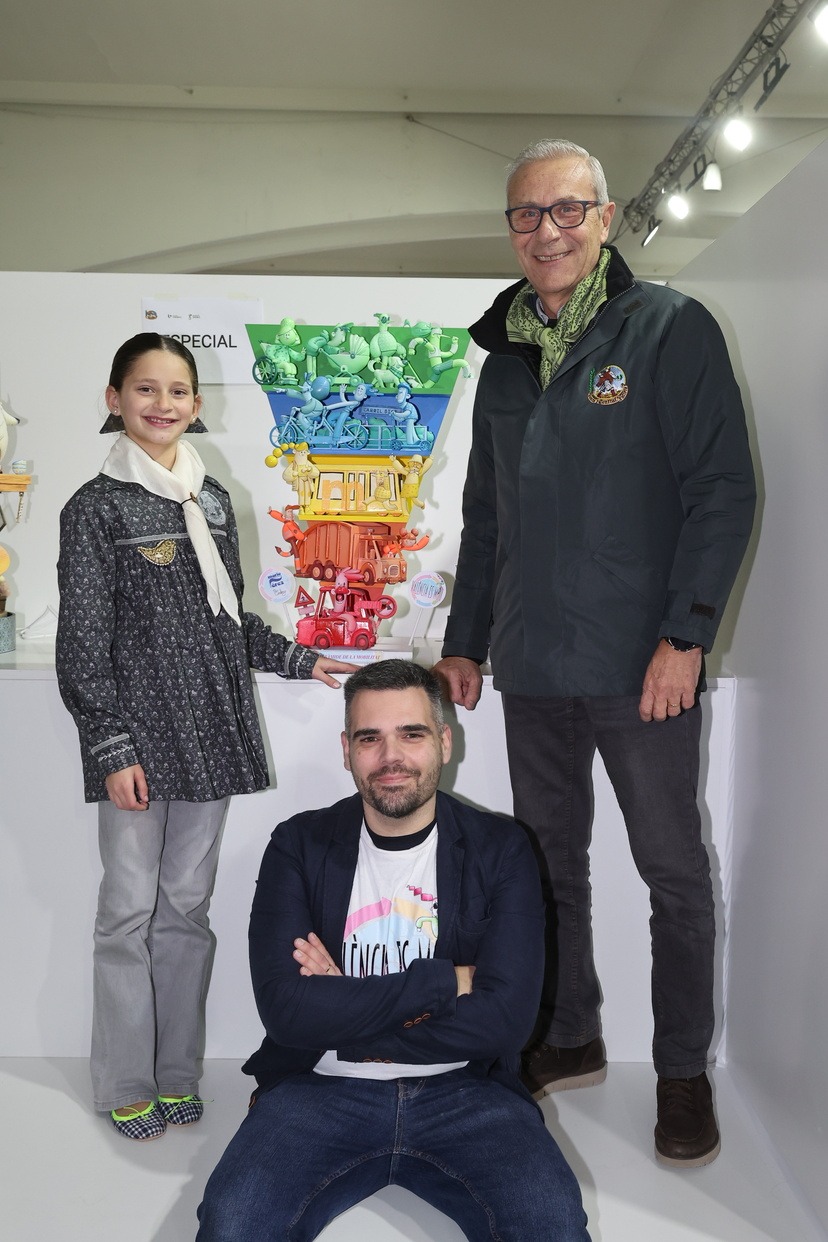 El ninot de la falla municipal infantil, con el lema “La piràmide de la mobilitat’ y que pertenece a la falla ‘València es mou”, ha llegado al recinto de manos de su artista fallero, Mario Pérez. Allí le esperaba Marta Mercader junto a su Corte de Honor para descubrir esta pieza que plantea una visión didáctica del transporte urbano y la movilidad de la ciudad.
