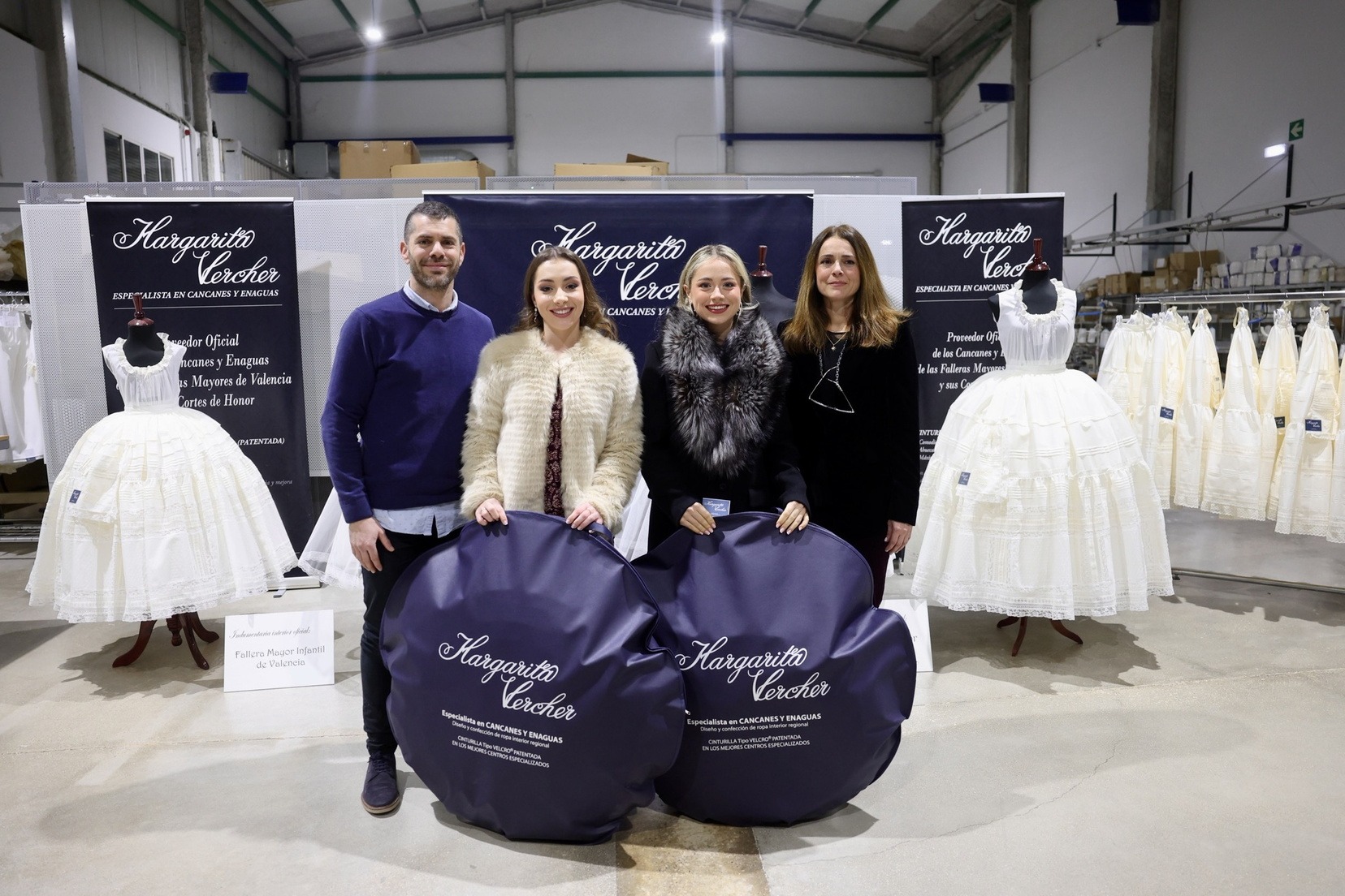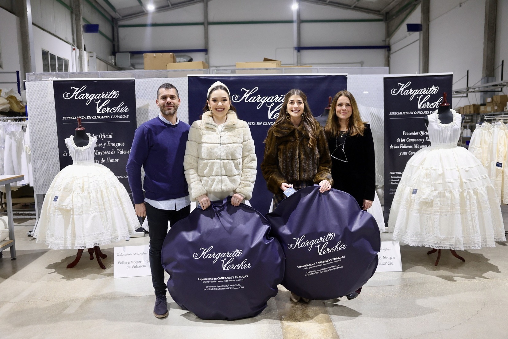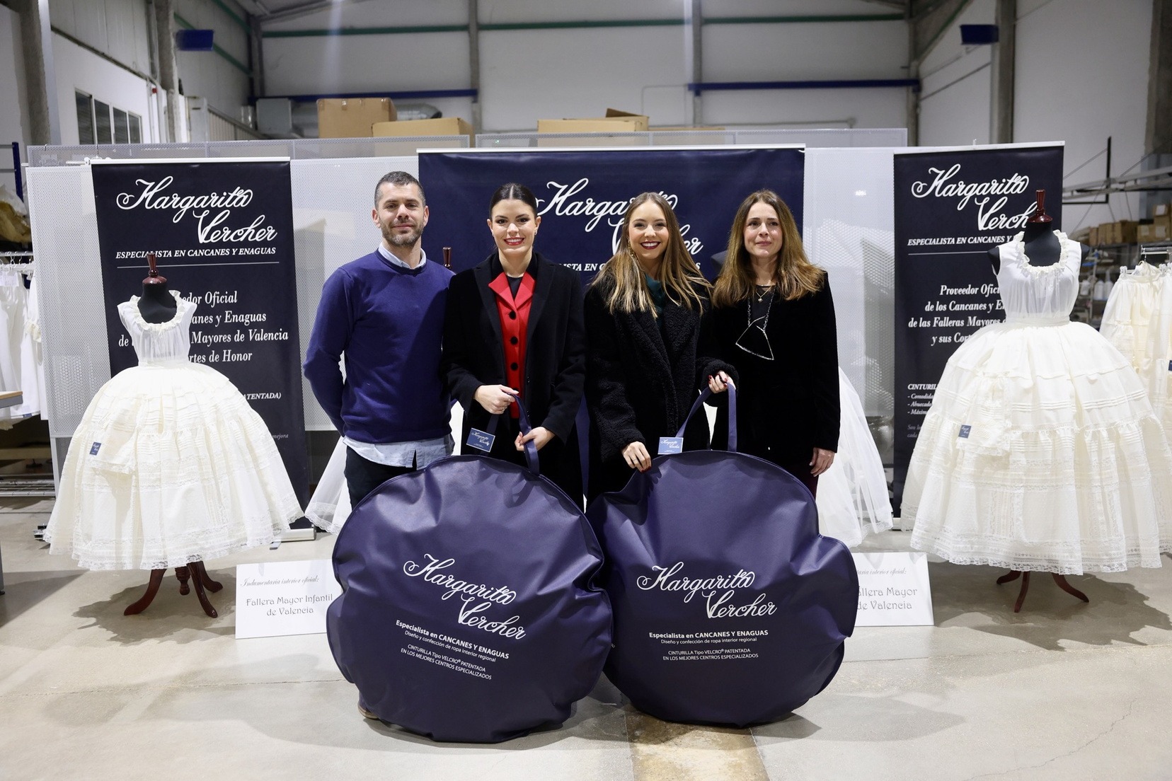 La firma Margarita Vercher ha realizado la entrega oficial de los cancanes del primer traje a las Falleras Mayores de Valencia, Carmen y Marta, junto a sus Cortes de Honor, en un acto que ha supuesto un paso fundamental en la preparación de la indumentaria que lucirán a lo largo de su mandato.