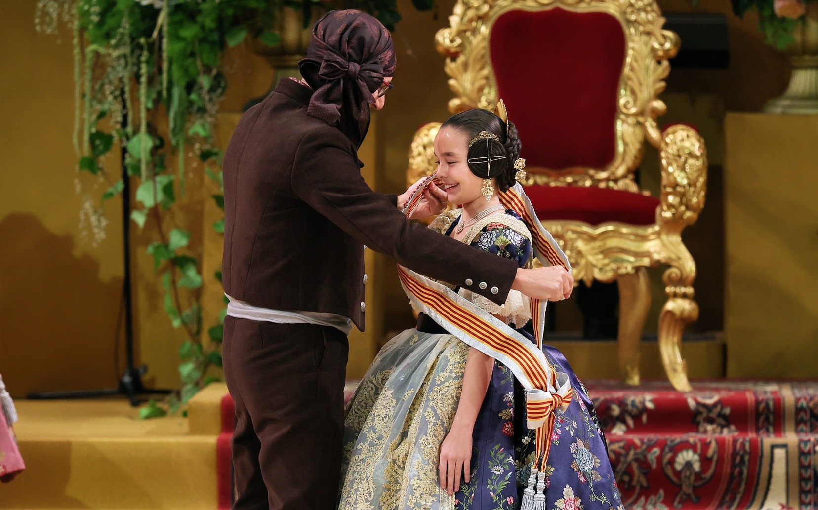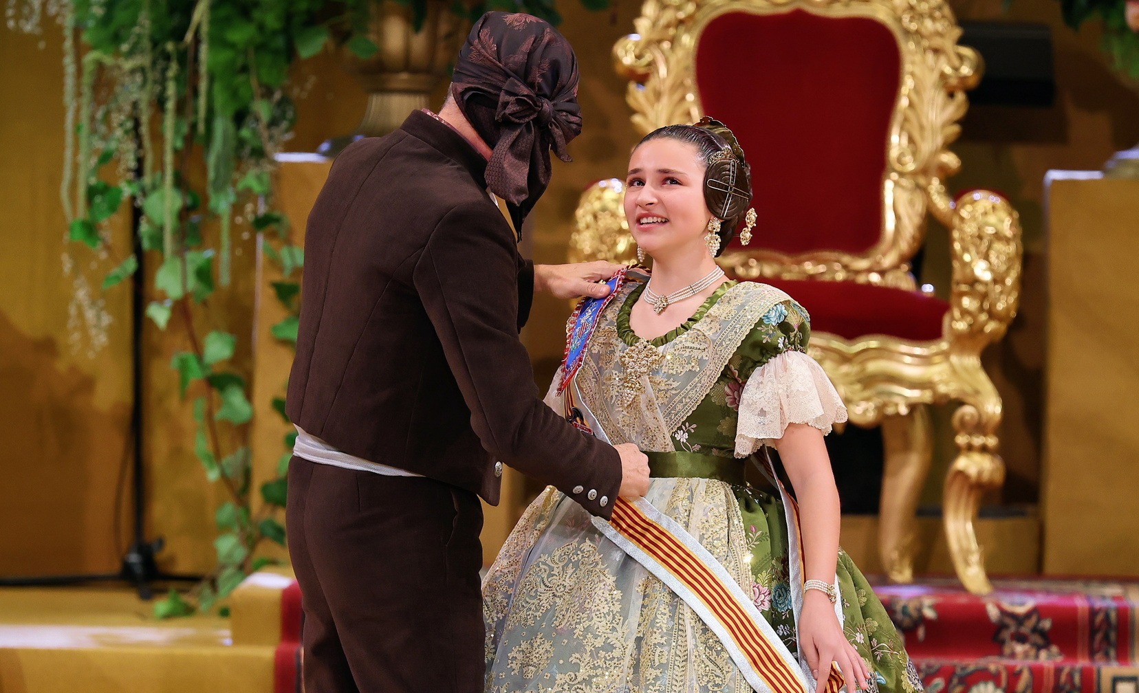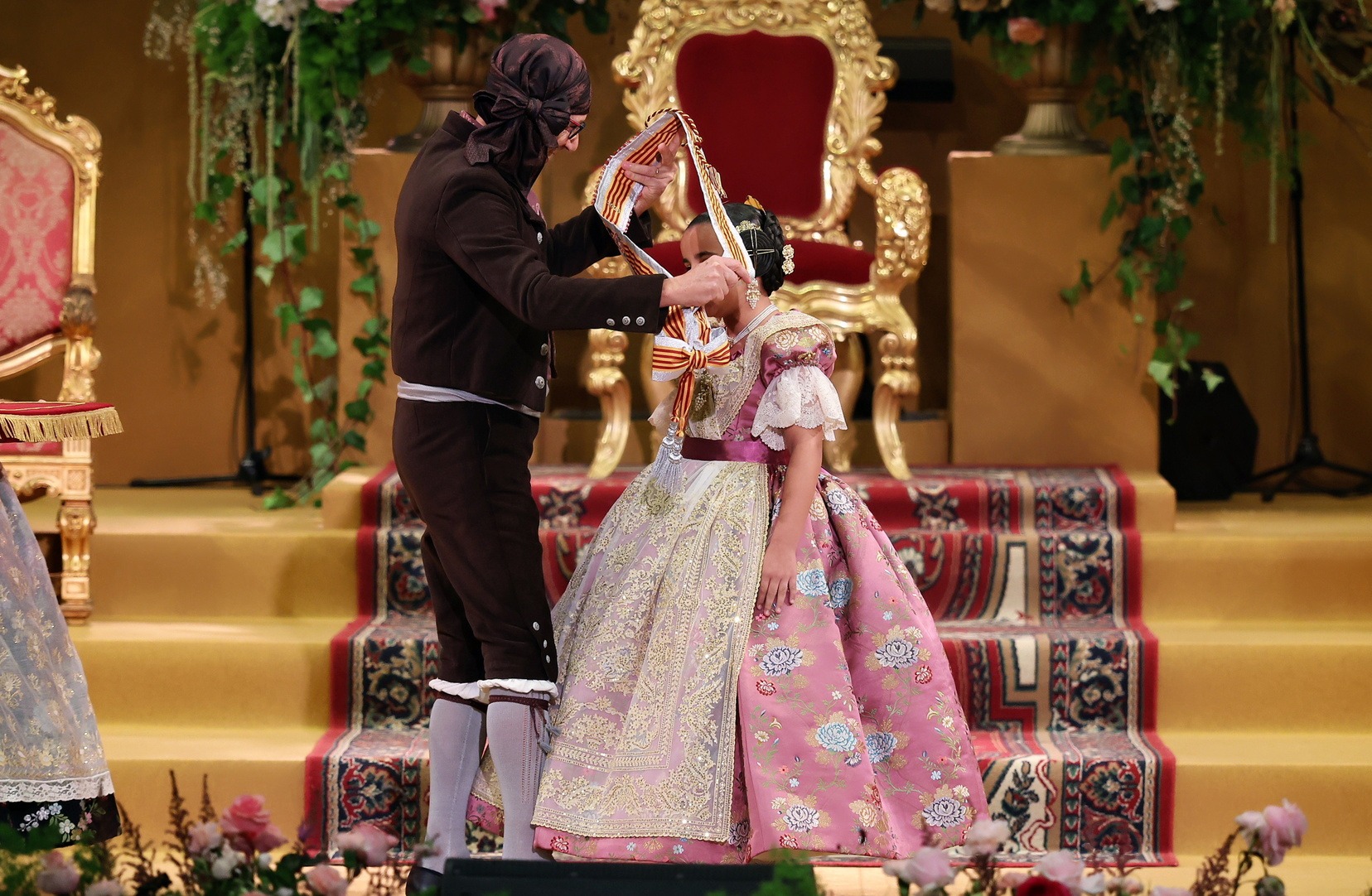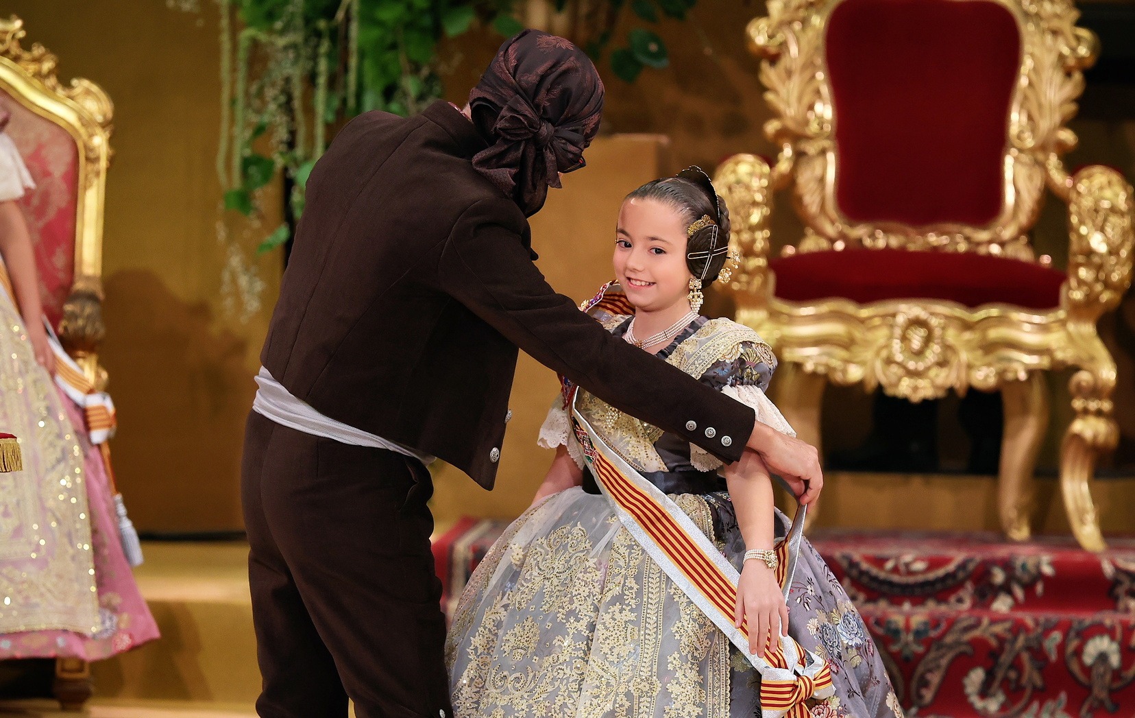 A l’escenari, el president de la Junta Central Fallera, Santiago Ballester, les esperava per col·locar-les la tan desitjada banda i la joia que les reconeix oficialment com a integrants de la Cort d’Honor de la Fallera Major Infantil de València.