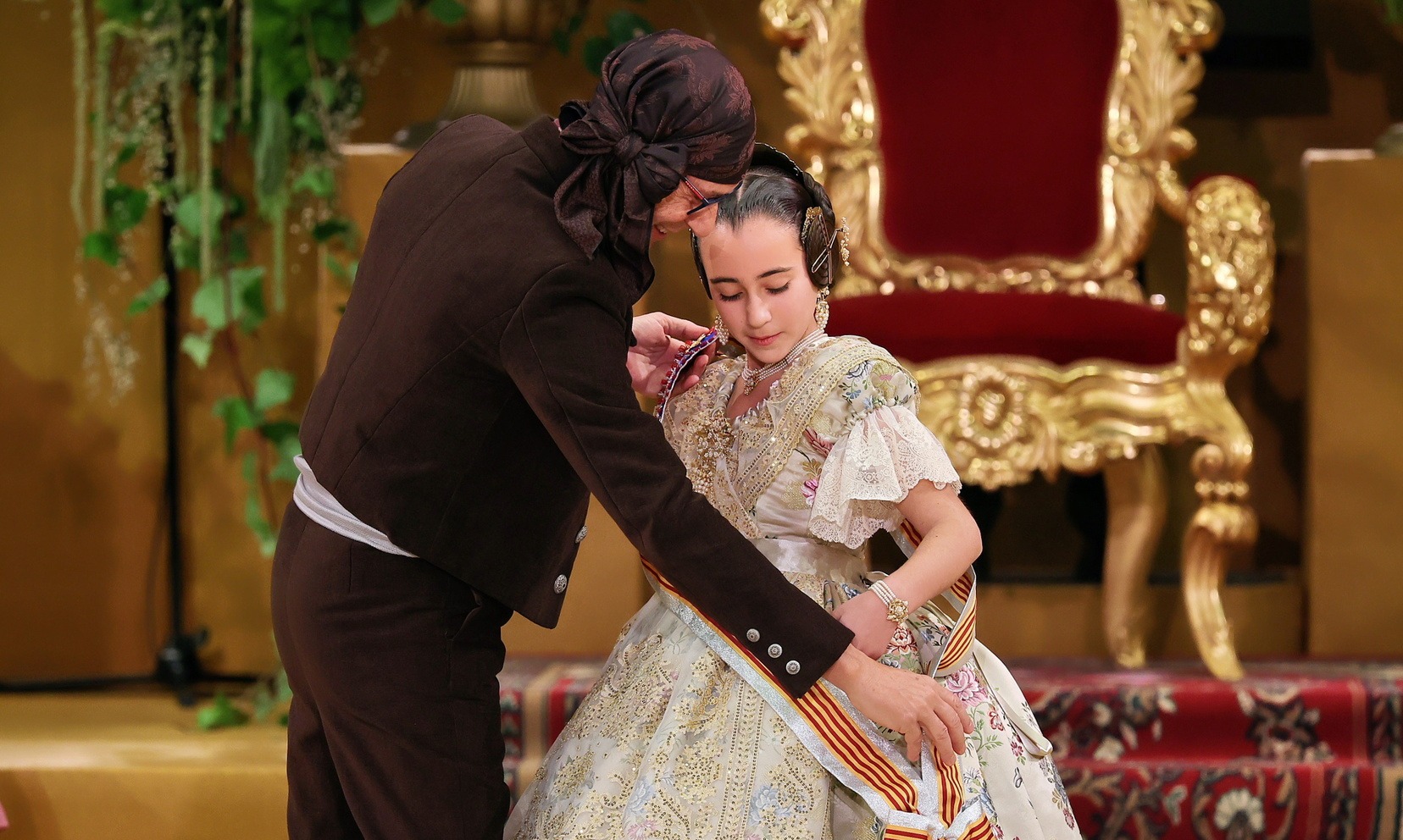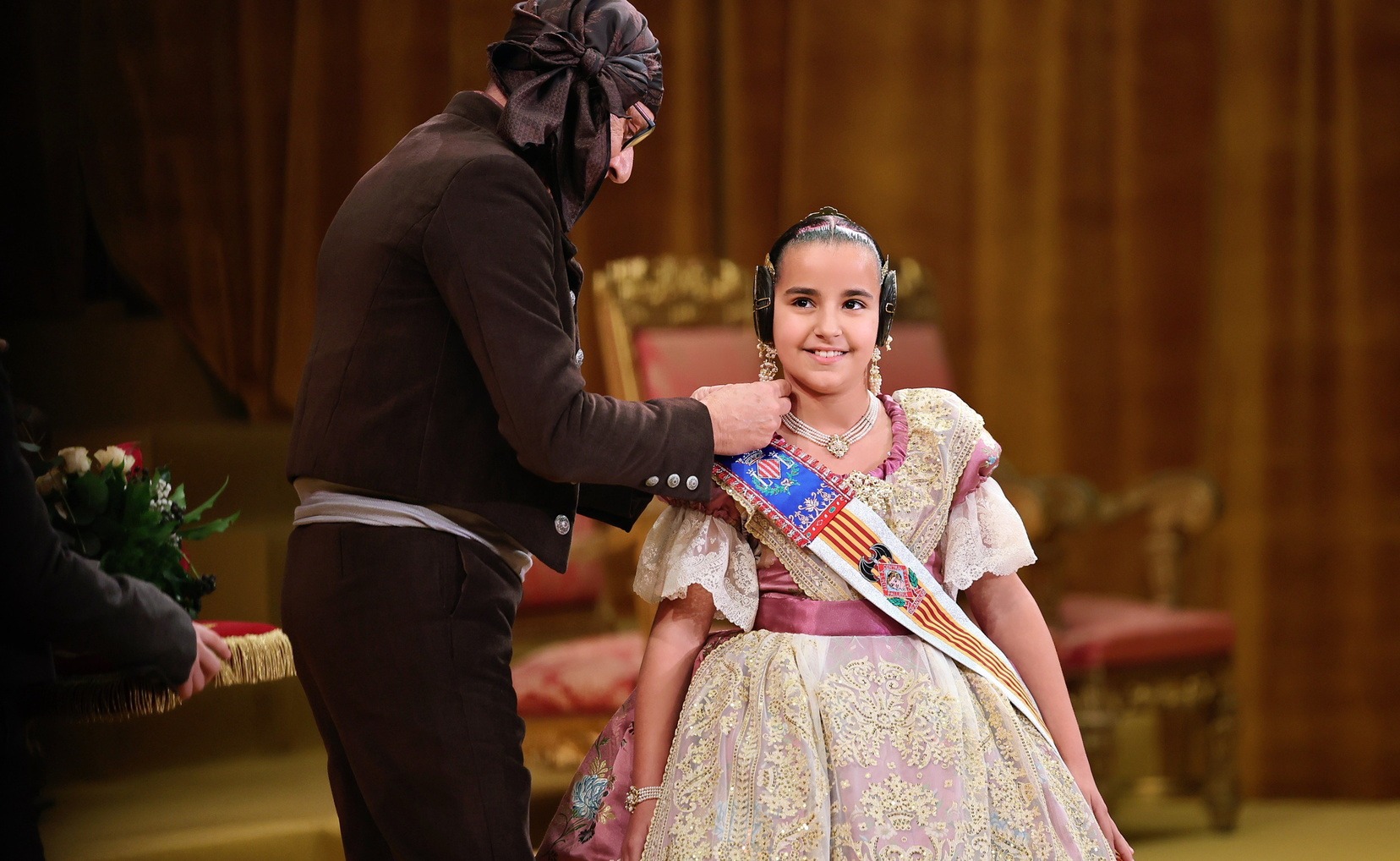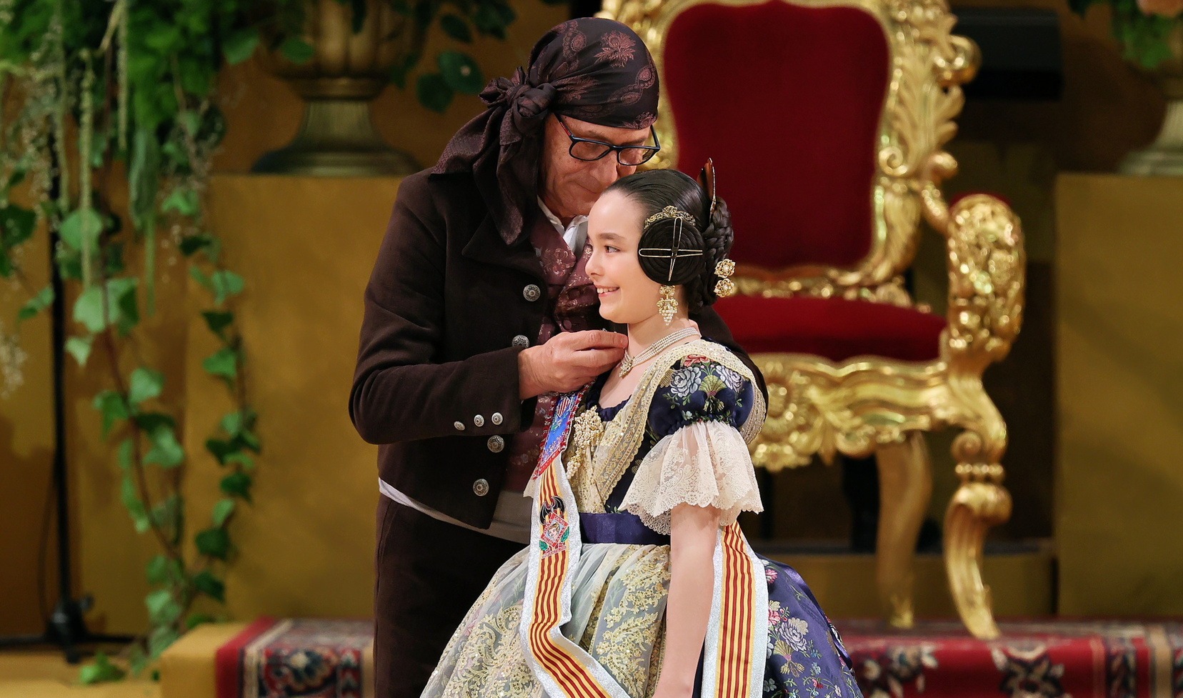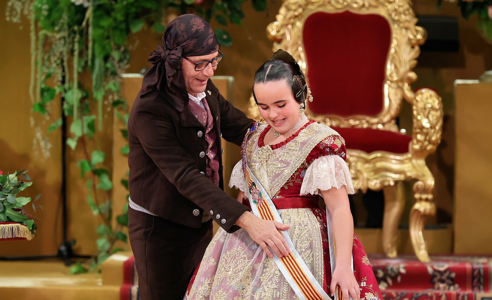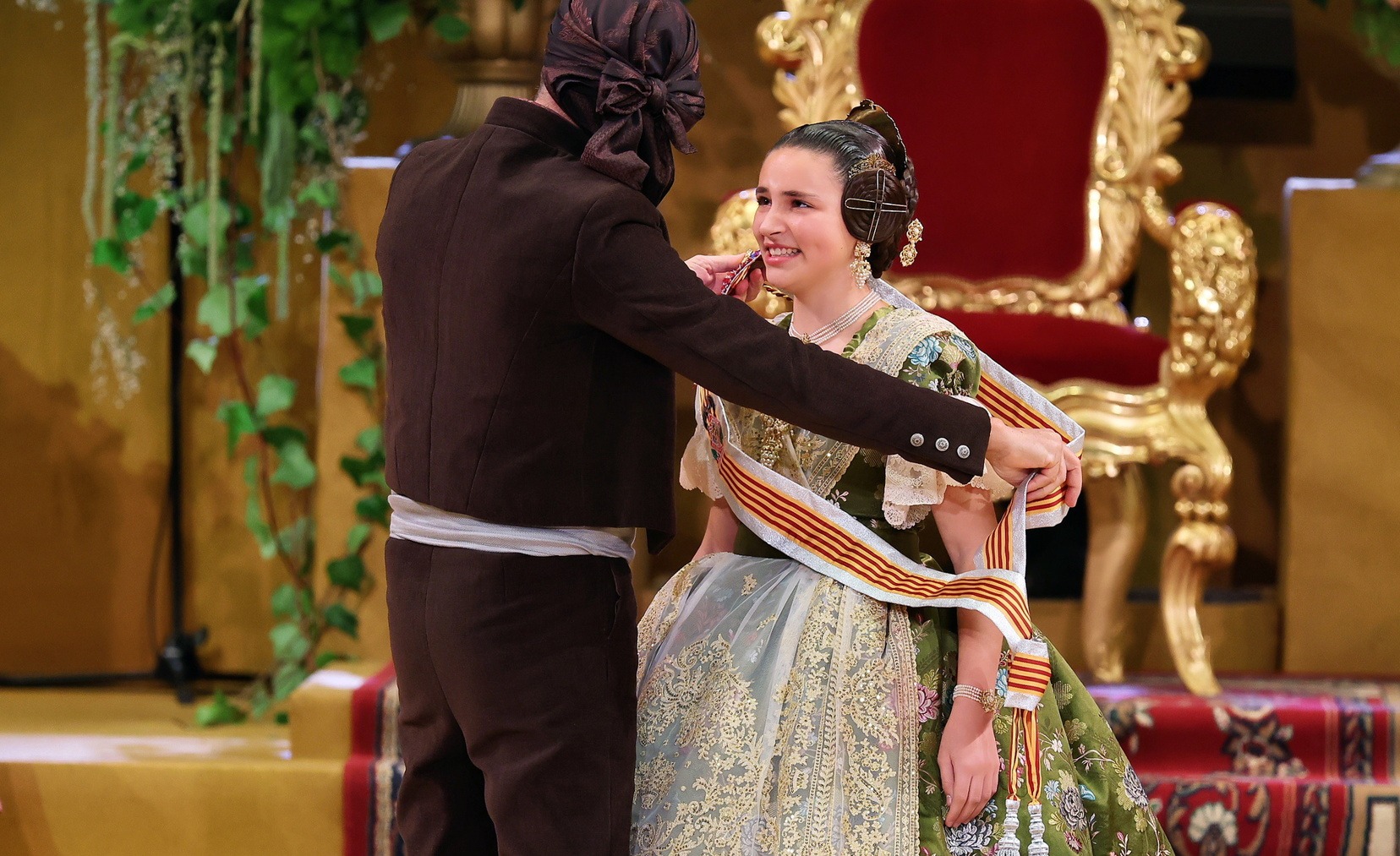 A l’escenari, el president de la Junta Central Fallera, Santiago Ballester, les esperava per col·locar-les la tan desitjada banda i la joia que les reconeix oficialment com a integrants de la Cort d’Honor de la Fallera Major Infantil de València.
