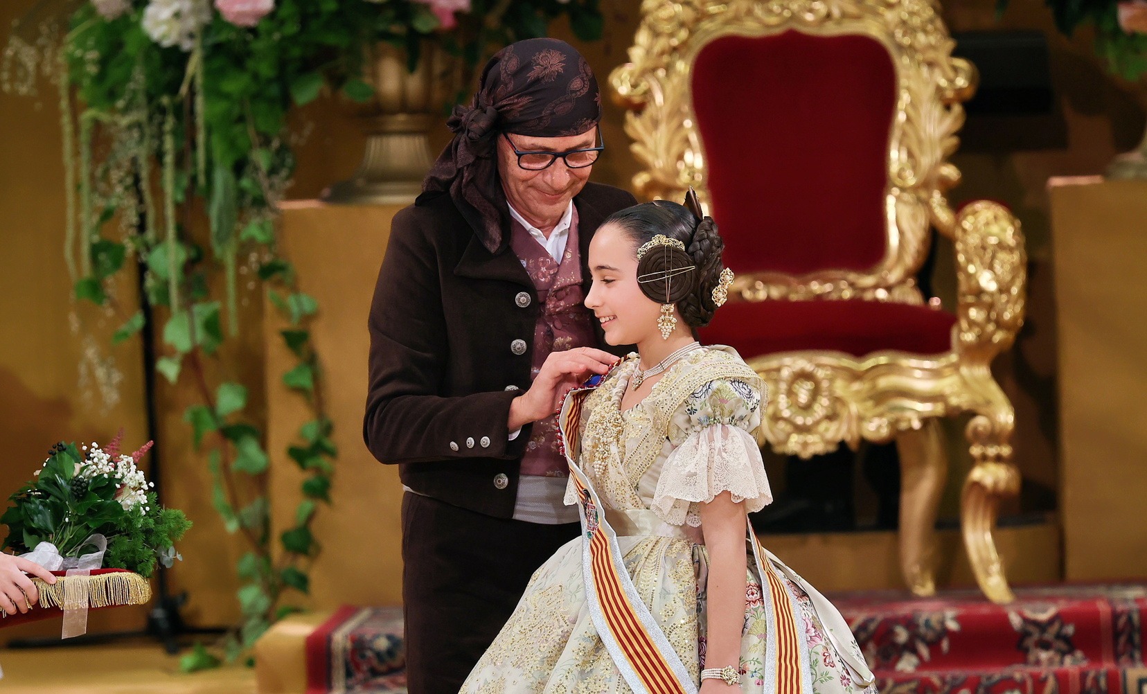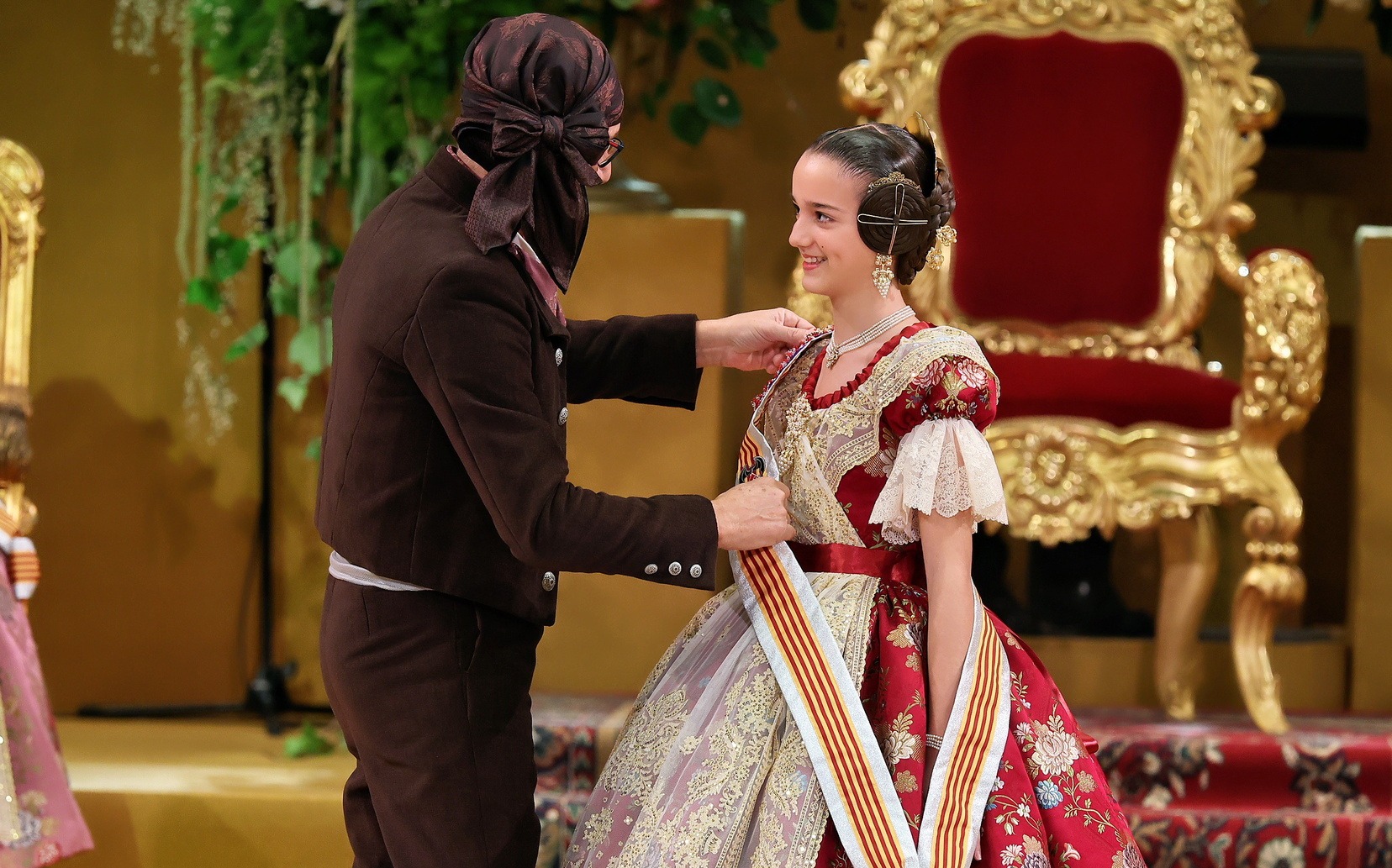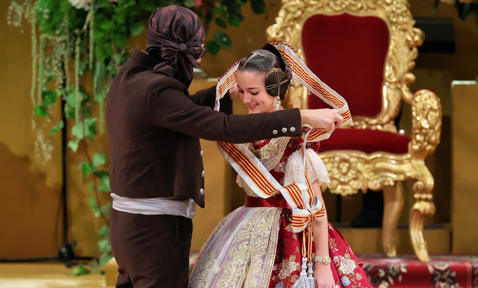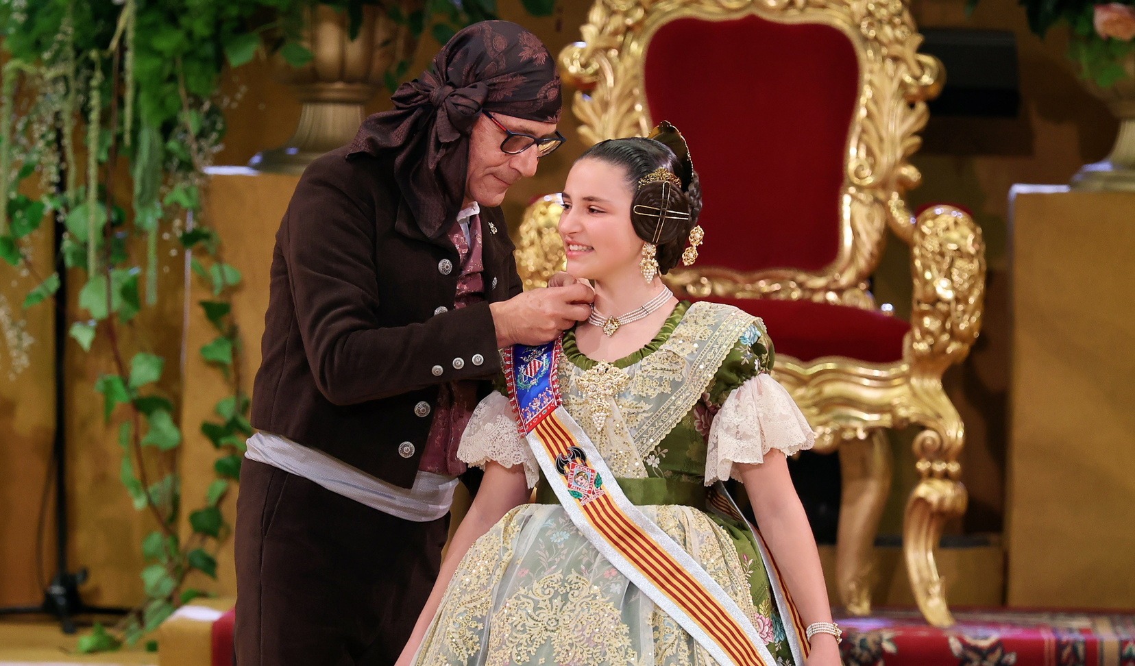 A l’escenari, el president de la Junta Central Fallera, Santiago Ballester, les esperava per col·locar-les la tan desitjada banda i la joia que les reconeix oficialment com a integrants de la Cort d’Honor de la Fallera Major Infantil de València.