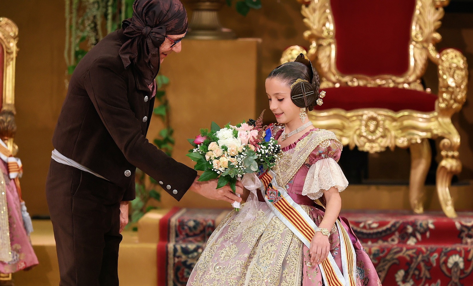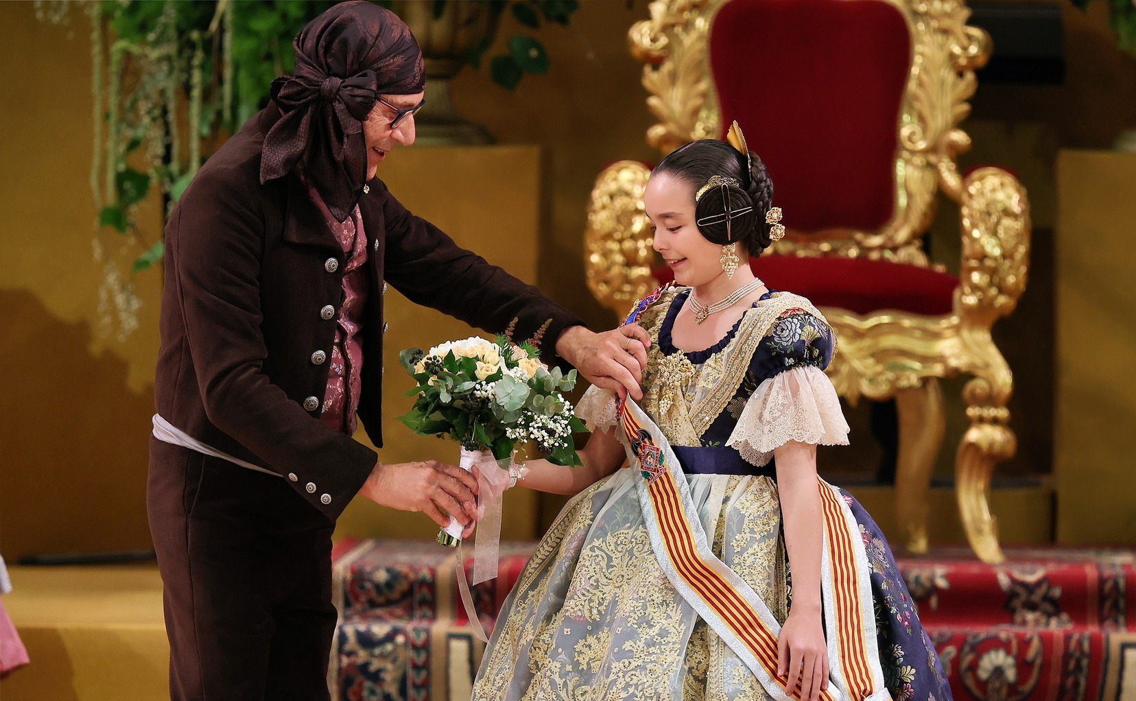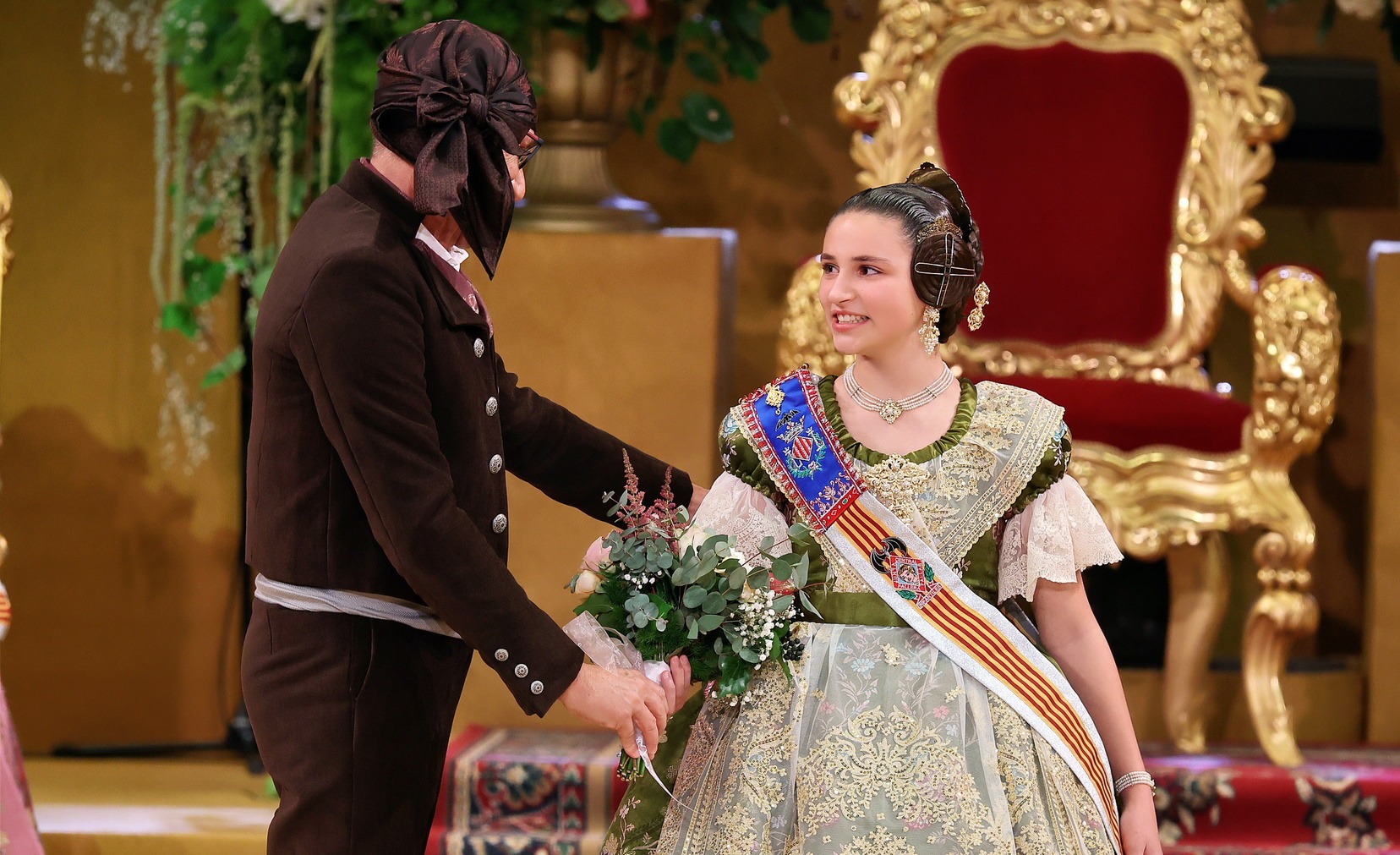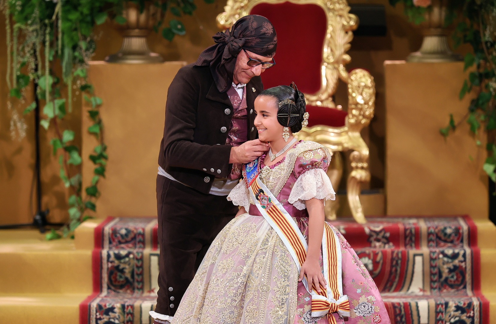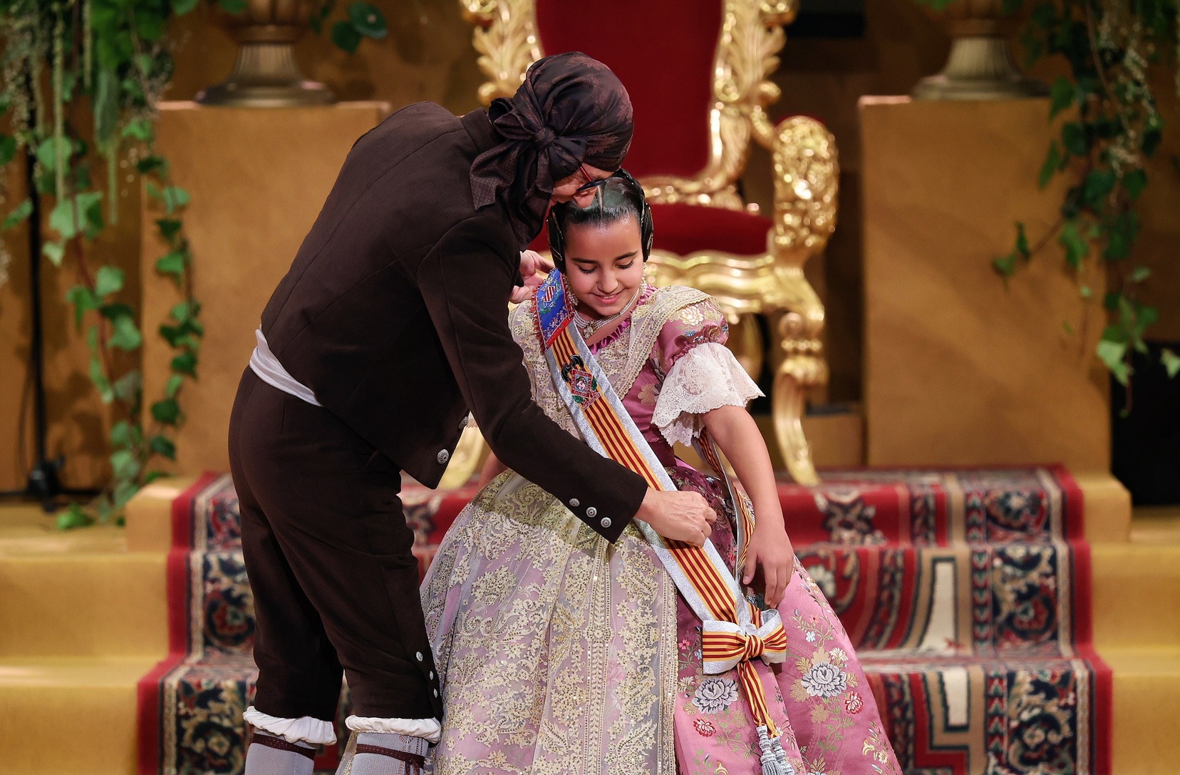 A l’escenari, el president de la Junta Central Fallera, Santiago Ballester, les esperava per col·locar-les la tan desitjada banda i la joia que les reconeix oficialment com a integrants de la Cort d’Honor de la Fallera Major Infantil de València.