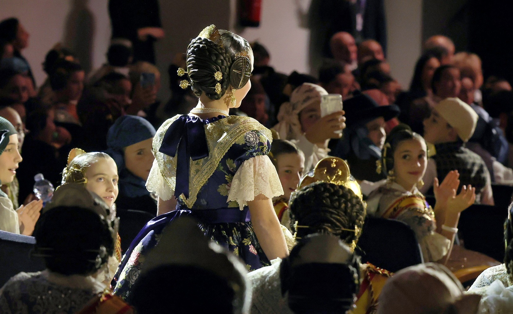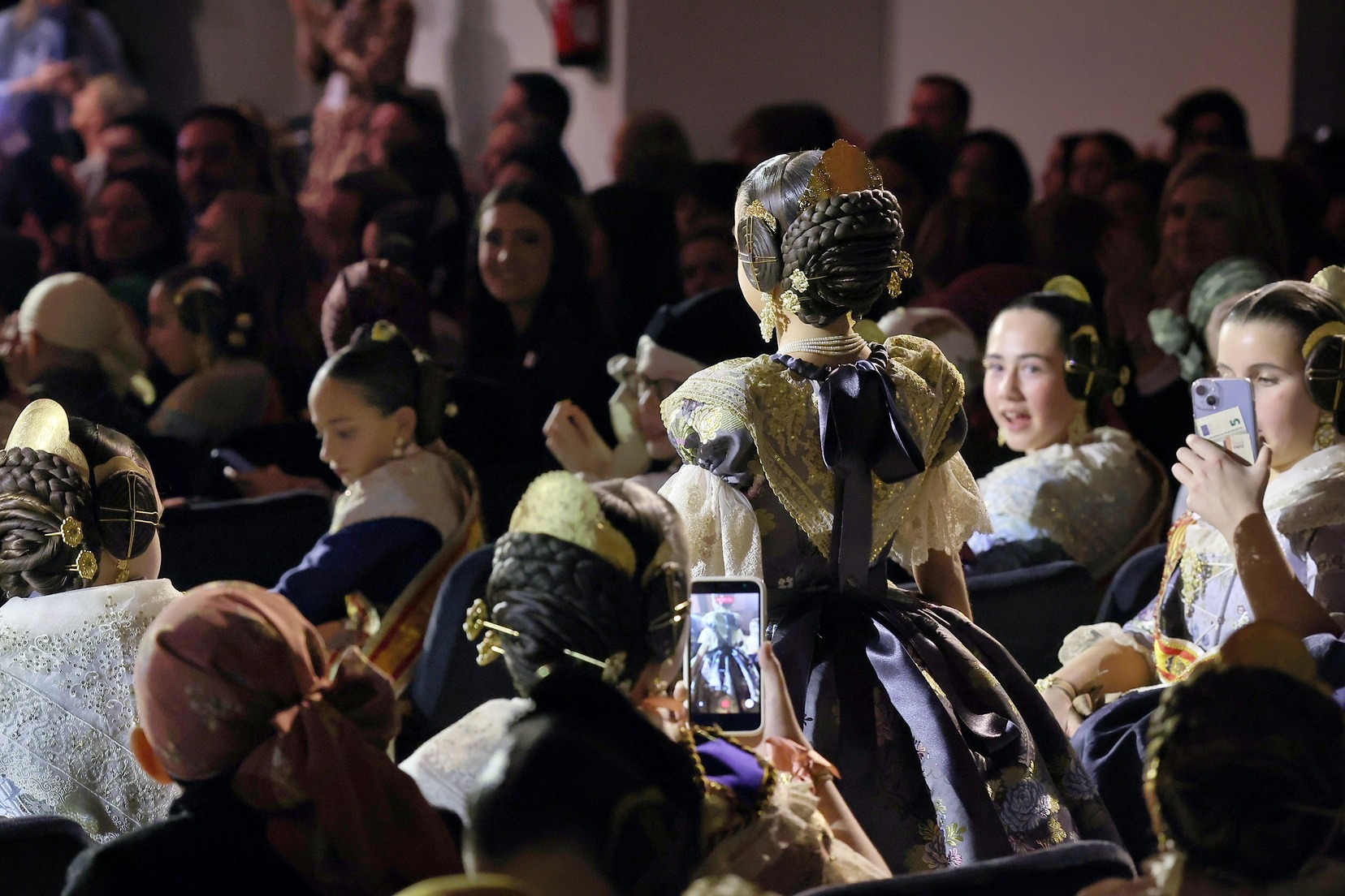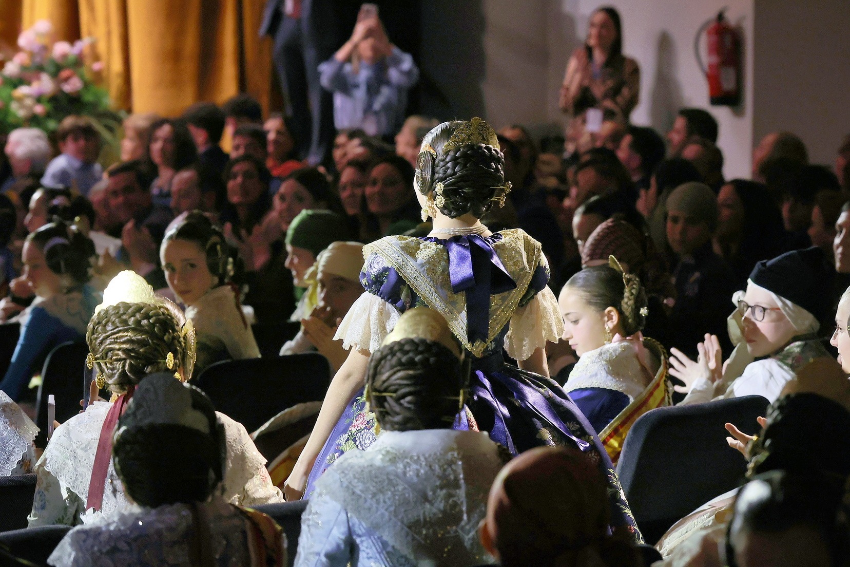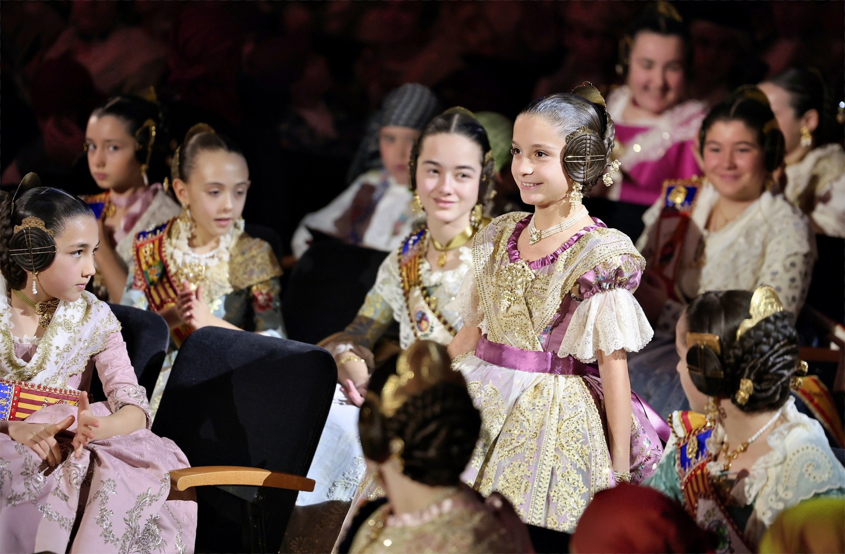 Amb els seus primers vestits oficials, les dotze xiquetes han desfilat amb il·lusió pels corredors de la sala Iturbi del Palau de la Música mentre rebien els aplaudiments del món faller, familiars i amics que omplien l’ambient de la sala, celebrant un dels actes més significatius en el seu recorregut dins de la festa fallera.