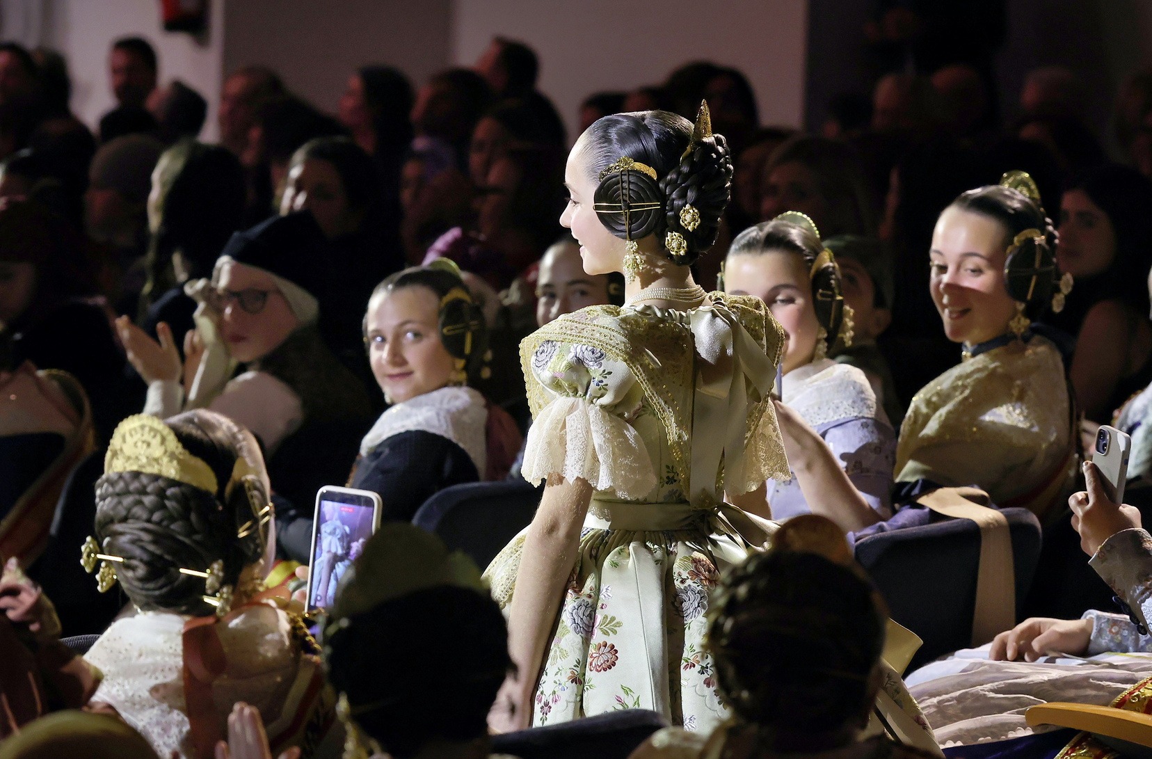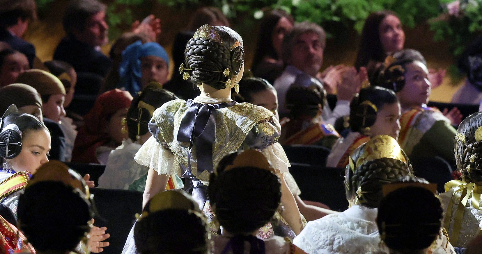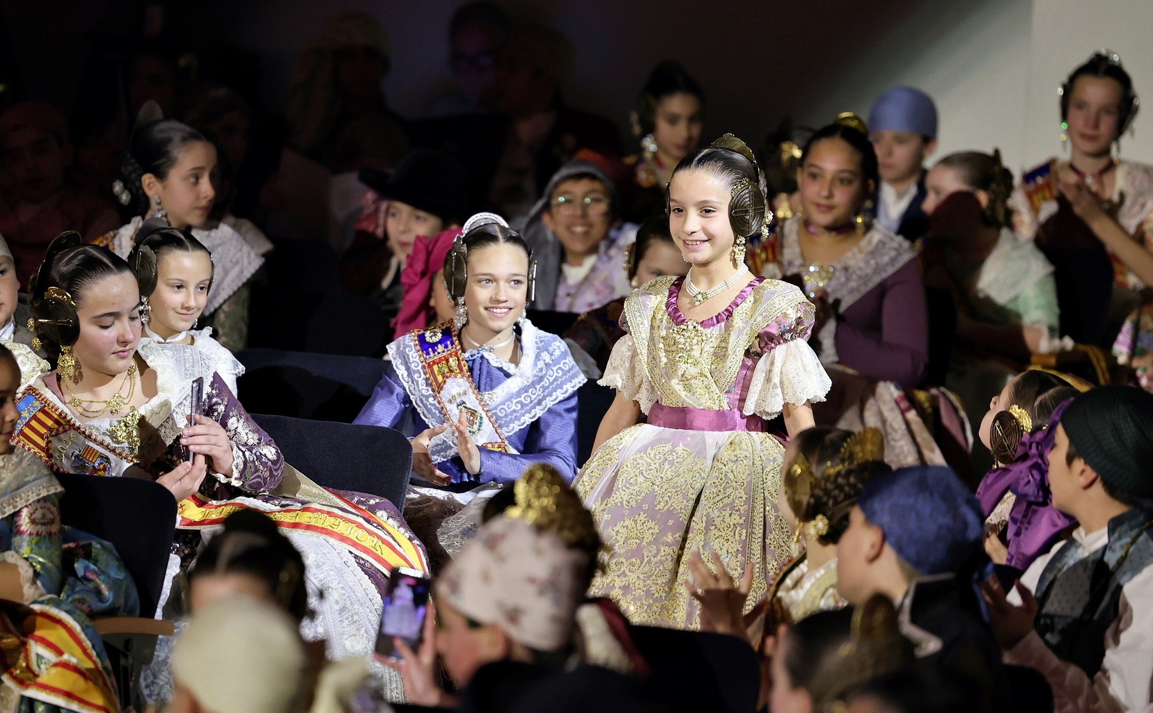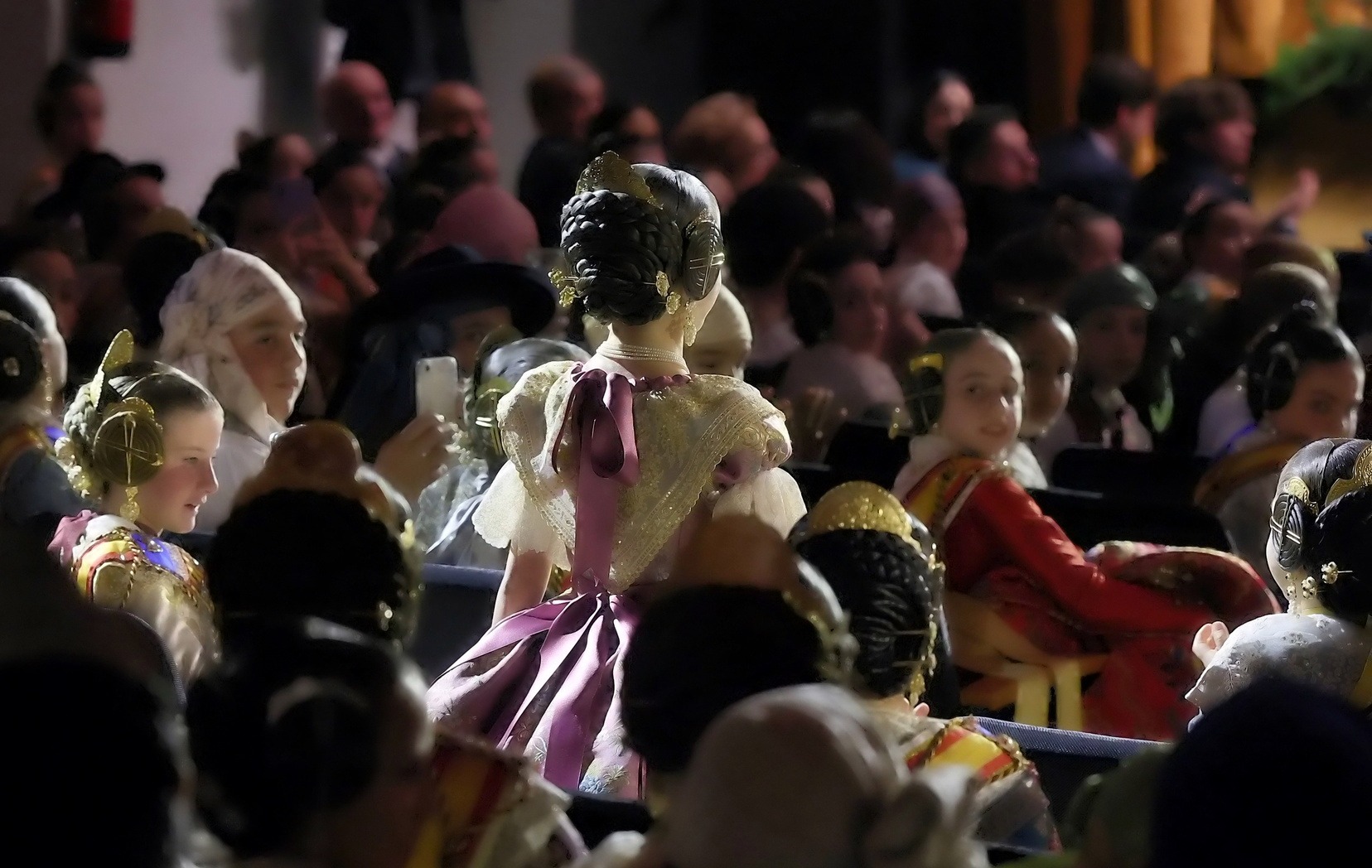 Amb els seus primers vestits oficials, les dotze xiquetes han desfilat amb il·lusió pels corredors de la sala Iturbi del Palau de la Música mentre rebien els aplaudiments del món faller, familiars i amics que omplien l’ambient de la sala, celebrant un dels actes més significatius en el seu recorregut dins de la festa fallera.