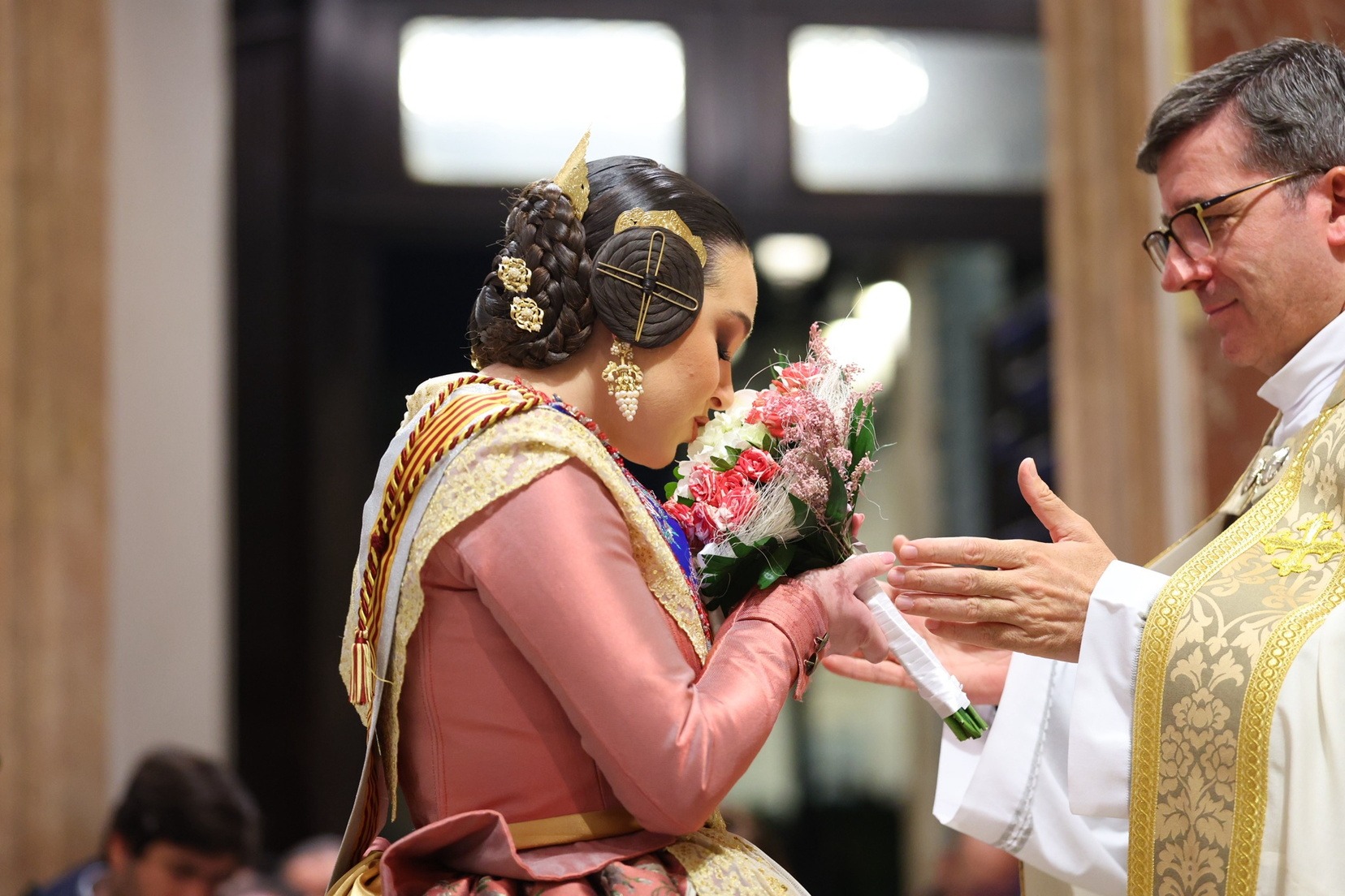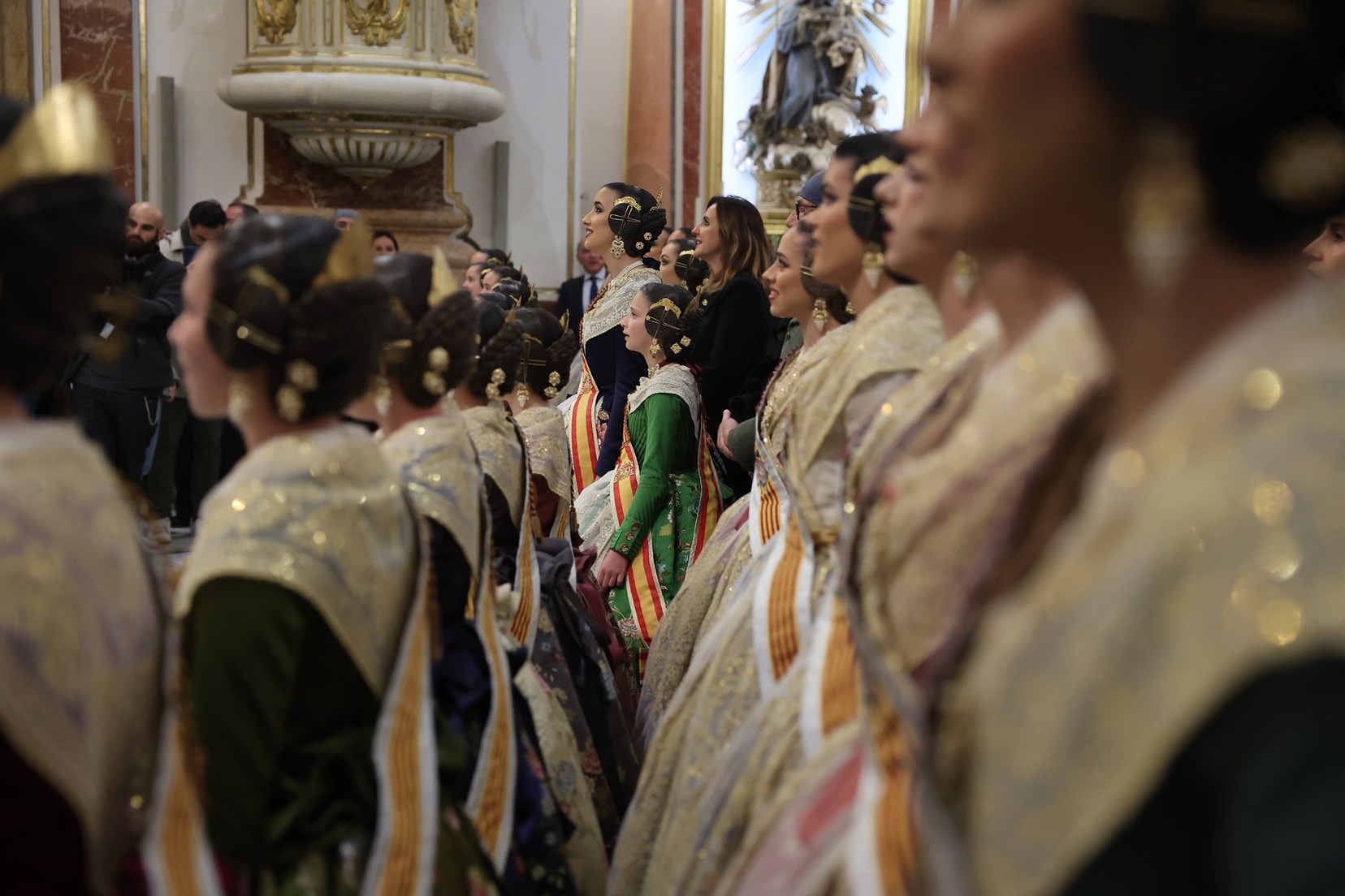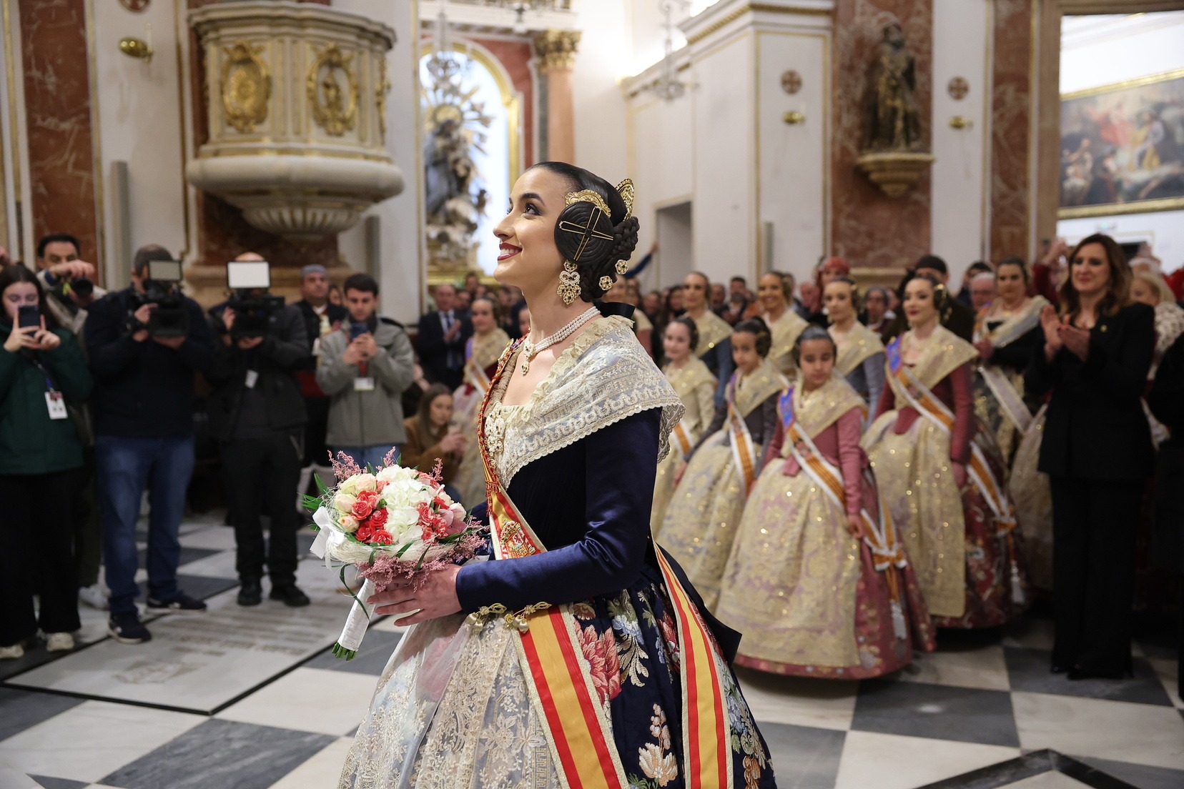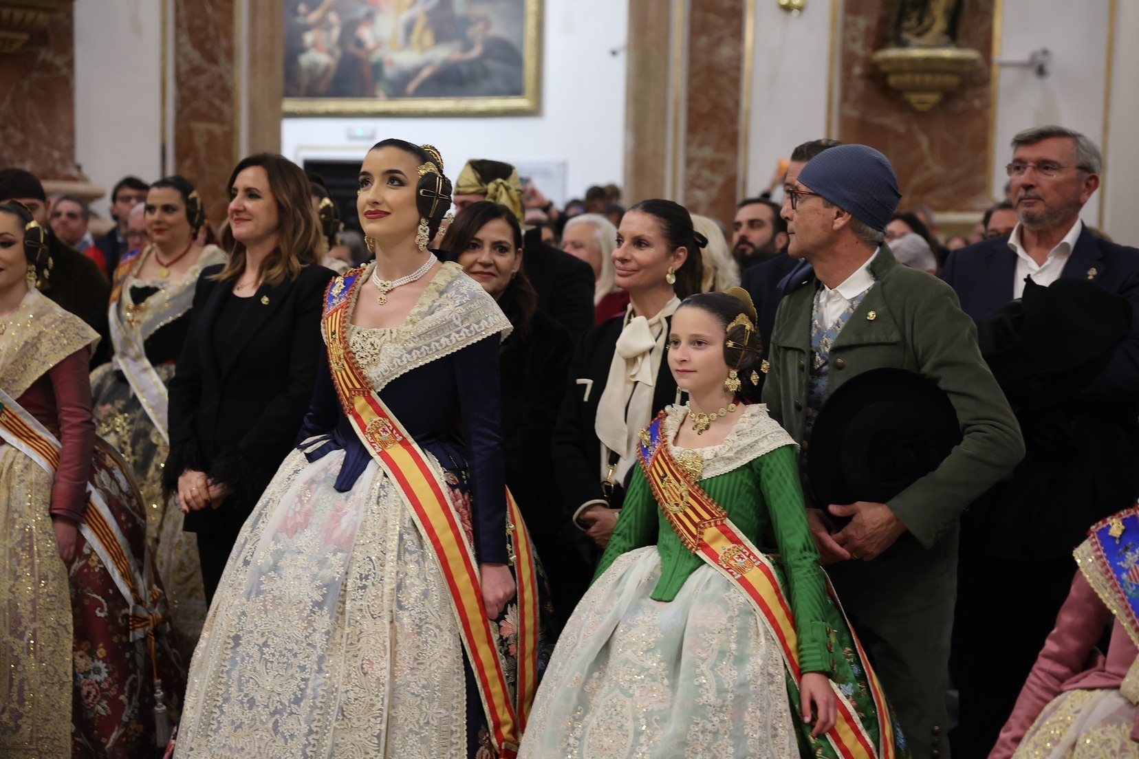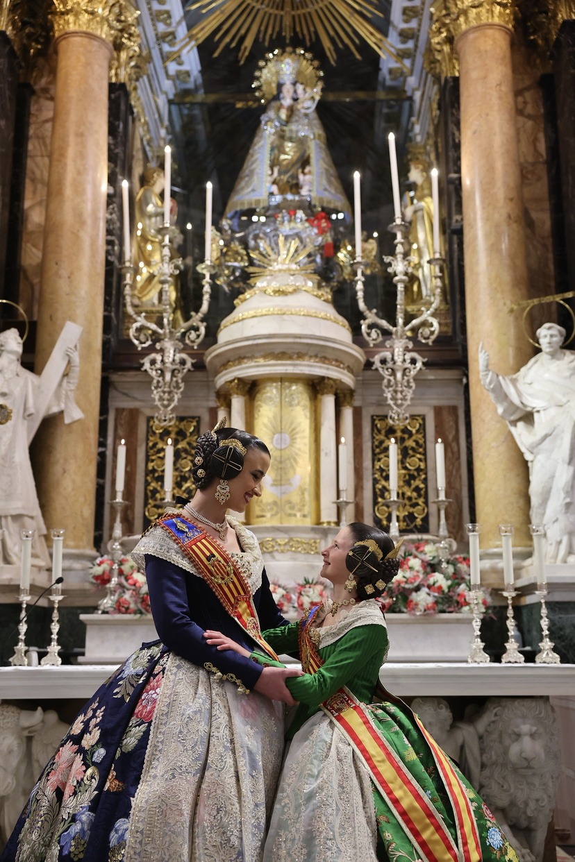 El diumenge de la Crida no podia acabar d’una altra manera. Després de l’esclat d’alegria als peus de les Torres dels Serrans, la ciutat ha buscat el recolliment i la devoció. Carmen Prades Gil i Marta Mercader Roig, Falleres Majors de València, han encapçalat la comitiva oficial que s’ha dirigit a la Reial Basílica de la Mare de Déu dels Desemparats per a oferir els seus rams a la Patrona.