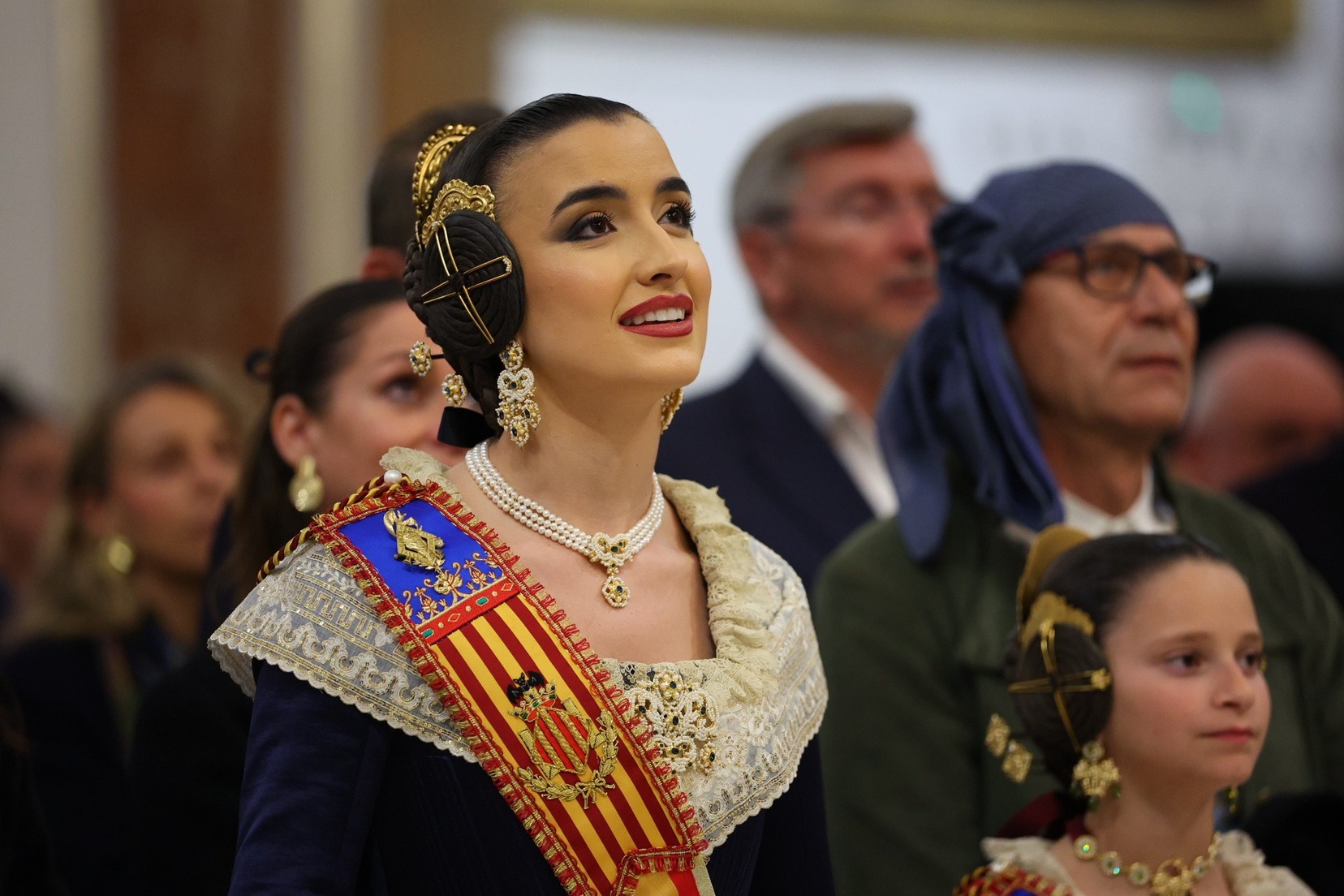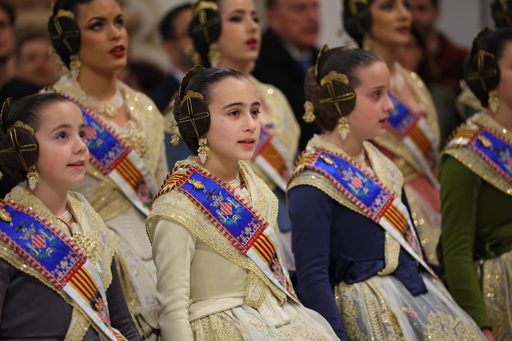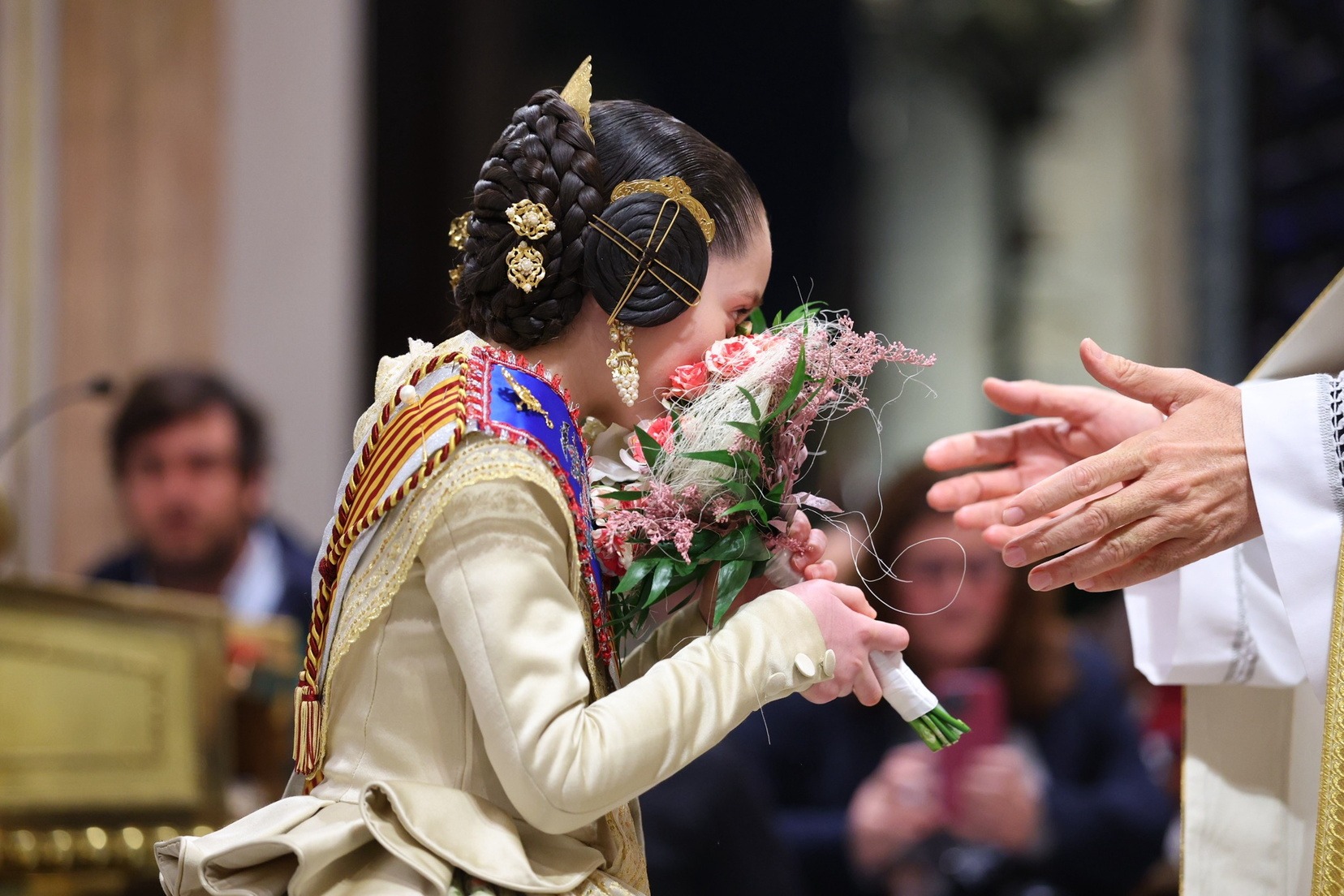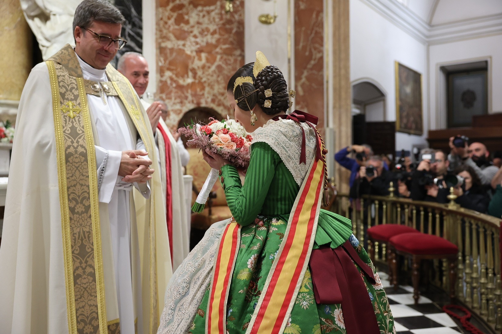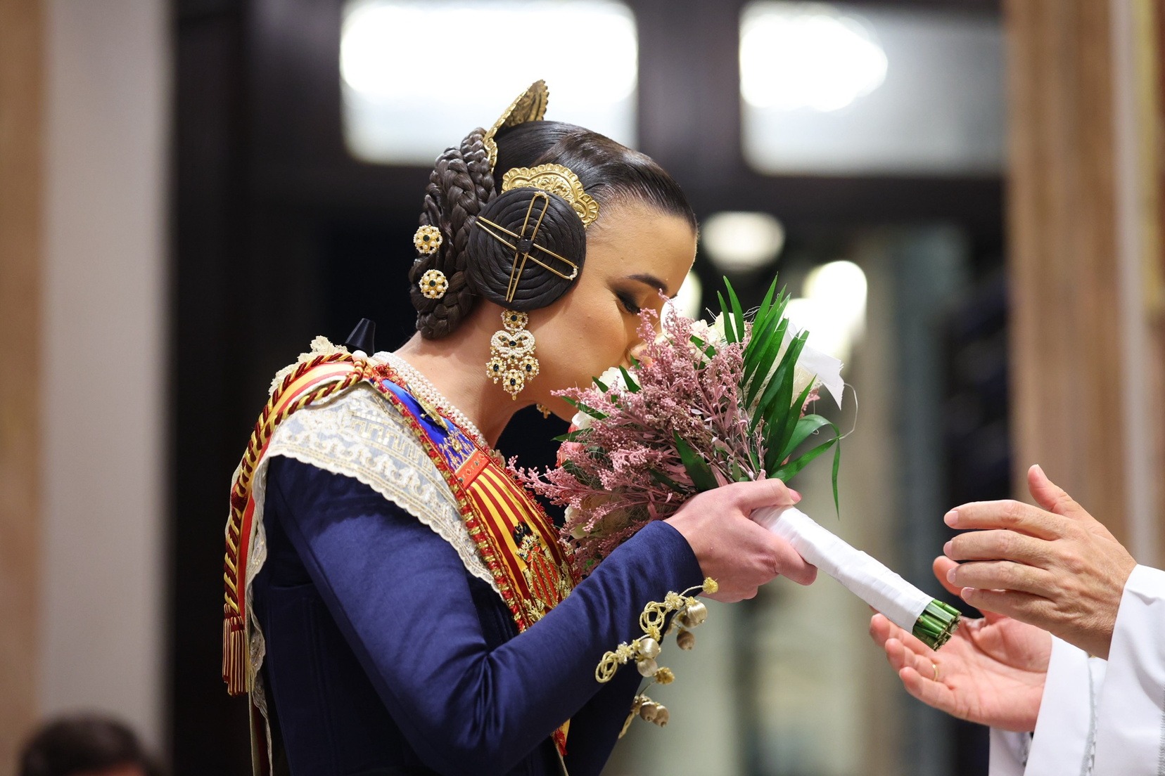 El diumenge de la Crida no podia acabar d’una altra manera. Després de l’esclat d’alegria als peus de les Torres dels Serrans, la ciutat ha buscat el recolliment i la devoció. Carmen Prades Gil i Marta Mercader Roig, Falleres Majors de València, han encapçalat la comitiva oficial que s’ha dirigit a la Reial Basílica de la Mare de Déu dels Desemparats per a oferir els seus rams a la Patrona.