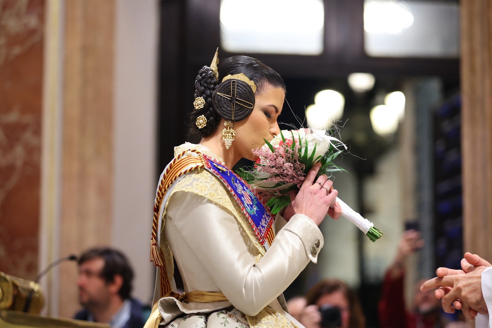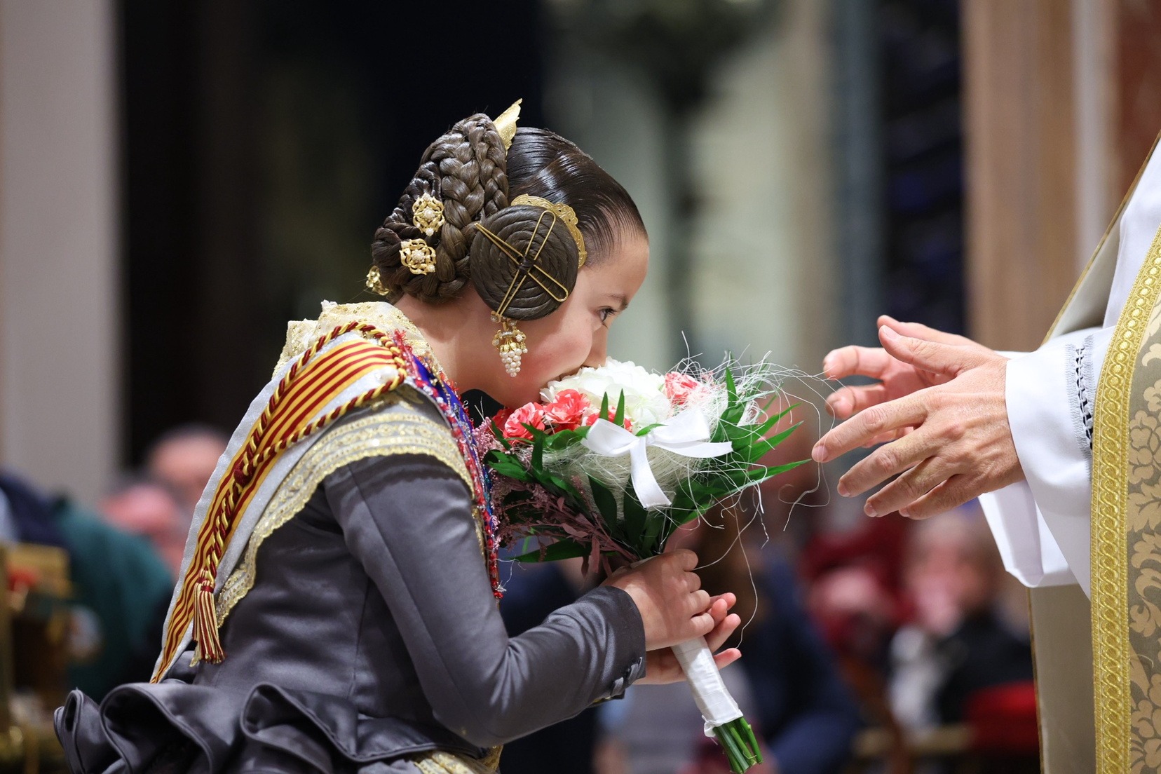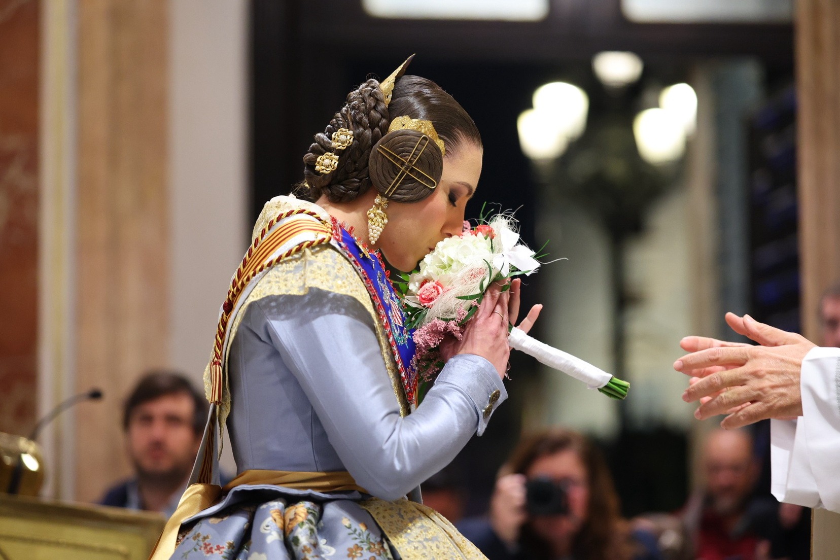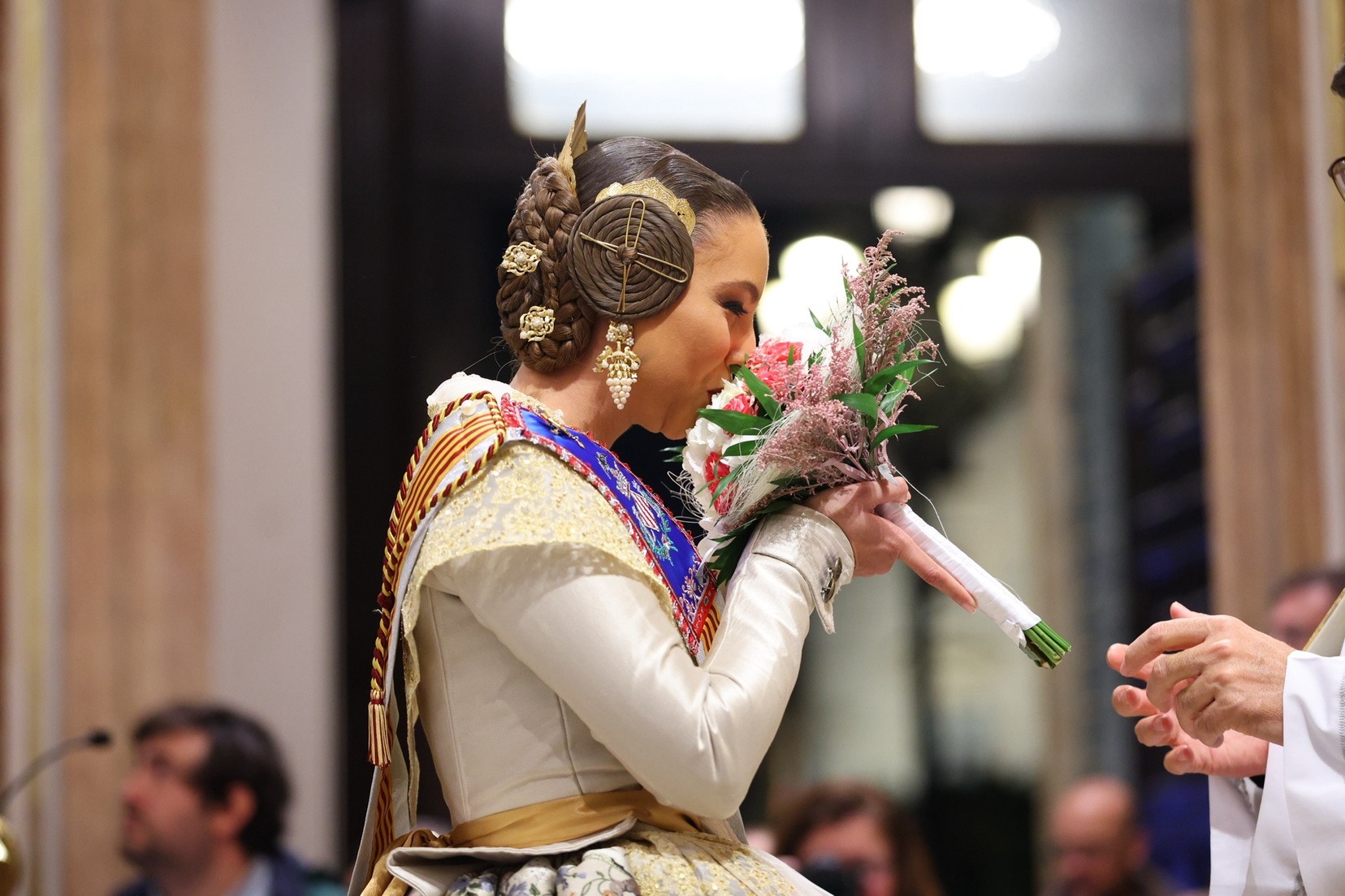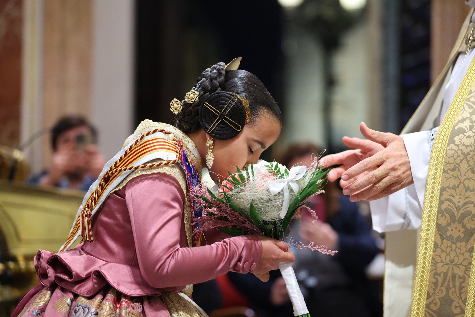 El diumenge de la Crida no podia acabar d’una altra manera. Després de l’esclat d’alegria als peus de les Torres dels Serrans, la ciutat ha buscat el recolliment i la devoció. Carmen Prades Gil i Marta Mercader Roig, Falleres Majors de València, han encapçalat la comitiva oficial que s’ha dirigit a la Reial Basílica de la Mare de Déu dels Desemparats per a oferir els seus rams a la Patrona.