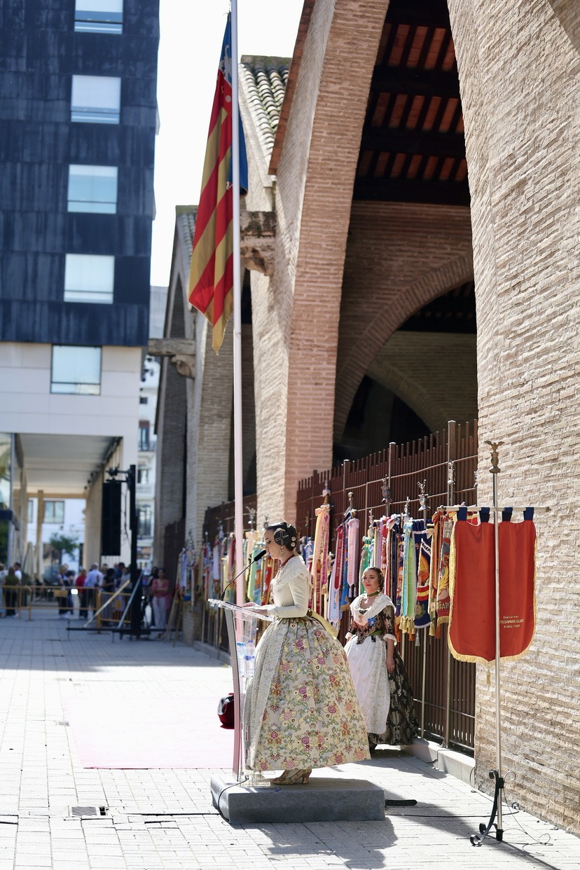 Una vegada arribada la Reial Senyera a les emblemàtiques Drassanes, ha sigut hissada per les Falleres Majors de València, Carmen Prades i Marta Mercader, en un moment de gran solemnitat i emoció compartida per tots els assistents.