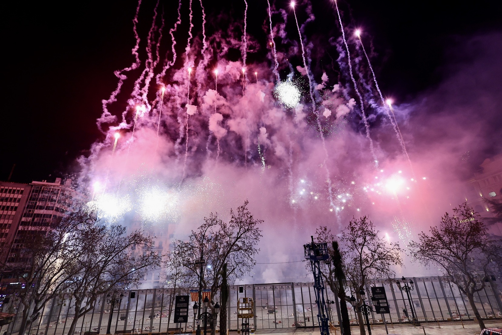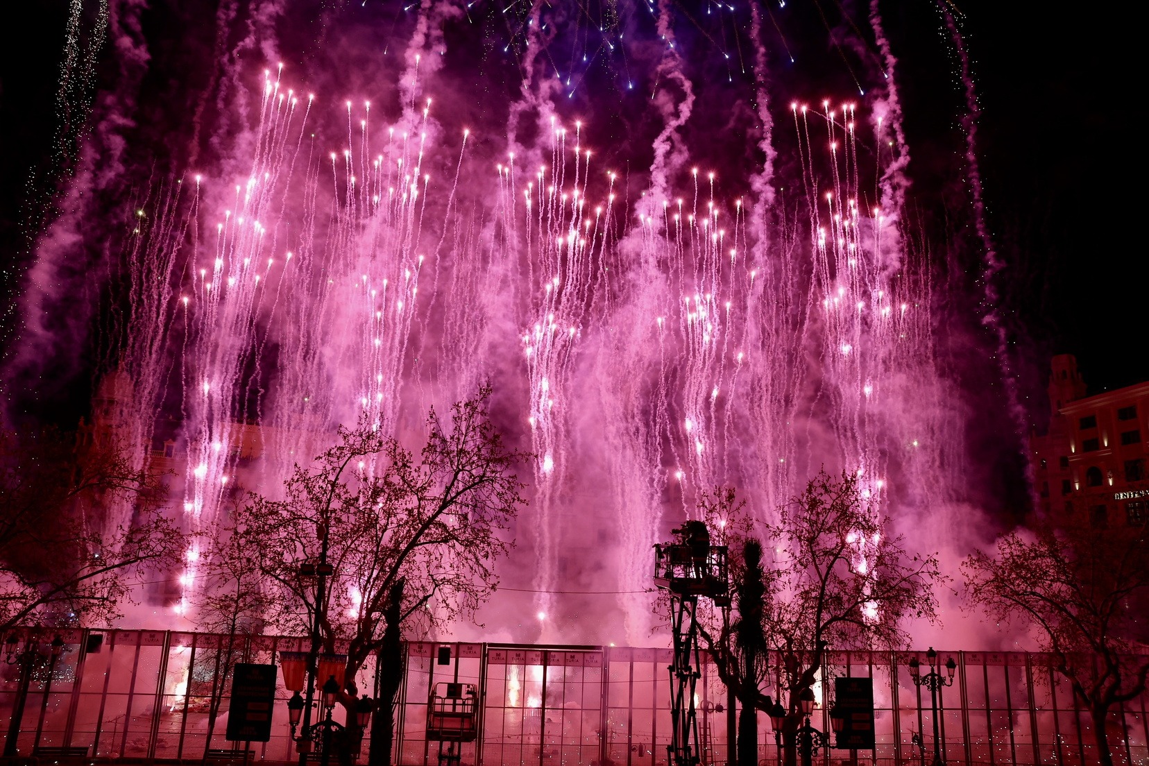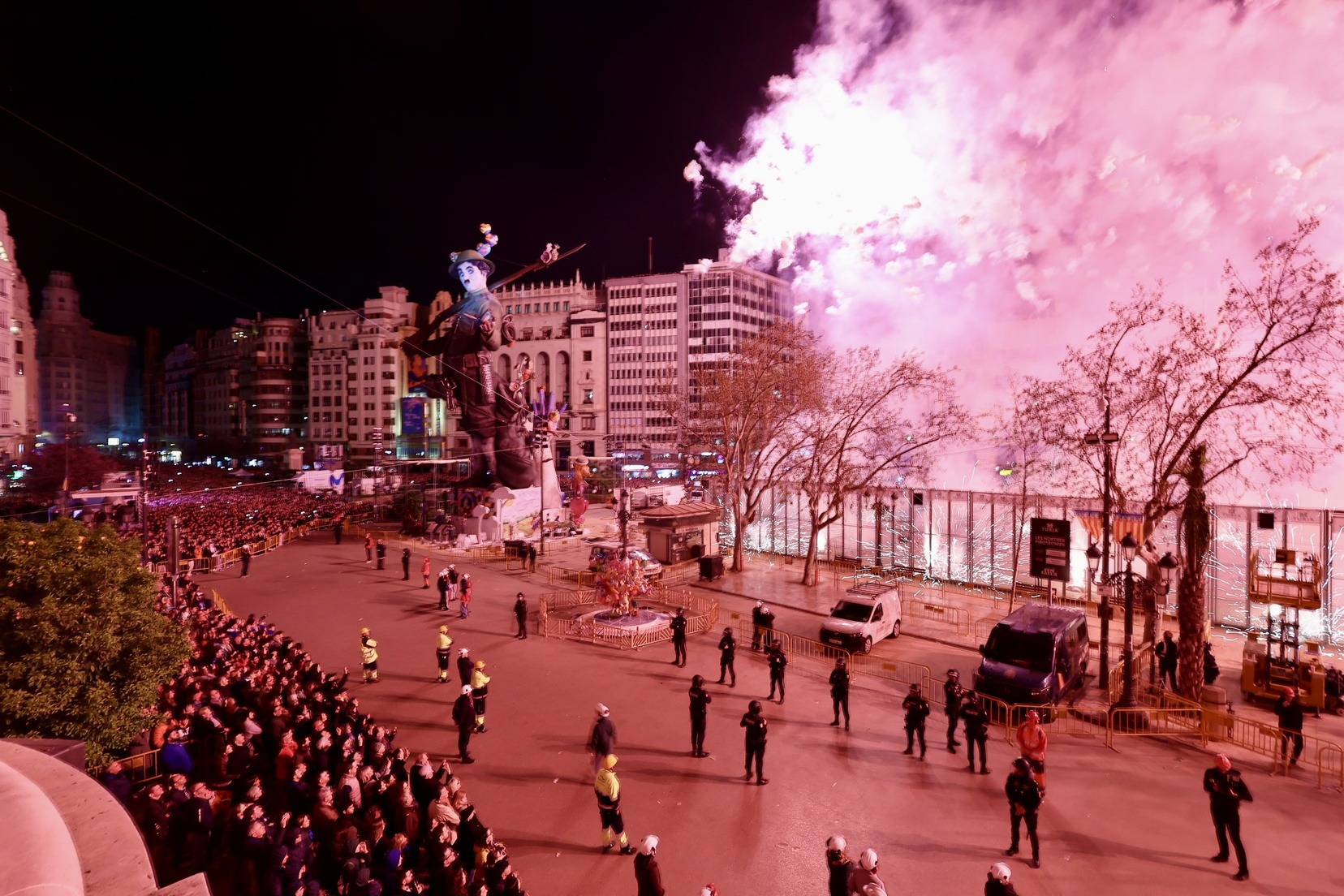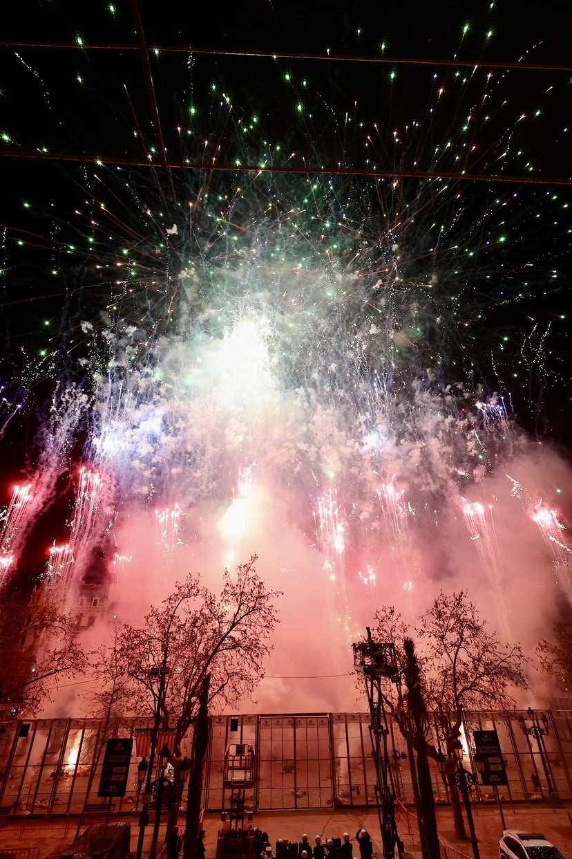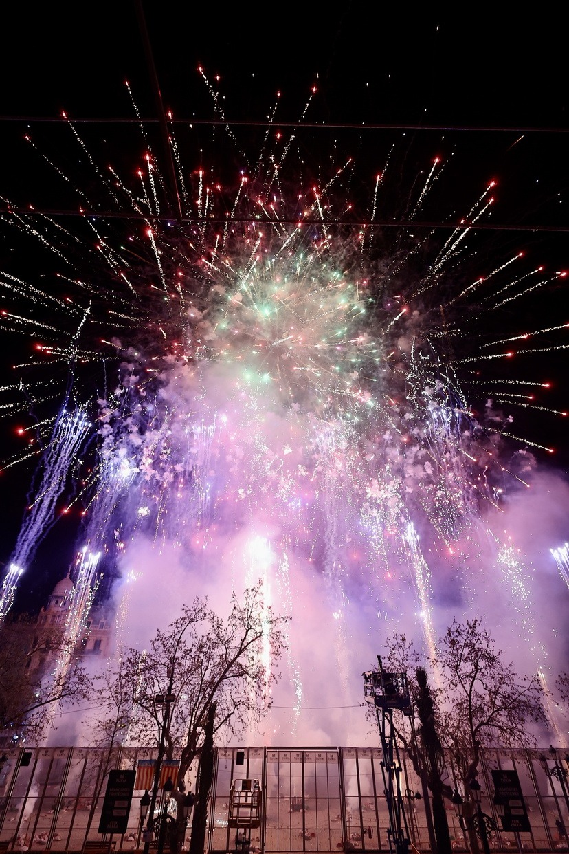 Cada una de les quasi 400 comissions que componen el cens faller, han disparat, alhora, un xicotet castell de focs artificials que ha omplit de llum, color i pólvora cada una de les demarcacions de les falles.