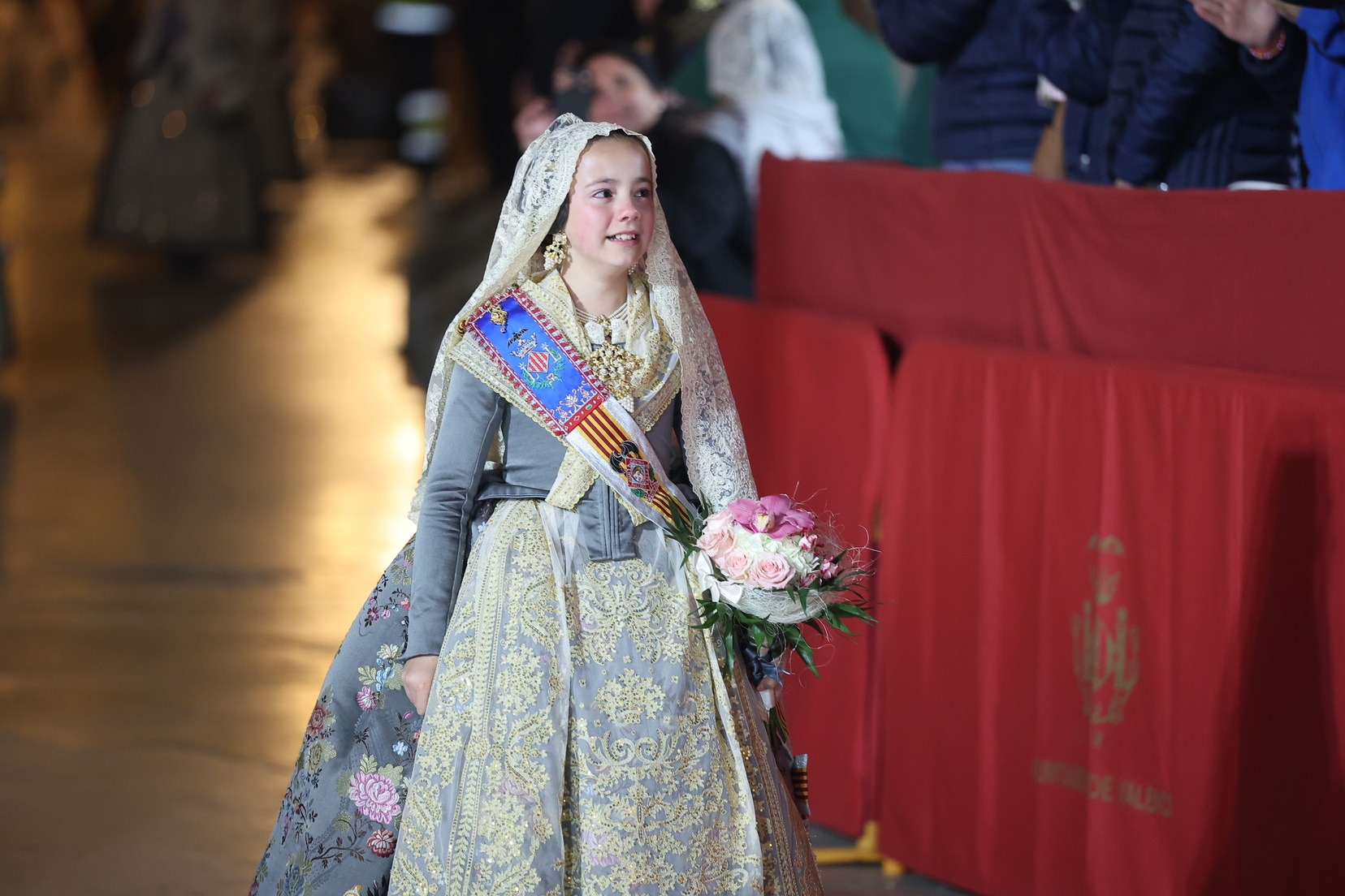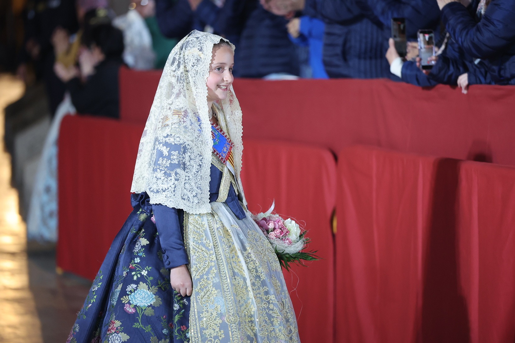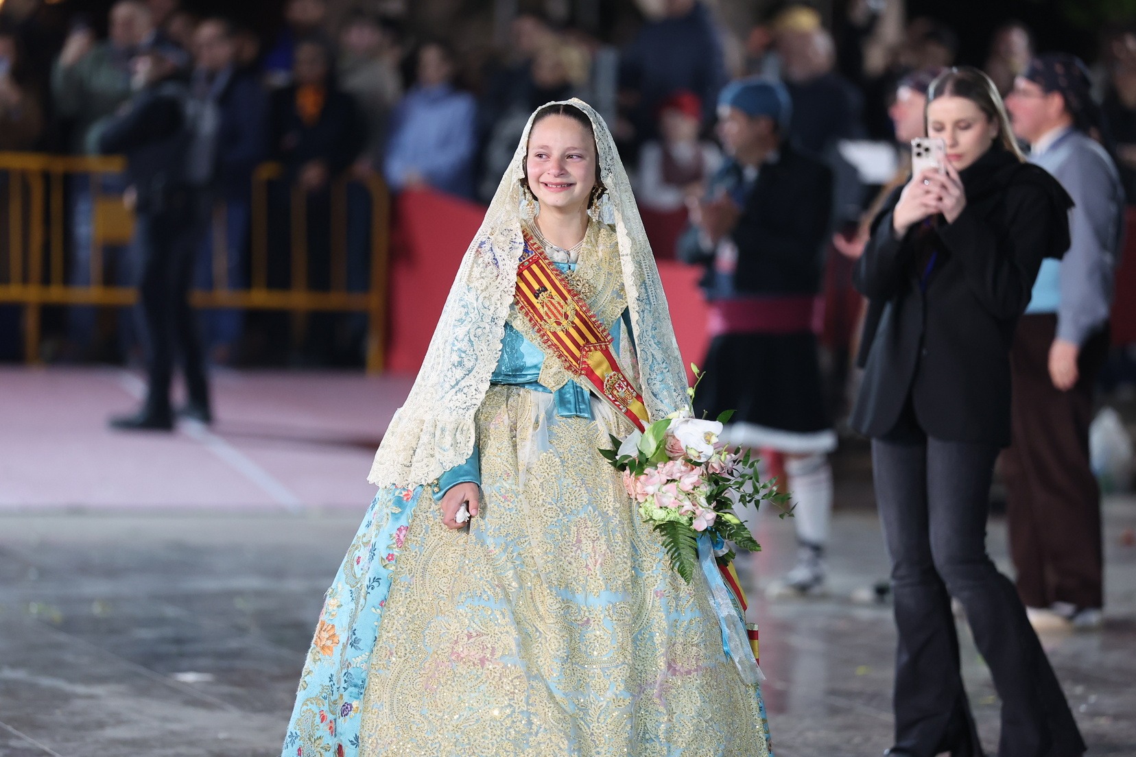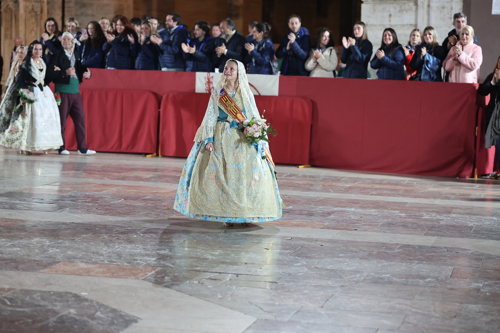 Desenes de persones les esperaven somrients per a aplaudir-les i les tretze xiquetes més afortunades d’este 2026 han pogut portar-li flors i fer les seues peticions a la Mare de Déu, que les esperava en la Plaça amb el mantell  prou avançat en haver rebut milers de rams durant la jornada del 17 de març.