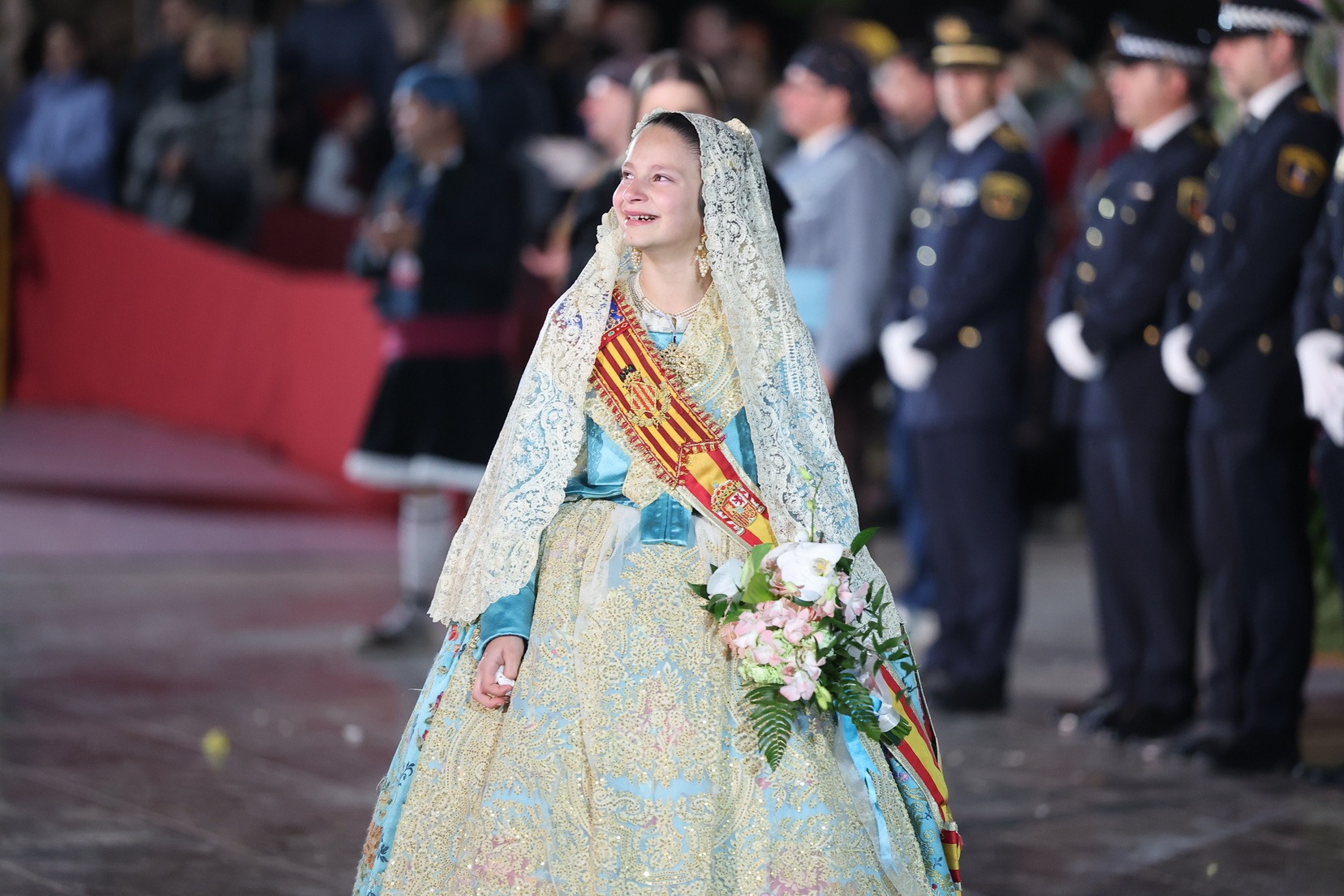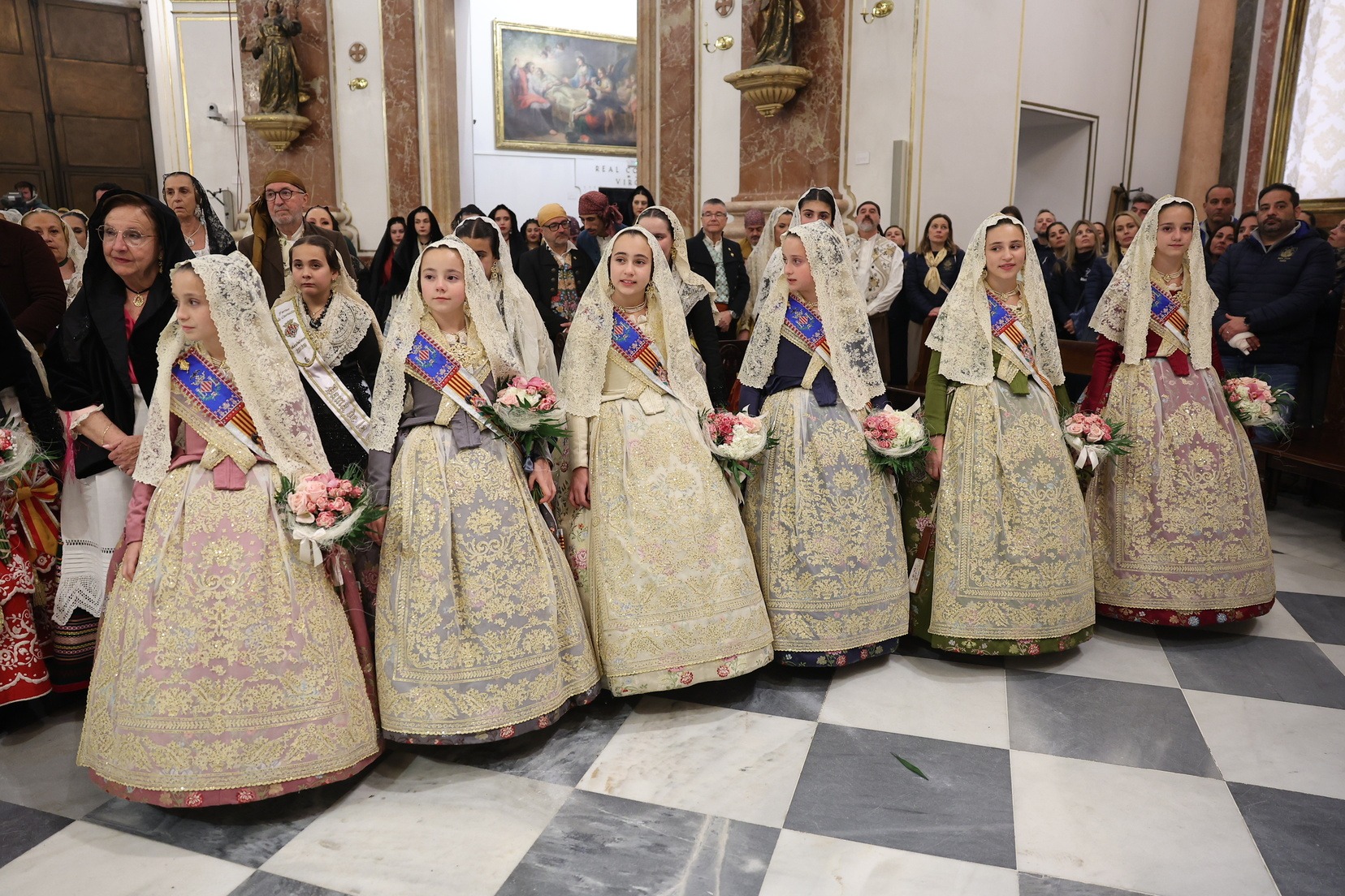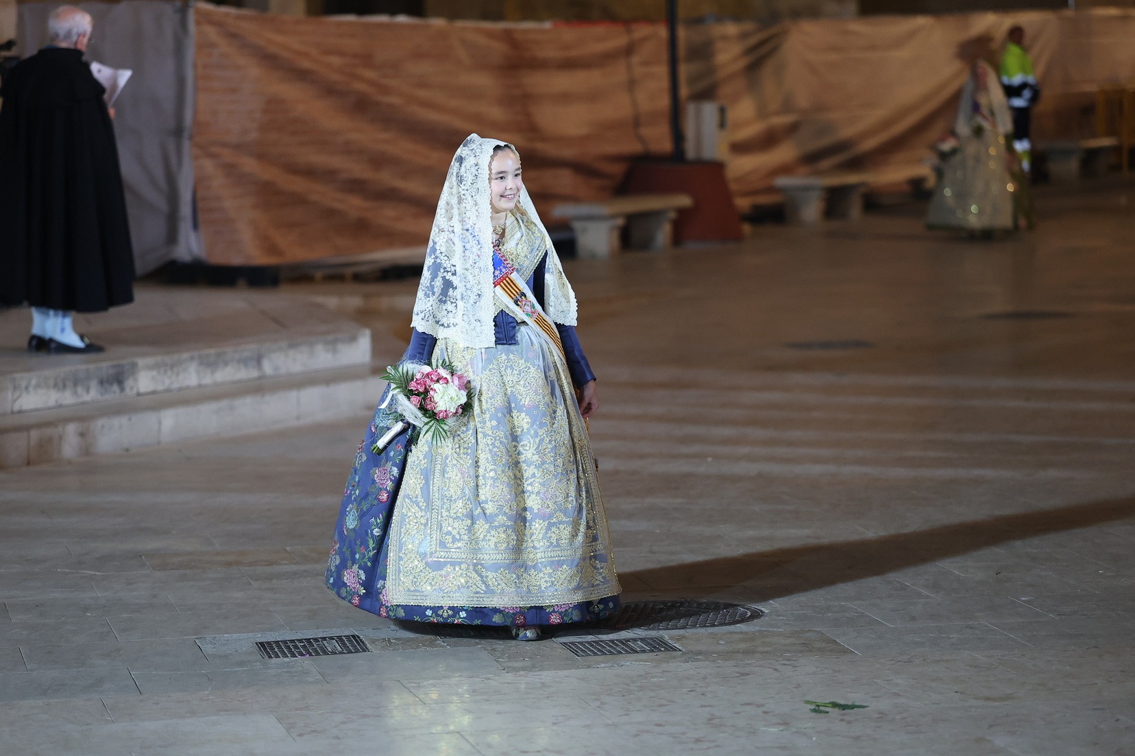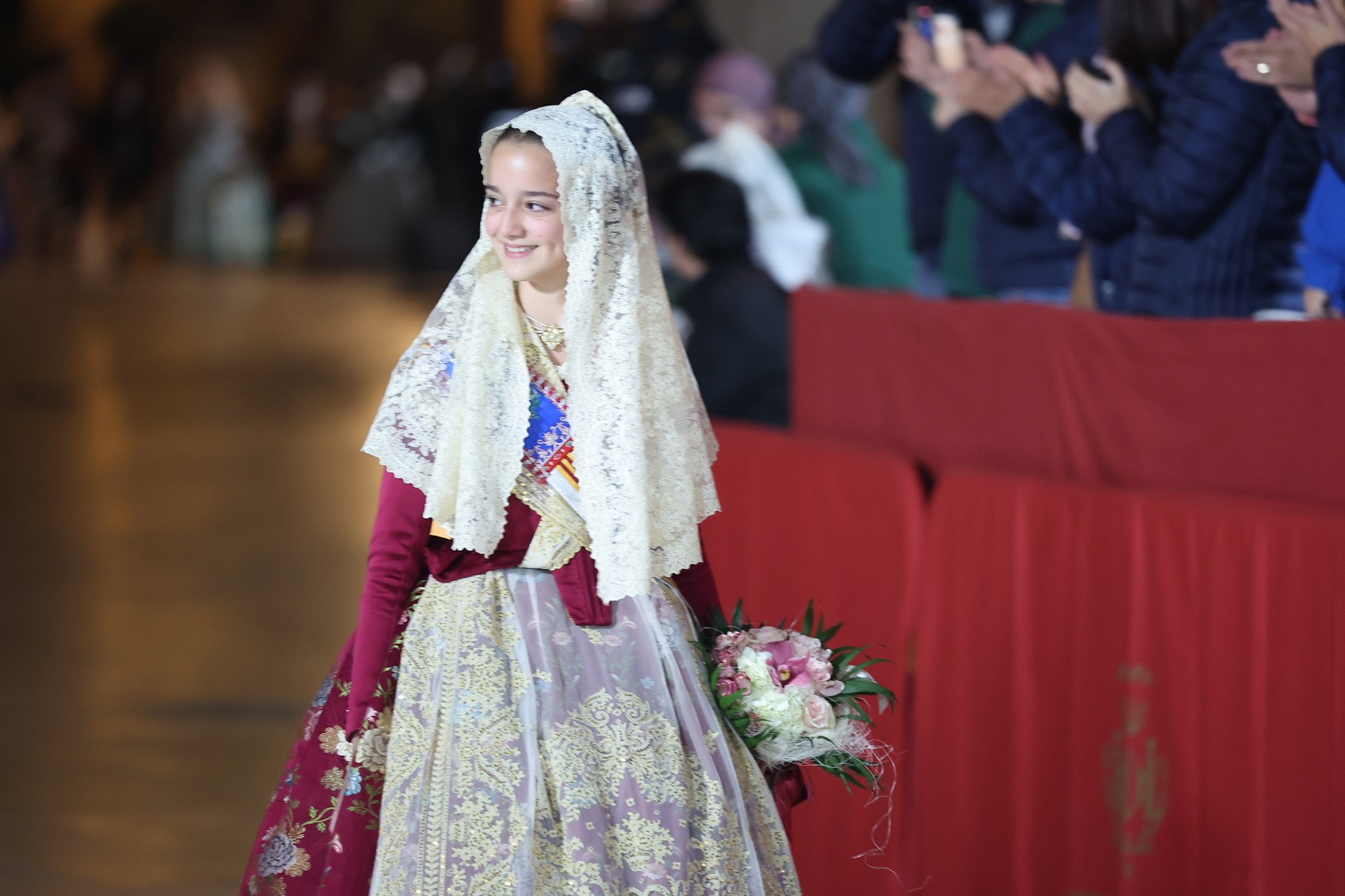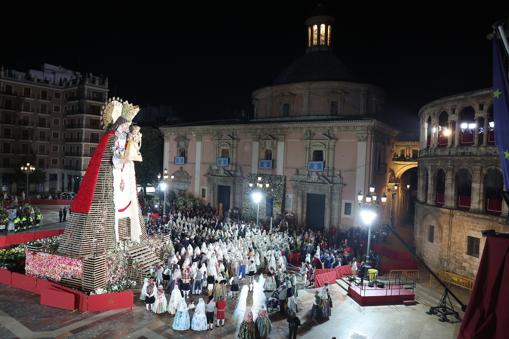Desenes de persones les esperaven somrients per a aplaudir-les i les tretze xiquetes més afortunades d’este 2026 han pogut portar-li flors i fer les seues peticions a la Mare de Déu, que les esperava en la Plaça amb el mantell  prou avançat en haver rebut milers de rams durant la jornada del 17 de març.