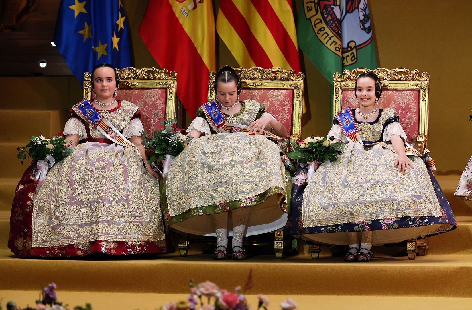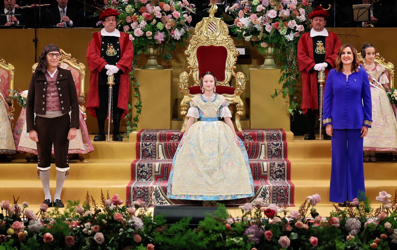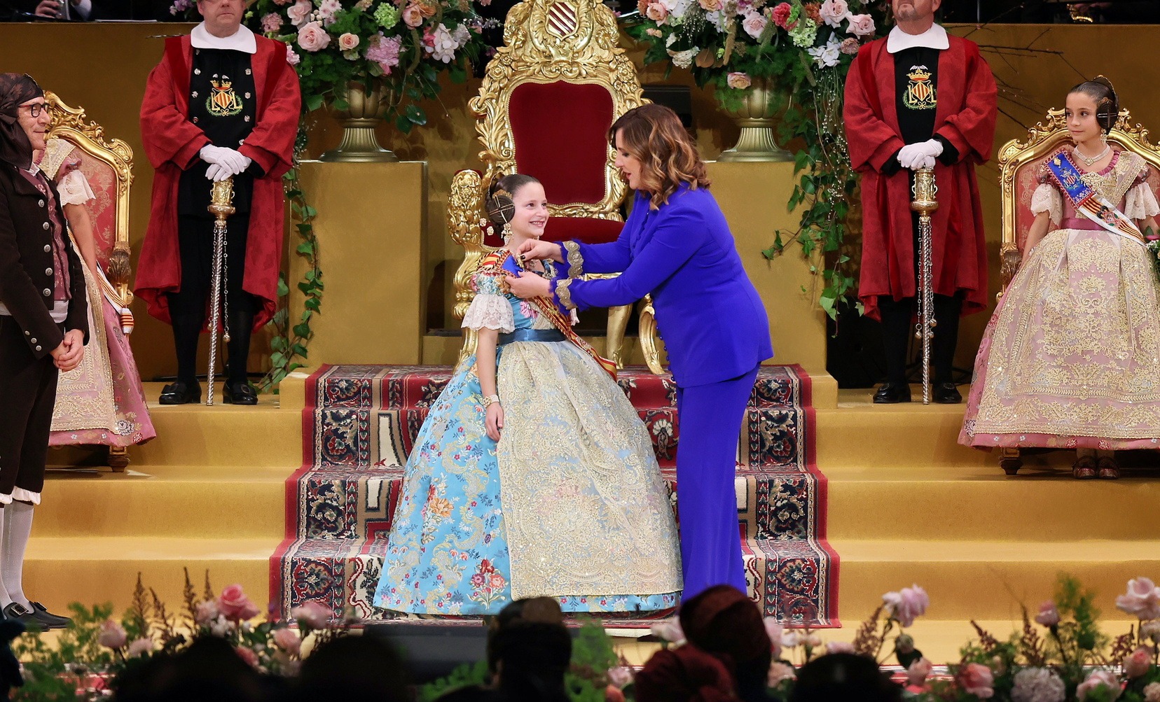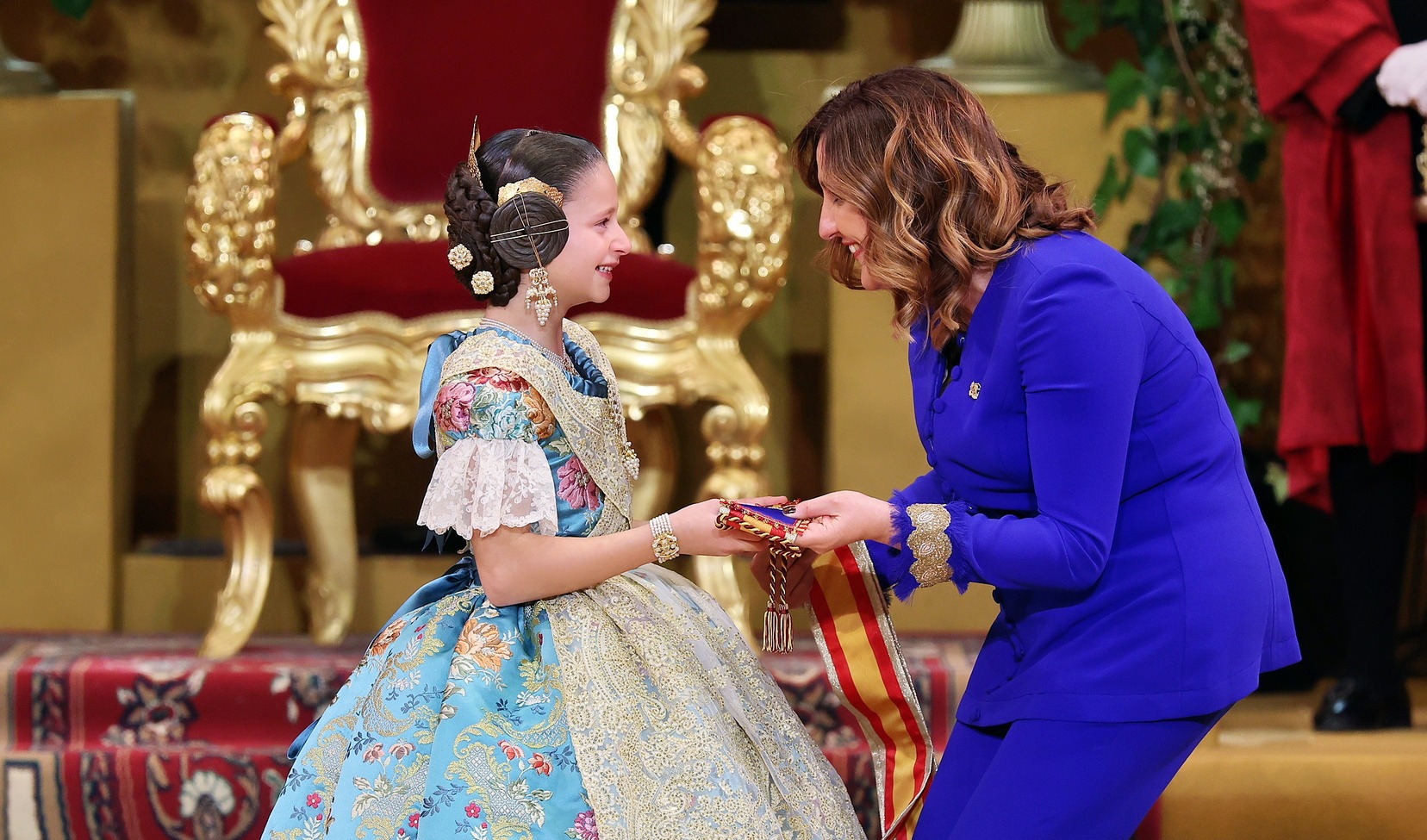 Després de la imposició de bandes a la Cort d’Honor Infantil, la veu de Reis Juan ha recitat les paraules que precedien al moment més esperat de tota la vesprada, «..pel conjunt de virtuts que atesora i que la fan dignísima portadora de nostra més alta representació, rindam homenatge d’amor i pleitesia a la Fallera Major Infantil de València (…)”