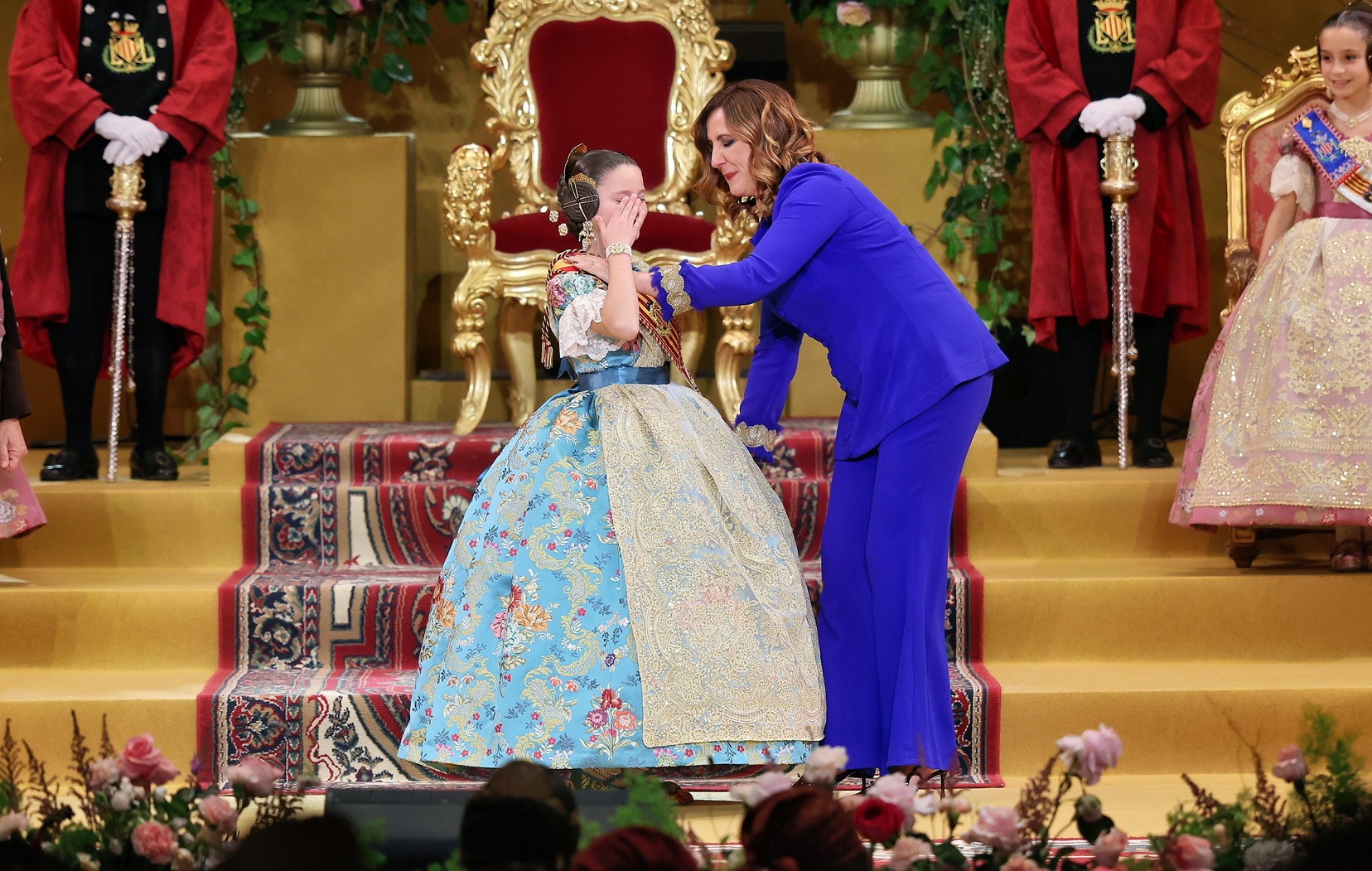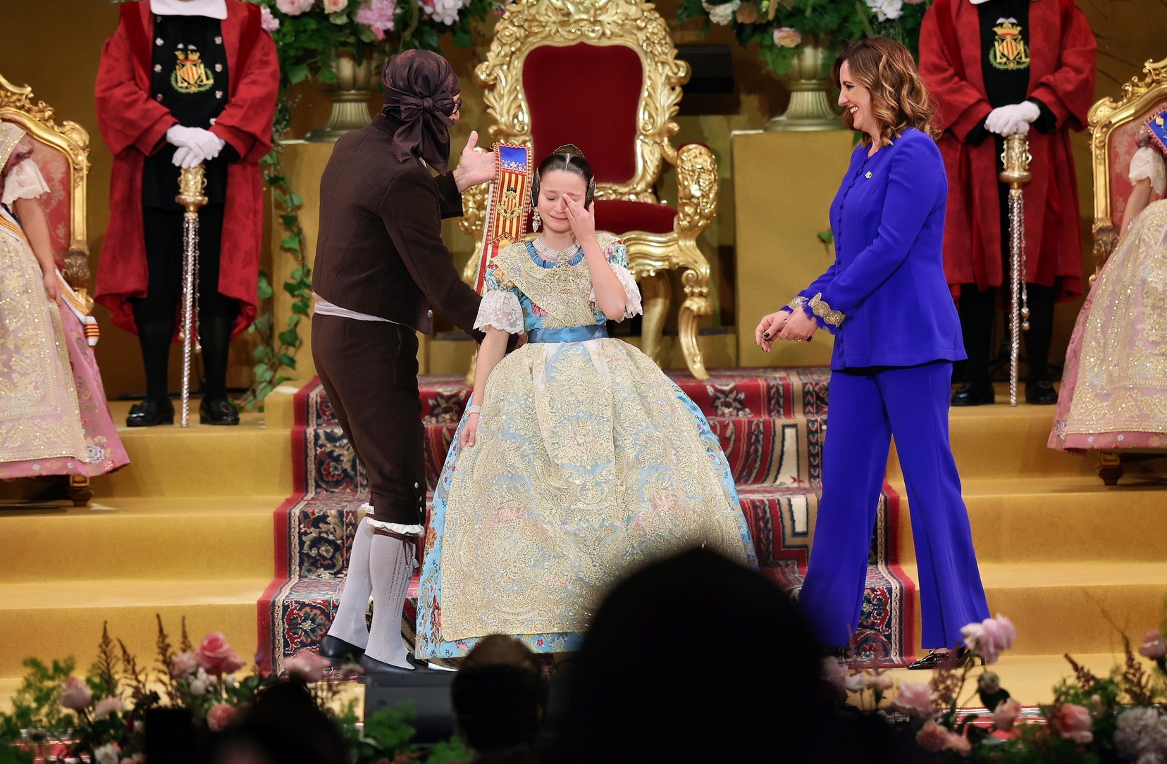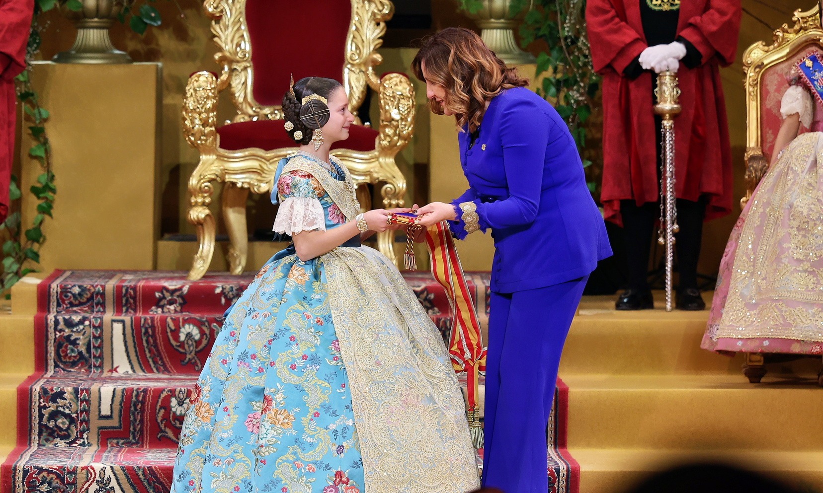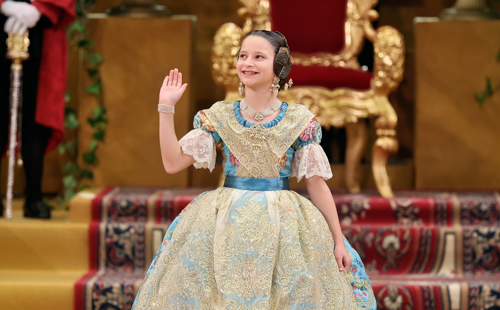 Després de la imposició de bandes a la Cort d’Honor Infantil, la veu de Reis Juan ha recitat les paraules que precedien al moment més esperat de tota la vesprada, «..pel conjunt de virtuts que atesora i que la fan dignísima portadora de nostra més alta representació, rindam homenatge d’amor i pleitesia a la Fallera Major Infantil de València (…)”